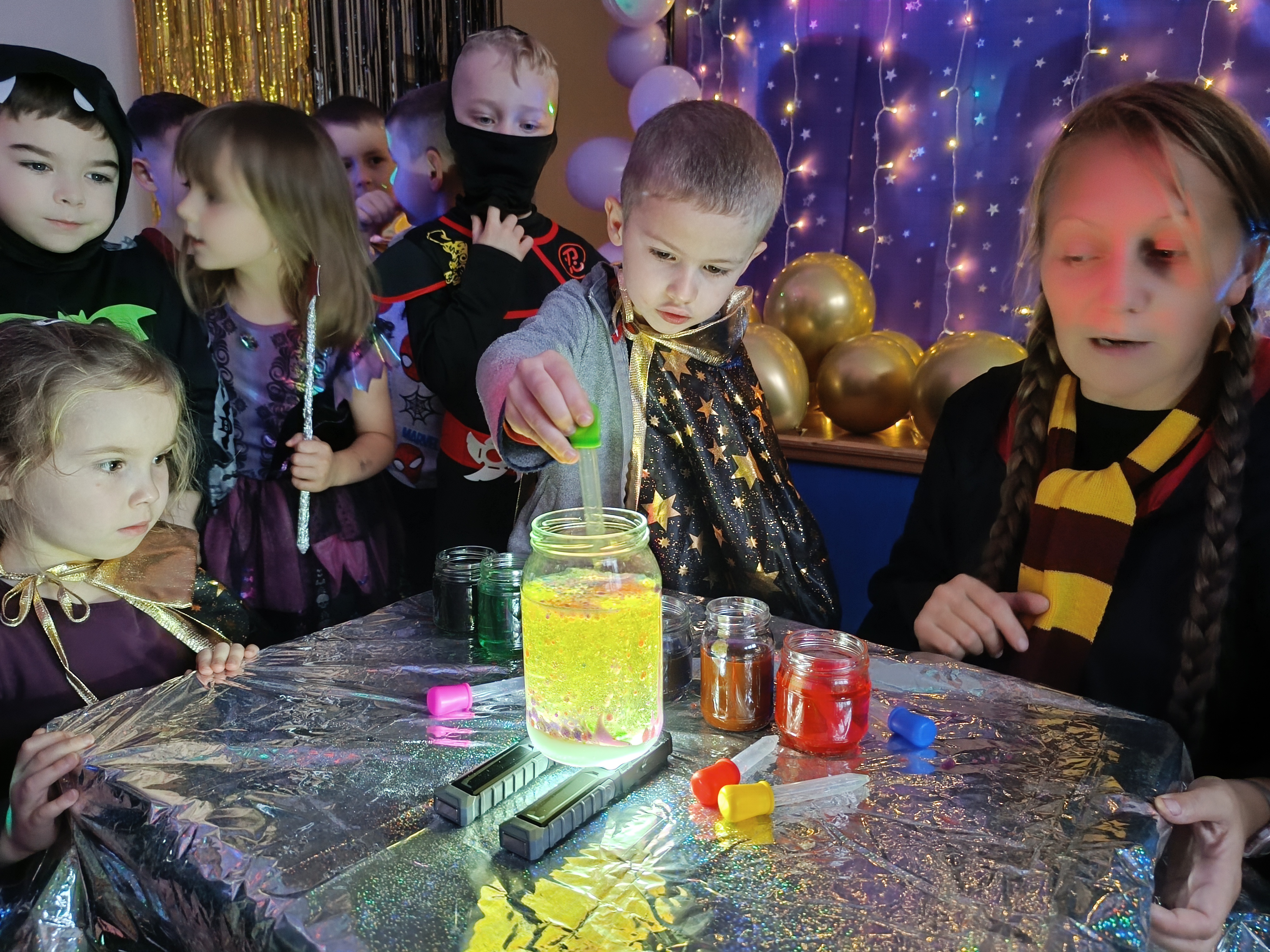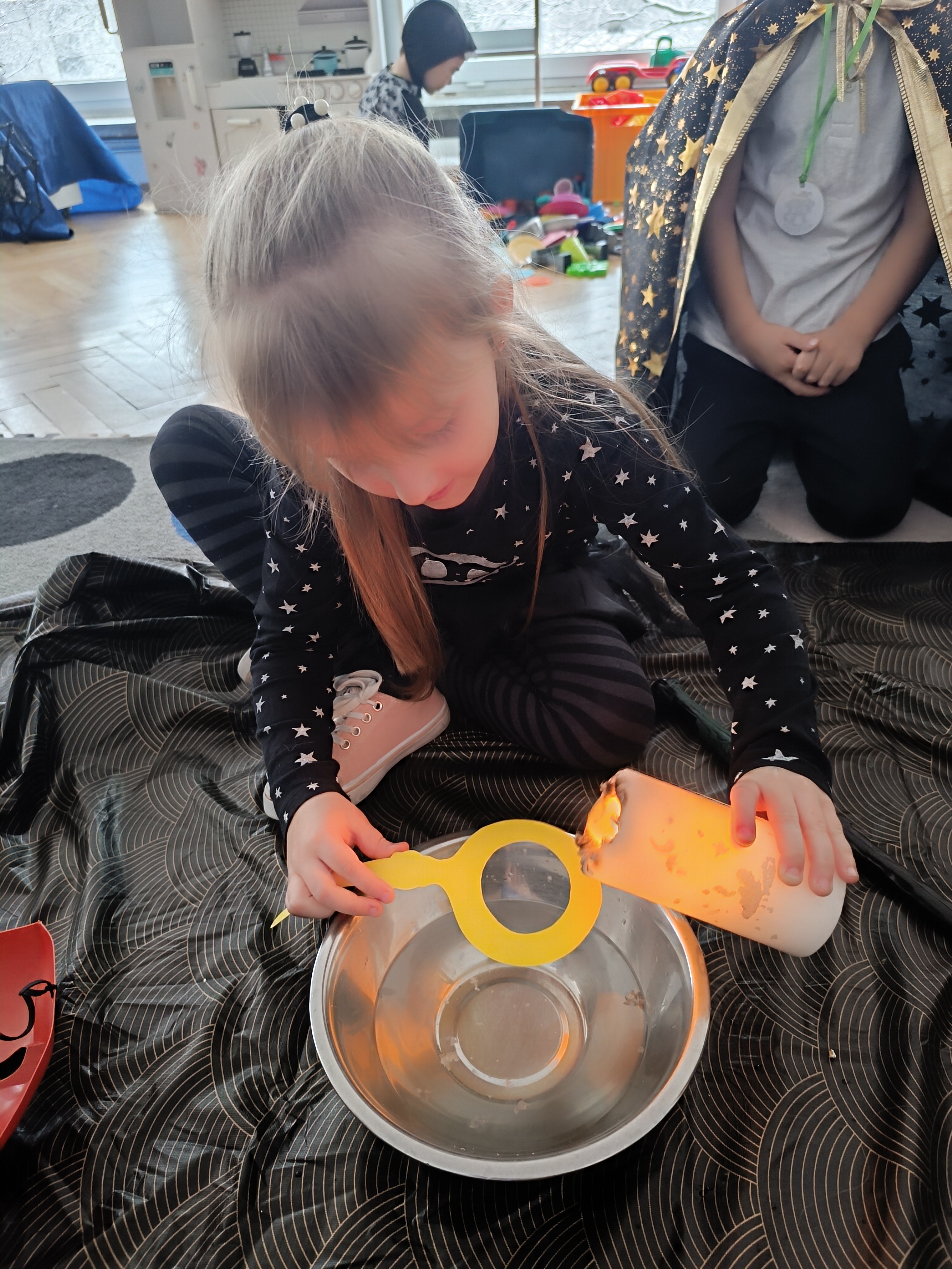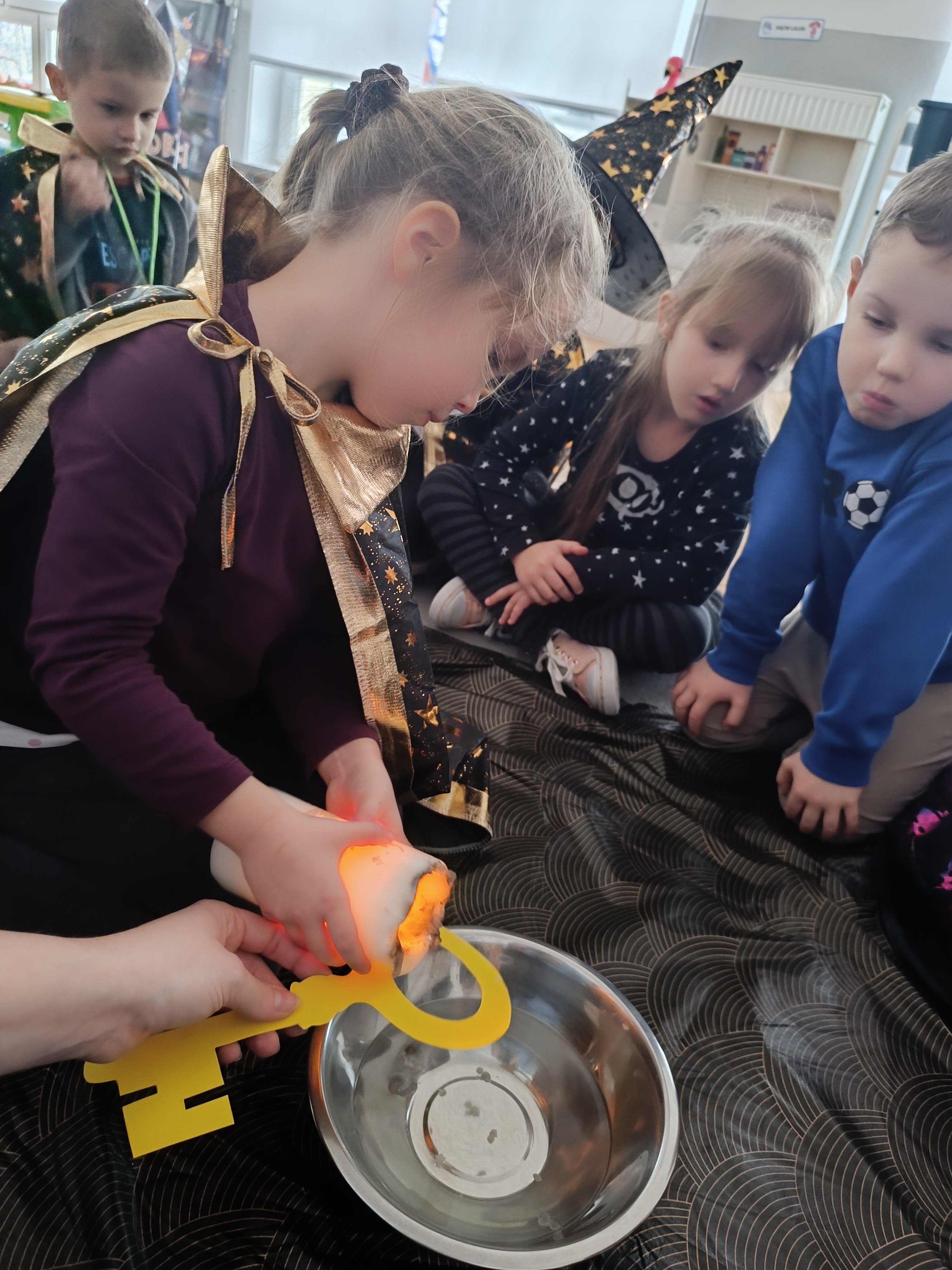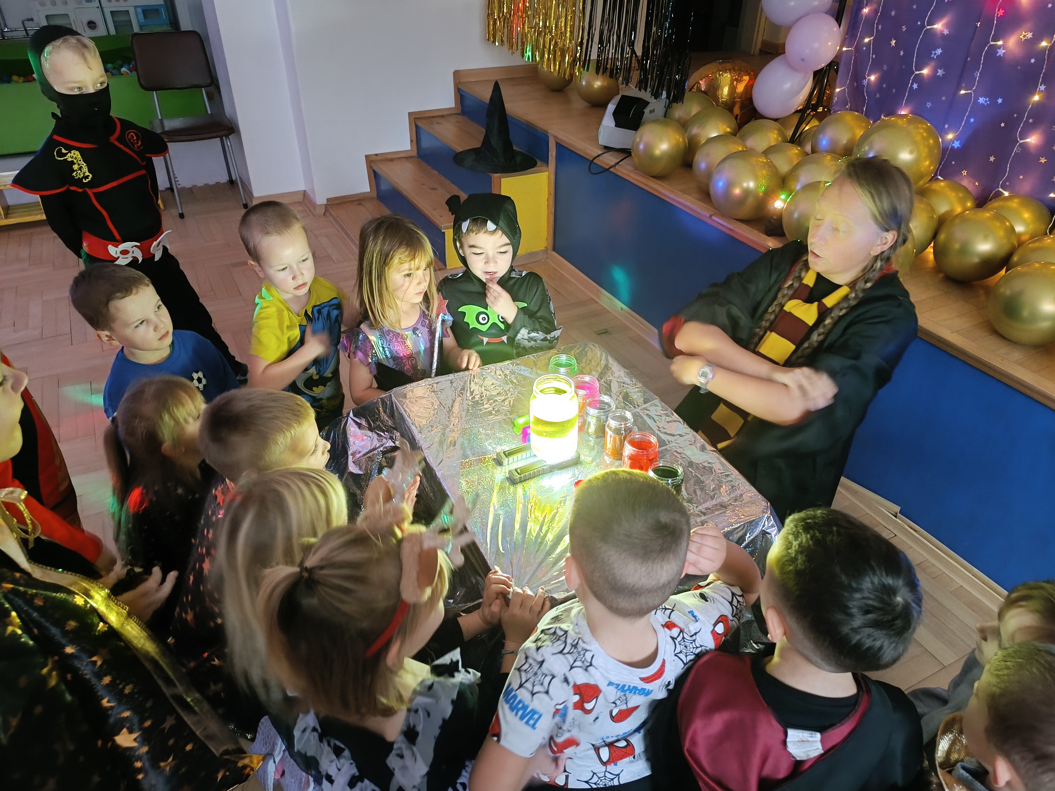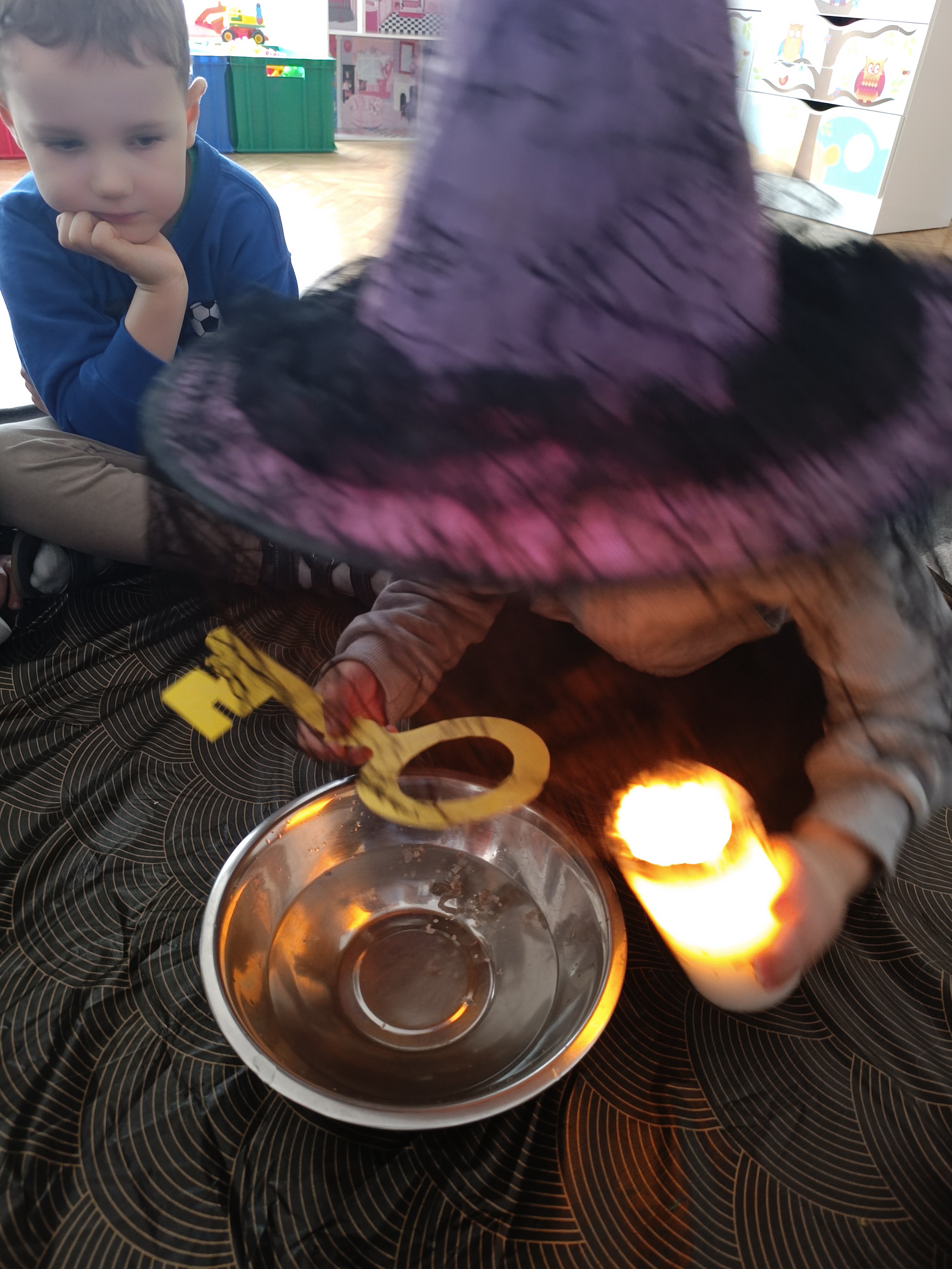 Tajemnicze dekoracje w sali sprawiły, że przedszkolaki przeniosły się w krainę czarów i wróżb. Ten dzień był dniem radosnych zabaw i wróżb, w których dzieci mogły poznać swoją bliższą i dalszą przyszłość.