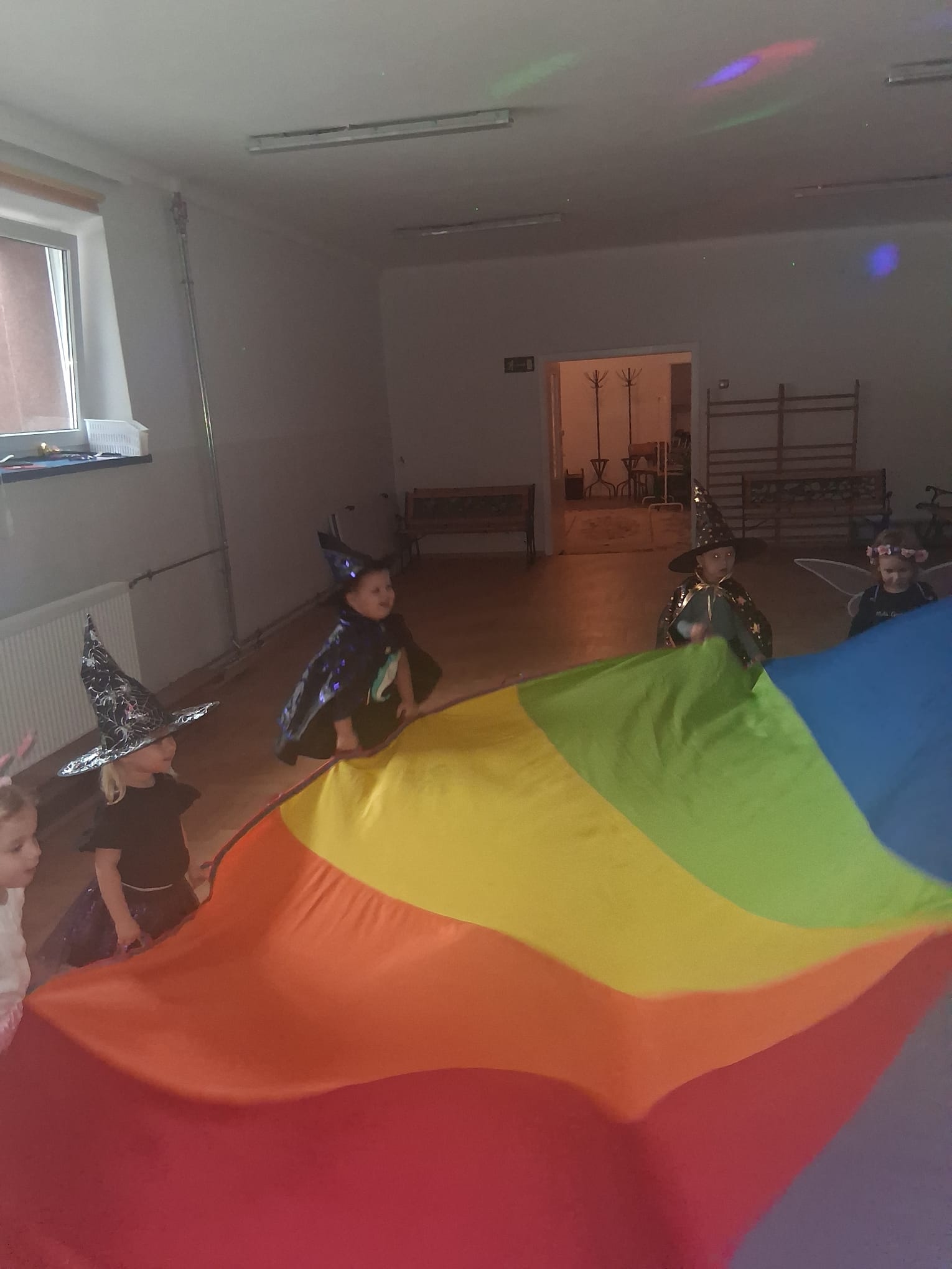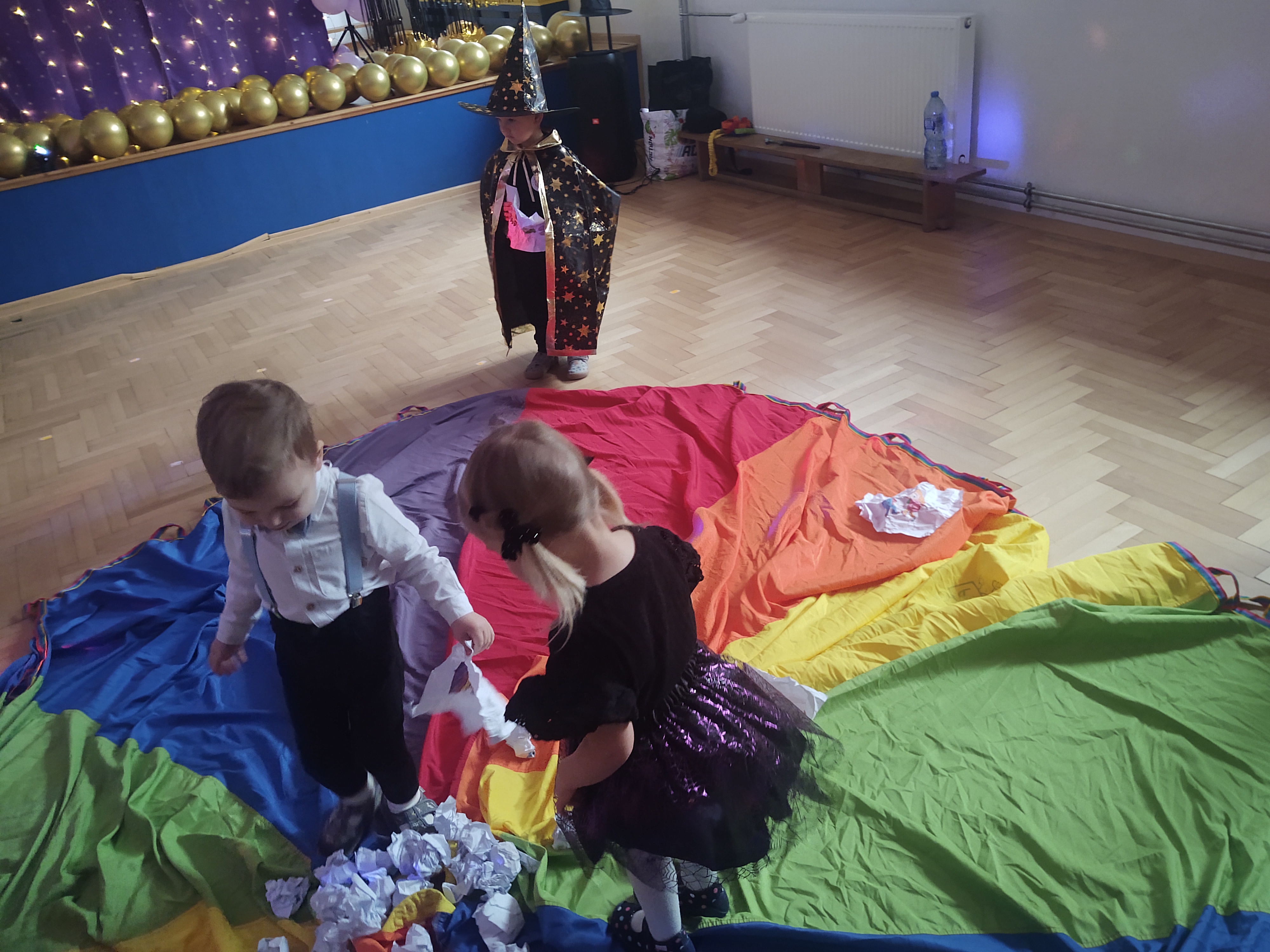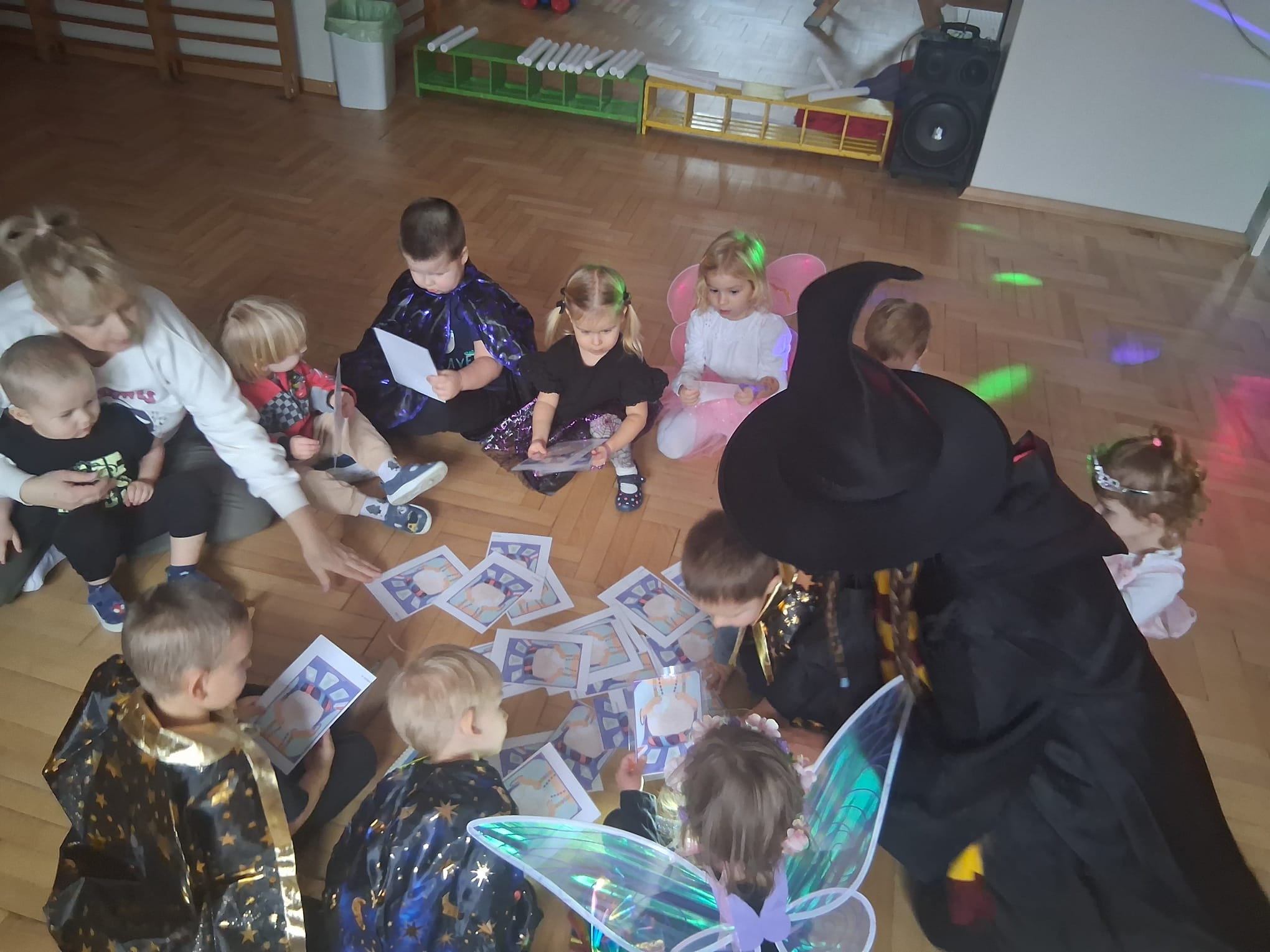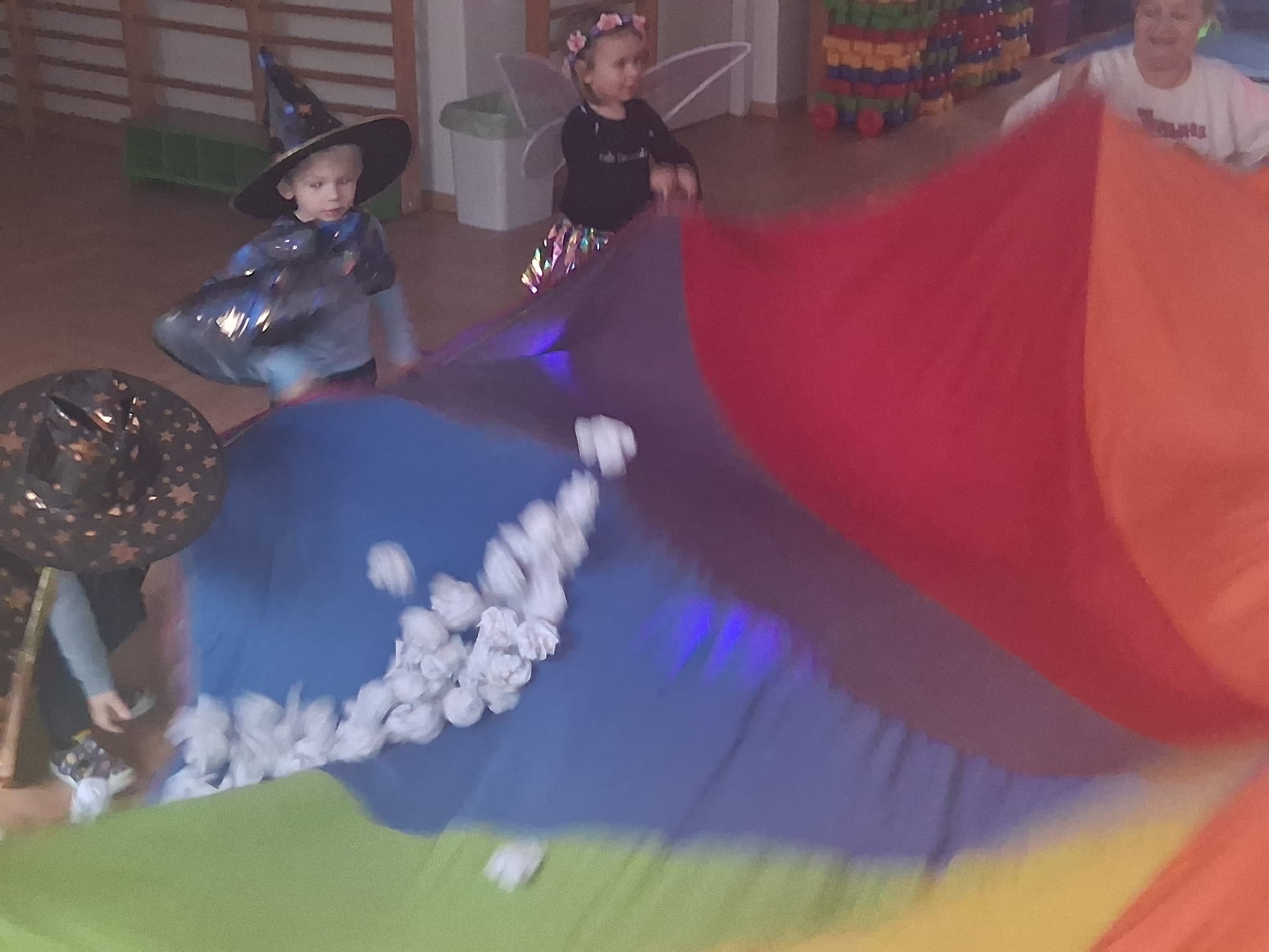 Losowały kolorowe karteczki, z wesołymi ,,przepowiedniami’’, brały udział w zabawie z magicznym kołem, cudownym eliksirem i wielu innych zabawach. Dużo radości przyniosły też zabawy z chustą animacyjną, dzieci podnosiły i opuszczały kolorową chustę ,,czarowały’’ lekkie piłeczki ( papierowe kulki) unoszące się w powietrzu oraz ukrywały się pod nią, tworząc tajemniczą andrzejkową ,, jaskinię’’. Te aktywności pozwoliły maluszkom na wspólną integrację, ruch i rozwijanie koordynacji.