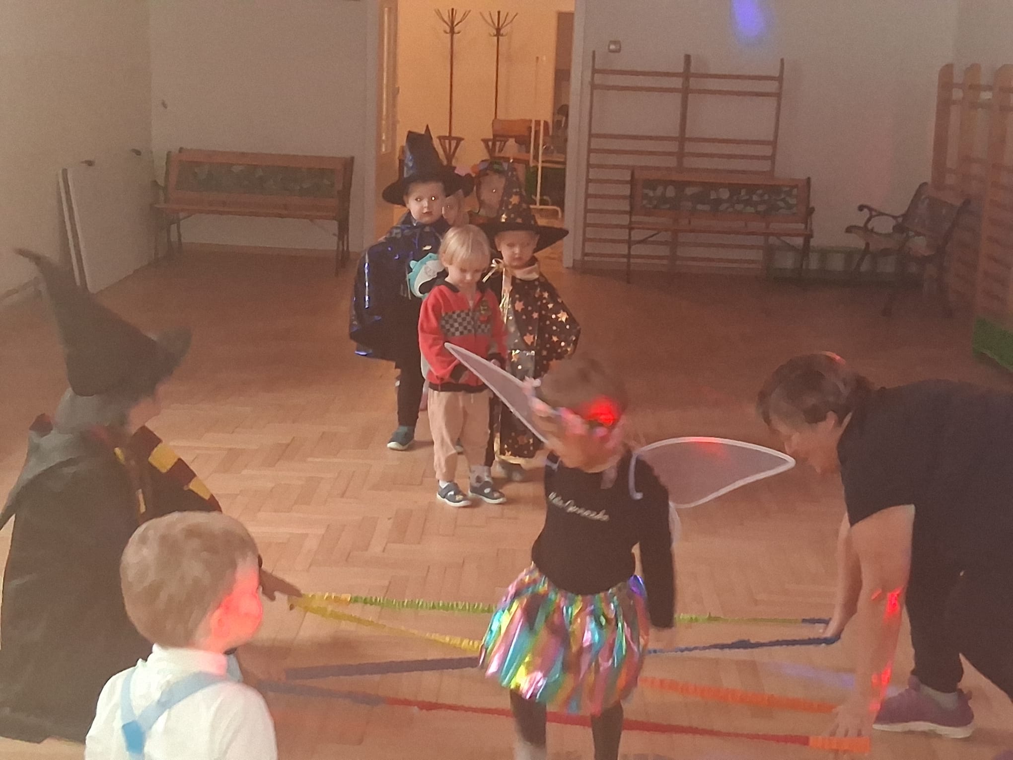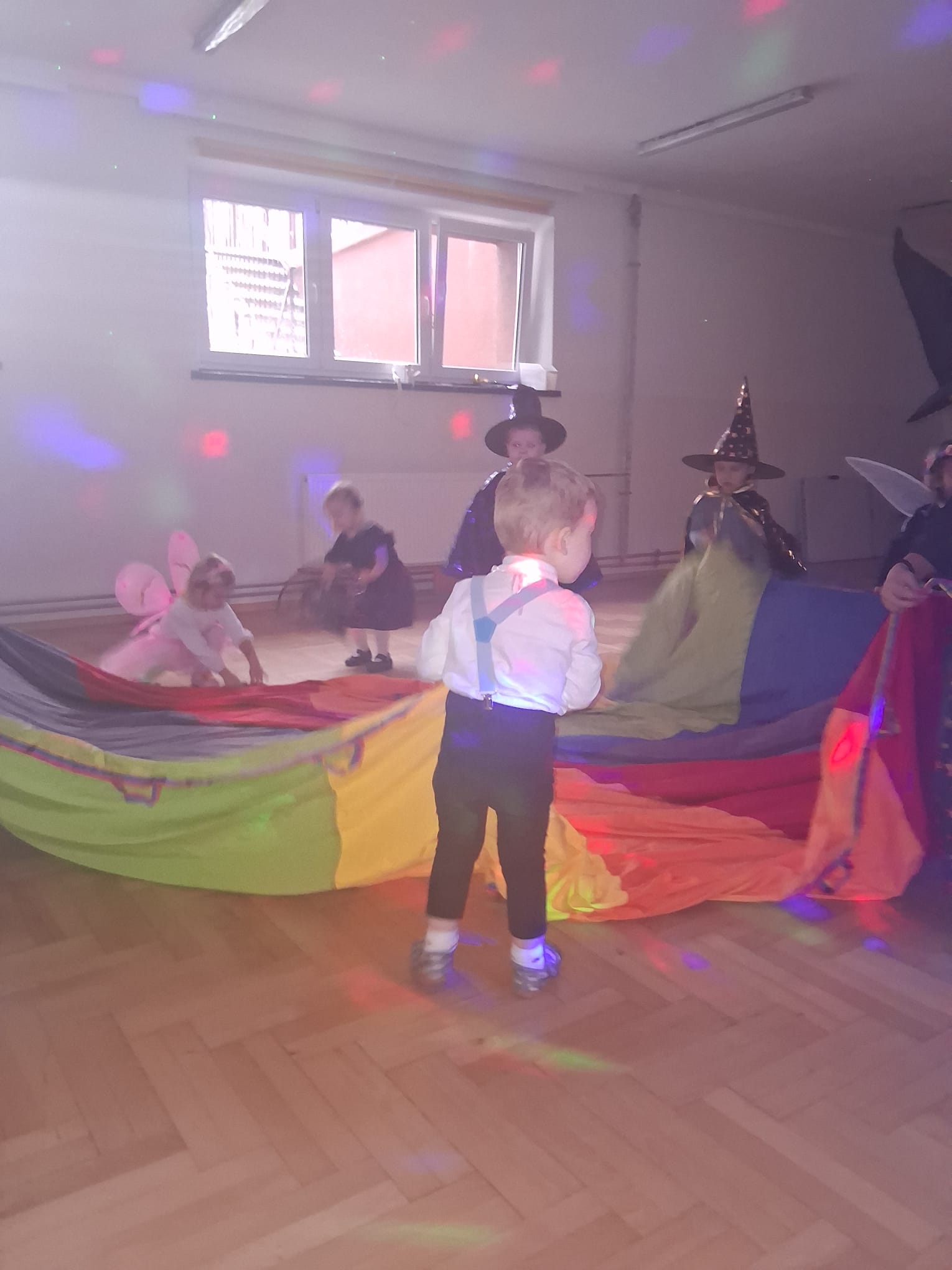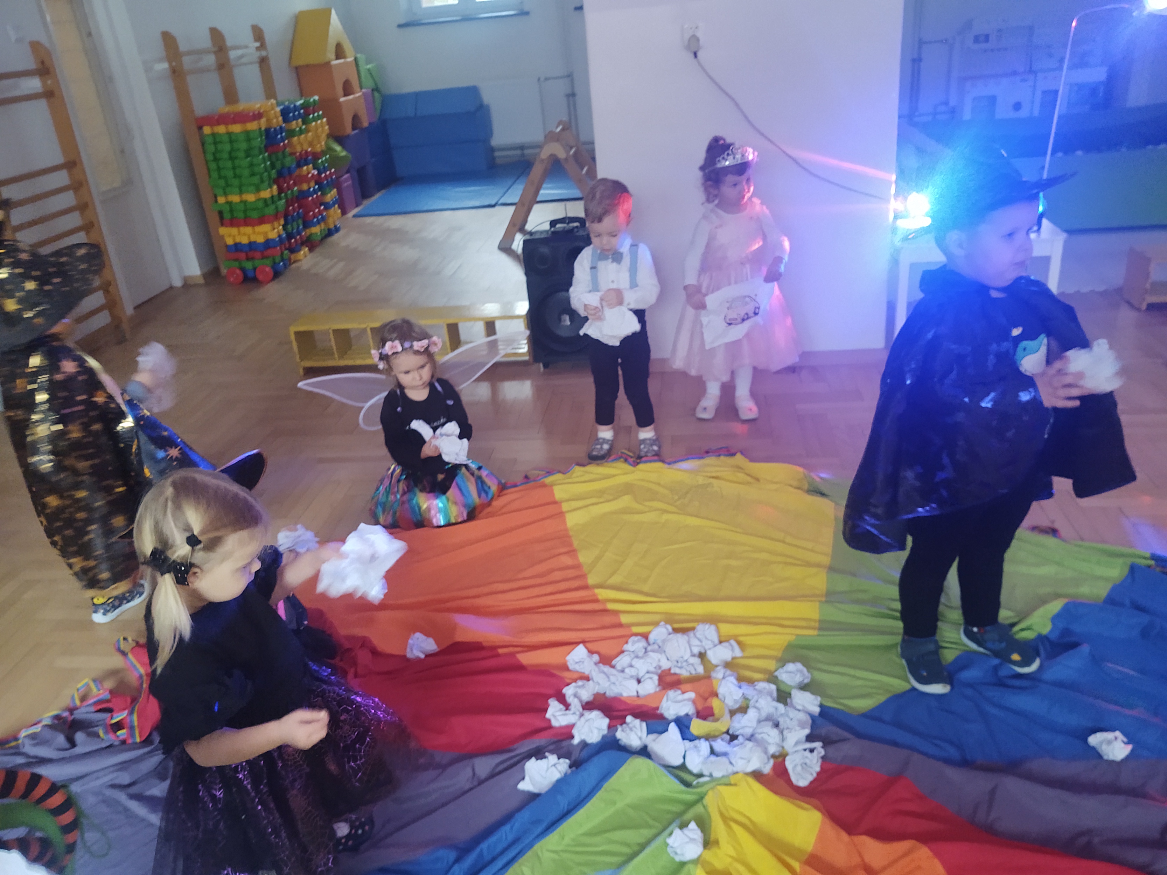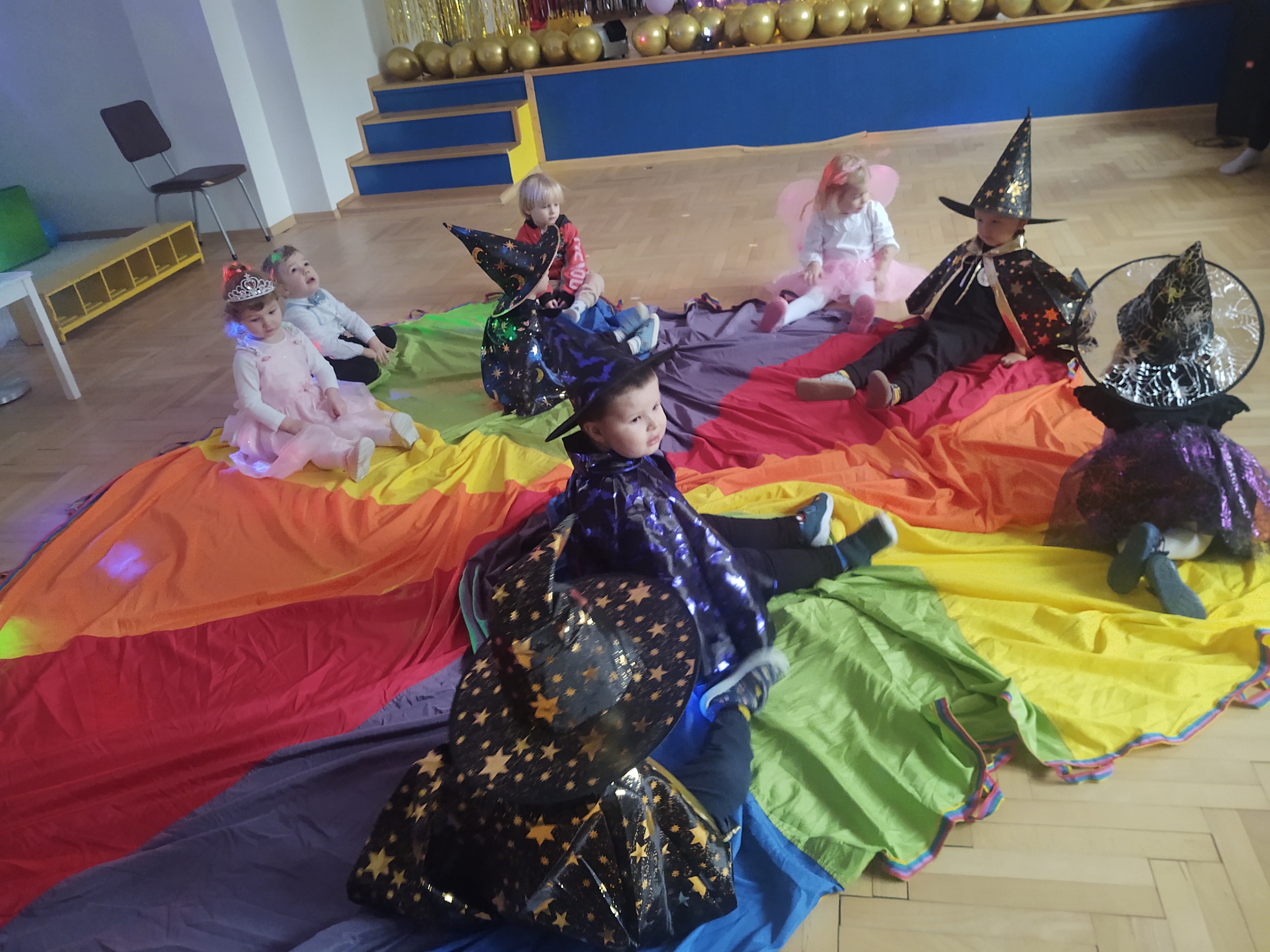 Losowały kolorowe karteczki, z wesołymi ,,przepowiedniami’’, brały udział w zabawie z magicznym kołem, cudownym eliksirem i wielu innych zabawach. Dużo radości przyniosły też zabawy z chustą animacyjną, dzieci podnosiły i opuszczały kolorową chustę ,,czarowały’’ lekkie piłeczki ( papierowe kulki) unoszące się w powietrzu oraz ukrywały się pod nią, tworząc tajemniczą andrzejkową ,, jaskinię’’. Te aktywności pozwoliły maluszkom na wspólną integrację, ruch i rozwijanie koordynacji.