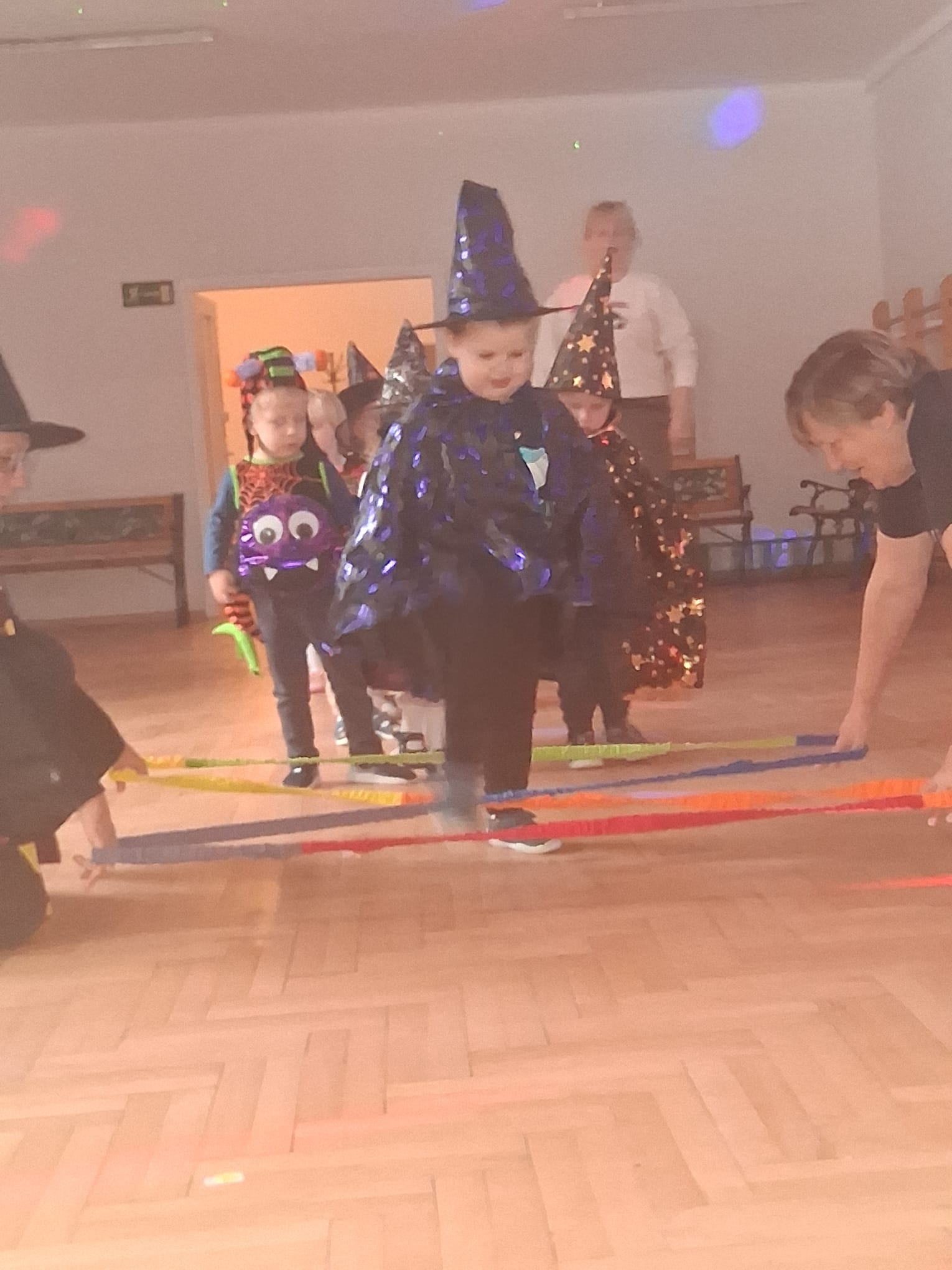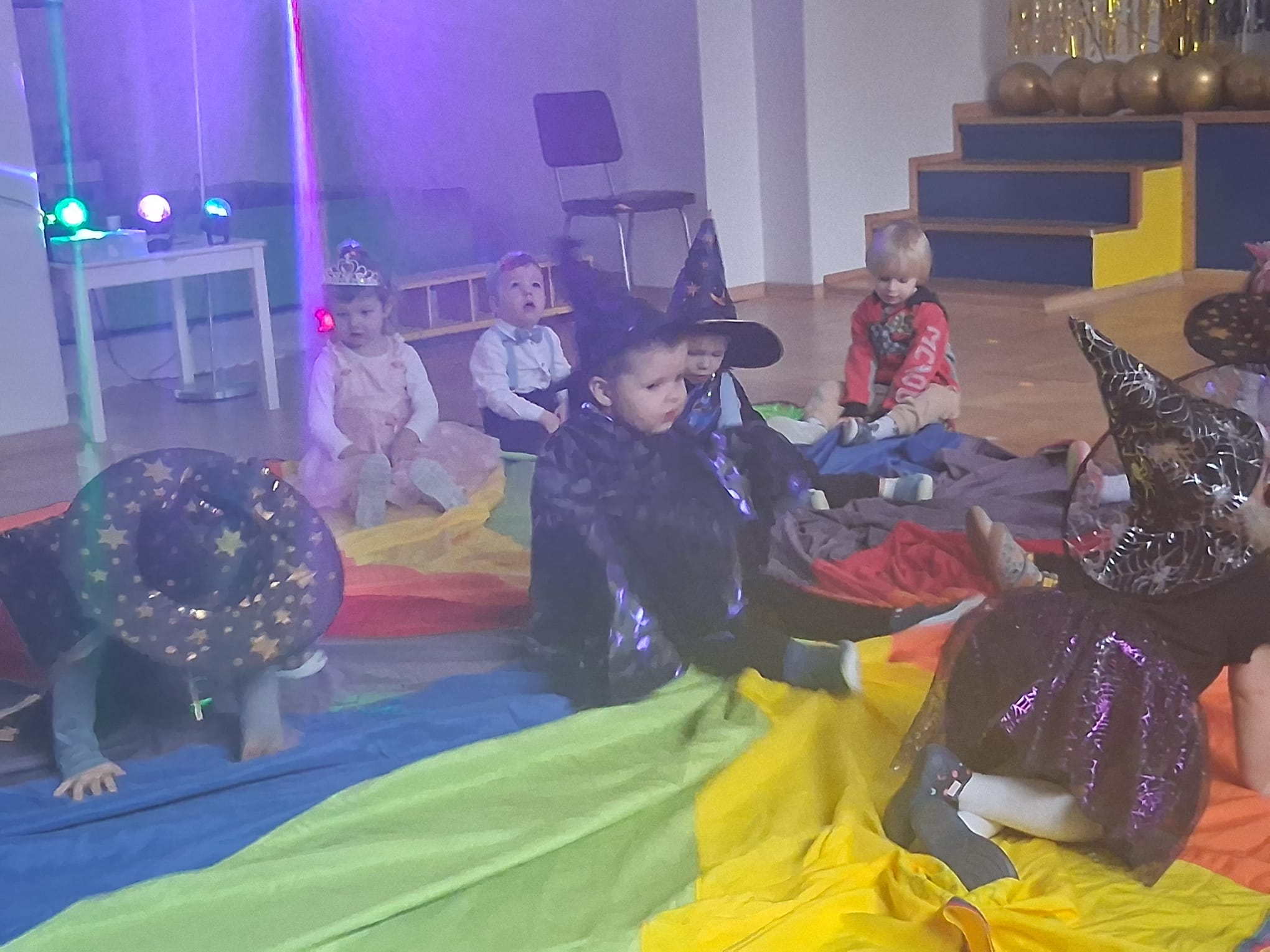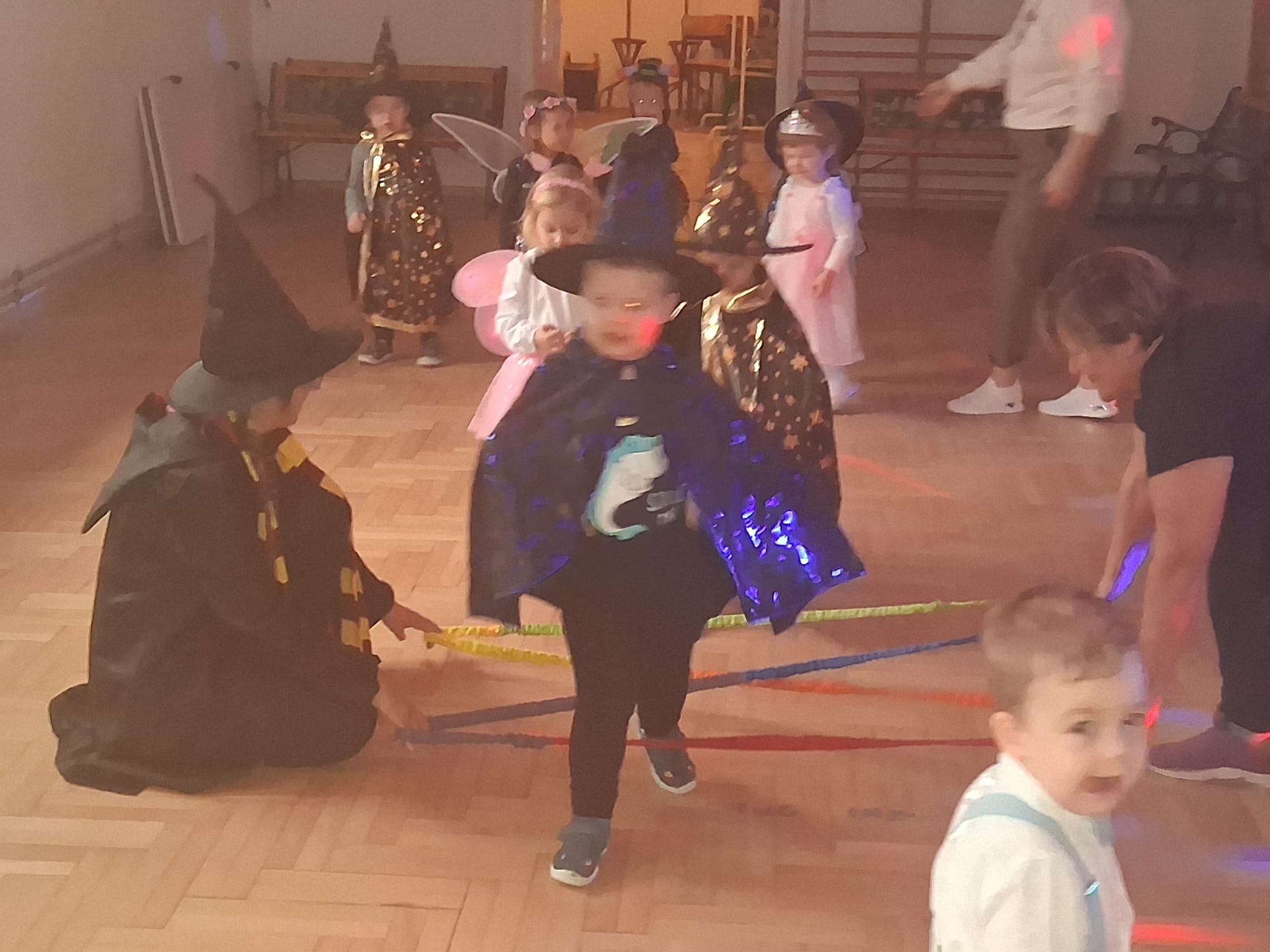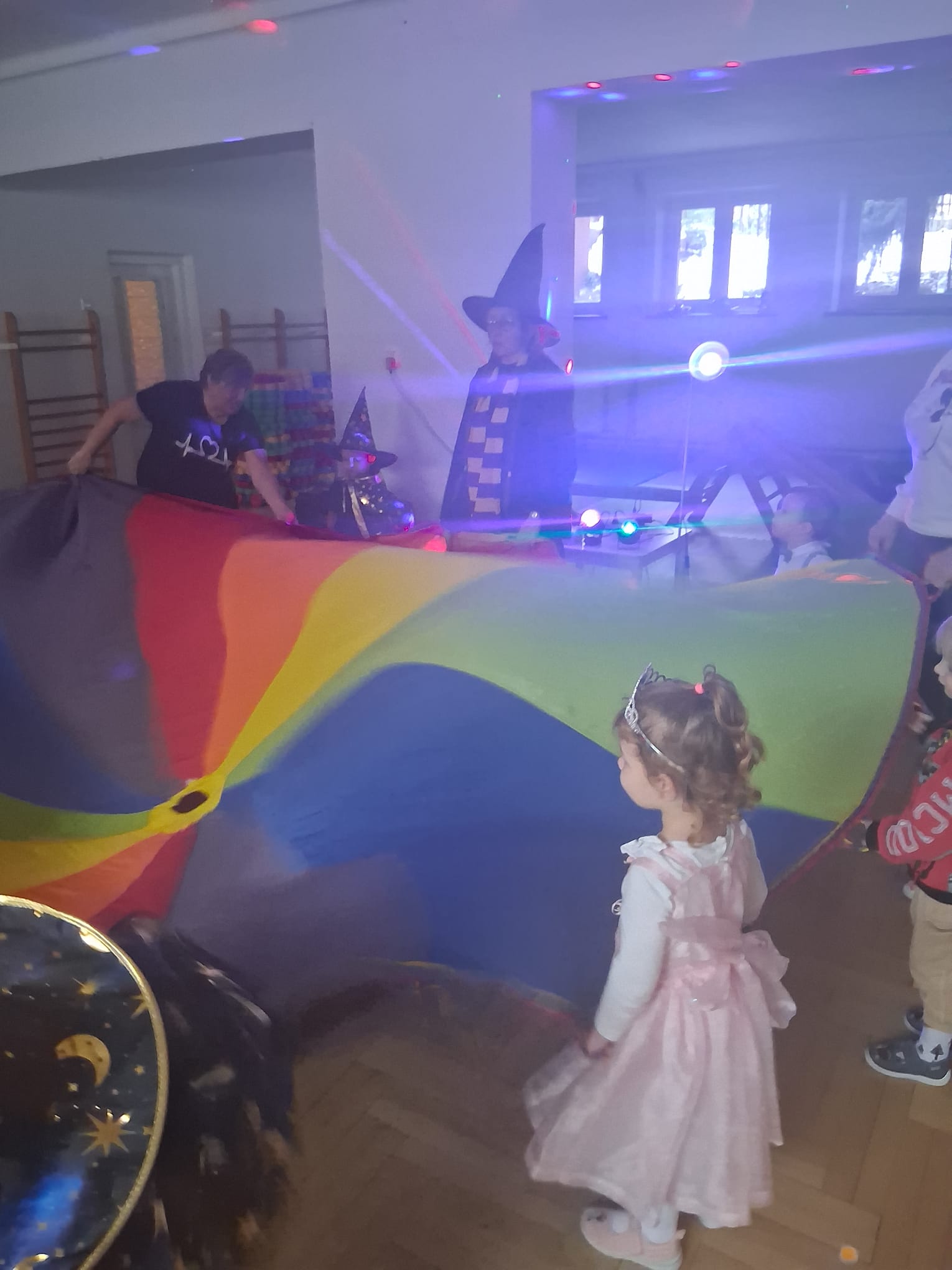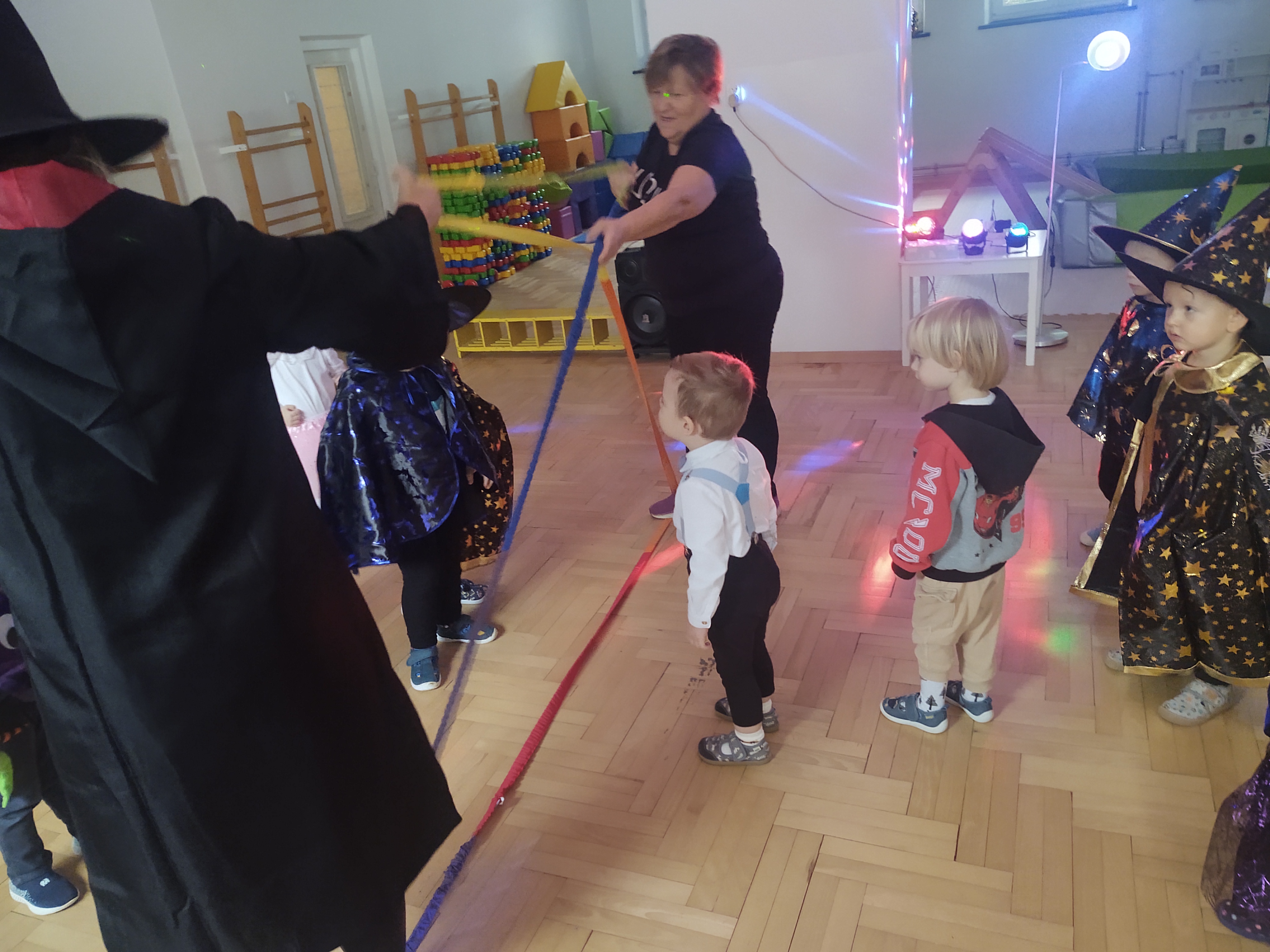 Losowały kolorowe karteczki, z wesołymi ,,przepowiedniami’’, brały udział w zabawie z magicznym kołem, cudownym eliksirem i wielu innych zabawach. Dużo radości przyniosły też zabawy z chustą animacyjną, dzieci podnosiły i opuszczały kolorową chustę ,,czarowały’’ lekkie piłeczki ( papierowe kulki) unoszące się w powietrzu oraz ukrywały się pod nią, tworząc tajemniczą andrzejkową ,, jaskinię’’. Te aktywności pozwoliły maluszkom na wspólną integrację, ruch i rozwijanie koordynacji.