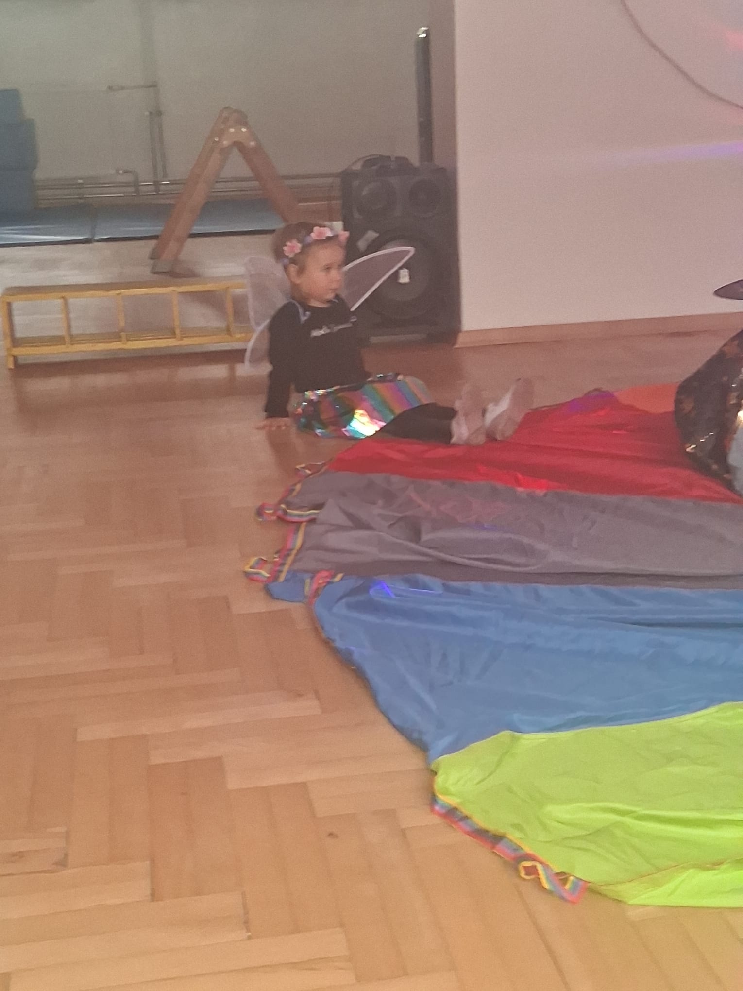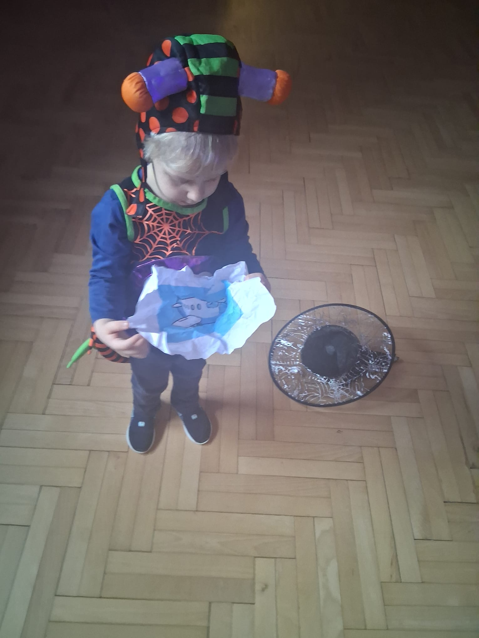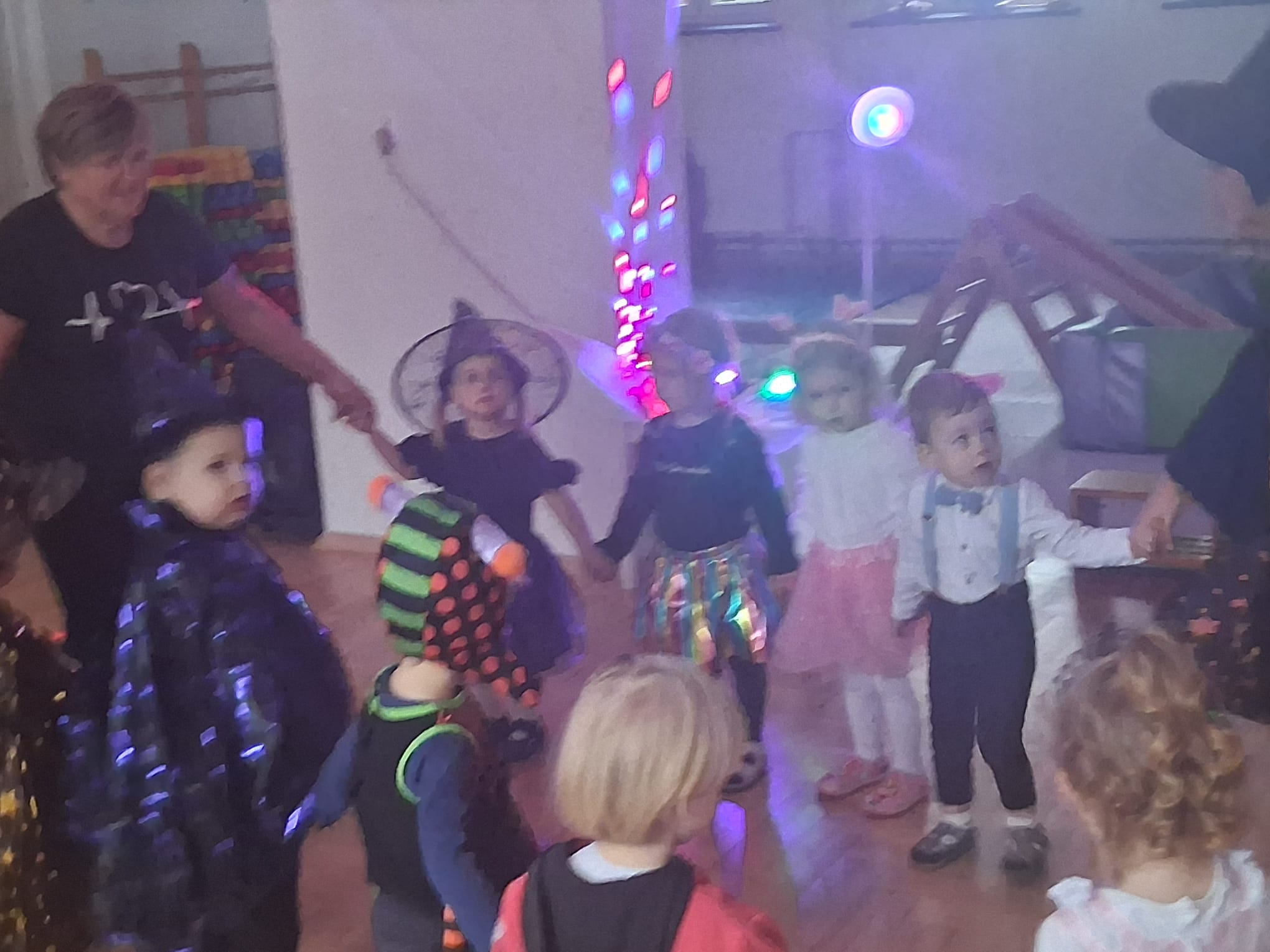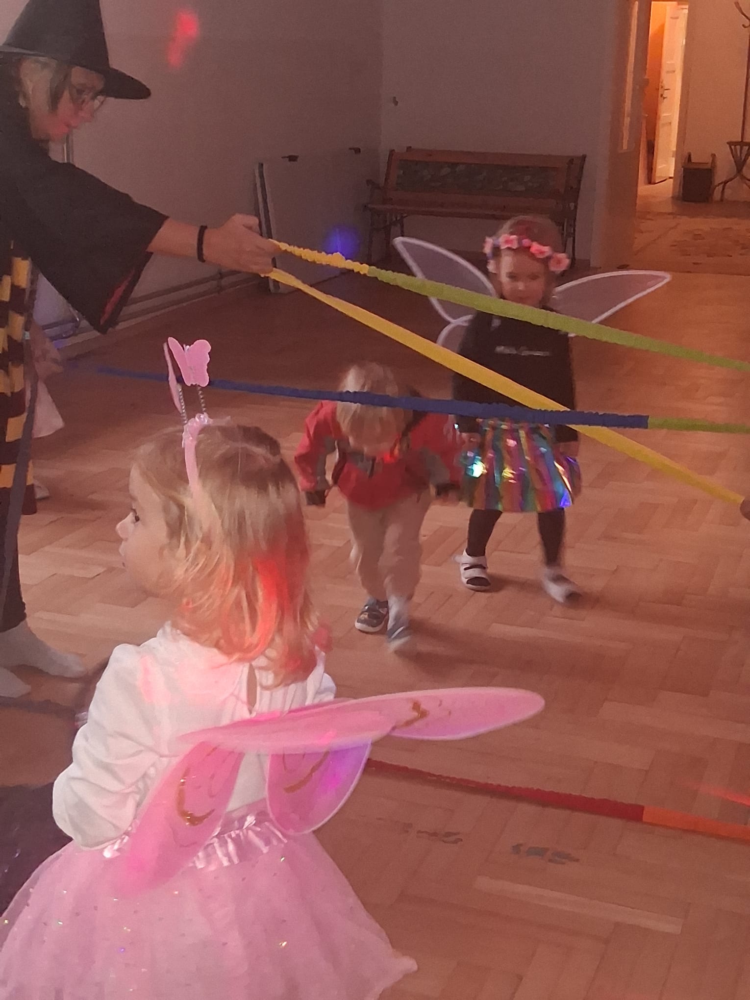 Losowały kolorowe karteczki, z wesołymi ,,przepowiedniami’’, brały udział w zabawie z magicznym kołem, cudownym eliksirem i wielu innych zabawach. Dużo radości przyniosły też zabawy z chustą animacyjną, dzieci podnosiły i opuszczały kolorową chustę ,,czarowały’’ lekkie piłeczki ( papierowe kulki) unoszące się w powietrzu oraz ukrywały się pod nią, tworząc tajemniczą andrzejkową ,, jaskinię’’. Te aktywności pozwoliły maluszkom na wspólną integrację, ruch i rozwijanie koordynacji.