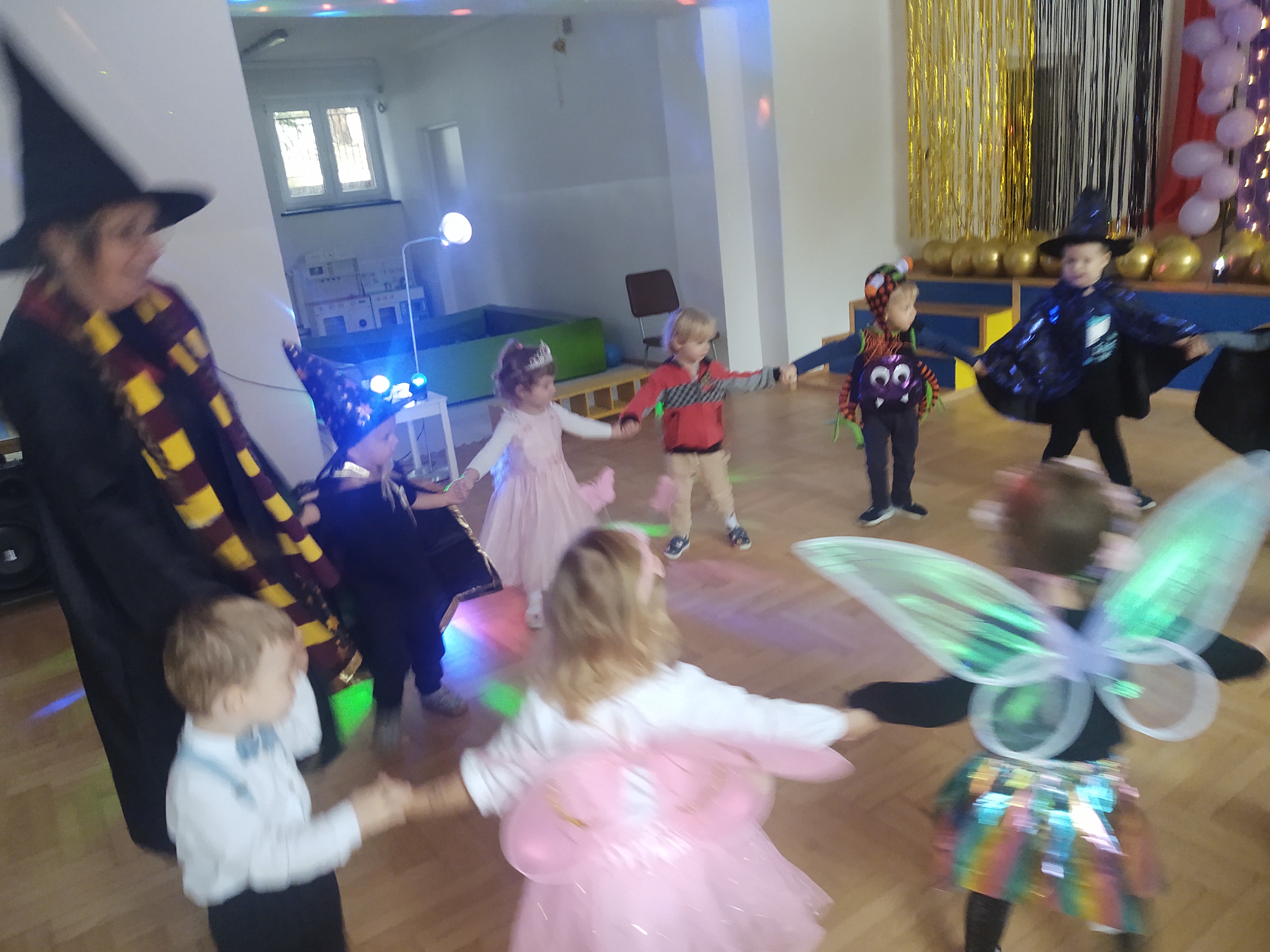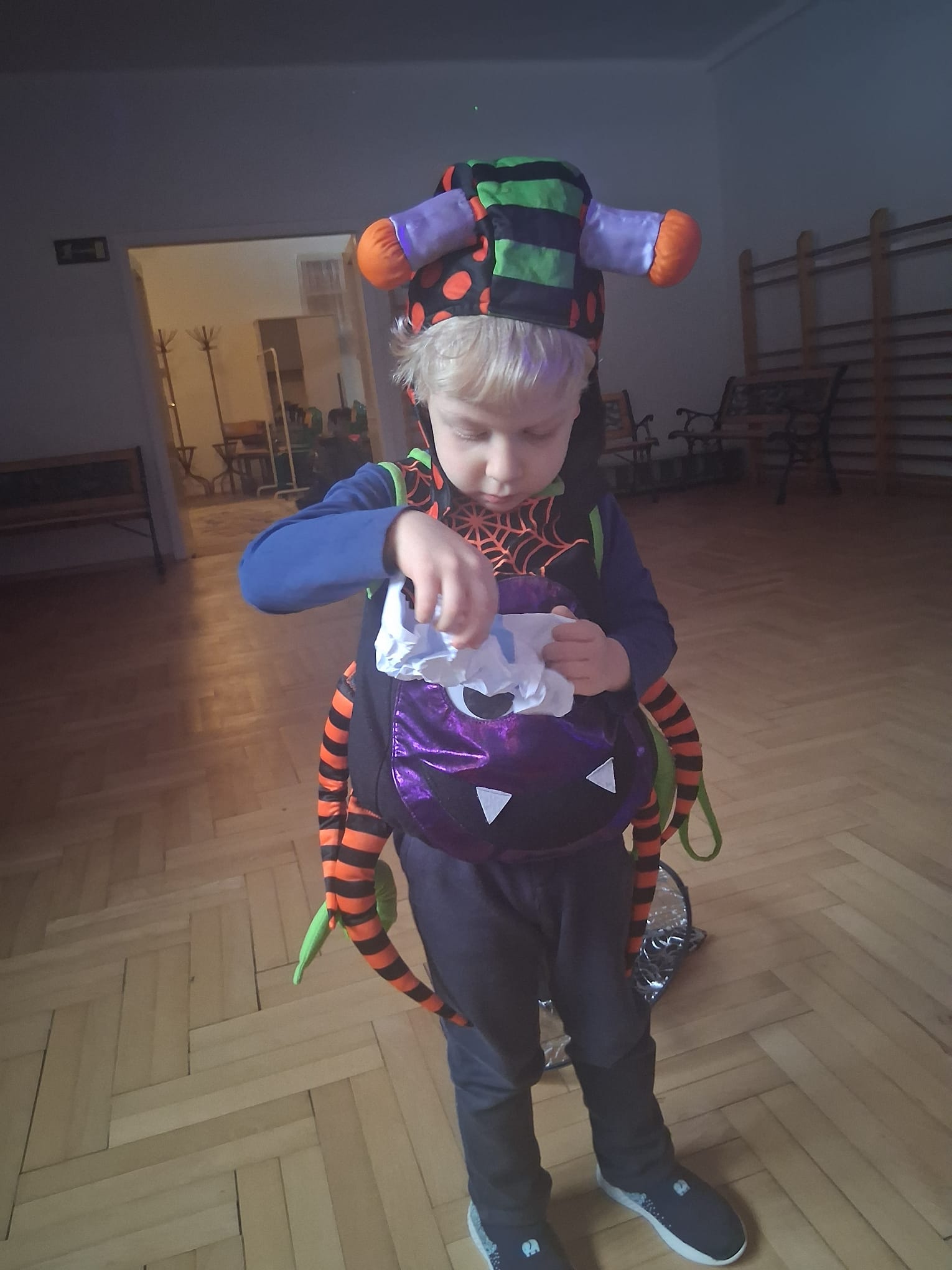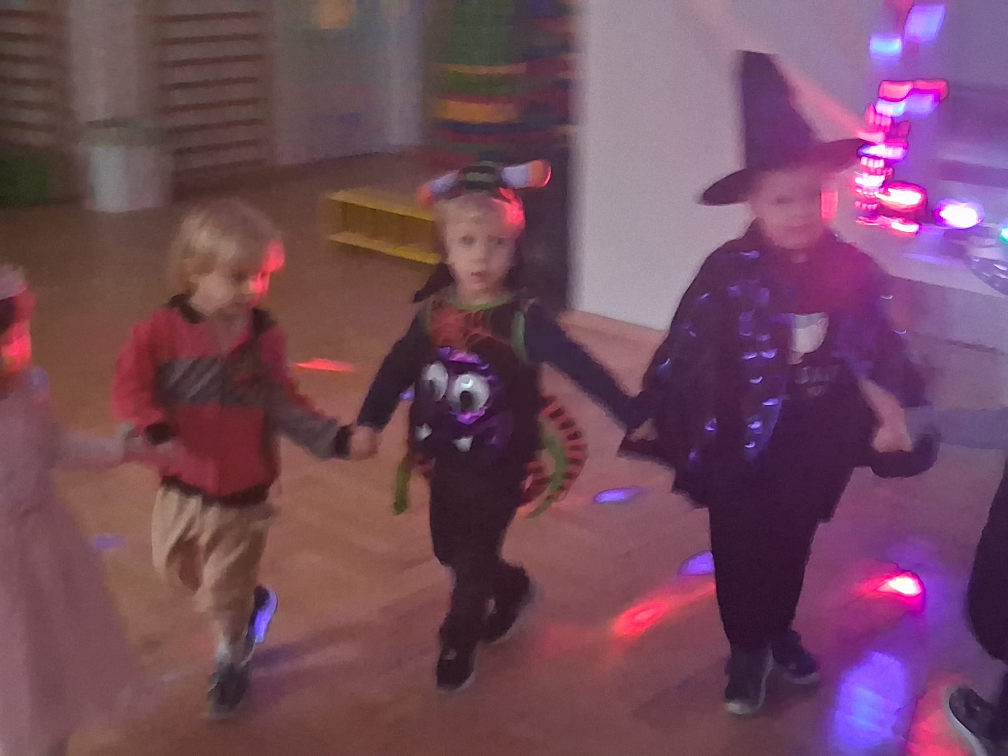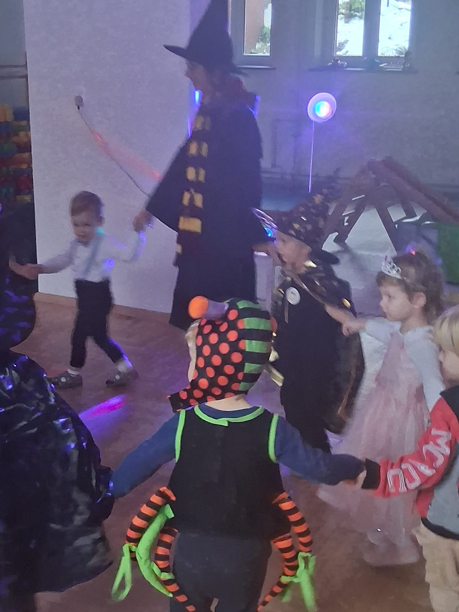 Losowały kolorowe karteczki, z wesołymi ,,przepowiedniami’’, brały udział w zabawie z magicznym kołem, cudownym eliksirem i wielu innych zabawach. Dużo radości przyniosły też zabawy z chustą animacyjną, dzieci podnosiły i opuszczały kolorową chustę ,,czarowały’’ lekkie piłeczki ( papierowe kulki) unoszące się w powietrzu oraz ukrywały się pod nią, tworząc tajemniczą andrzejkową ,, jaskinię’’. Te aktywności pozwoliły maluszkom na wspólną integrację, ruch i rozwijanie koordynacji.