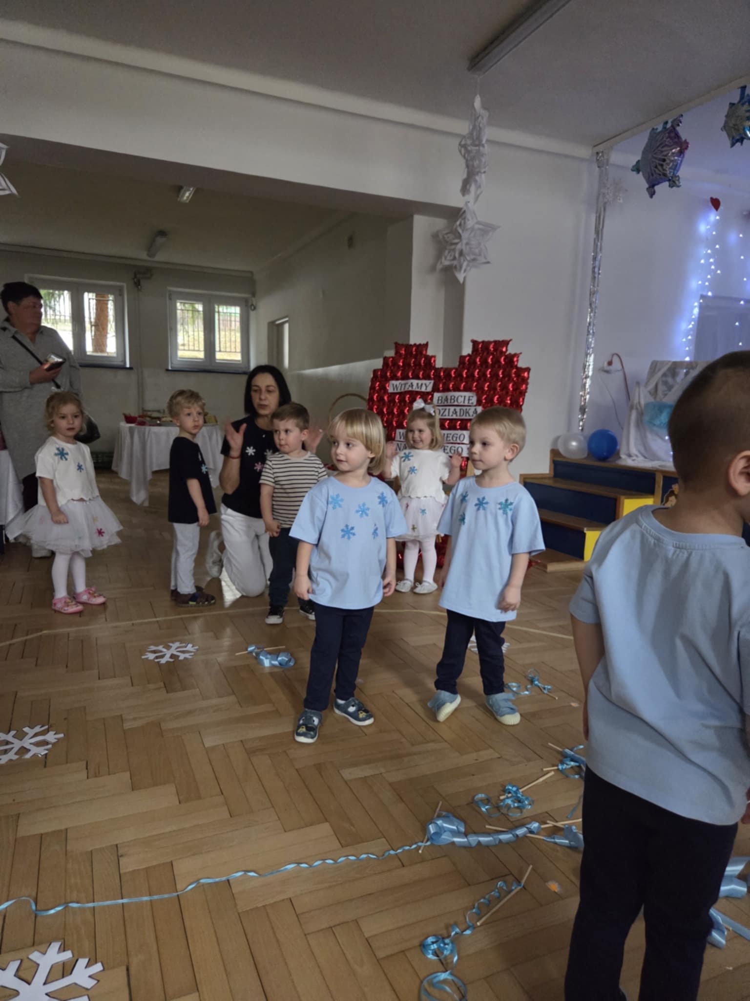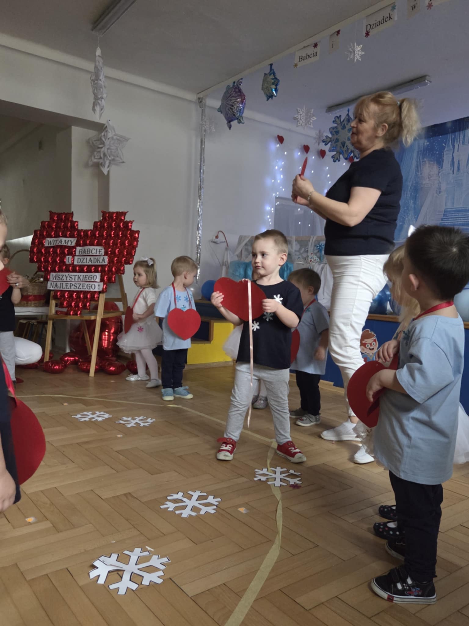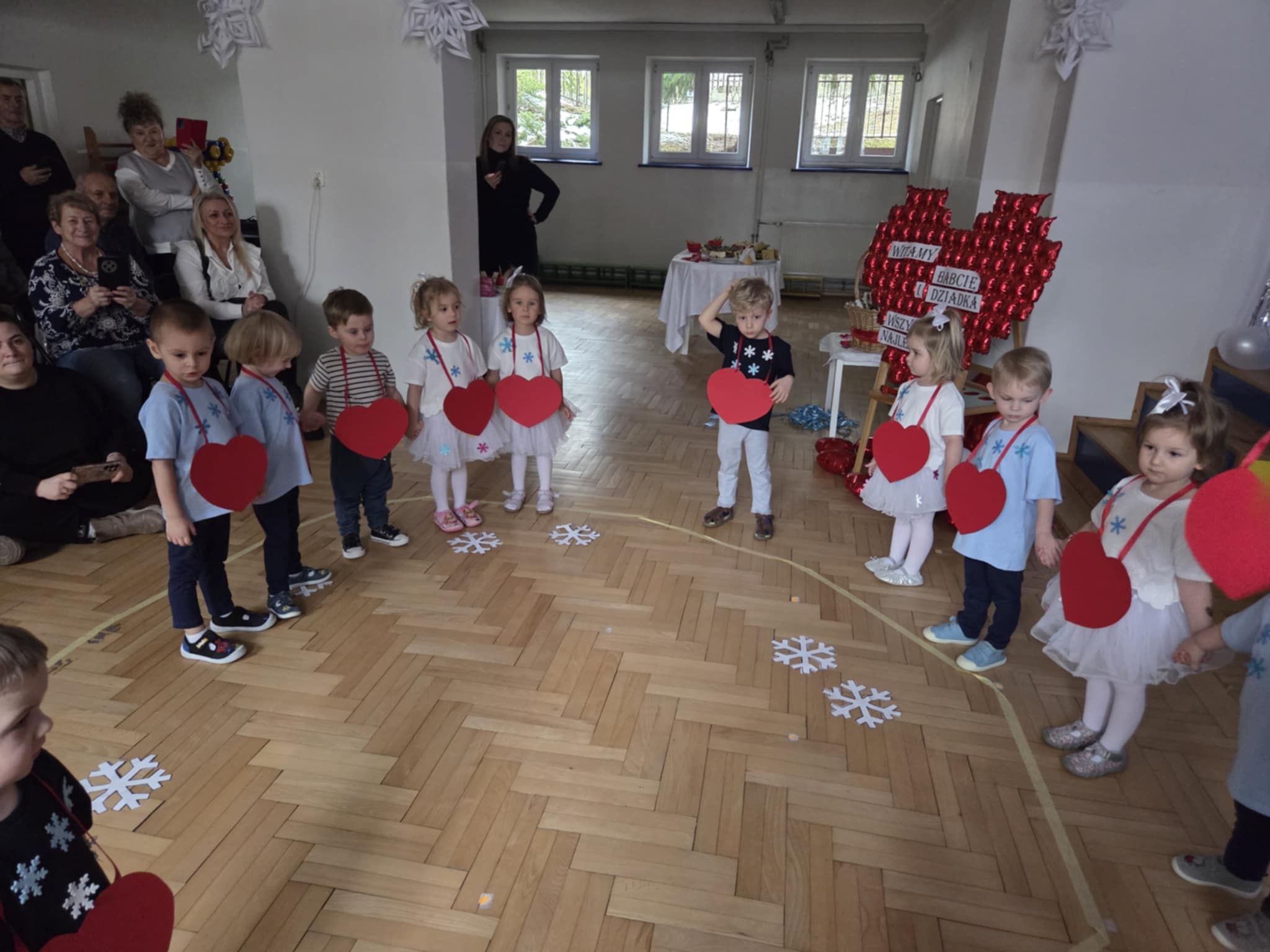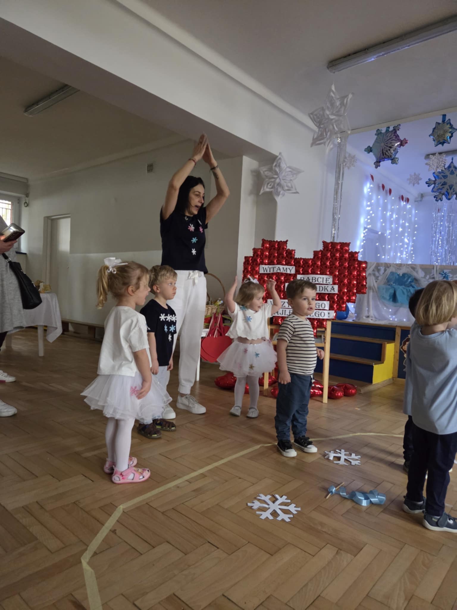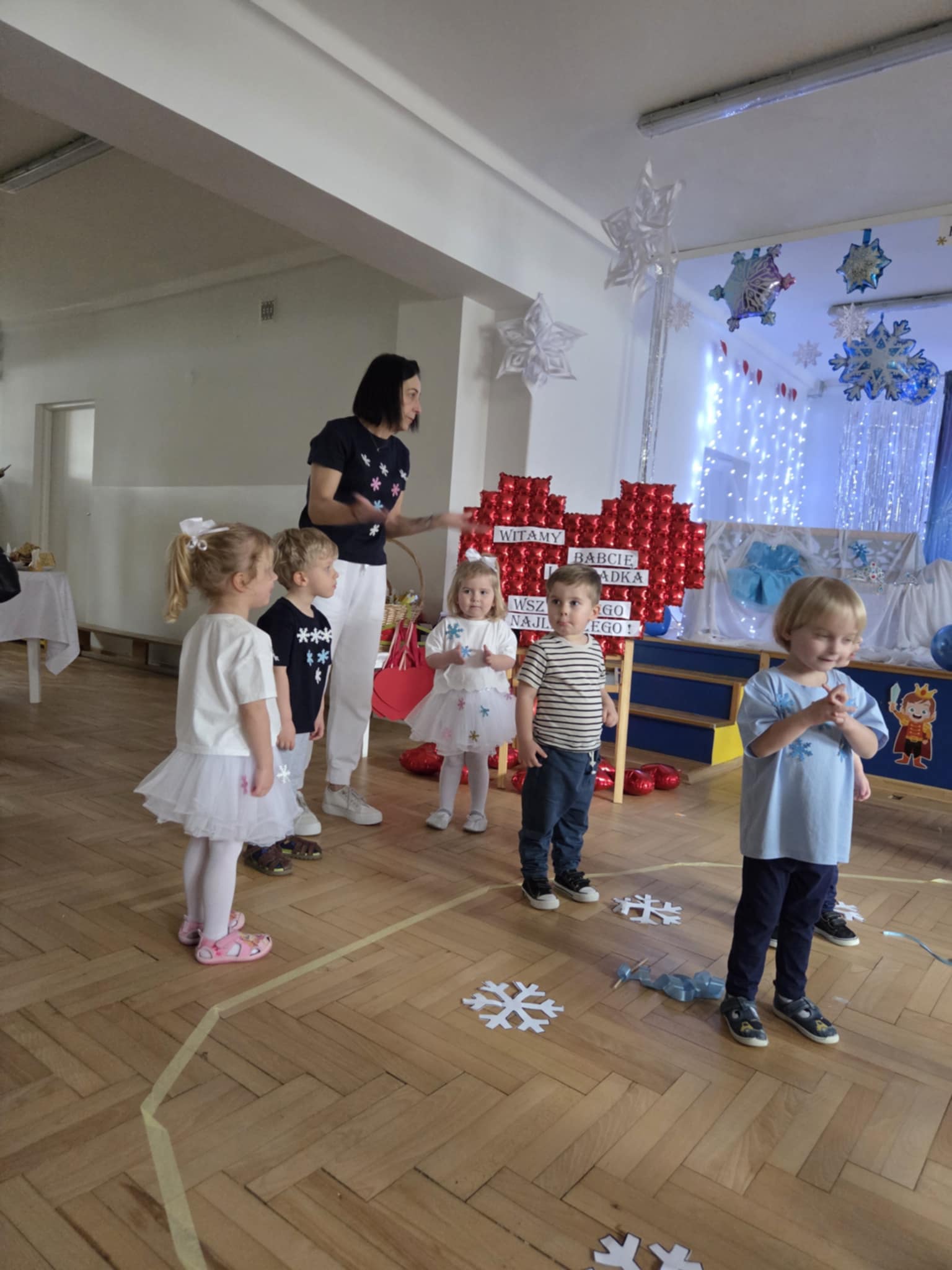 Uroczystość rozpoczęła się występem dzieci, które zaprezentowały przygotowane piosenki oraz układy taneczne. Przedszkolaki z zaangażowaniem śpiewały i tańczyły, a ich występy zostały nagrodzone gromkimi brawami i uśmiechami wzruszonych babć i dziadków.