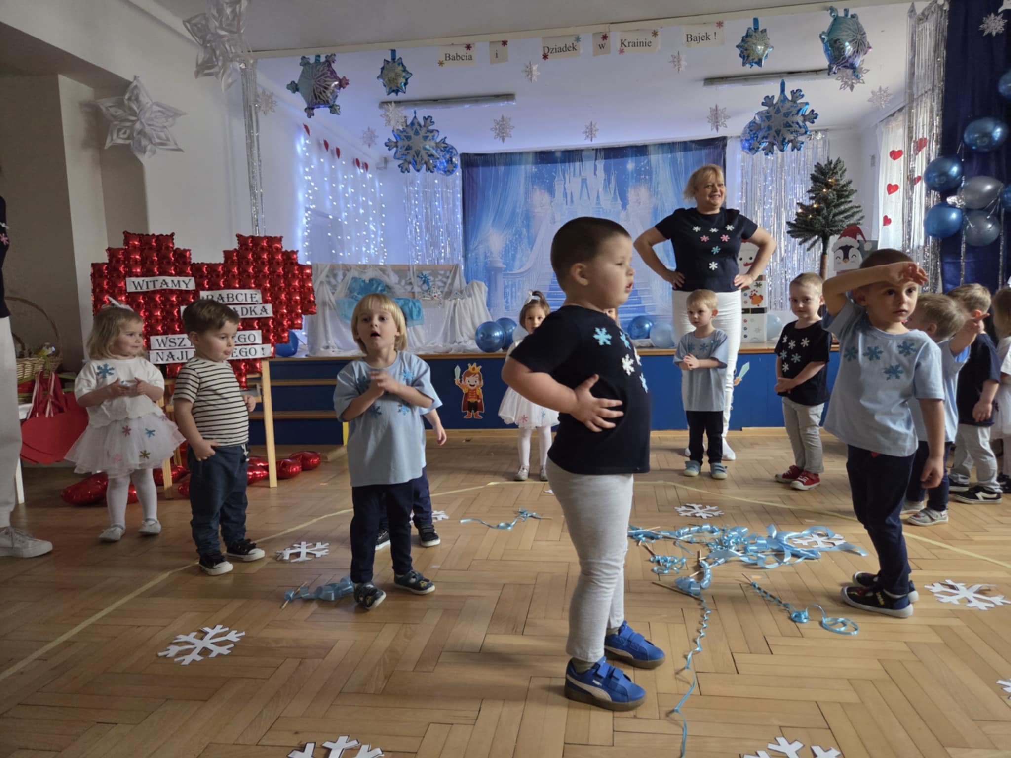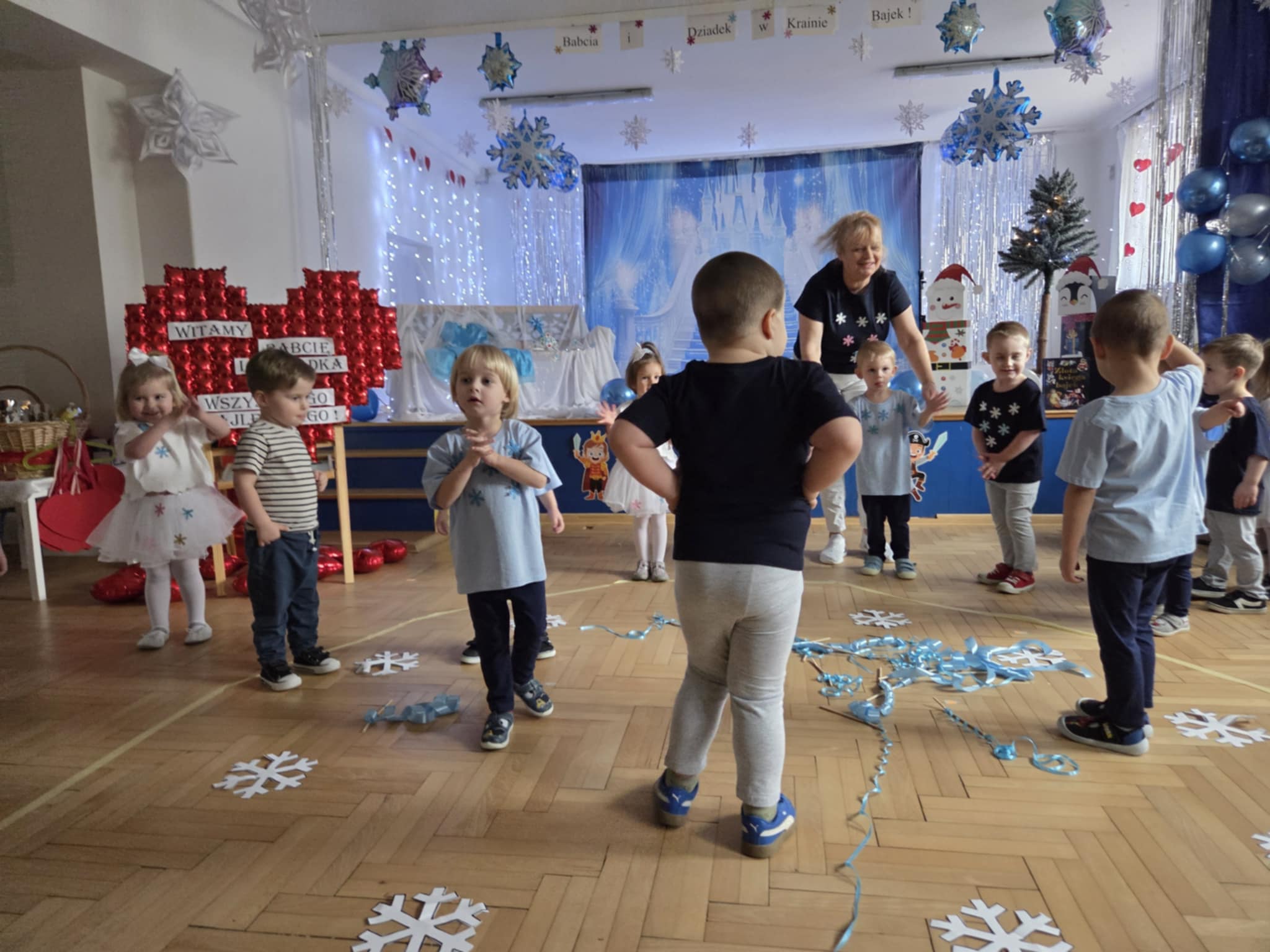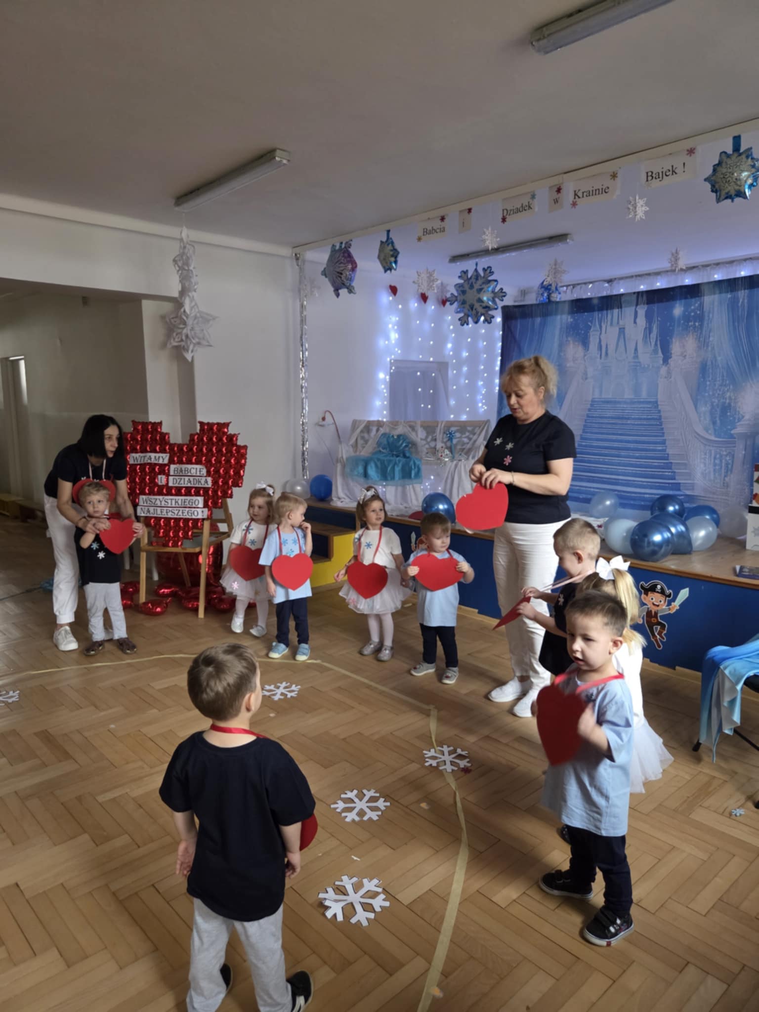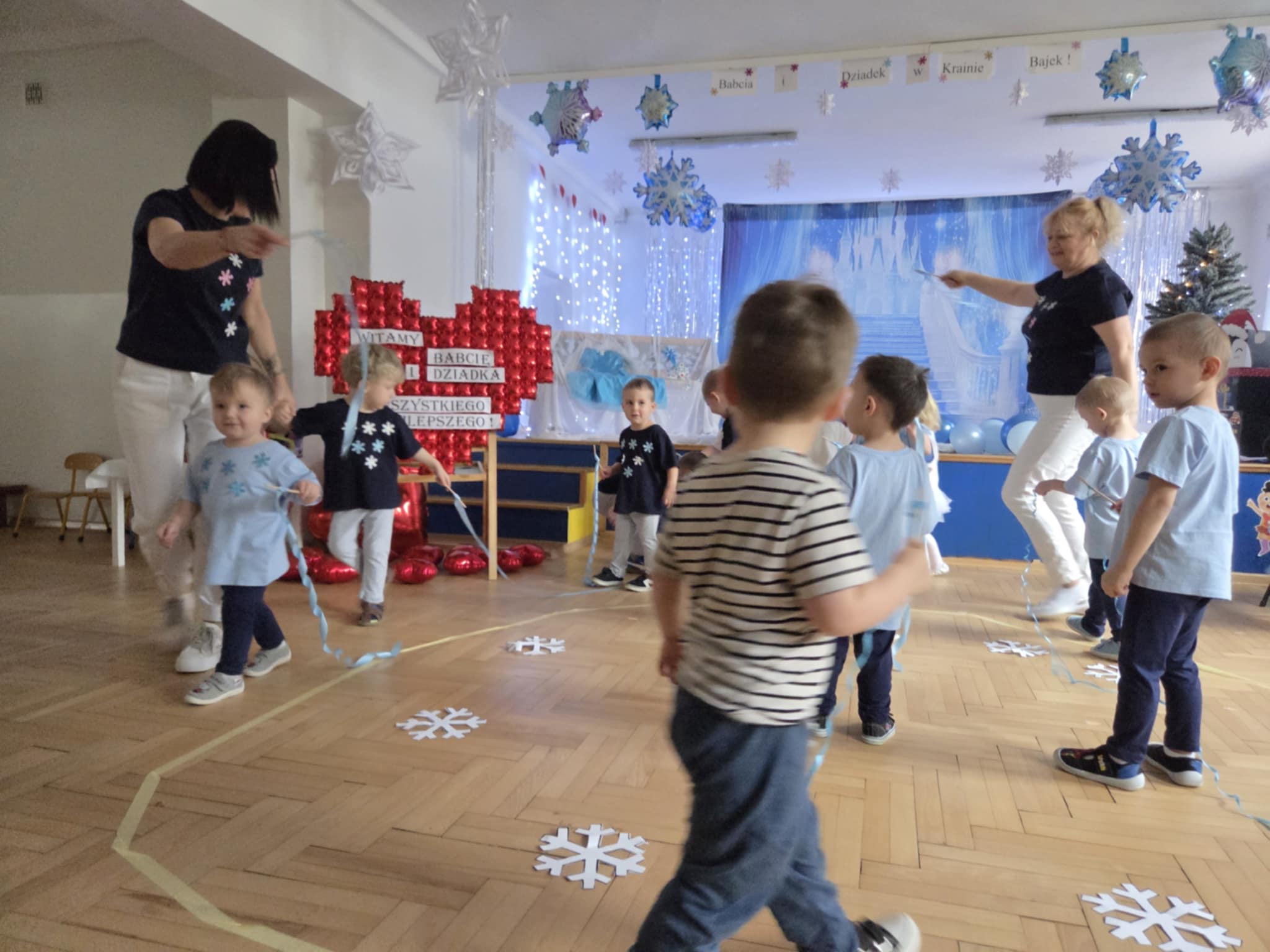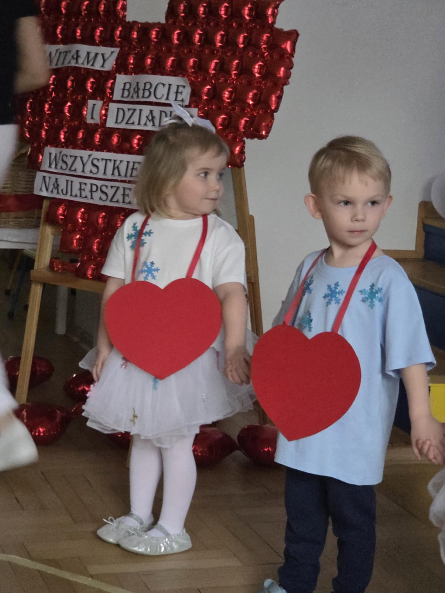 Uroczystość rozpoczęła się występem dzieci, które zaprezentowały przygotowane piosenki oraz układy taneczne. Przedszkolaki z zaangażowaniem śpiewały i tańczyły, a ich występy zostały nagrodzone gromkimi brawami i uśmiechami wzruszonych babć i dziadków.