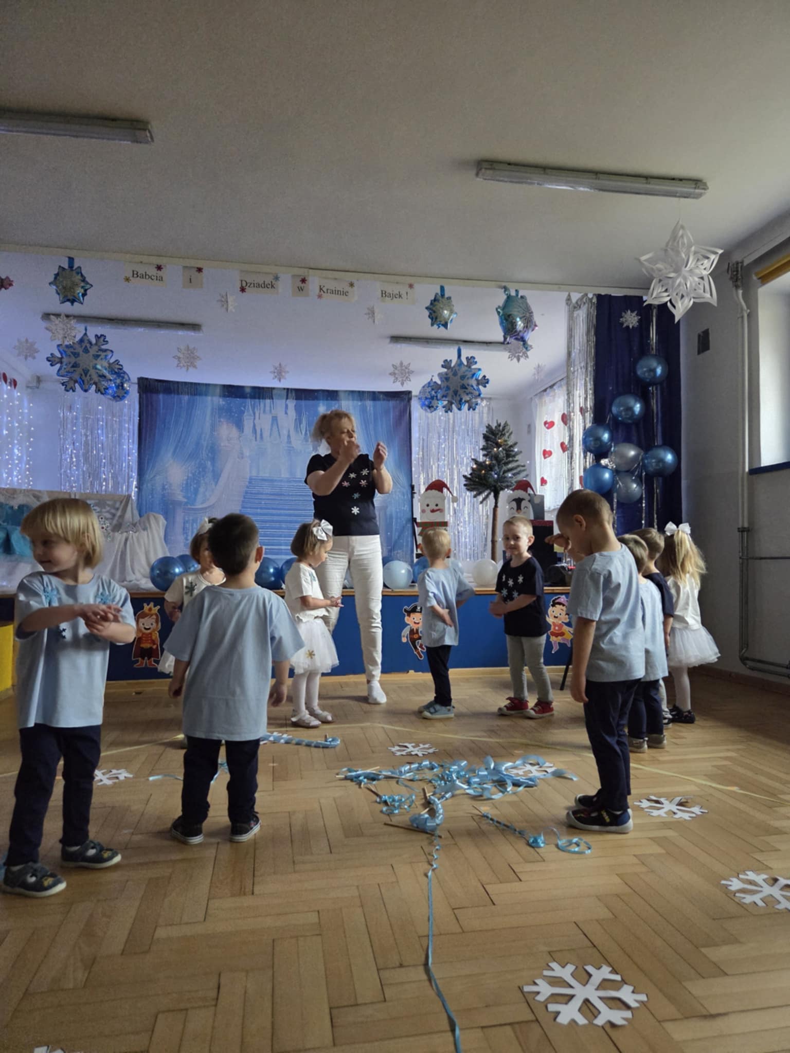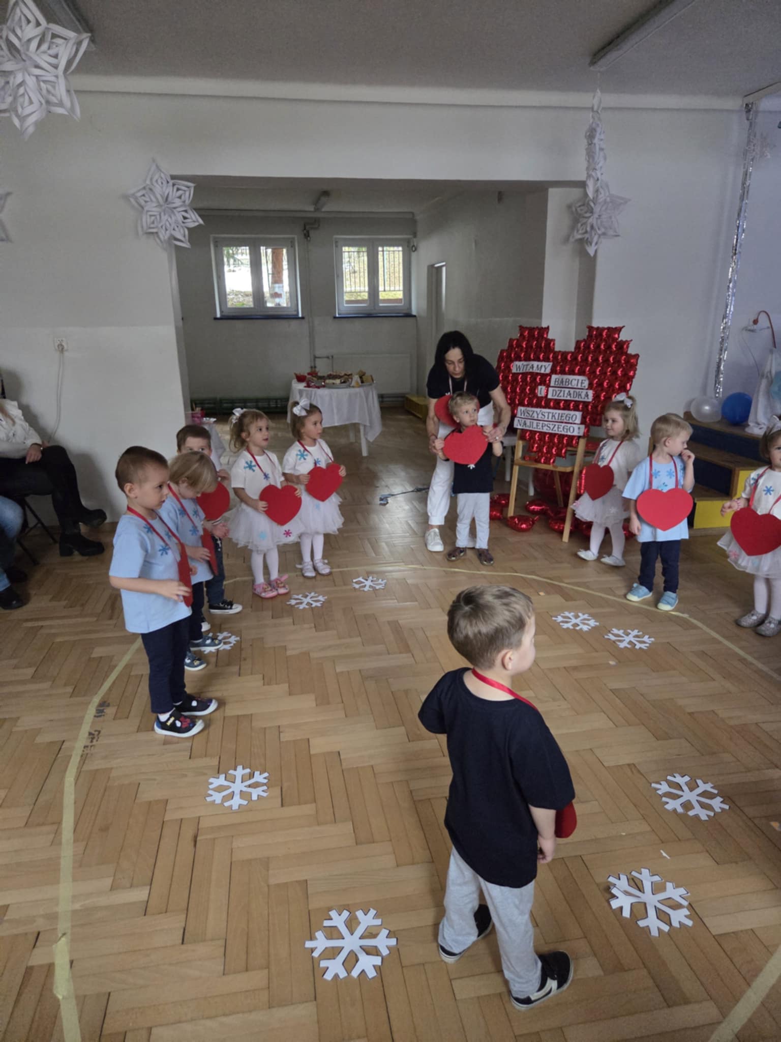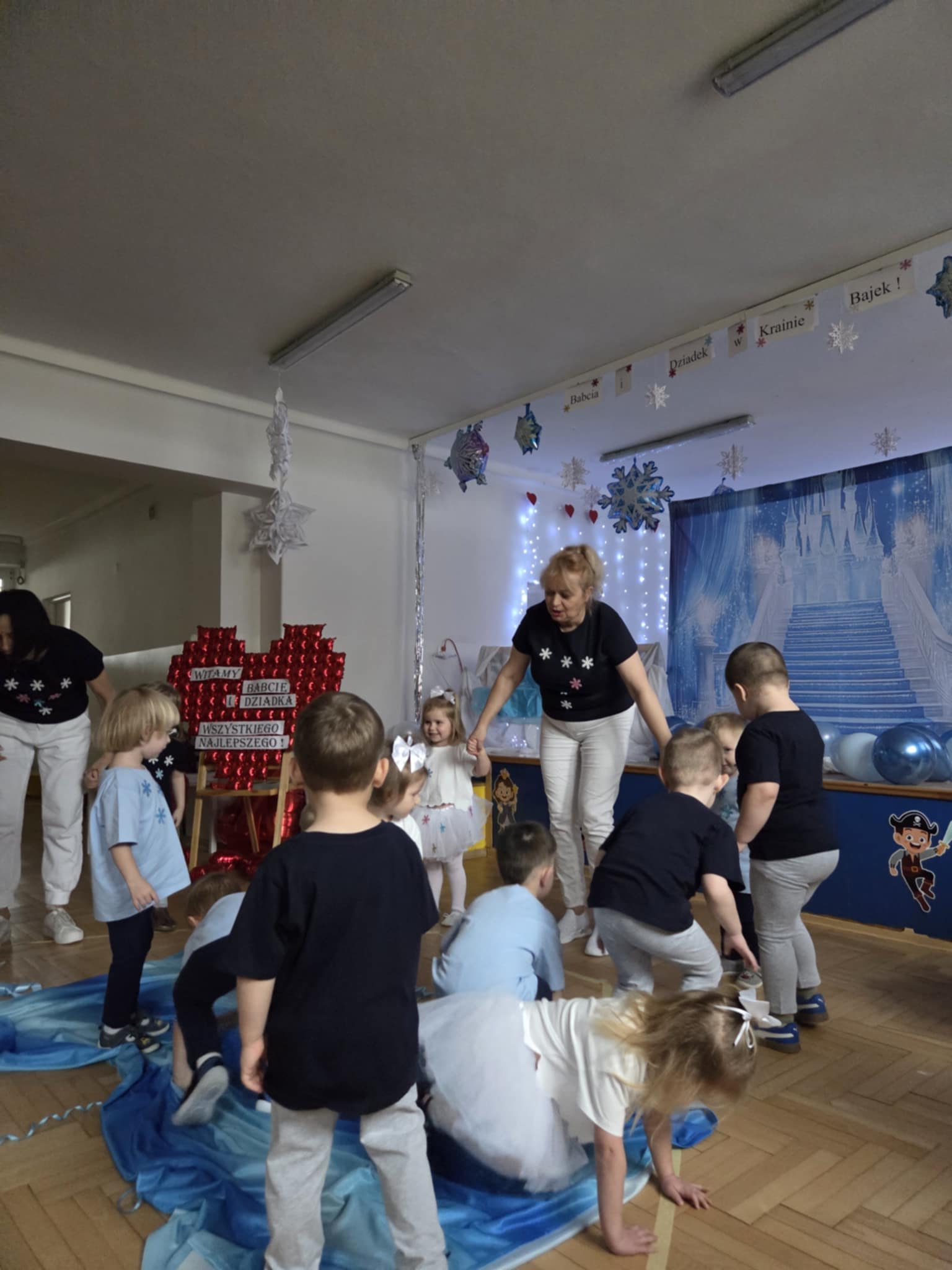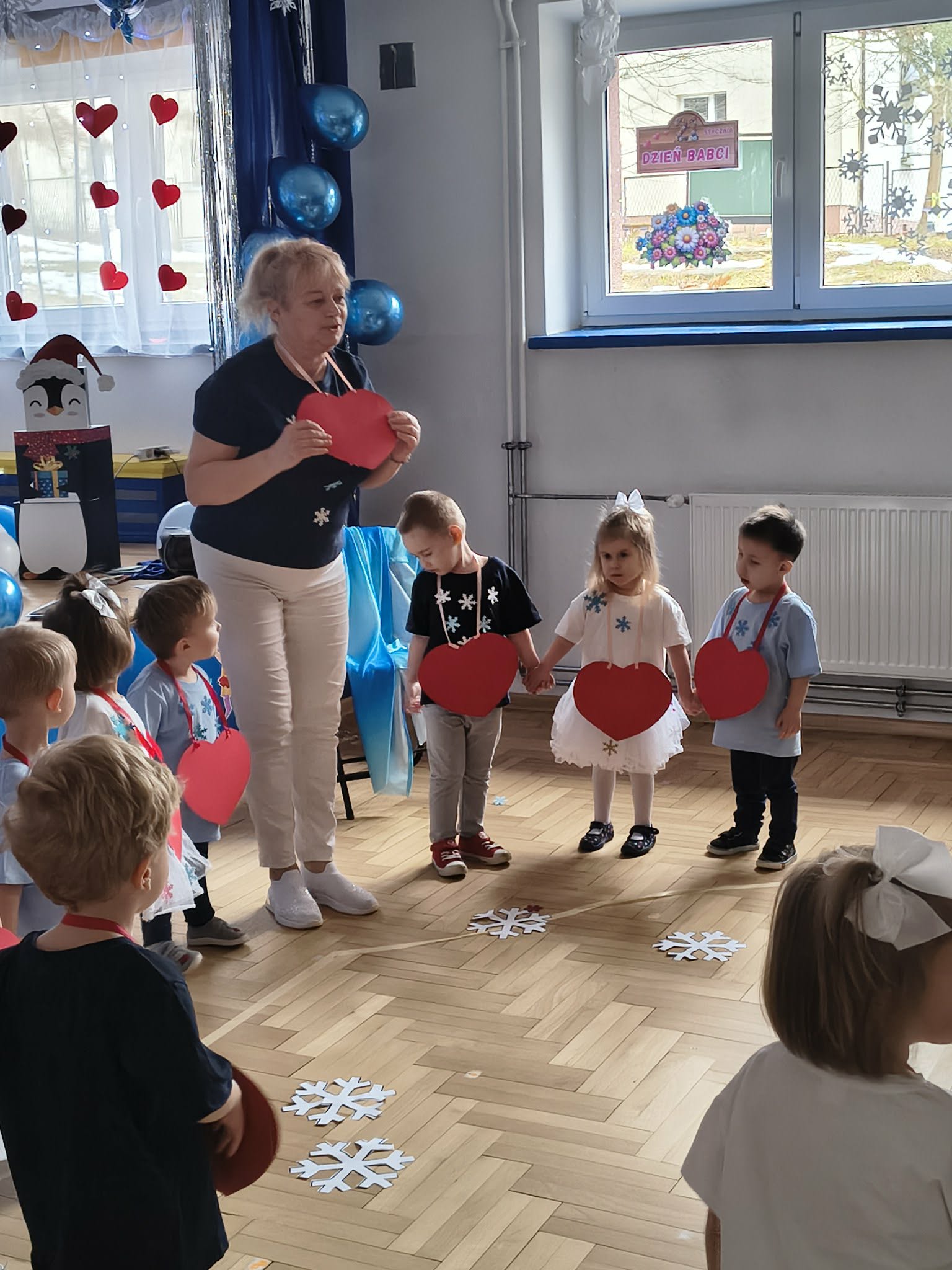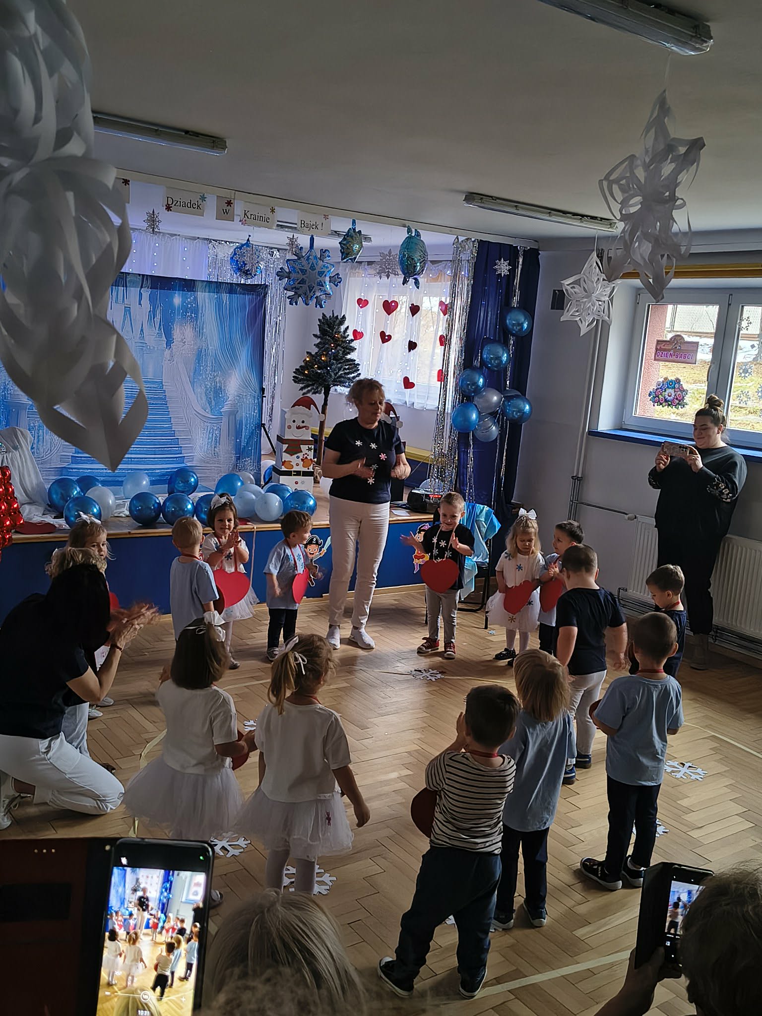 Uroczystość rozpoczęła się występem dzieci, które zaprezentowały przygotowane piosenki oraz układy taneczne. Przedszkolaki z zaangażowaniem śpiewały i tańczyły, a ich występy zostały nagrodzone gromkimi brawami i uśmiechami wzruszonych babć i dziadków.