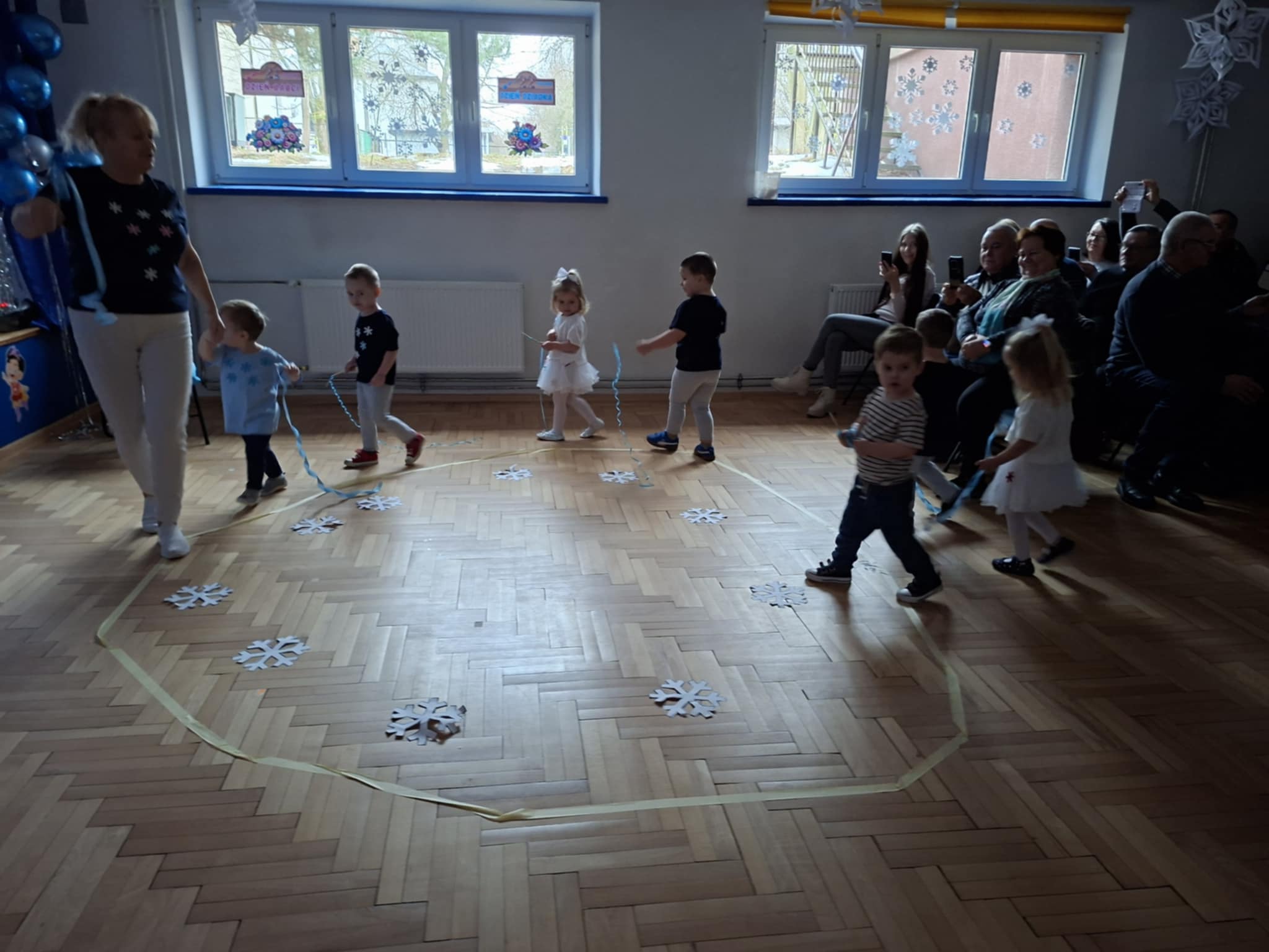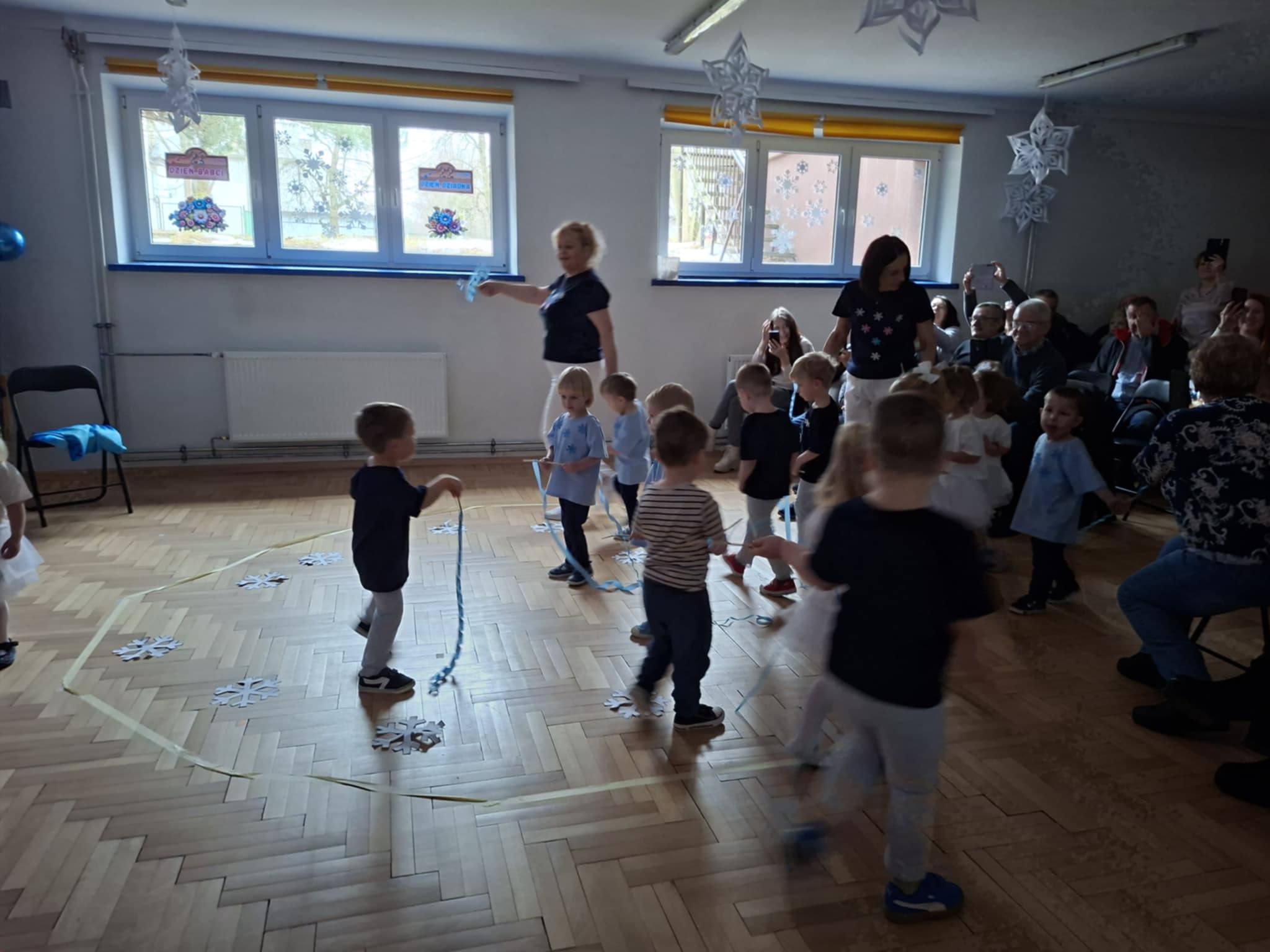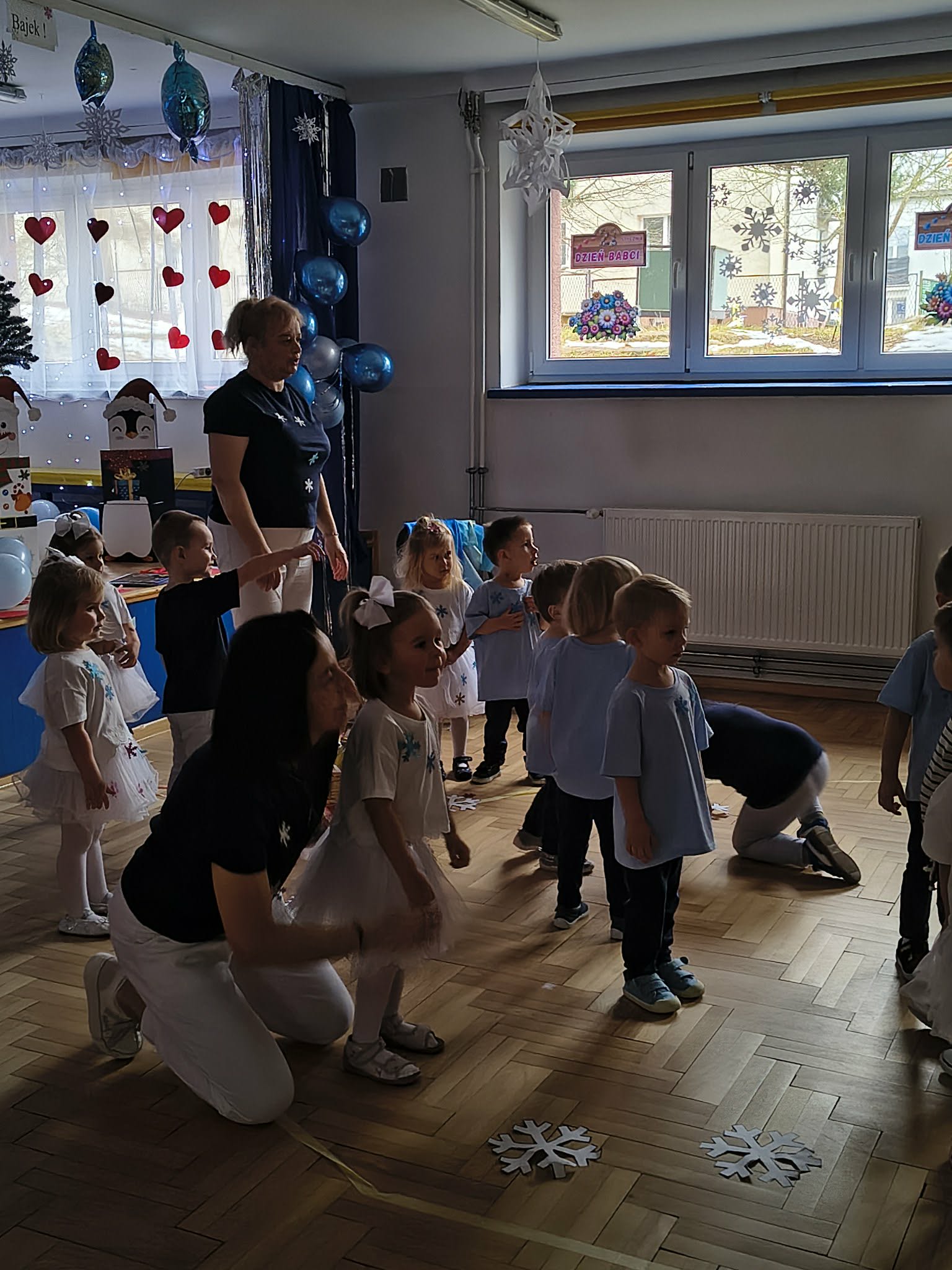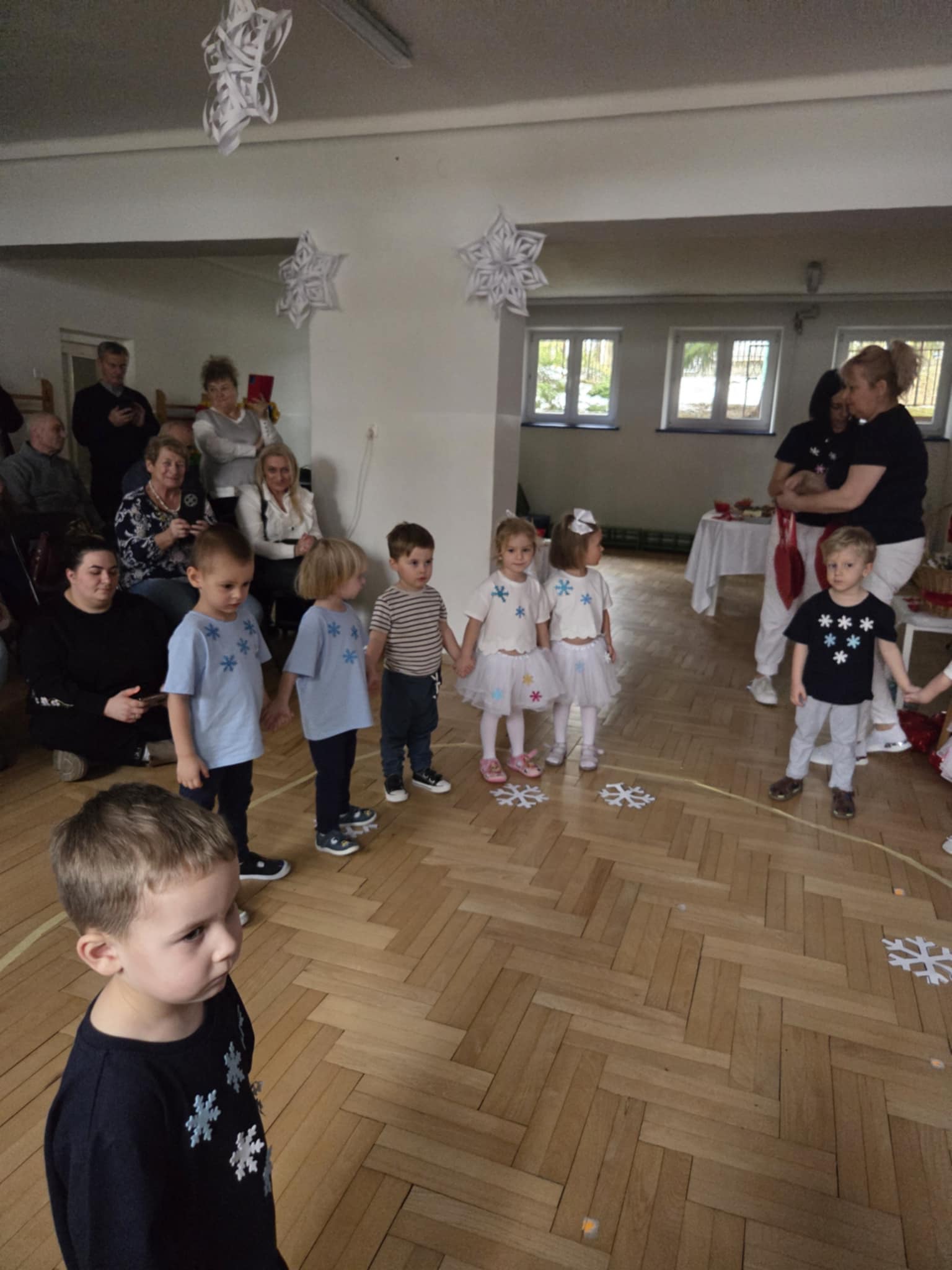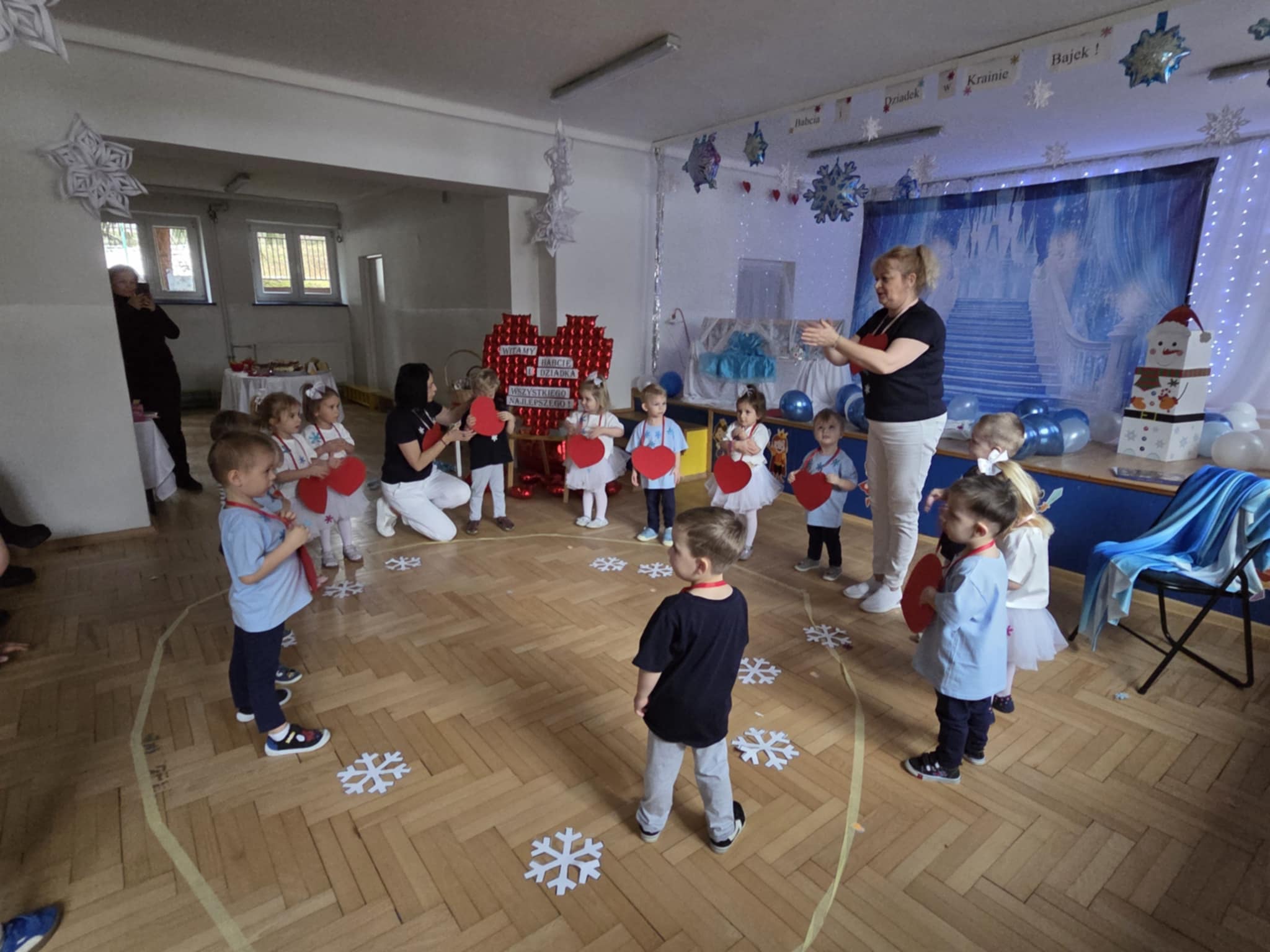 Uroczystość rozpoczęła się występem dzieci, które zaprezentowały przygotowane piosenki oraz układy taneczne. Przedszkolaki z zaangażowaniem śpiewały i tańczyły, a ich występy zostały nagrodzone gromkimi brawami i uśmiechami wzruszonych babć i dziadków.