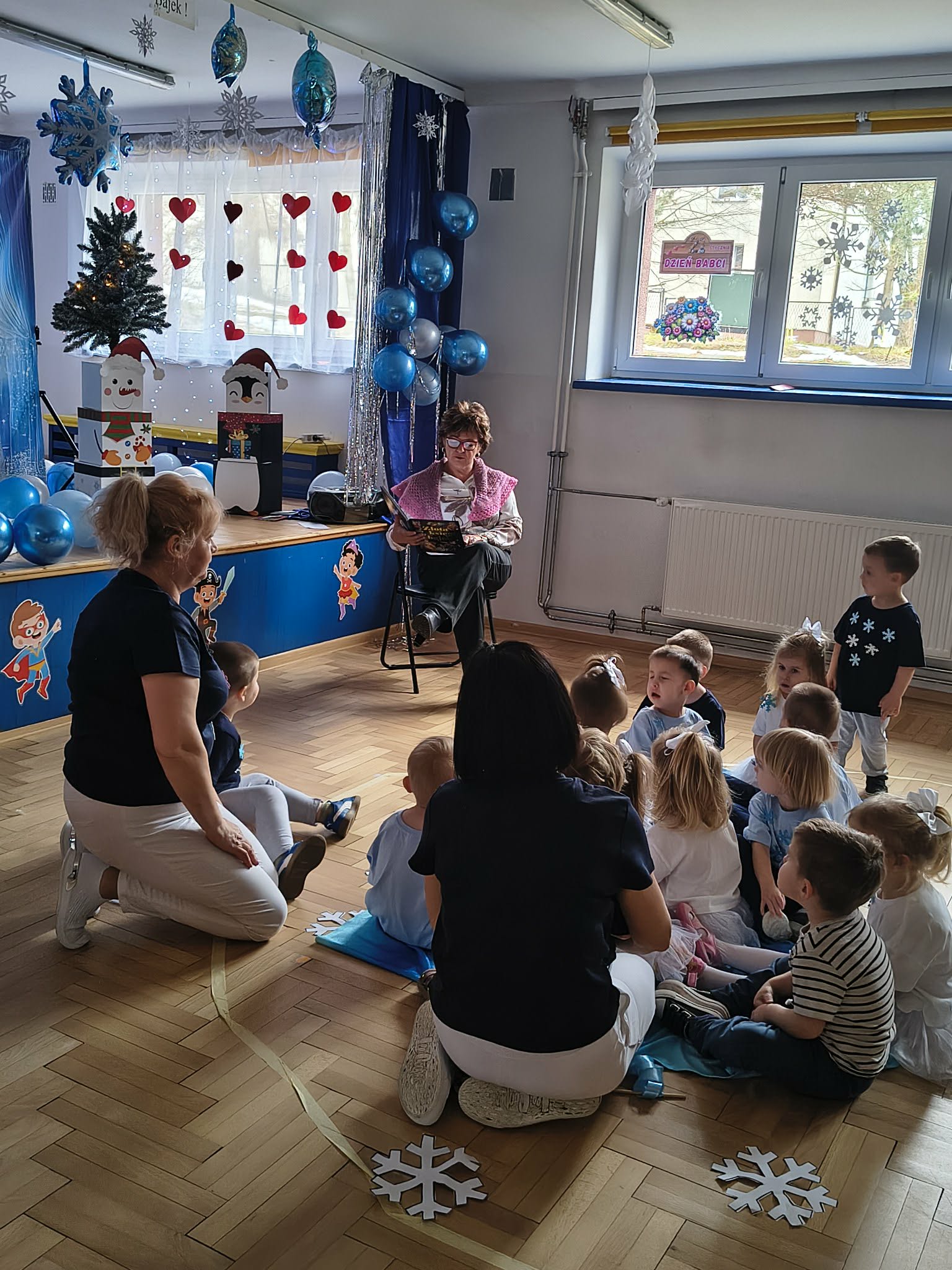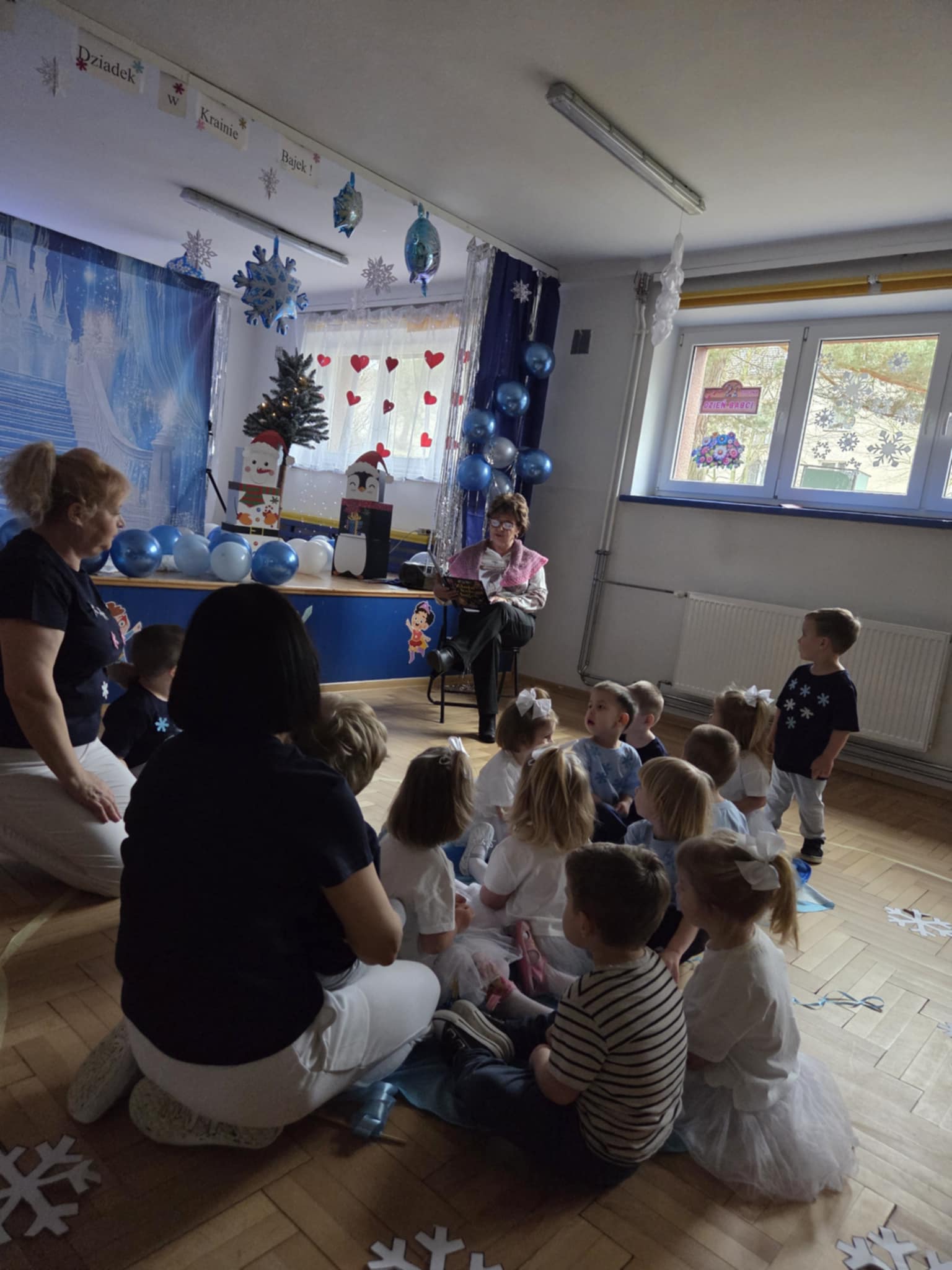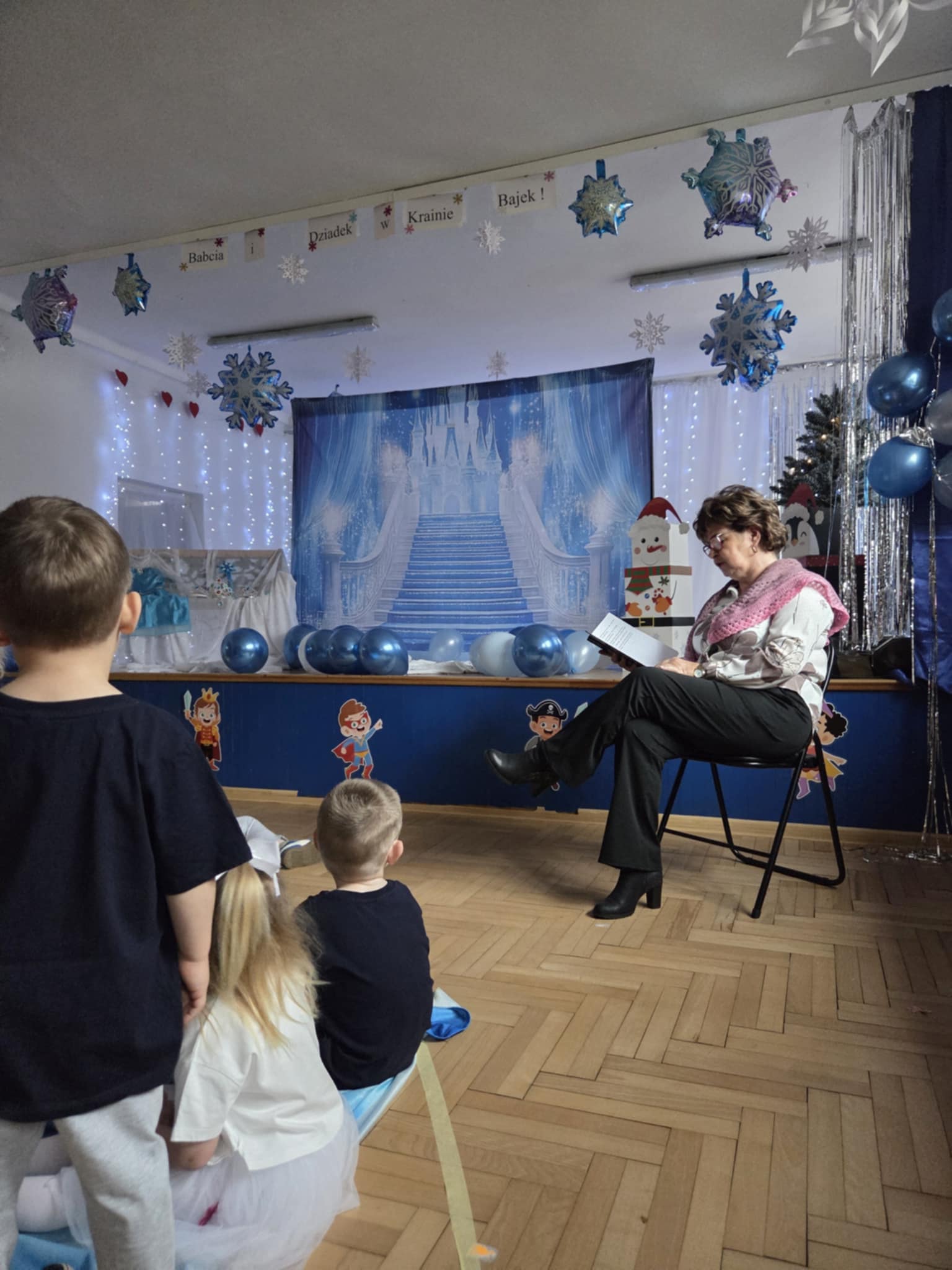 Szczególnym momentem spotkania było czytanie bajki o Pani Zimie przez jedną z babć. Dzieci z zaciekawieniem słuchały opowieści, która wprowadziła wszystkich w magiczny, bajkowy klimat i podkreśliła wyjątkową rolę wspólnego czytania w relacjach międzypokoleniowych.