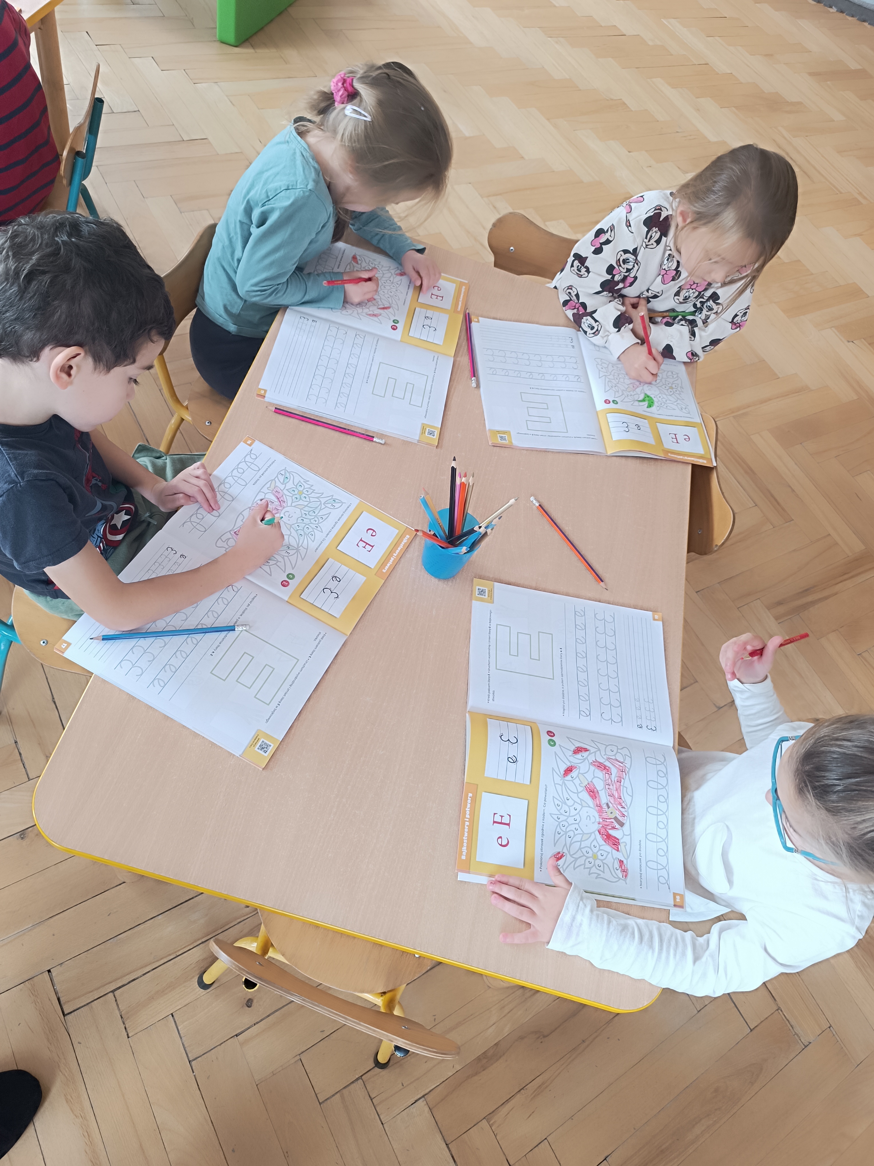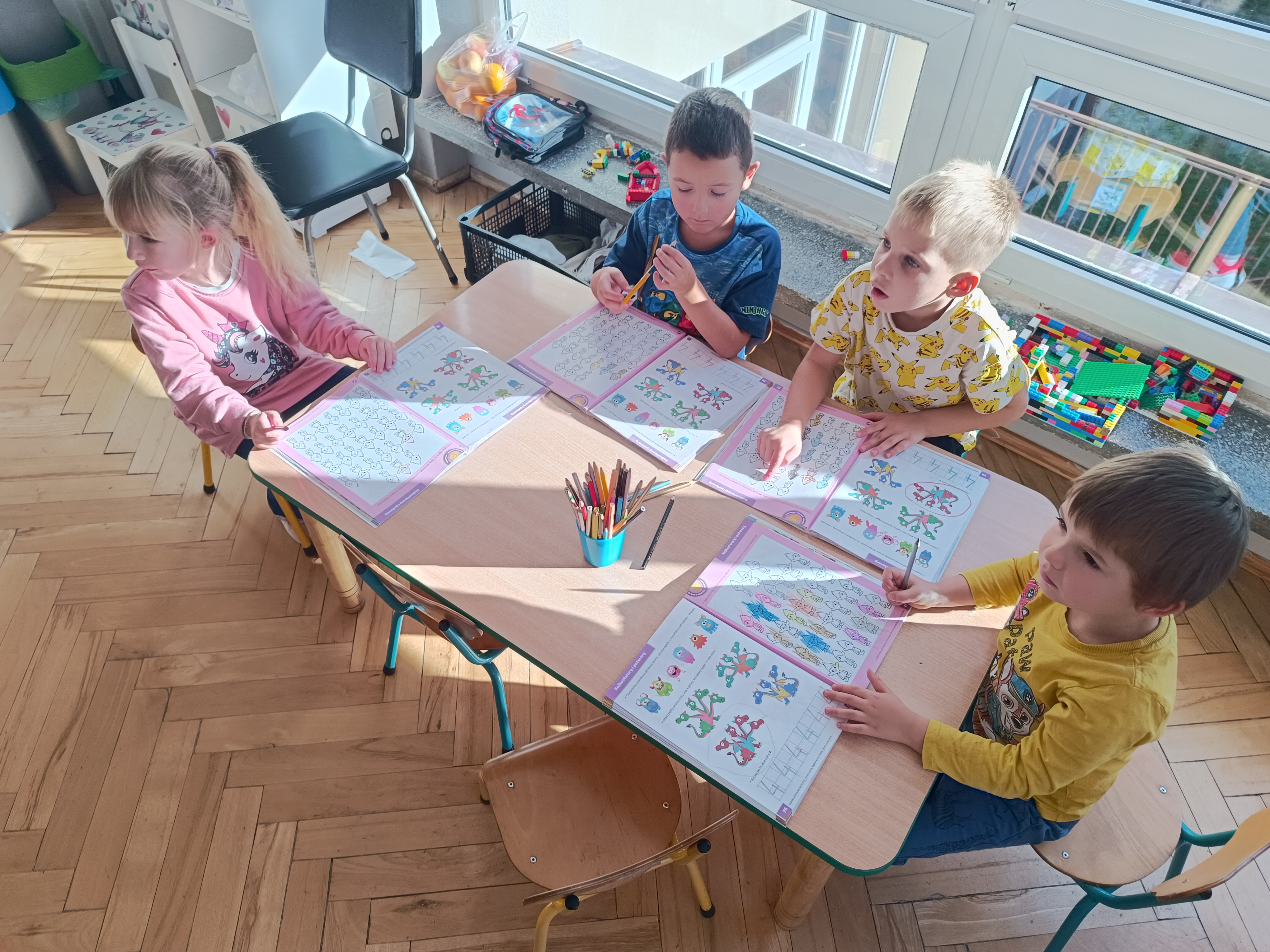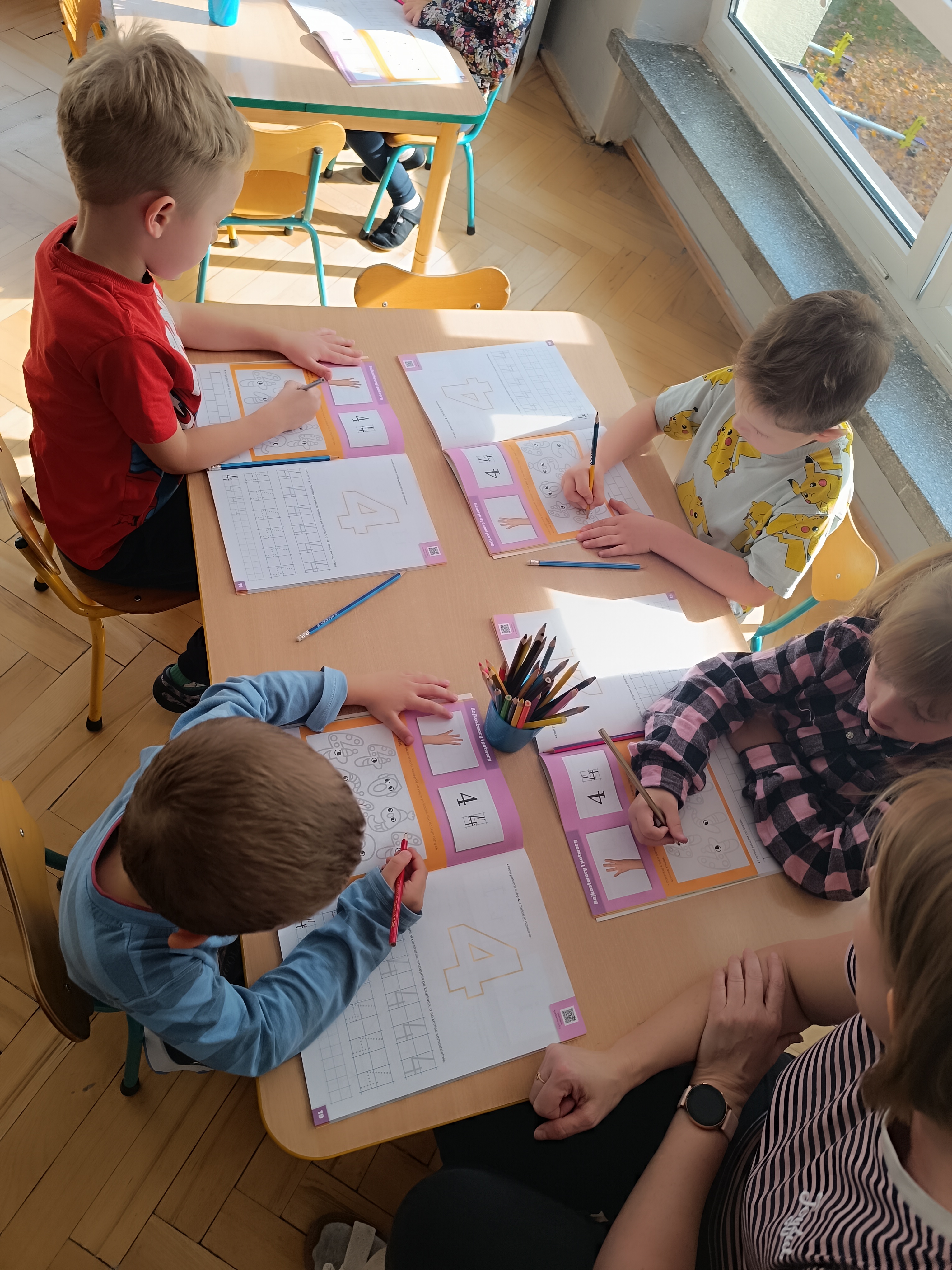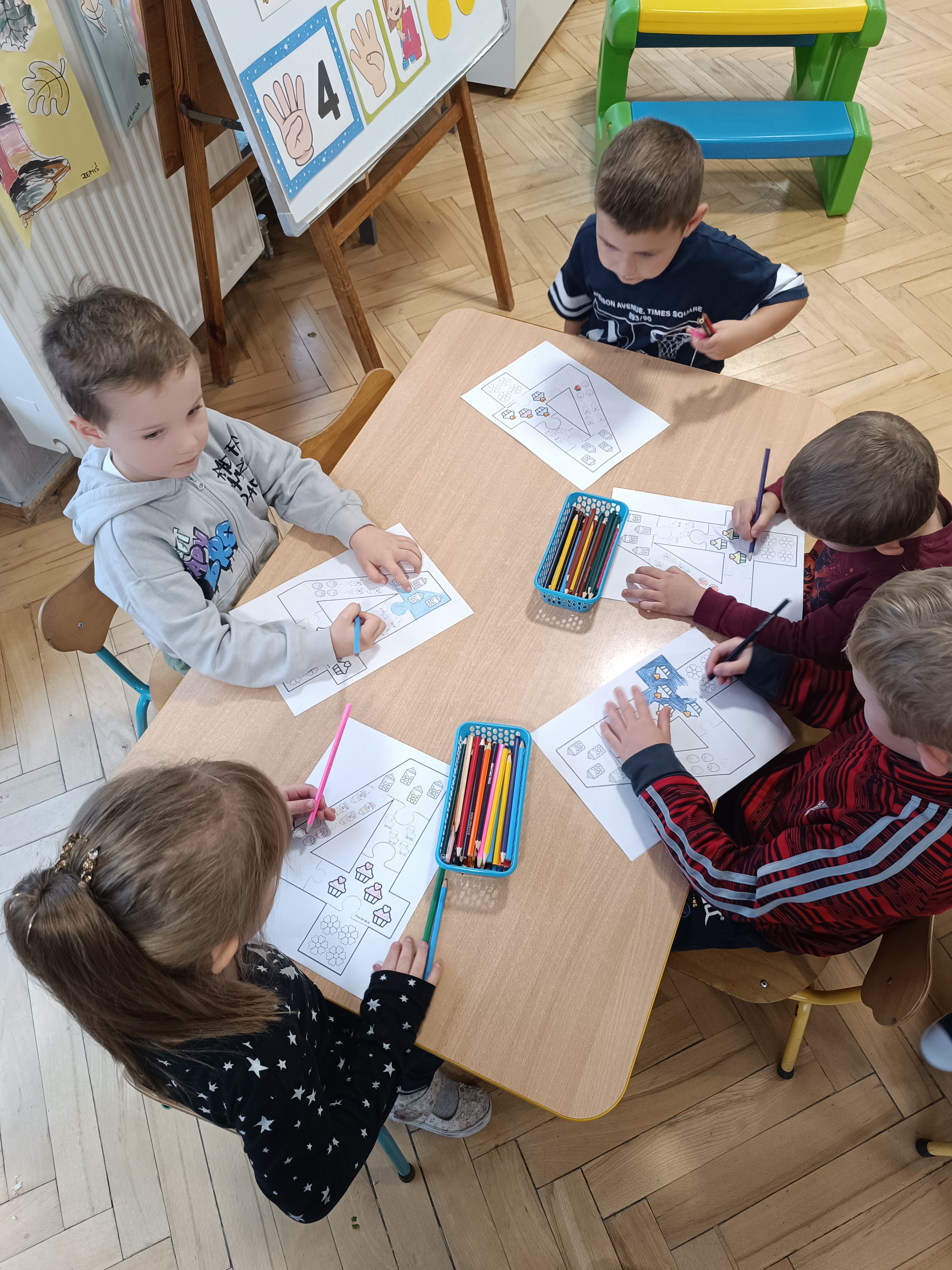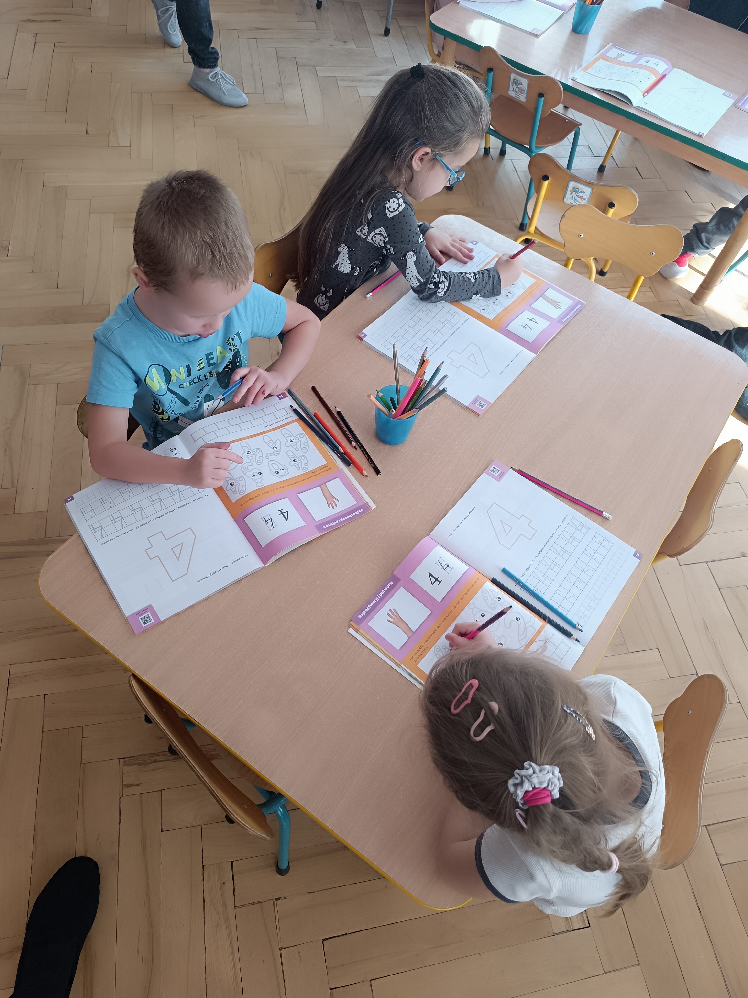 Smerfy w następnym dniu poznały również cyfrę 4 w aspekcie kardynalnym, porządkowym i miarowym, podnosząc przy tym kompetencje matematyczne i doskonaląc umiejętność przeliczania. Wykonywały ćwiczenia grafomotoryczne i pracowały w swoich książkach wykonując zadania.
