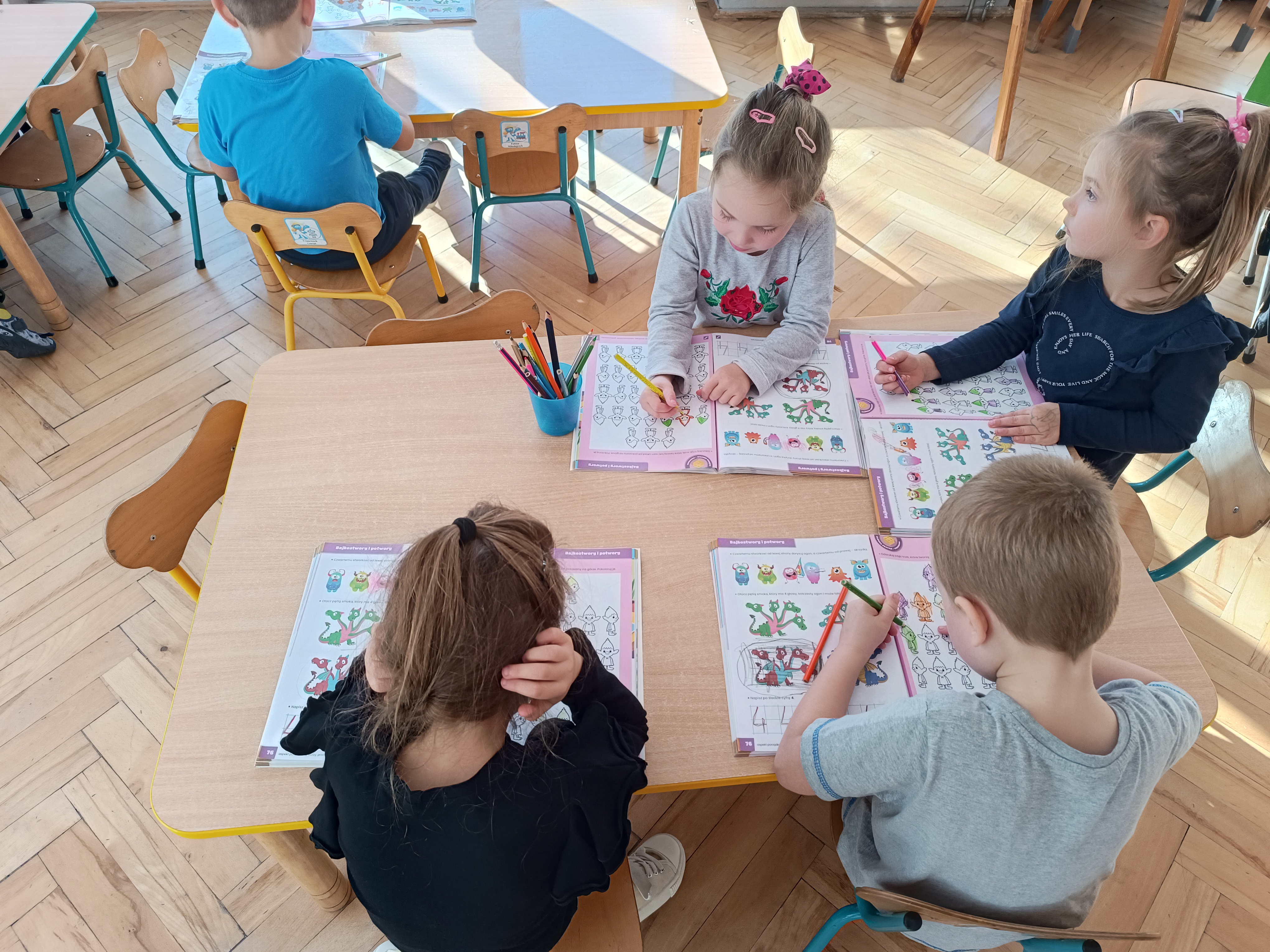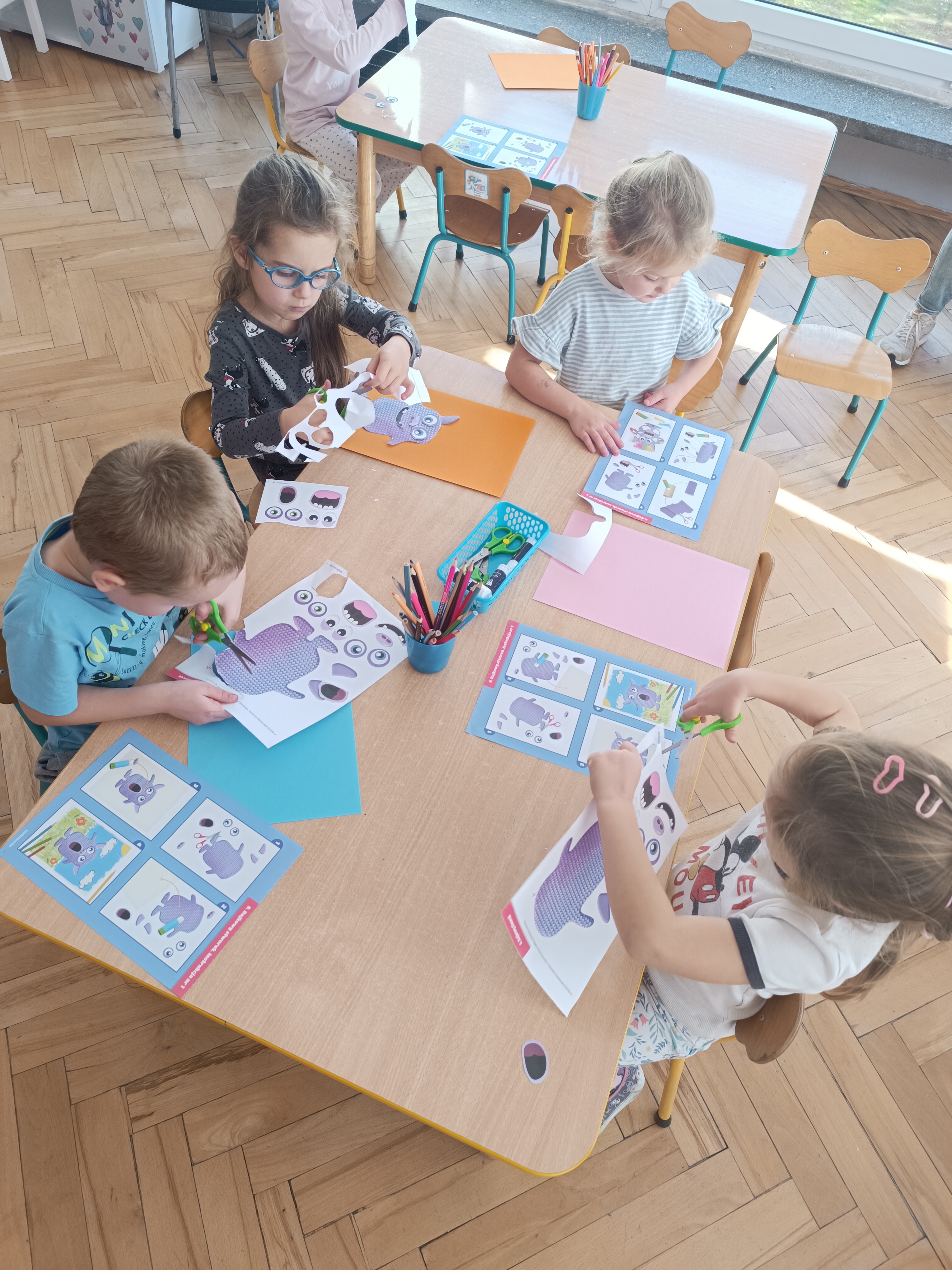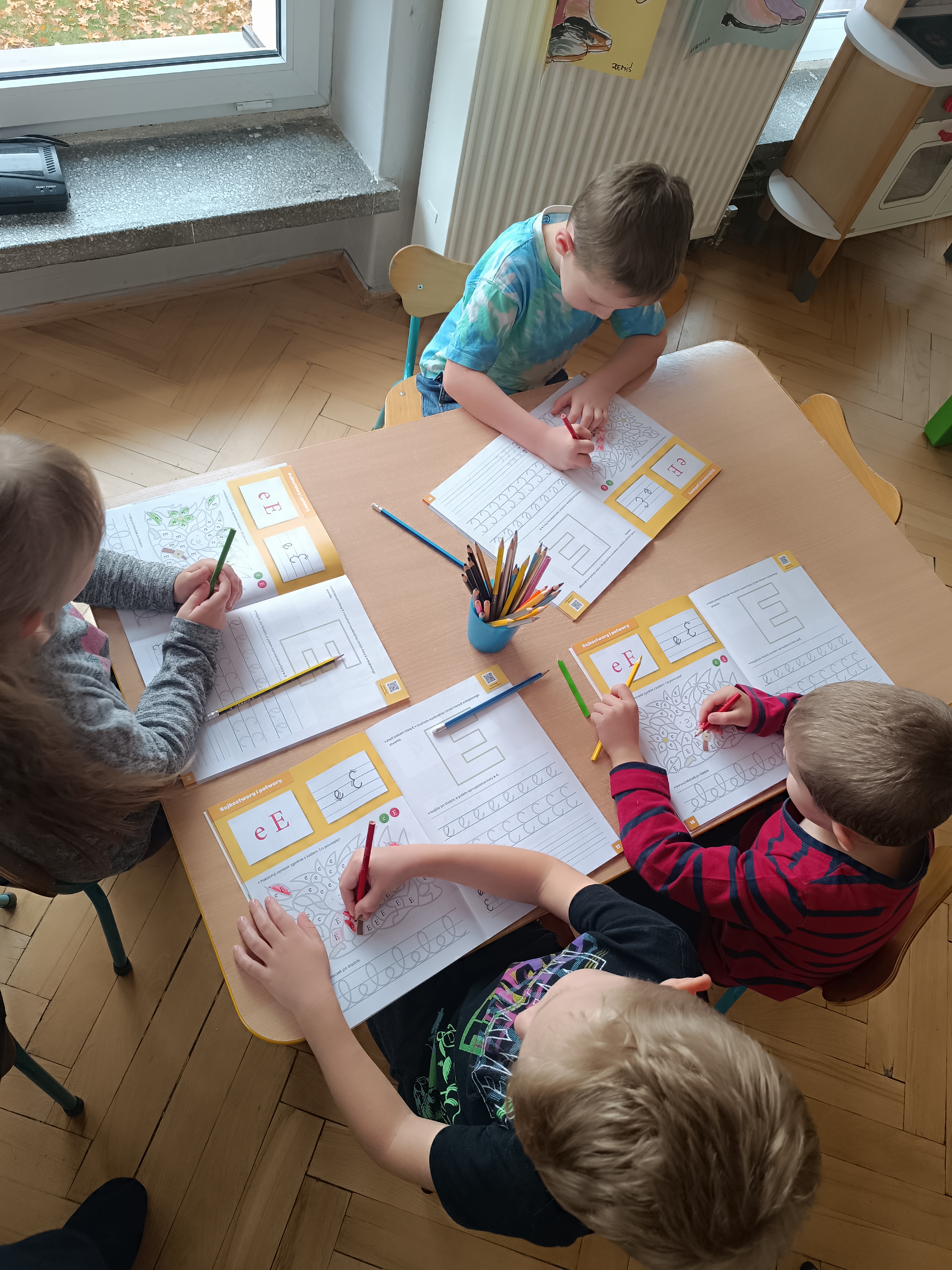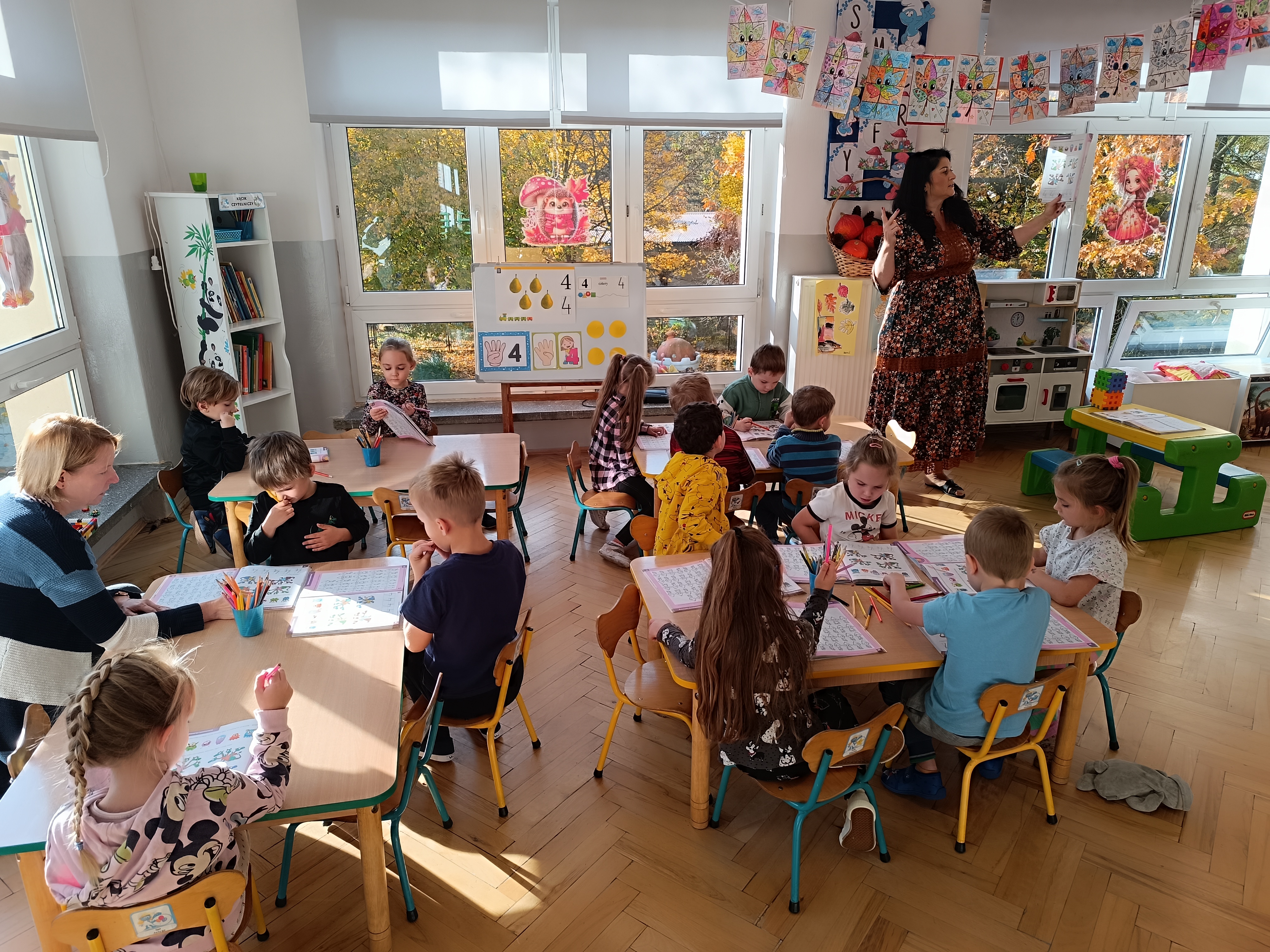 Smerfy w następnym dniu poznały również cyfrę 4 w aspekcie kardynalnym, porządkowym i miarowym, podnosząc przy tym kompetencje matematyczne i doskonaląc umiejętność przeliczania. Wykonywały ćwiczenia grafomotoryczne i pracowały w swoich książkach wykonując zadania.