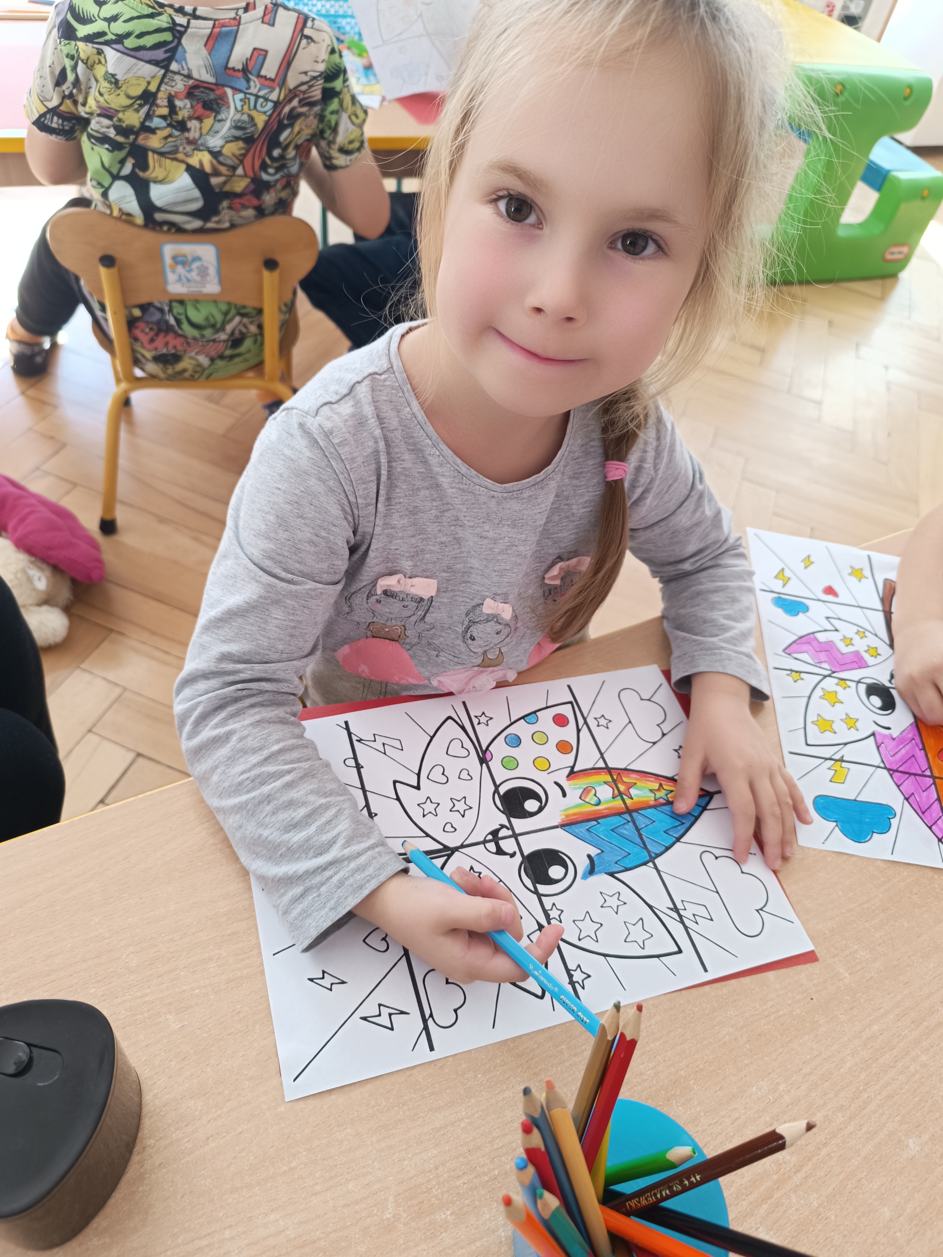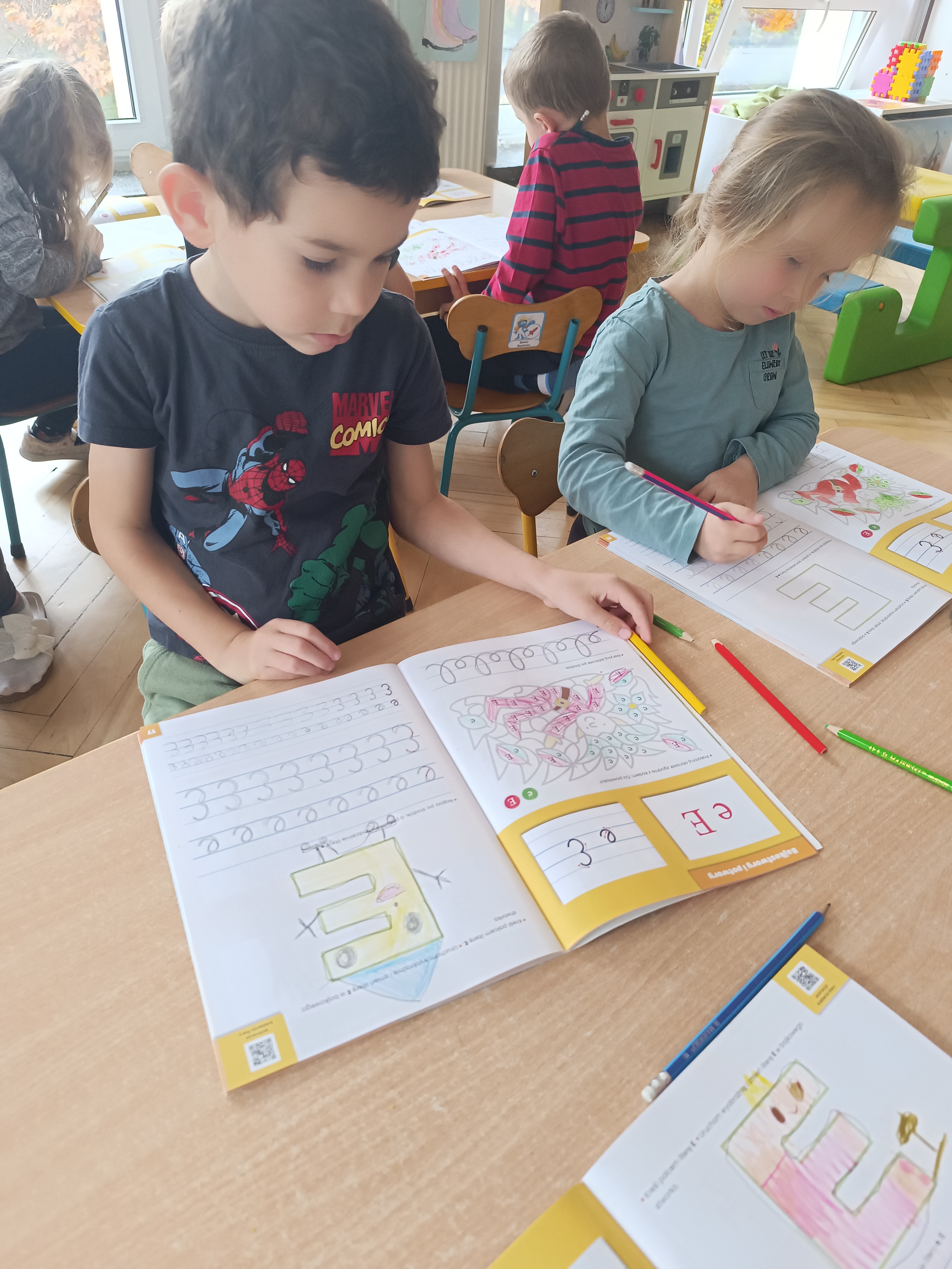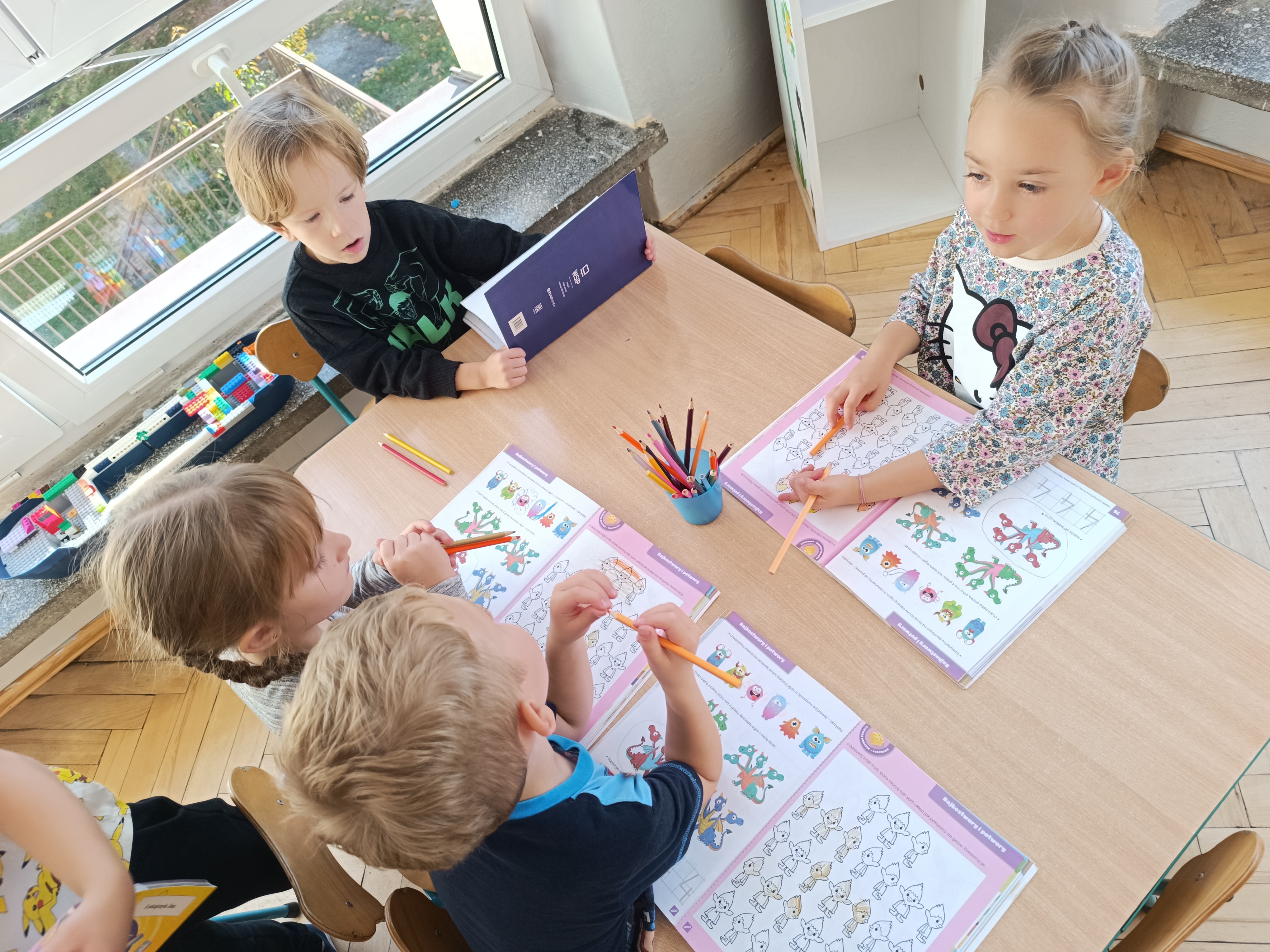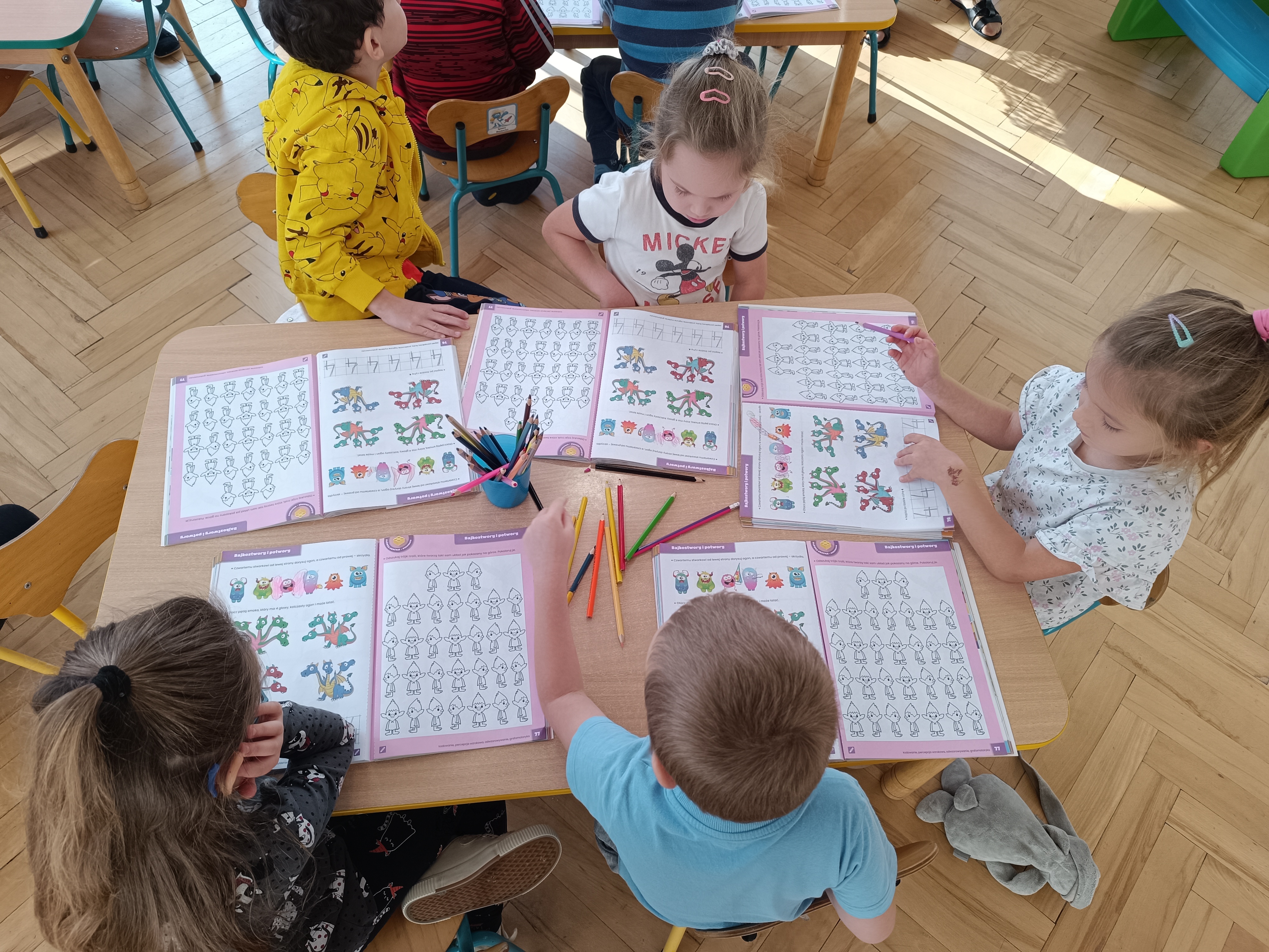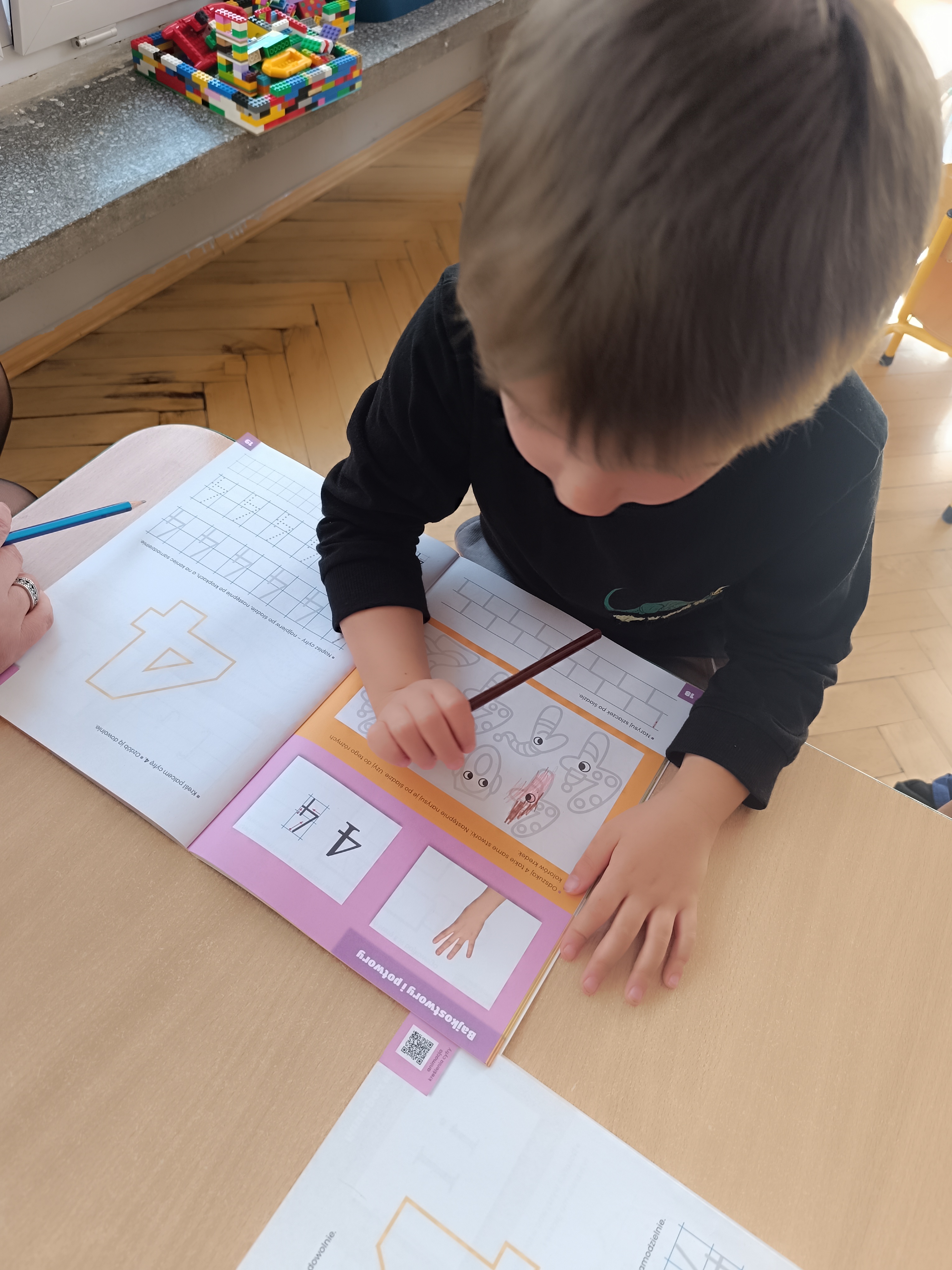 Smerfy w następnym dniu poznały również cyfrę 4 w aspekcie kardynalnym, porządkowym i miarowym, podnosząc przy tym kompetencje matematyczne i doskonaląc umiejętność przeliczania. Wykonywały ćwiczenia grafomotoryczne i pracowały w swoich książkach wykonując zadania.