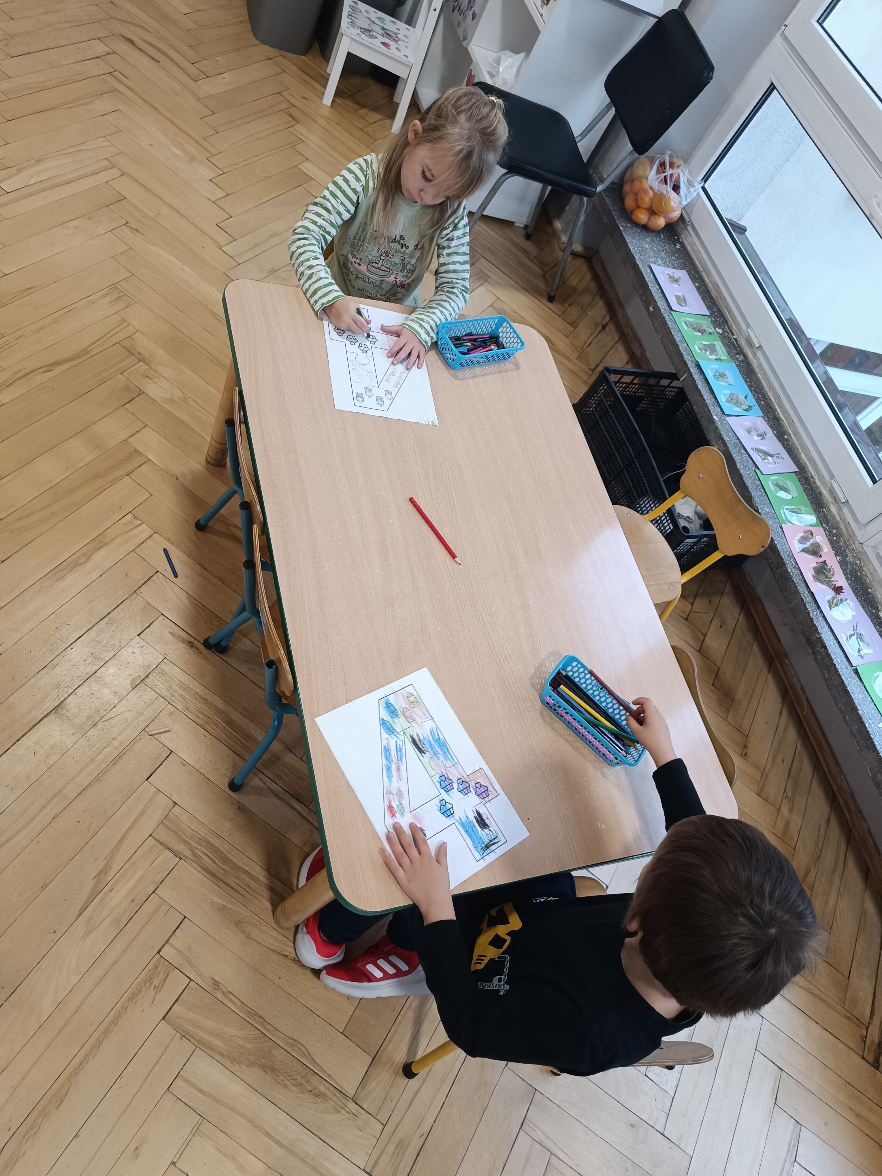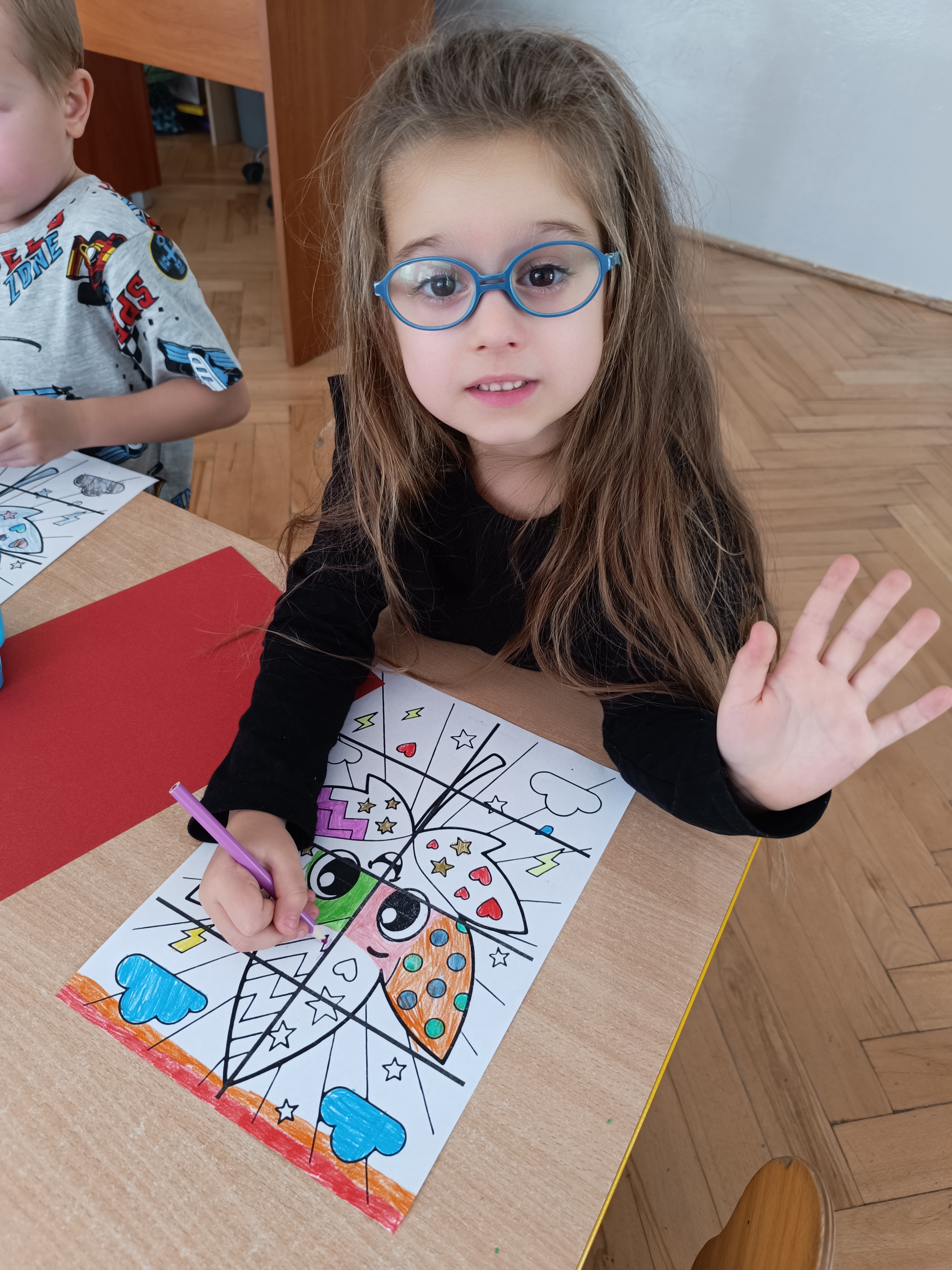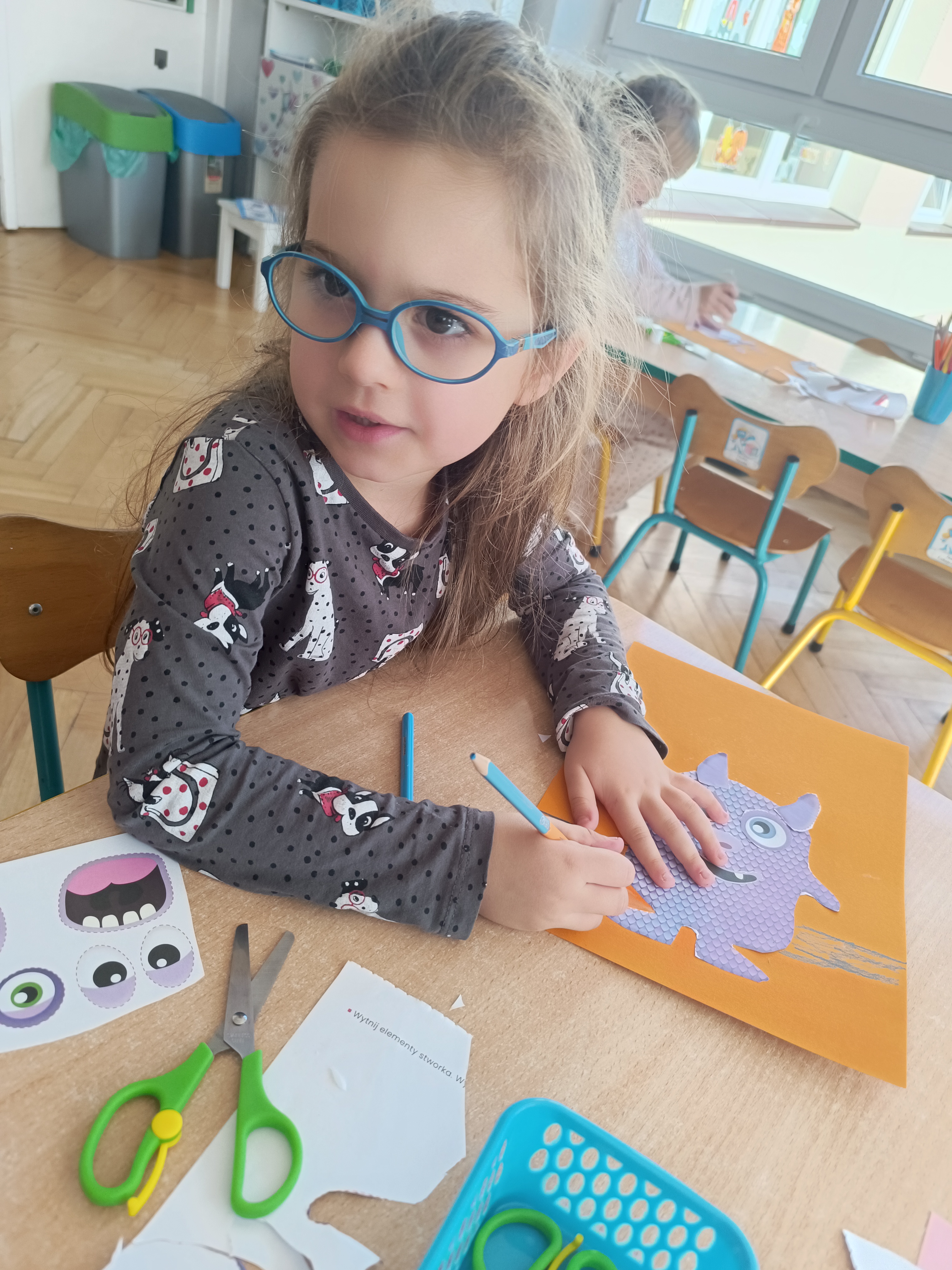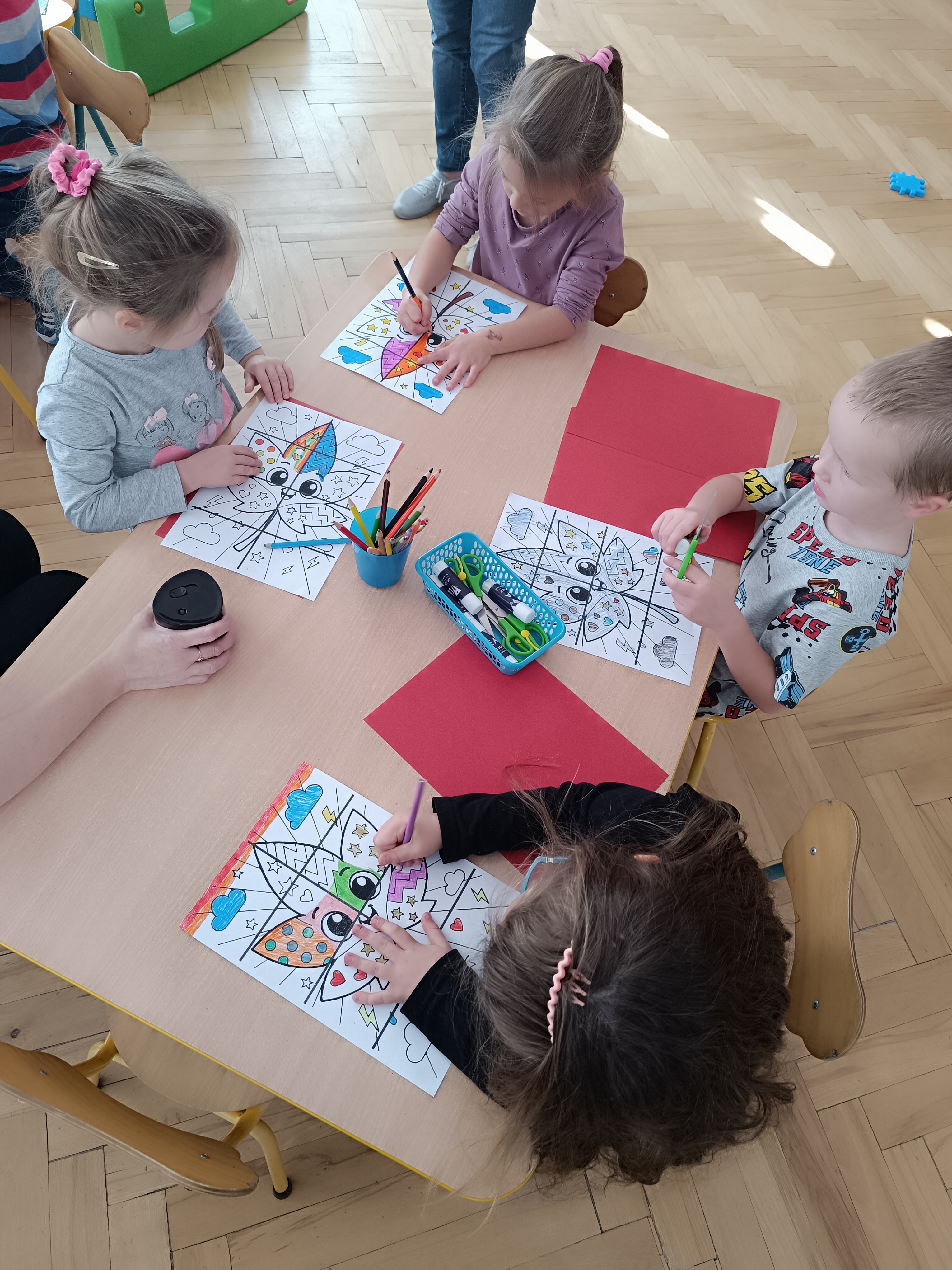 Smerfy w następnym dniu poznały również cyfrę 4 w aspekcie kardynalnym, porządkowym i miarowym, podnosząc przy tym kompetencje matematyczne i doskonaląc umiejętność przeliczania. Wykonywały ćwiczenia grafomotoryczne i pracowały w swoich książkach wykonując zadania.
