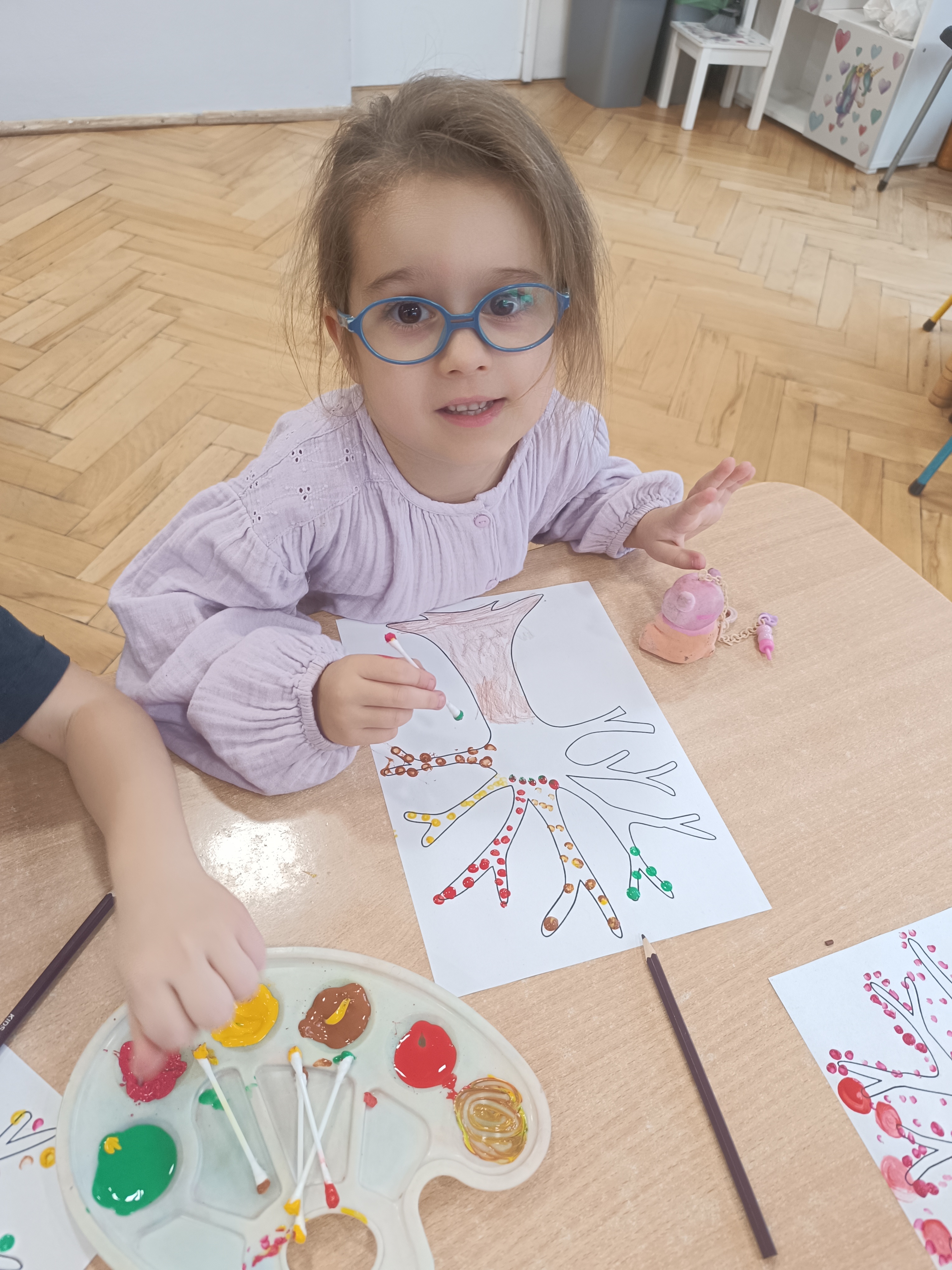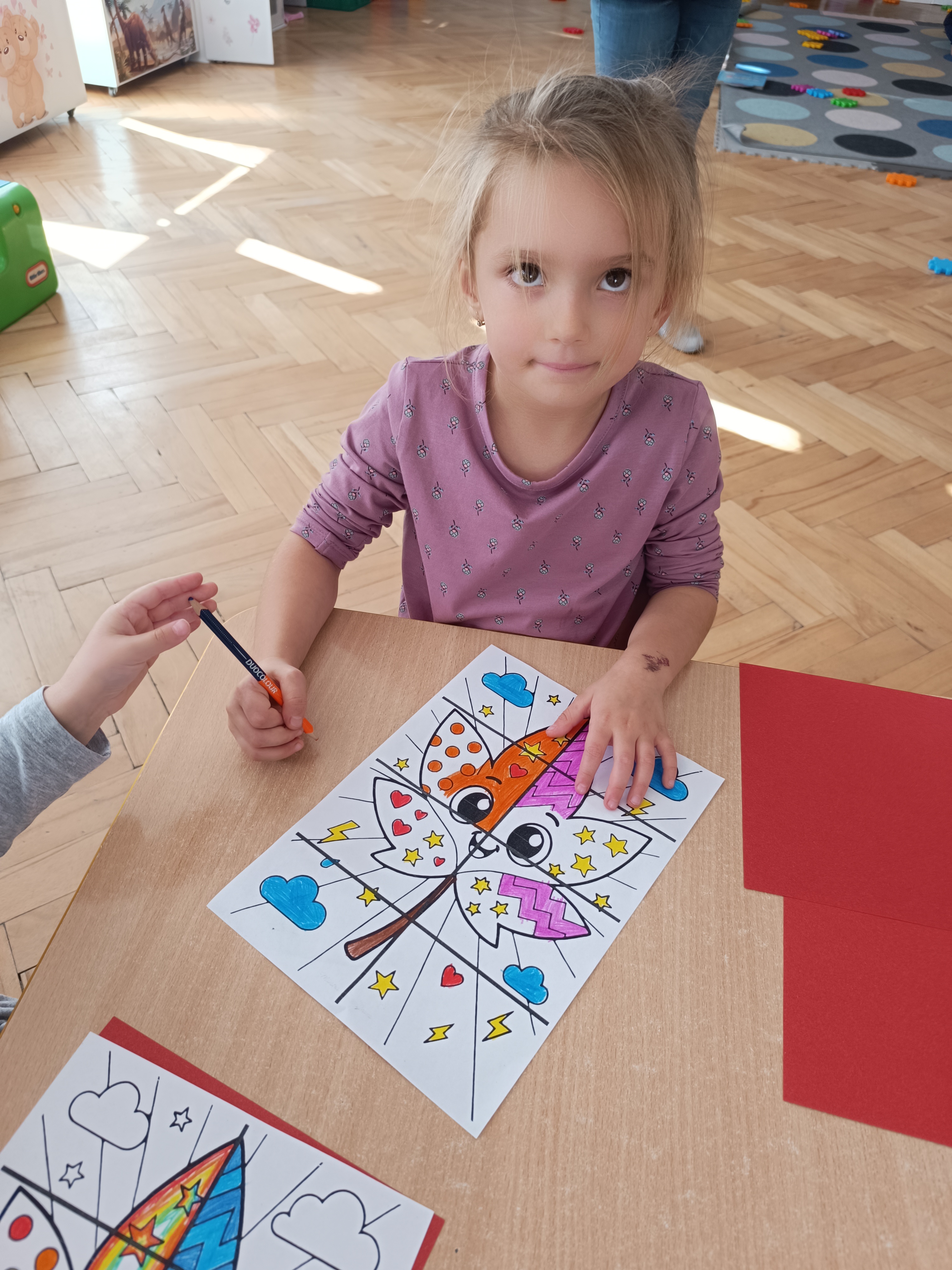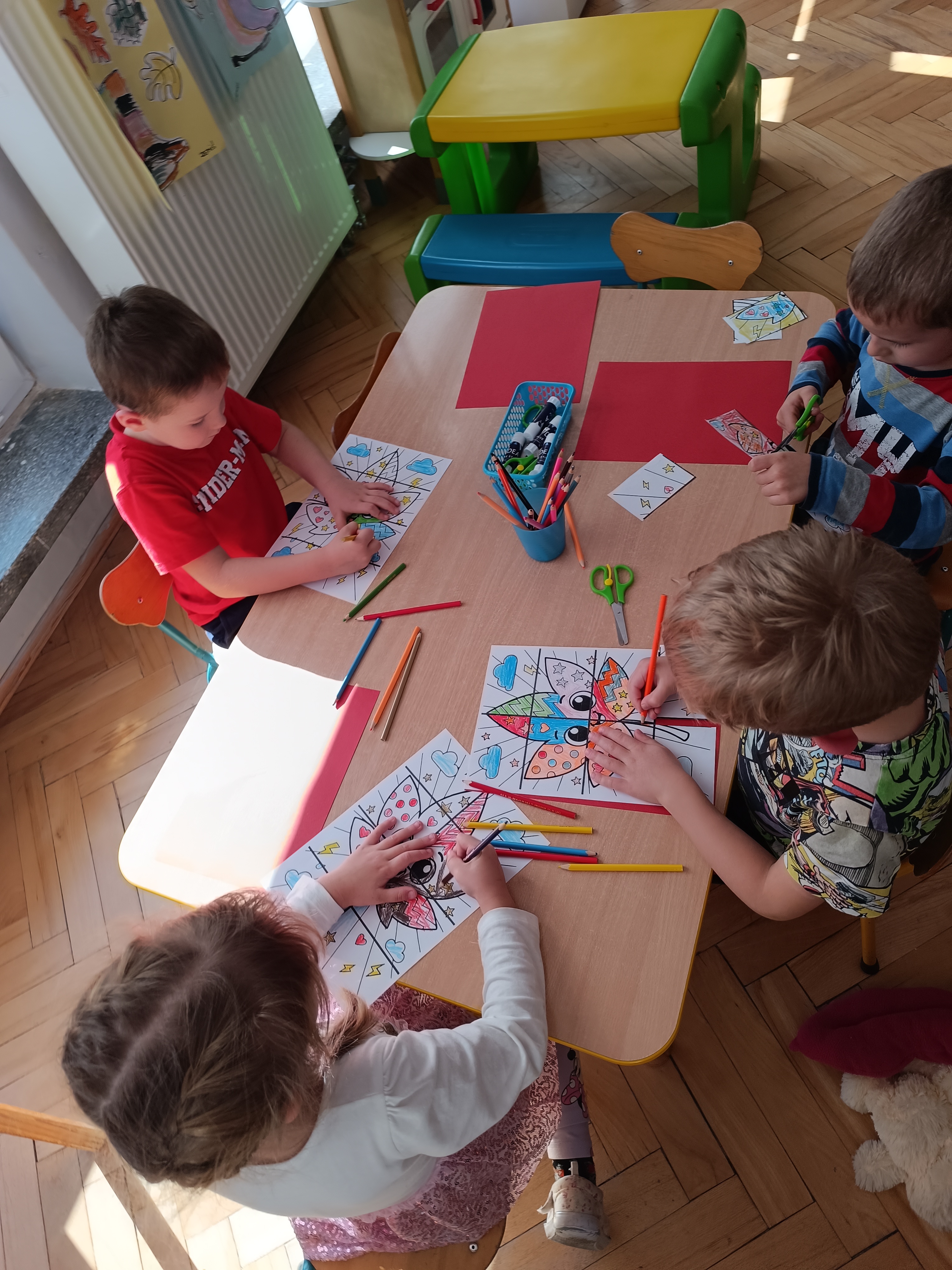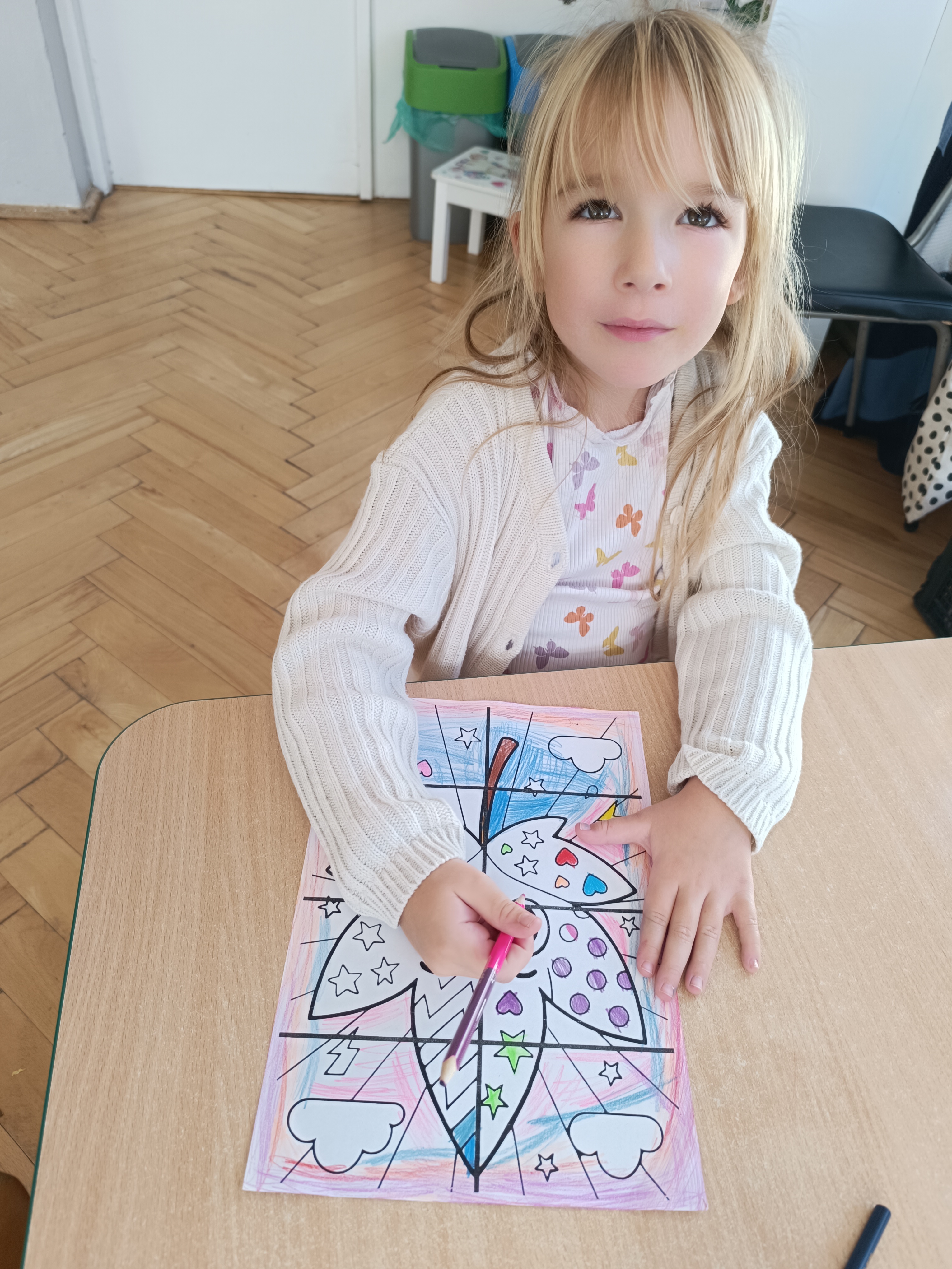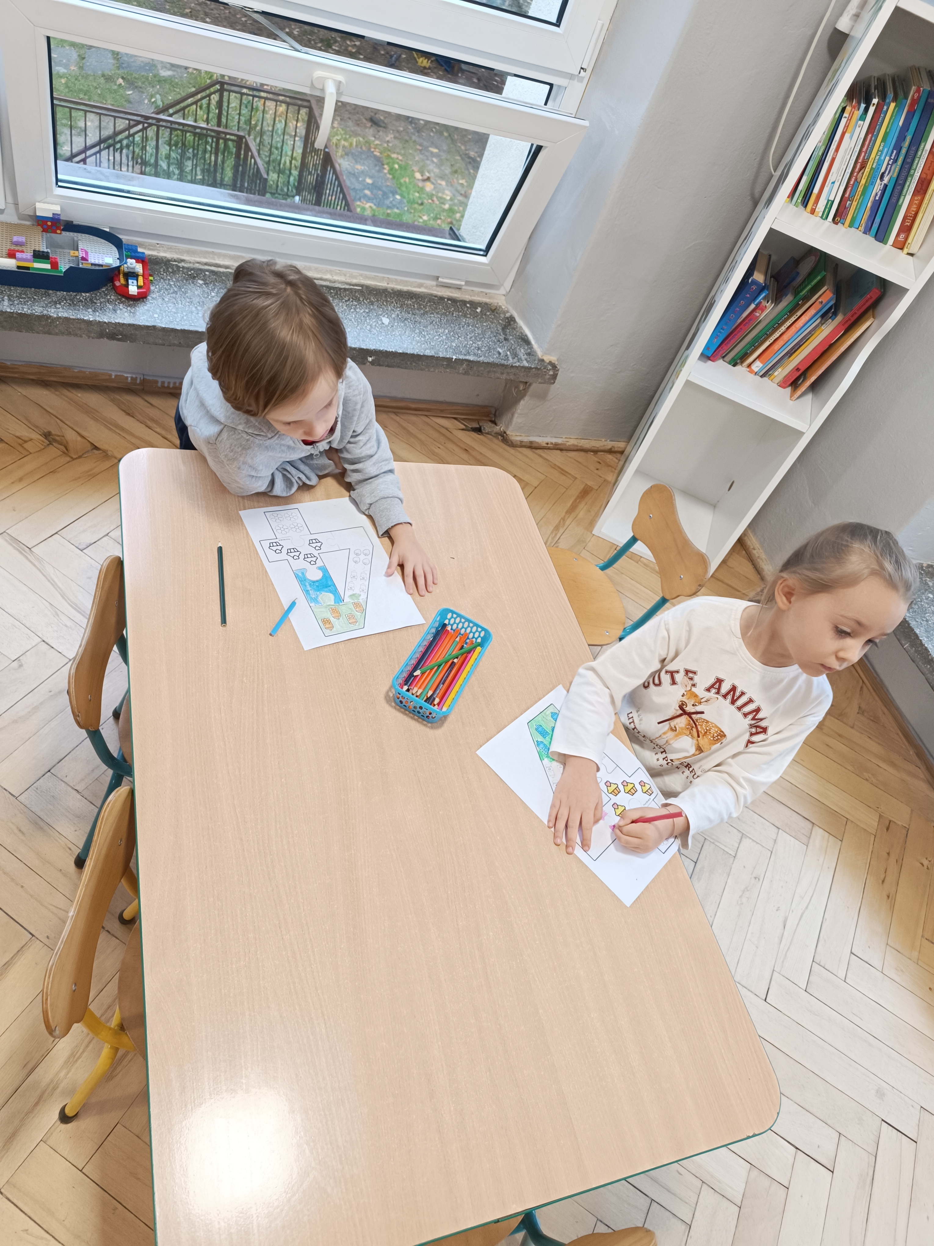 Smerfy w następnym dniu poznały również cyfrę 4 w aspekcie kardynalnym, porządkowym i miarowym, podnosząc przy tym kompetencje matematyczne i doskonaląc umiejętność przeliczania. Wykonywały ćwiczenia grafomotoryczne i pracowały w swoich książkach wykonując zadania.
