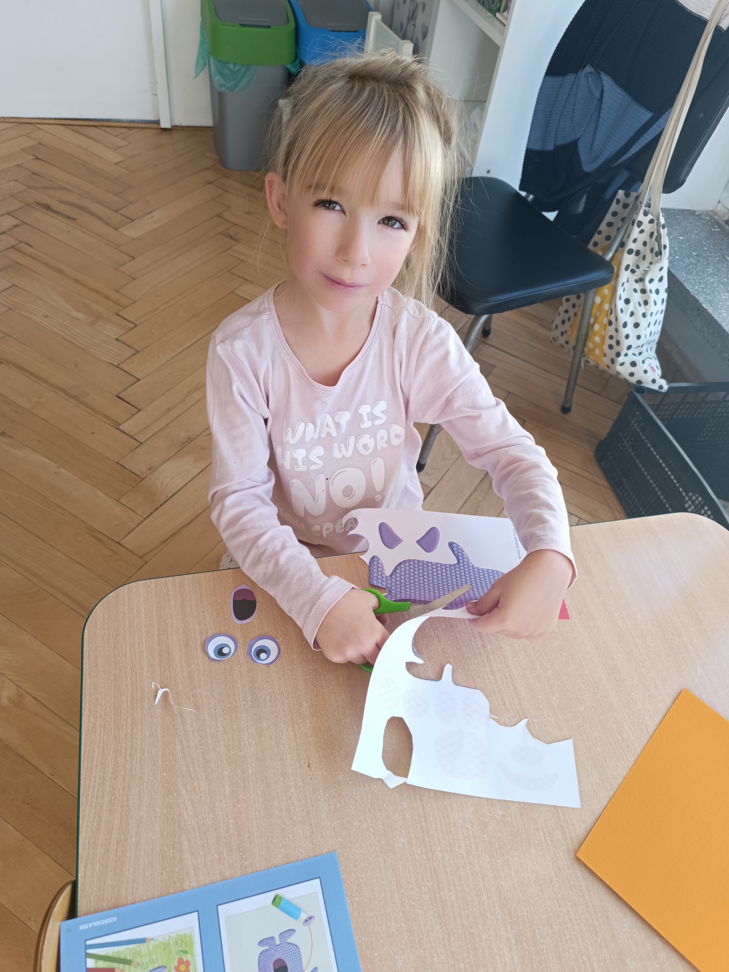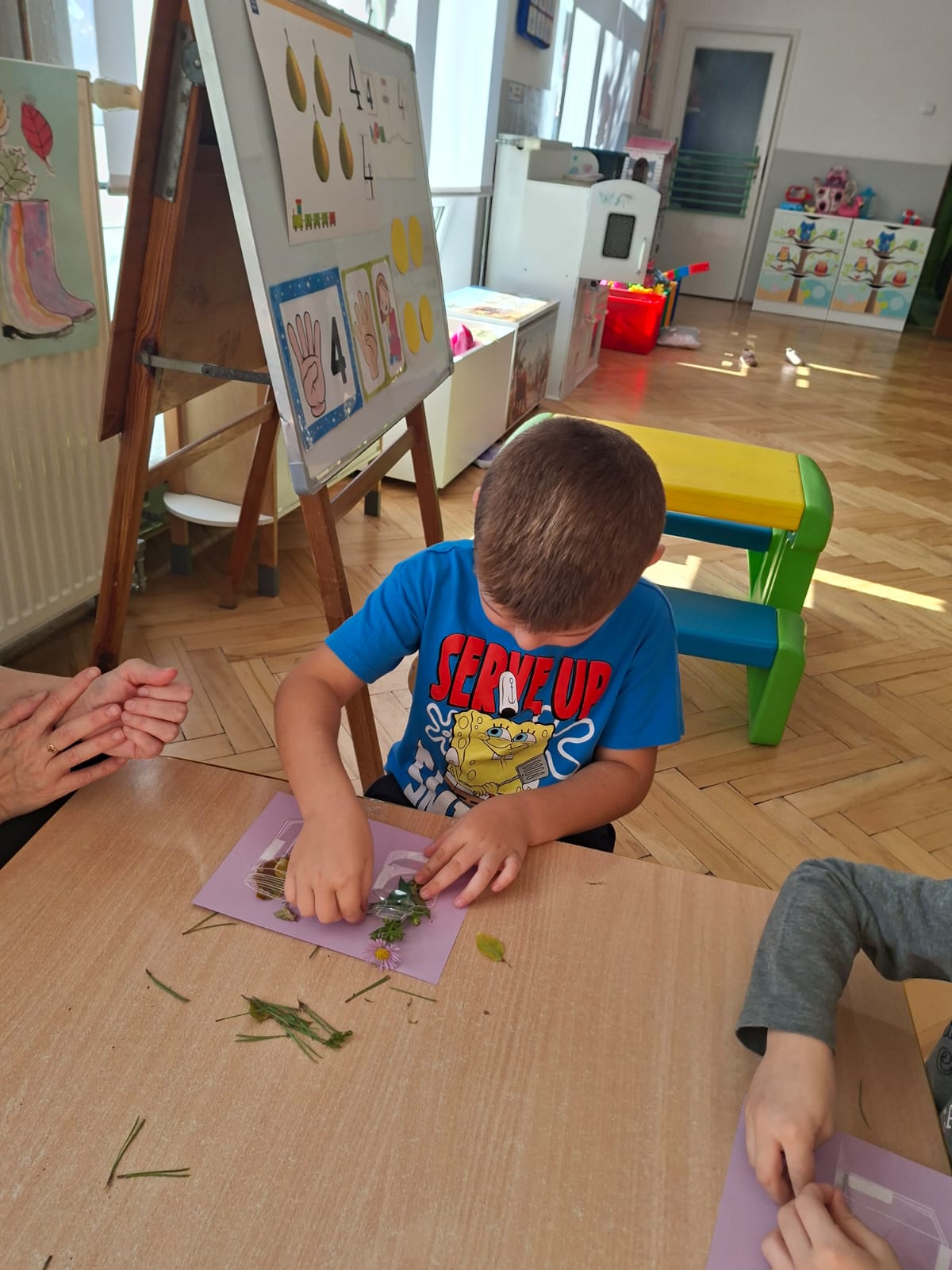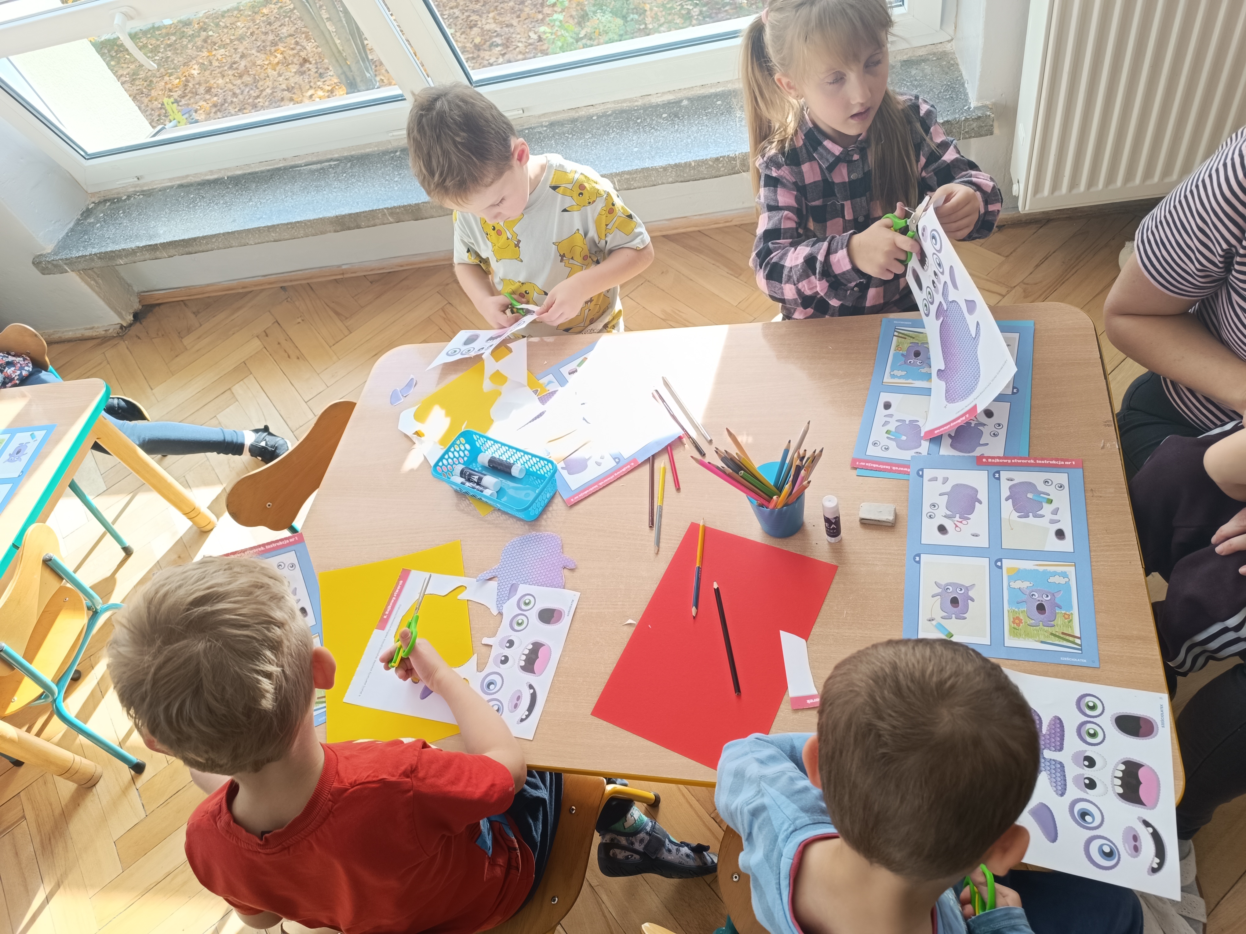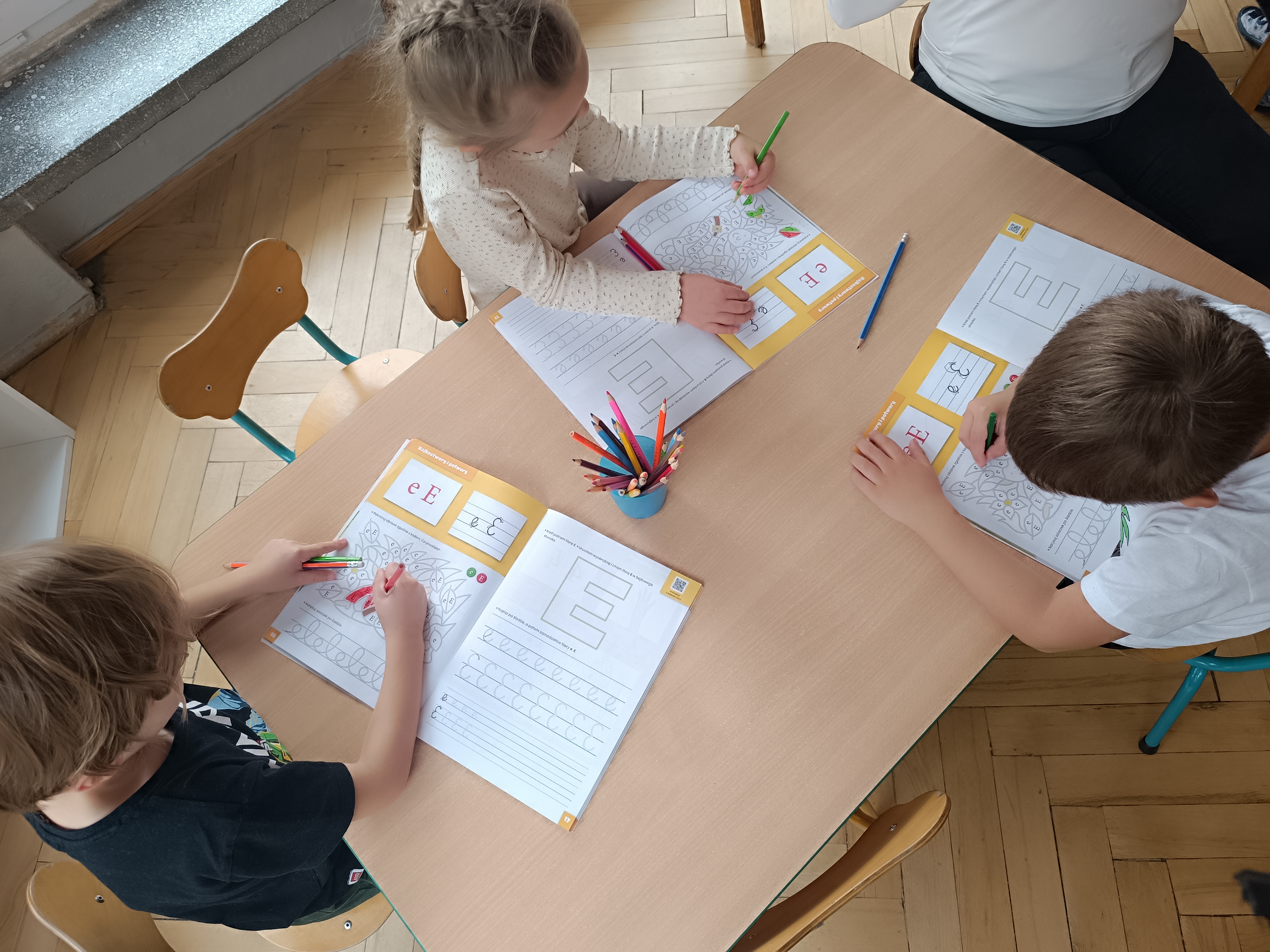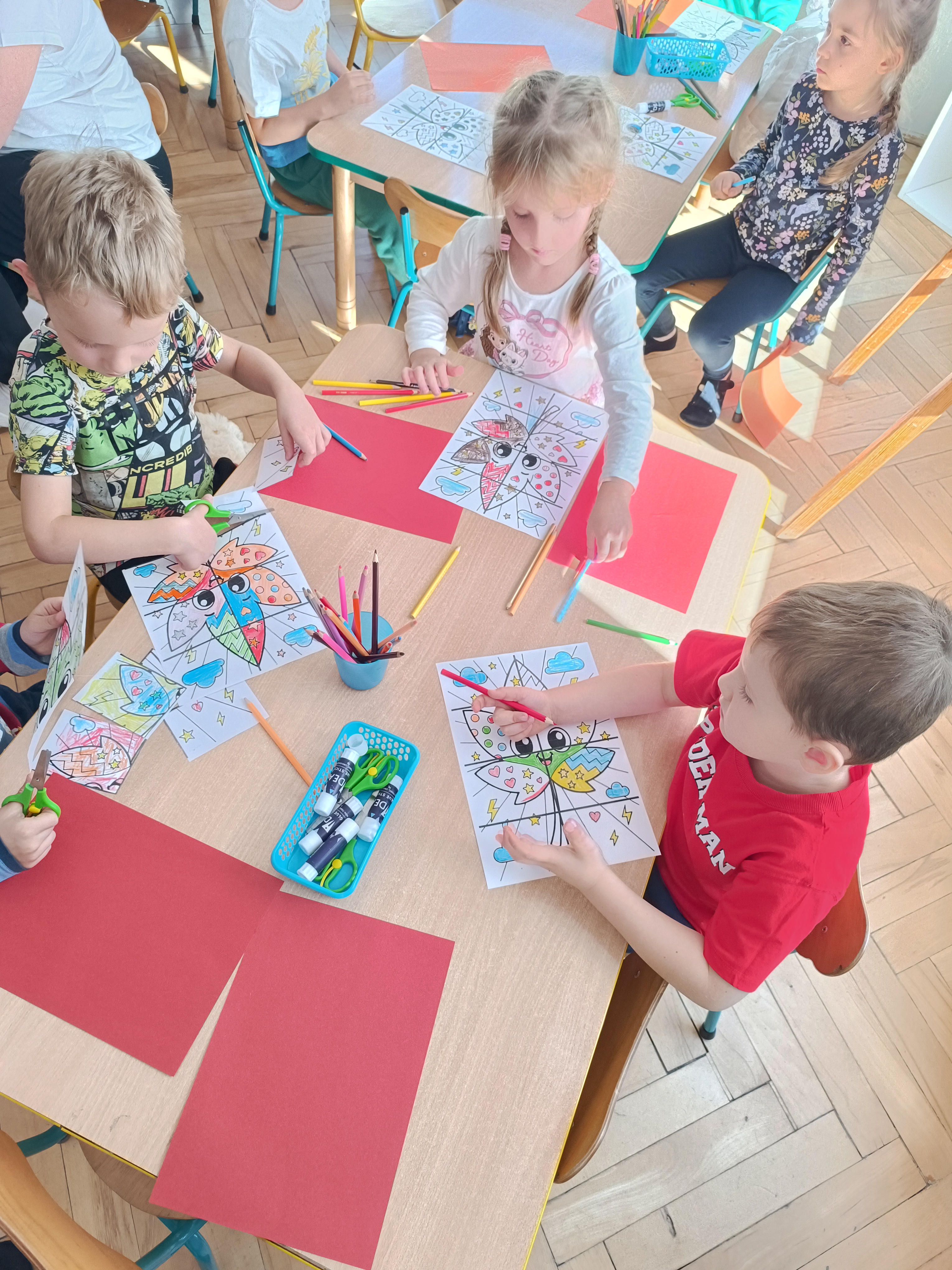 Smerfy w następnym dniu poznały również cyfrę 4 w aspekcie kardynalnym, porządkowym i miarowym, podnosząc przy tym kompetencje matematyczne i doskonaląc umiejętność przeliczania. Wykonywały ćwiczenia grafomotoryczne i pracowały w swoich książkach wykonując zadania.
