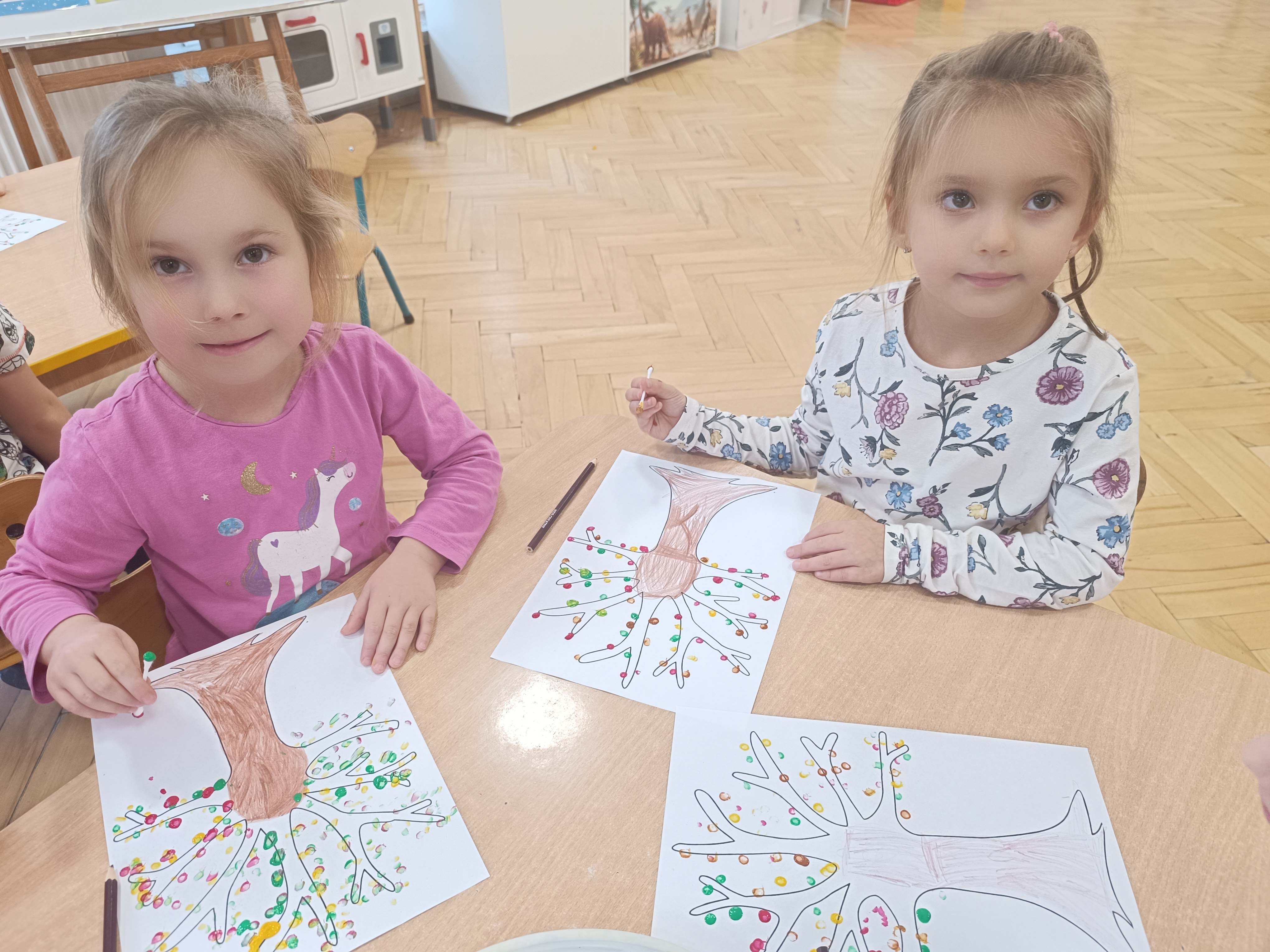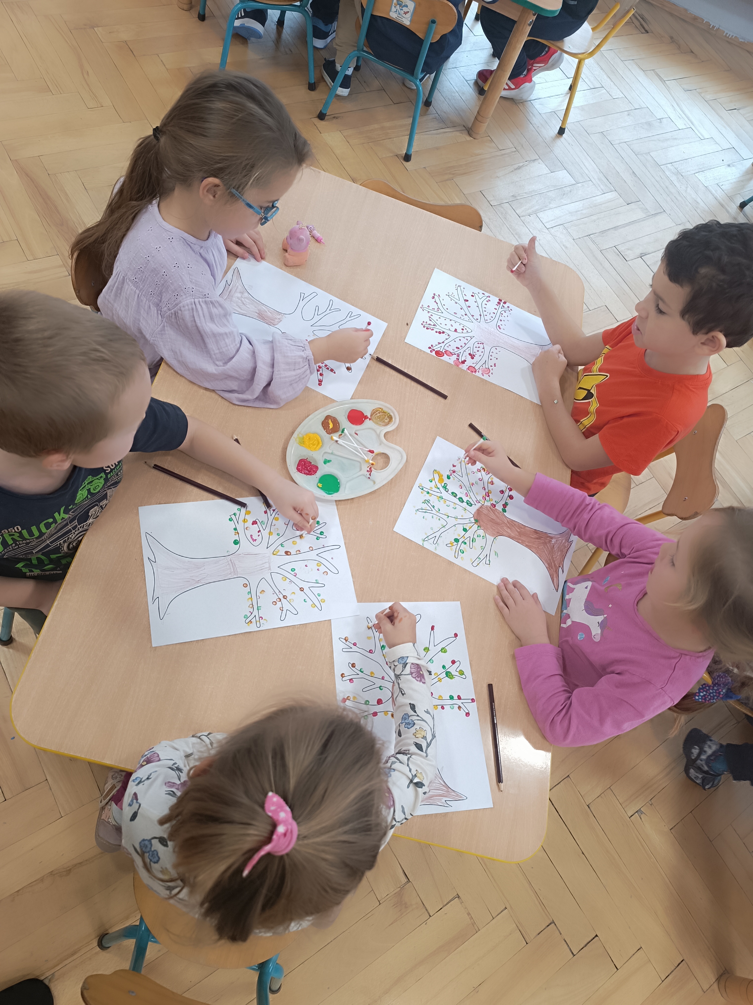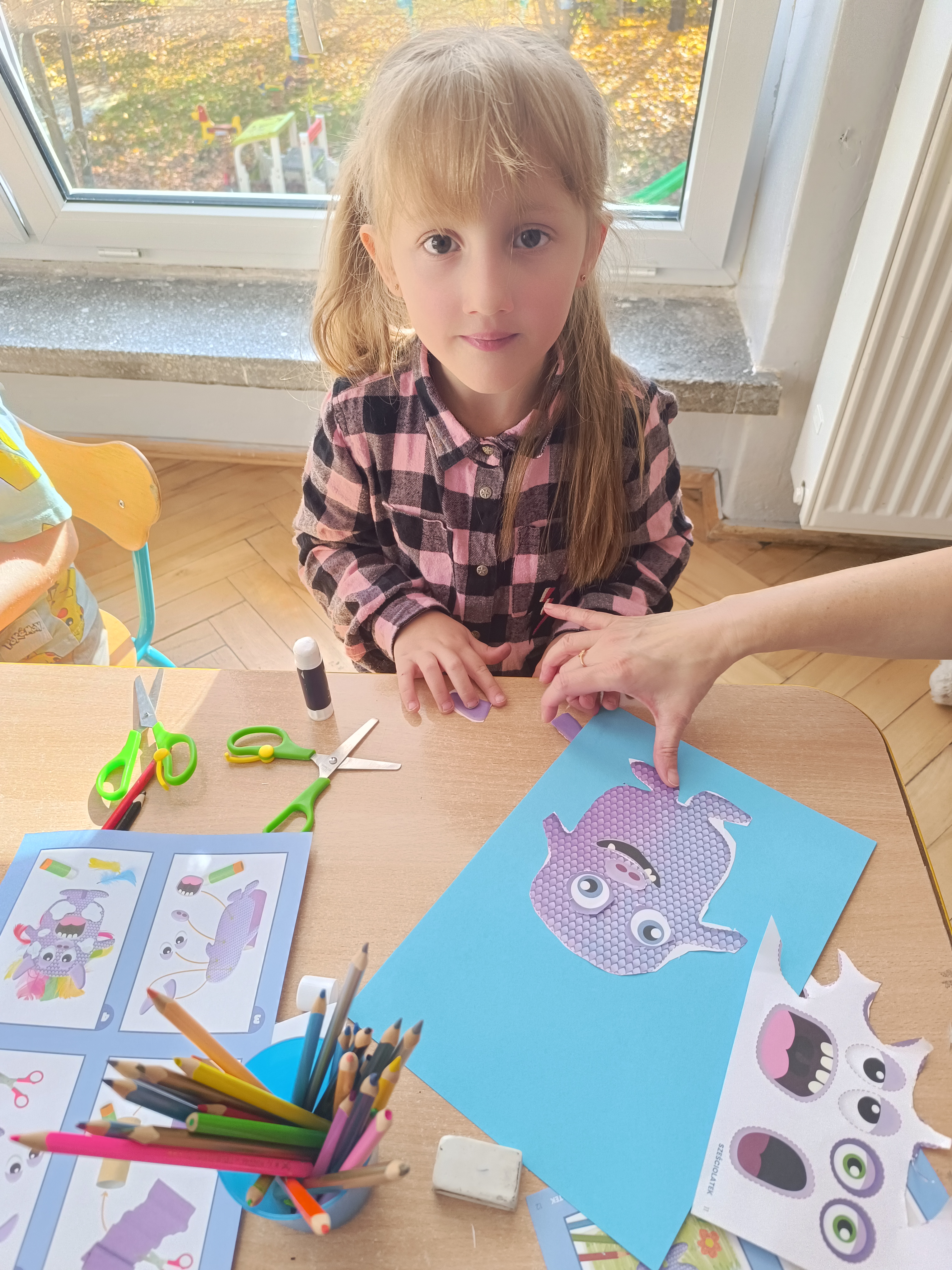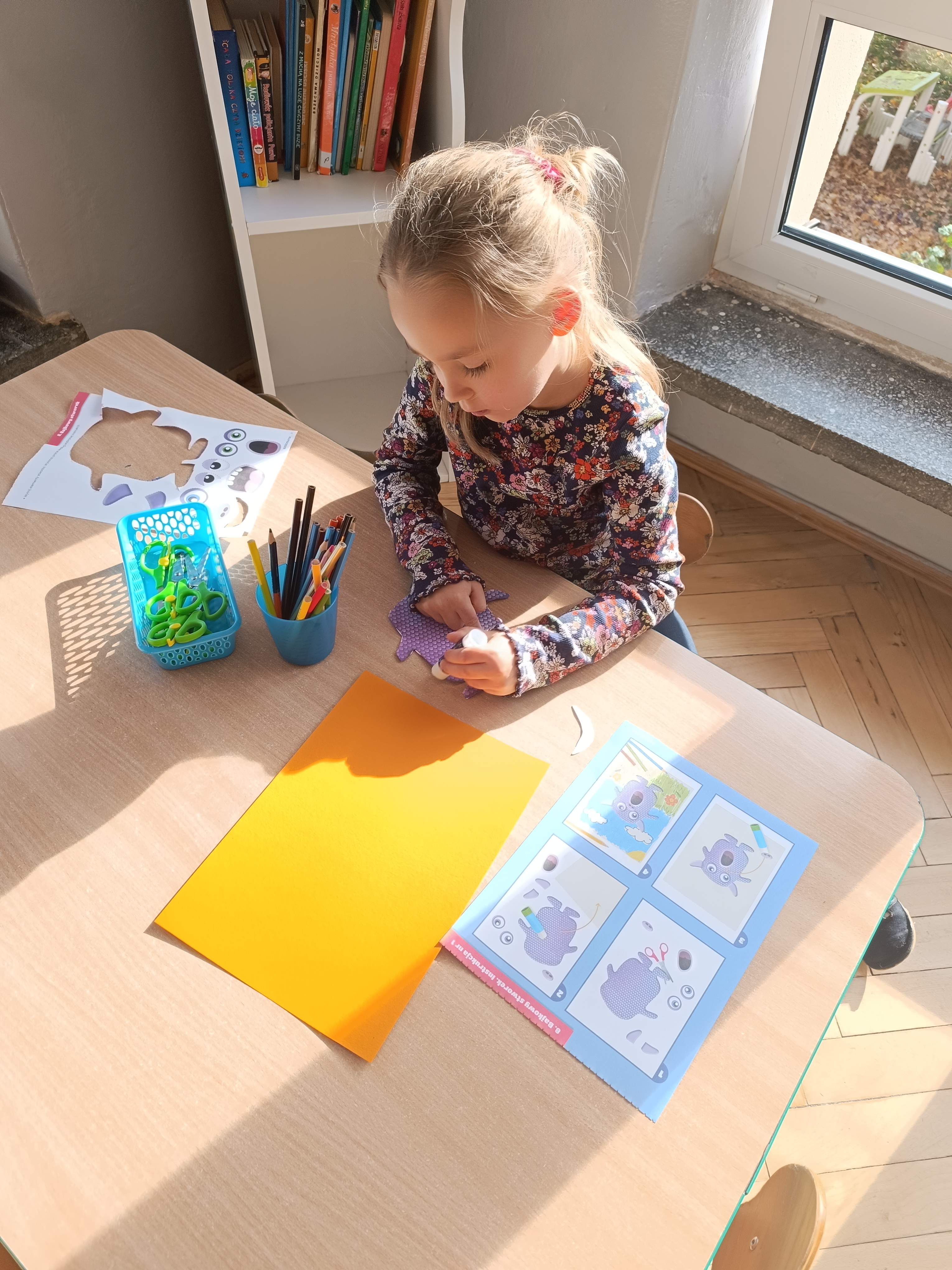 Smerfy w następnym dniu poznały również cyfrę 4 w aspekcie kardynalnym, porządkowym i miarowym, podnosząc przy tym kompetencje matematyczne i doskonaląc umiejętność przeliczania. Wykonywały ćwiczenia grafomotoryczne i pracowały w swoich książkach wykonując zadania.