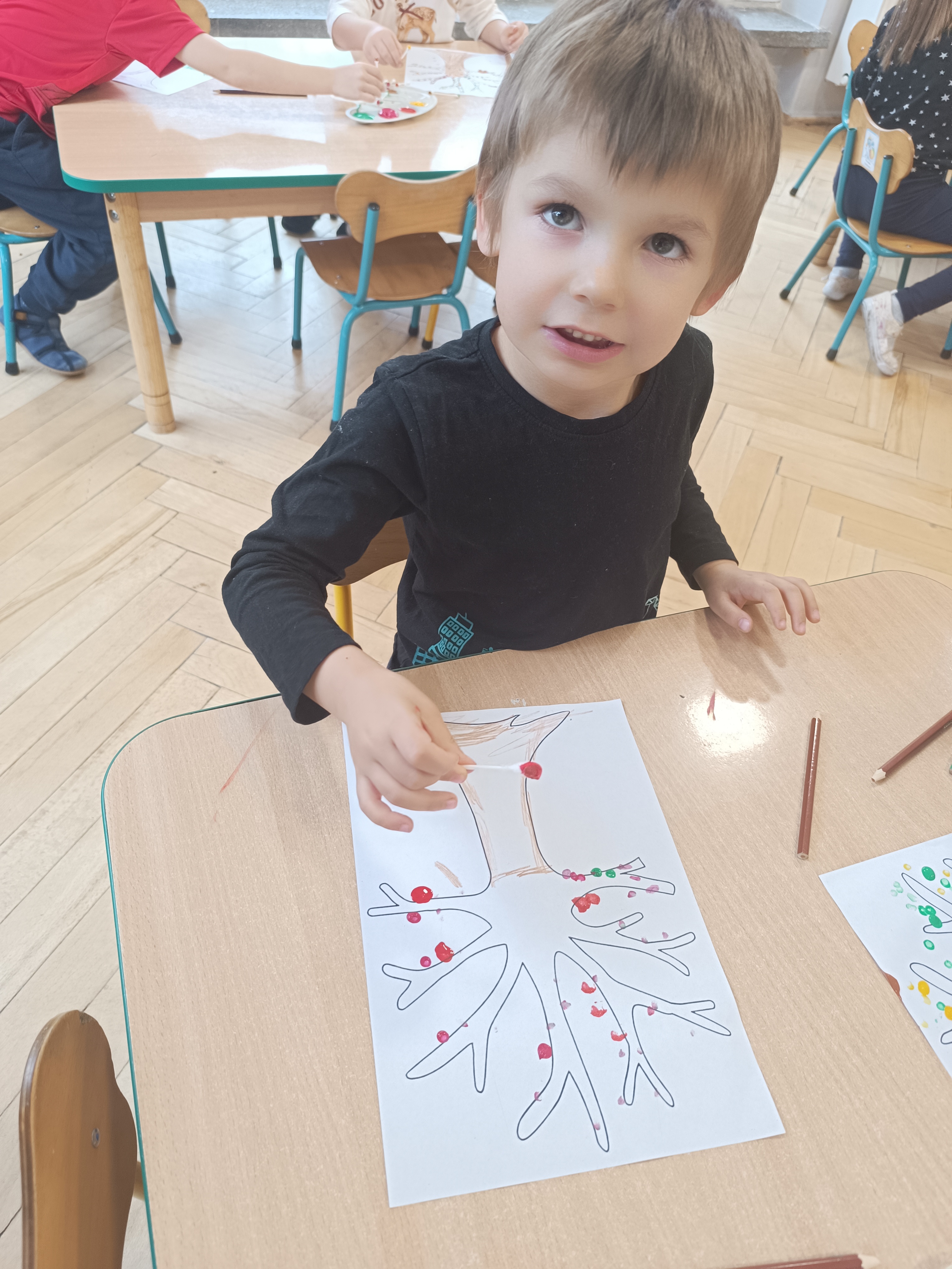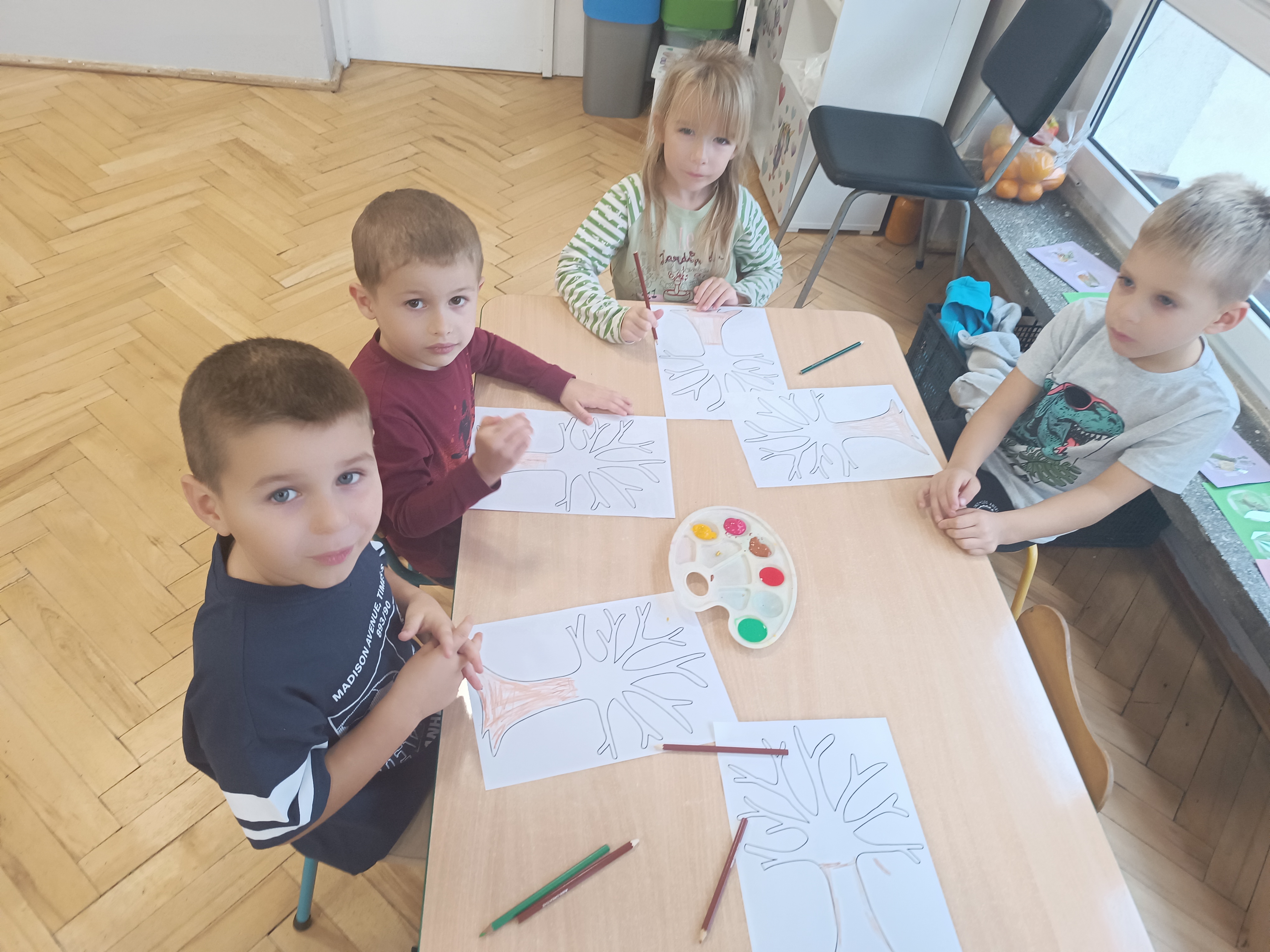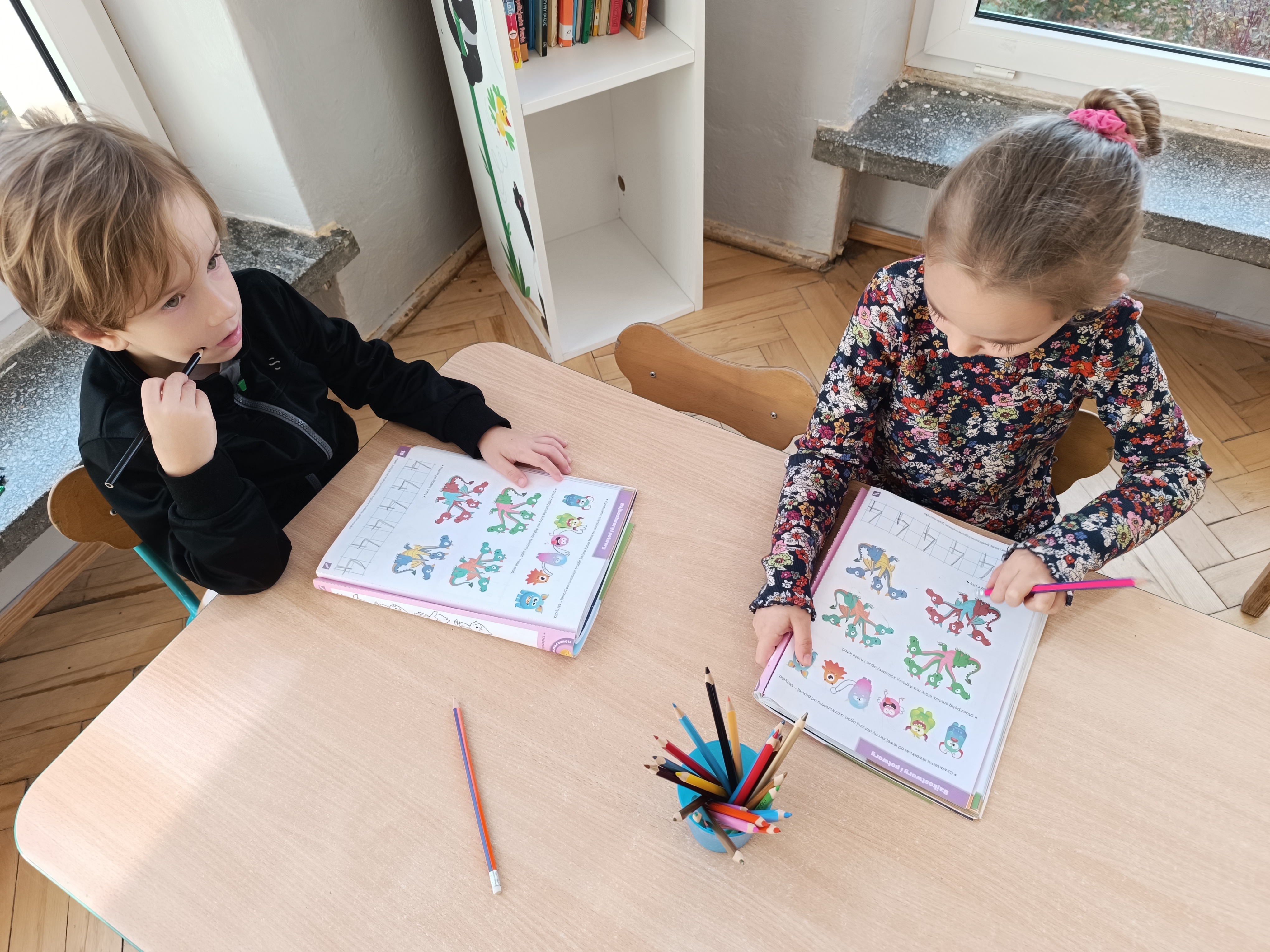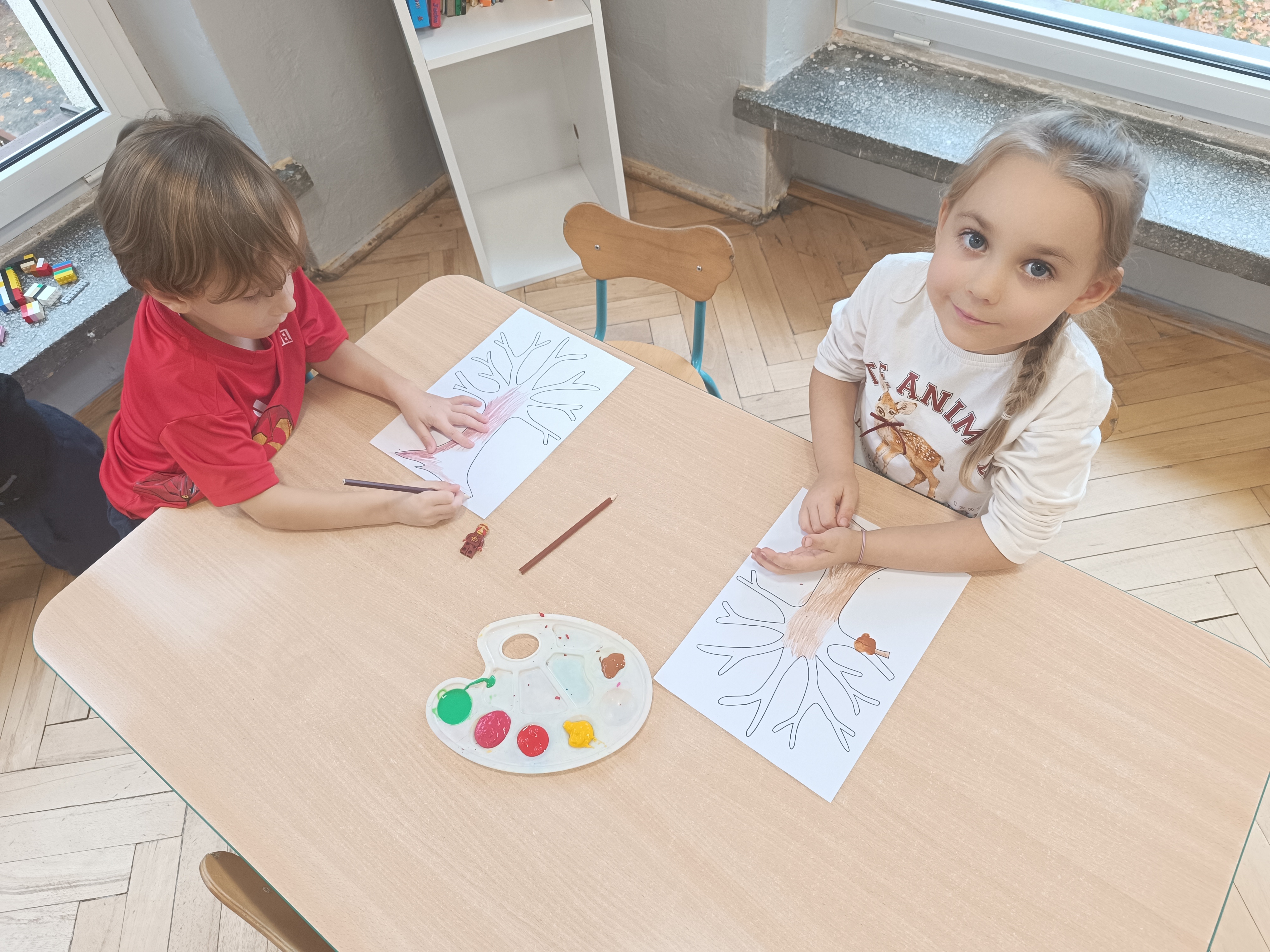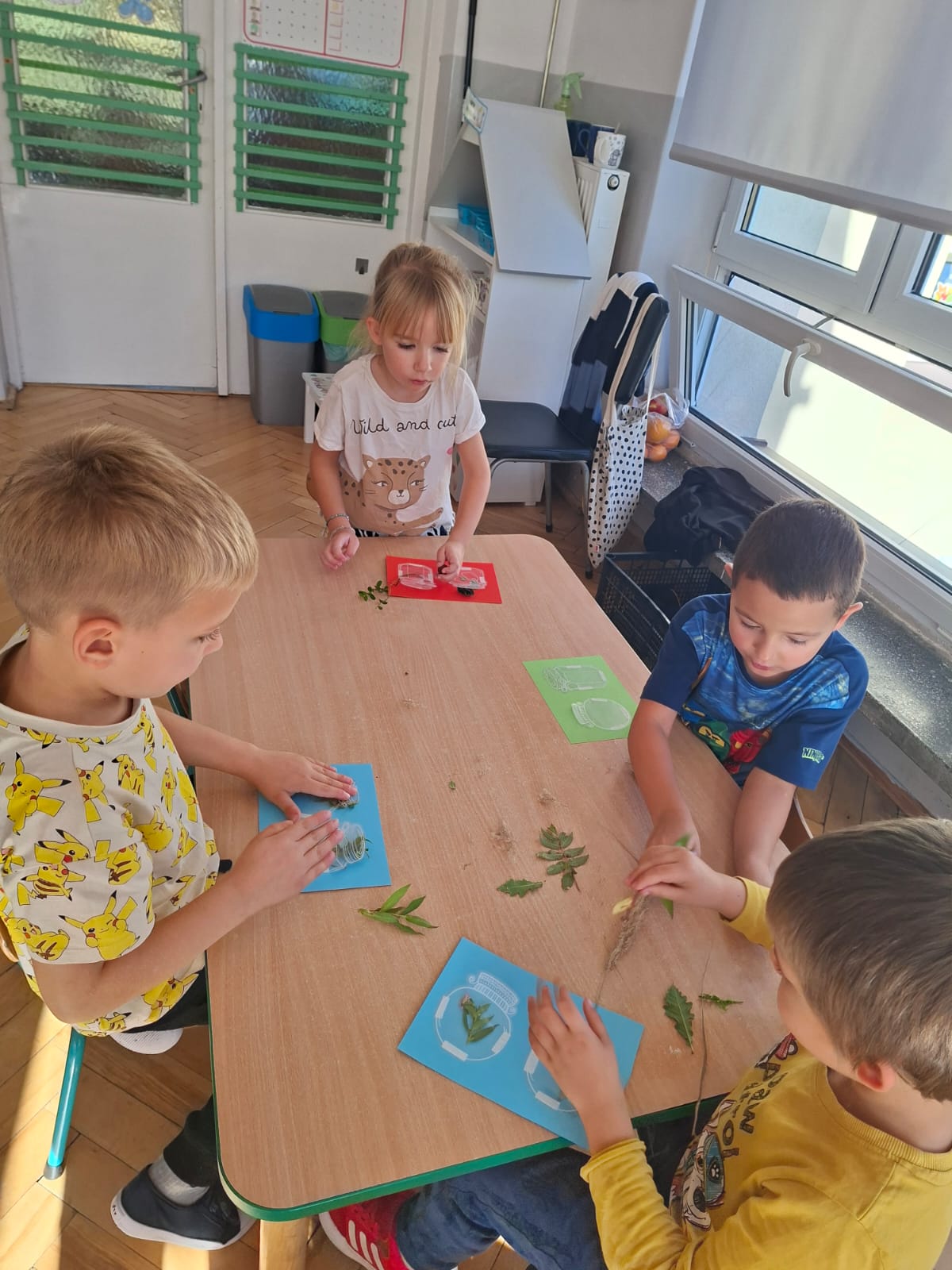 Smerfy w następnym dniu poznały również cyfrę 4 w aspekcie kardynalnym, porządkowym i miarowym, podnosząc przy tym kompetencje matematyczne i doskonaląc umiejętność przeliczania. Wykonywały ćwiczenia grafomotoryczne i pracowały w swoich książkach wykonując zadania.