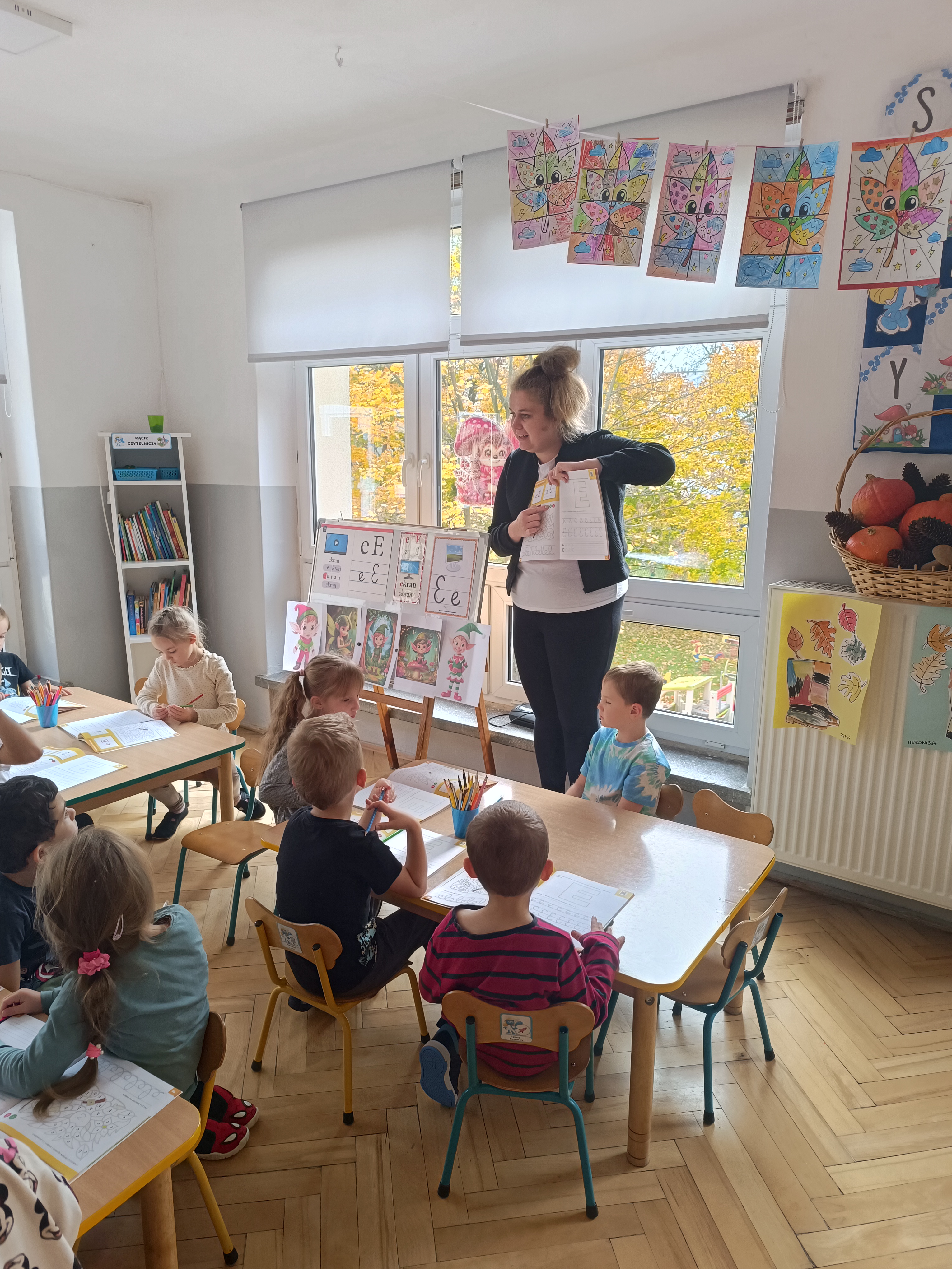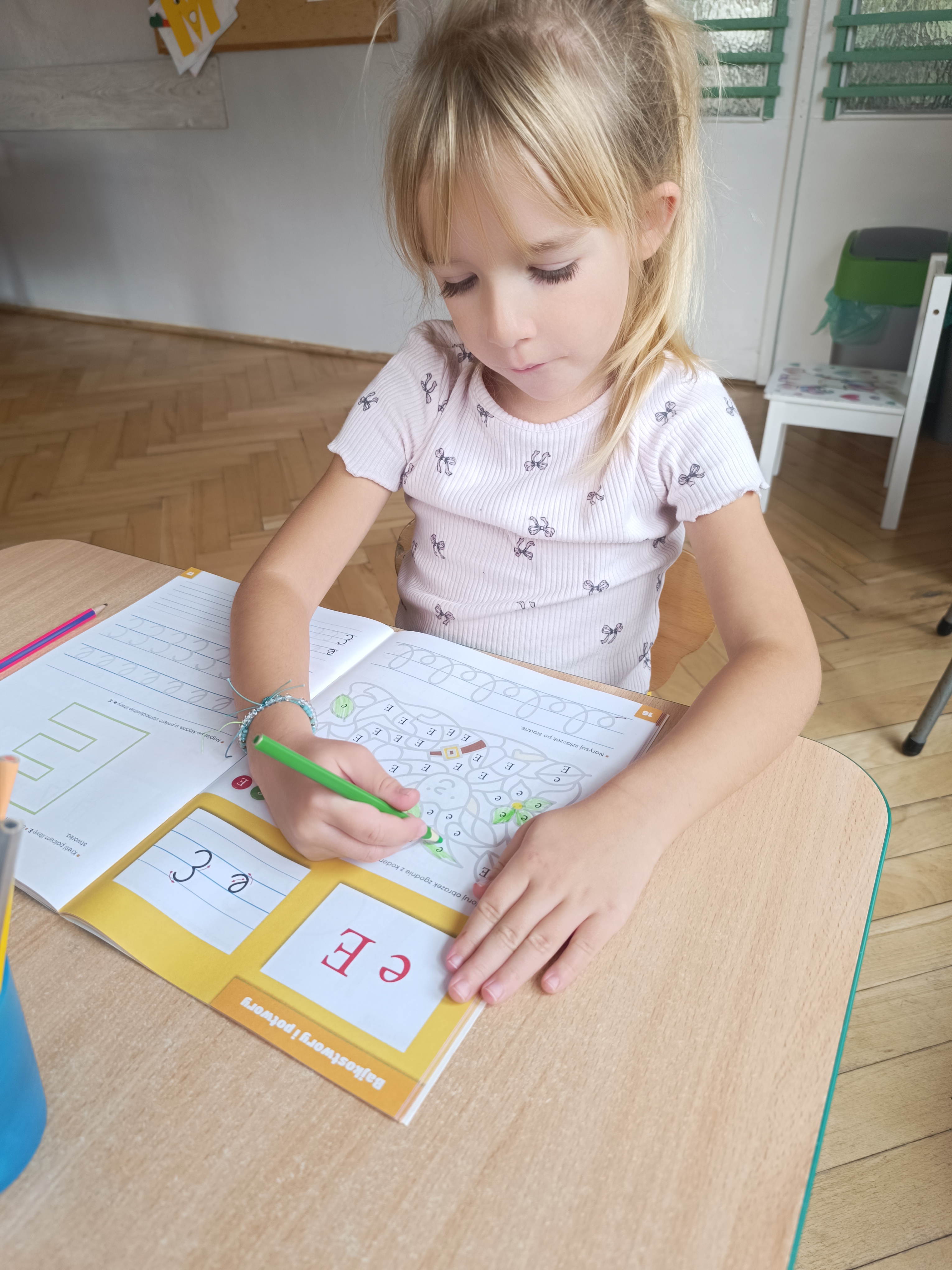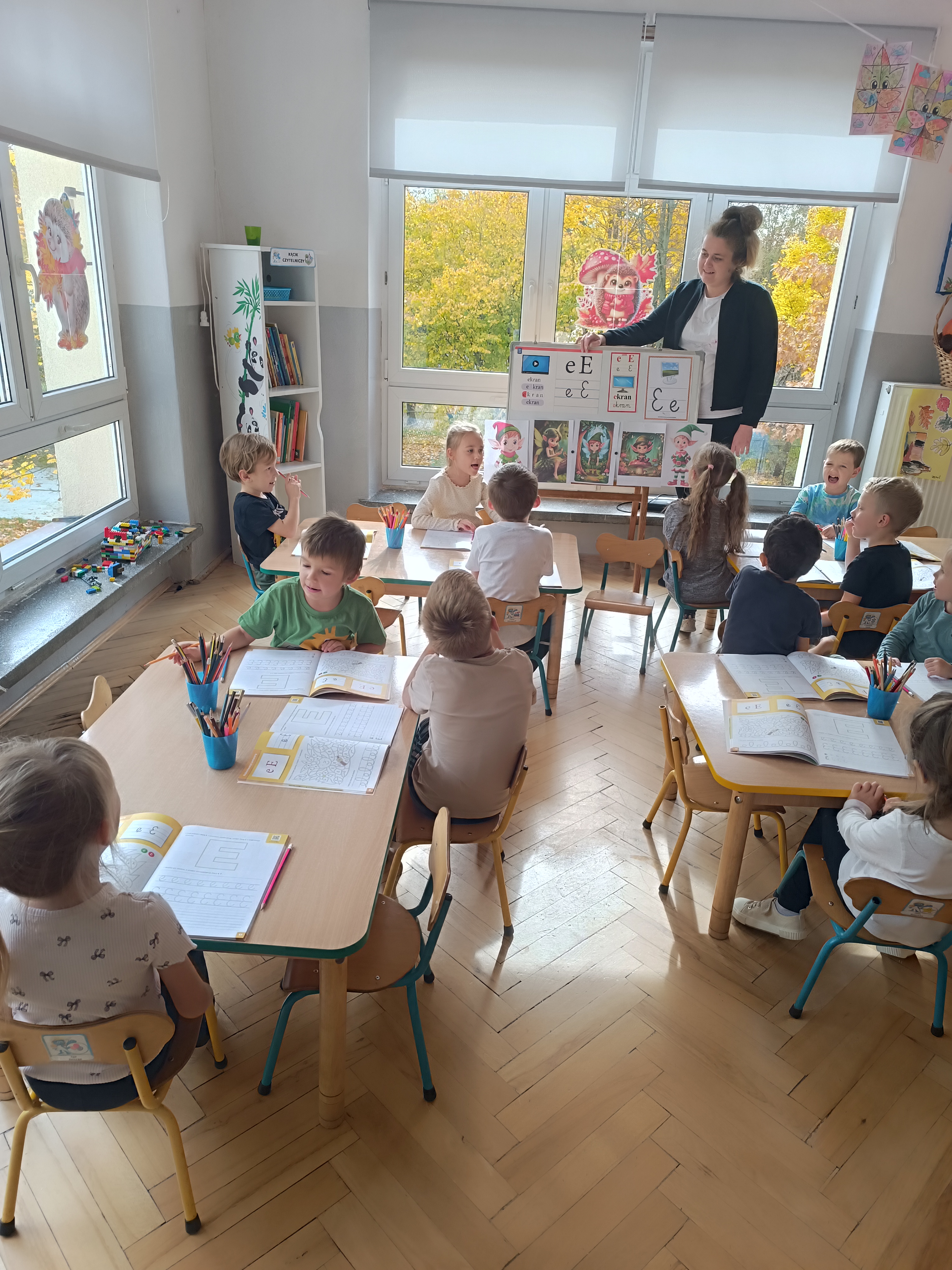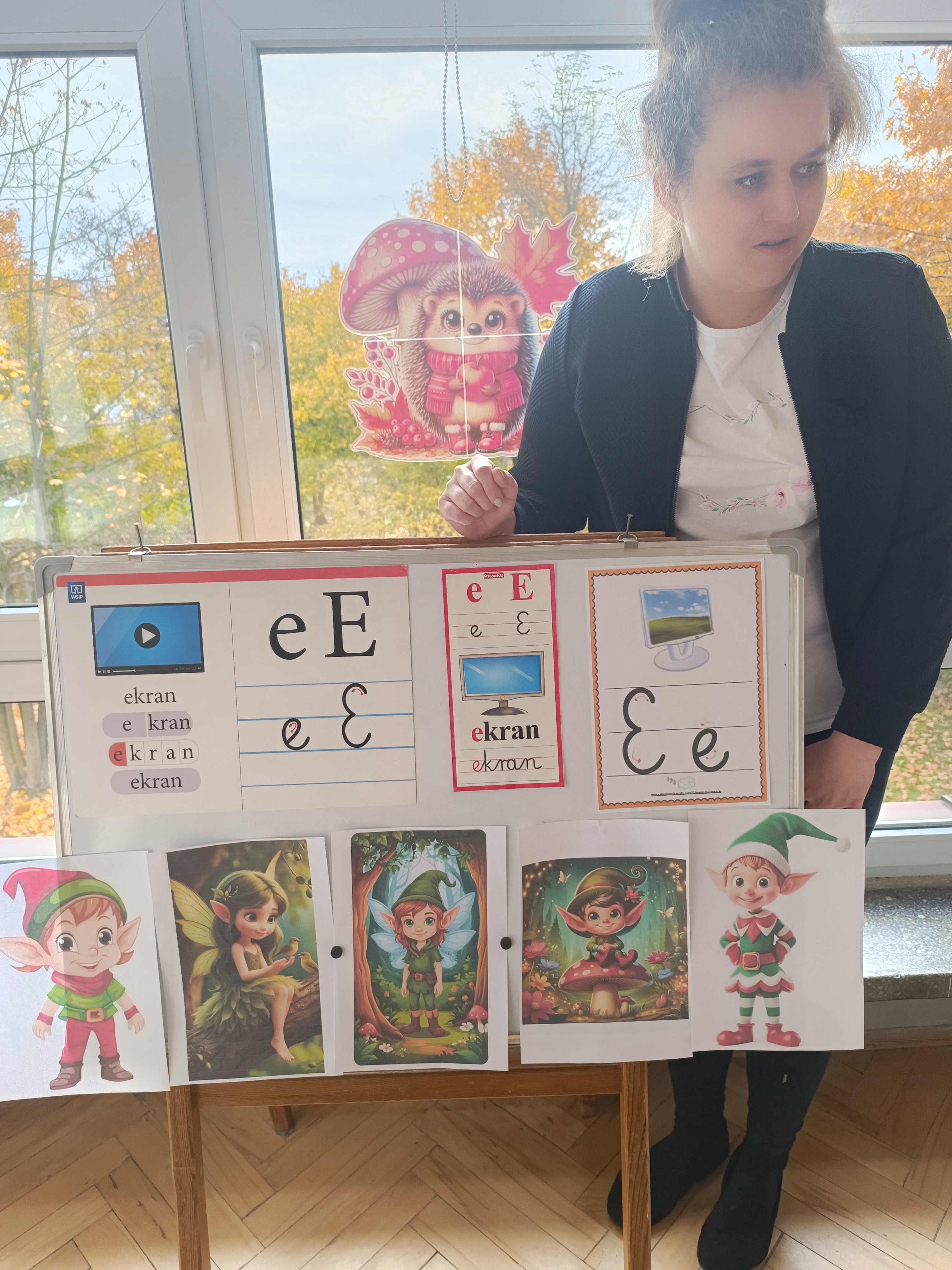 W tym tygodniu również poznaliśmy literkę drukowaną oraz pisaną - E, e - " E jak elf", dzieliliśmy na sylaby, uczestniczyliśmy w ćwiczeniach fonacyjnych i układaliśmy schemat słowa ELF z kartoników, wyodrębniając pierwszą głoskę.