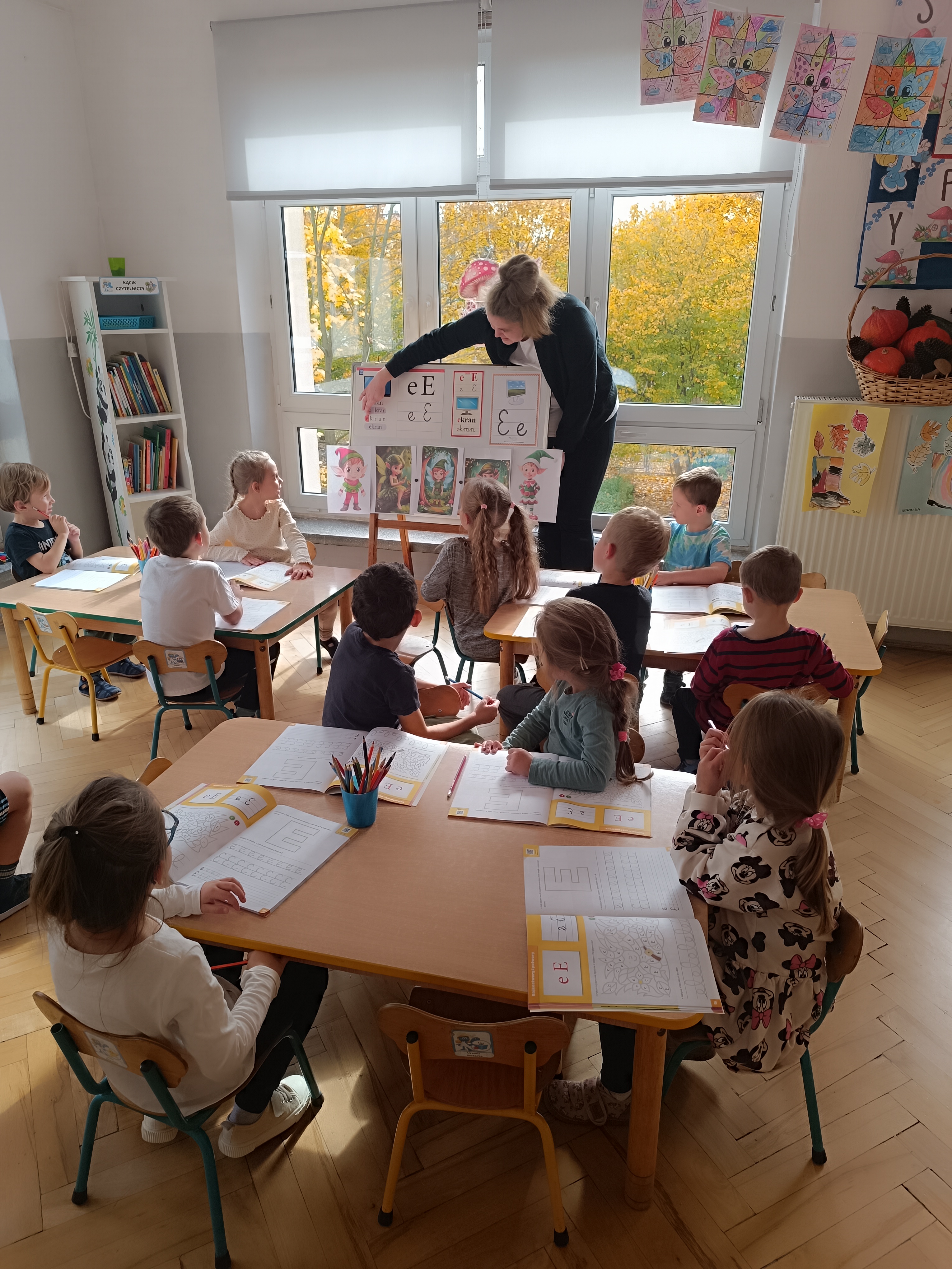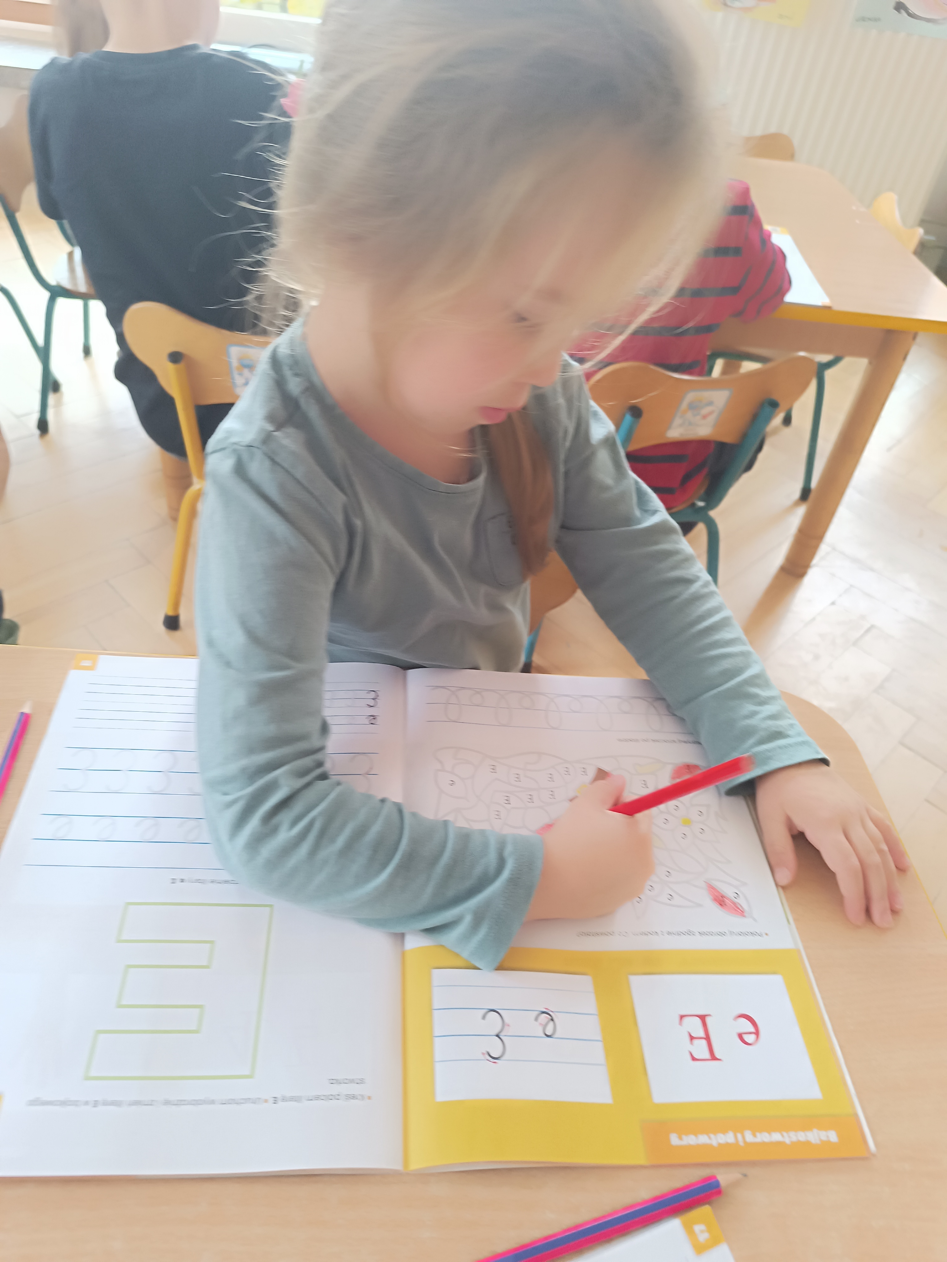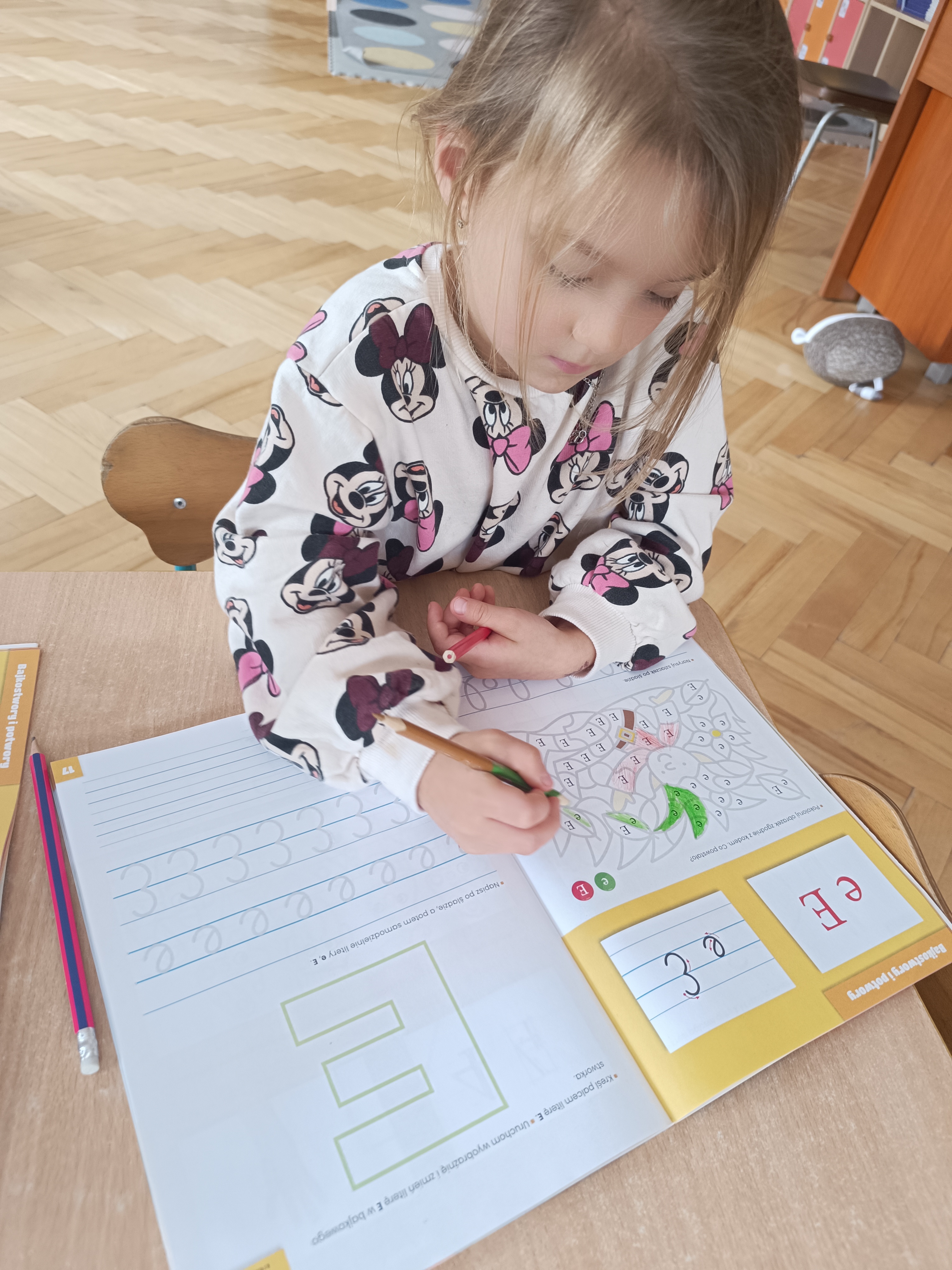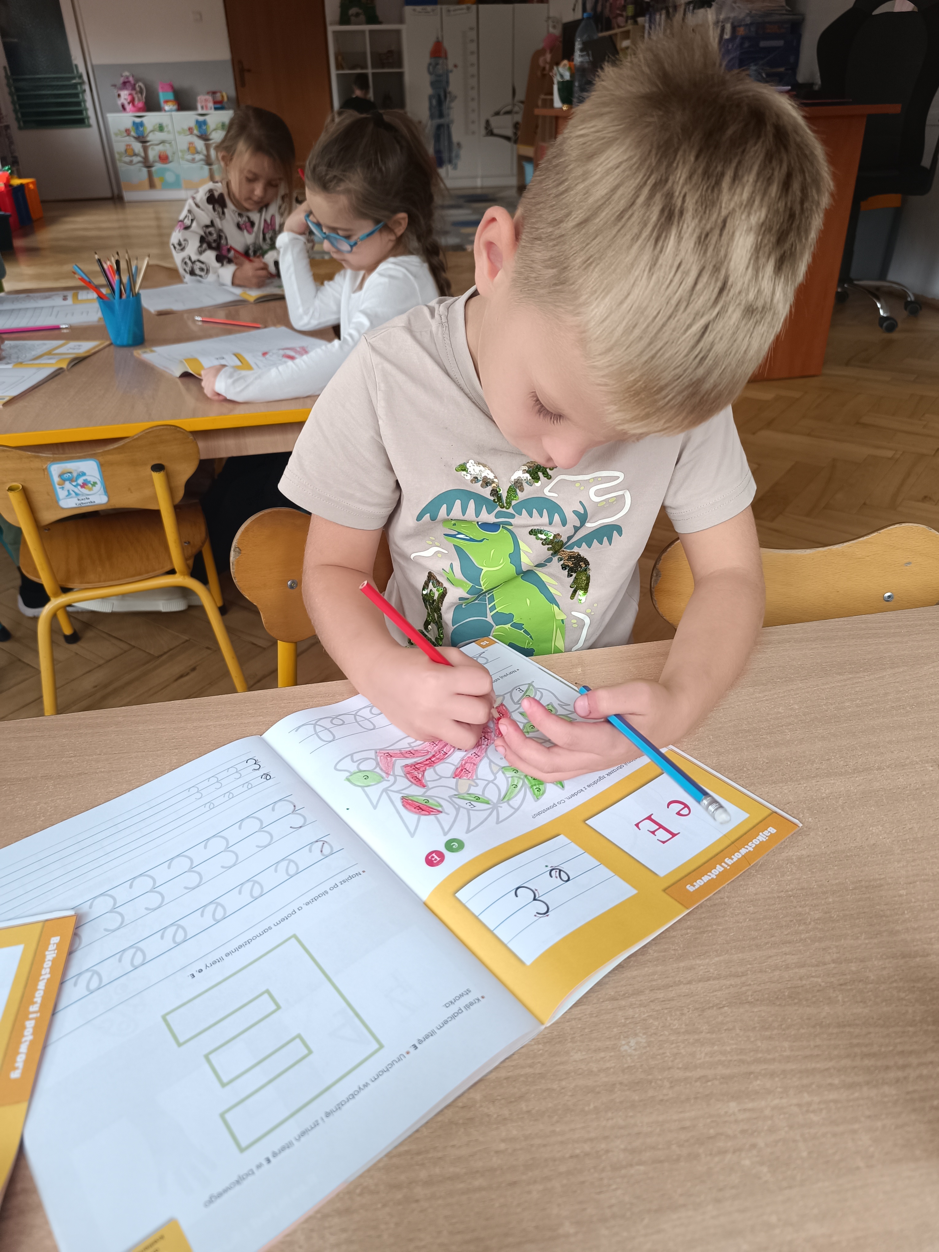 W tym tygodniu również poznaliśmy literkę drukowaną oraz pisaną - E, e - " E jak elf", dzieliliśmy na sylaby, uczestniczyliśmy w ćwiczeniach fonacyjnych i układaliśmy schemat słowa ELF z kartoników, wyodrębniając pierwszą głoskę.