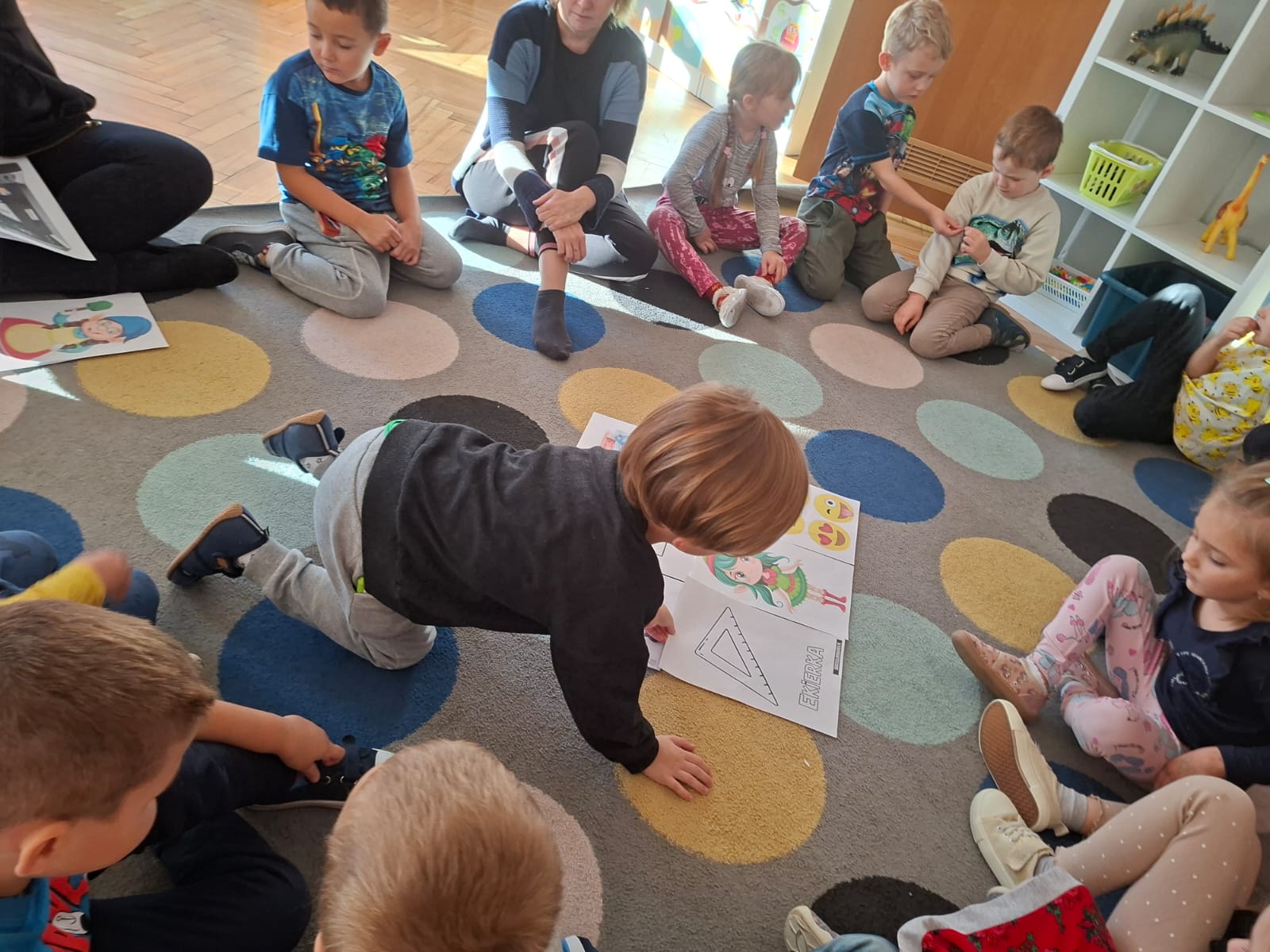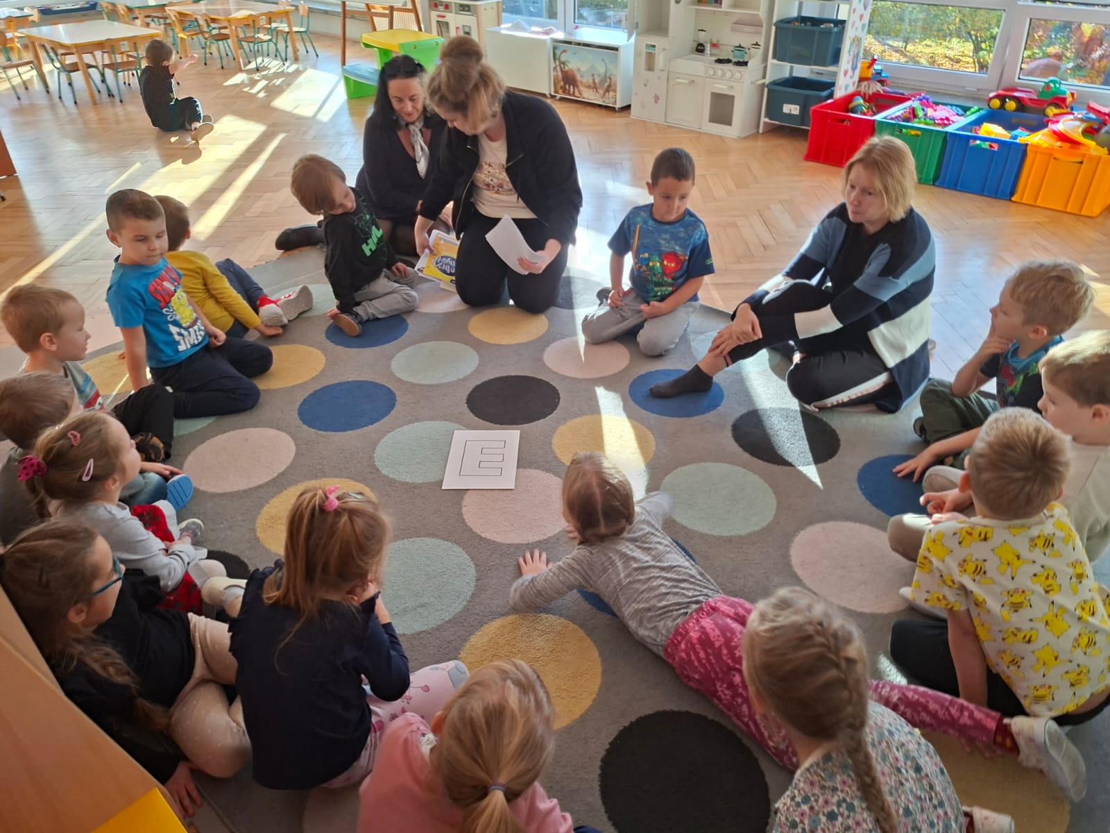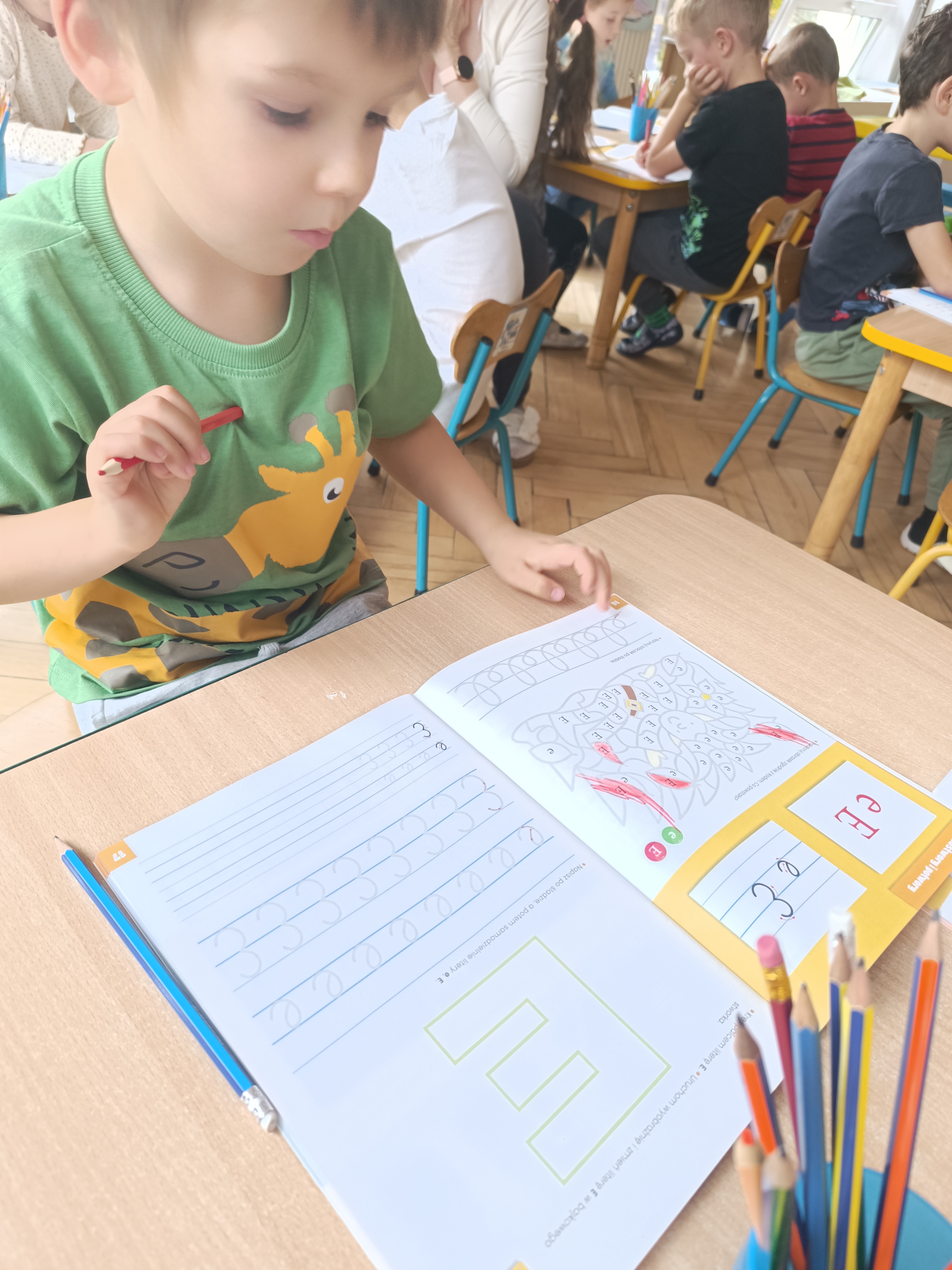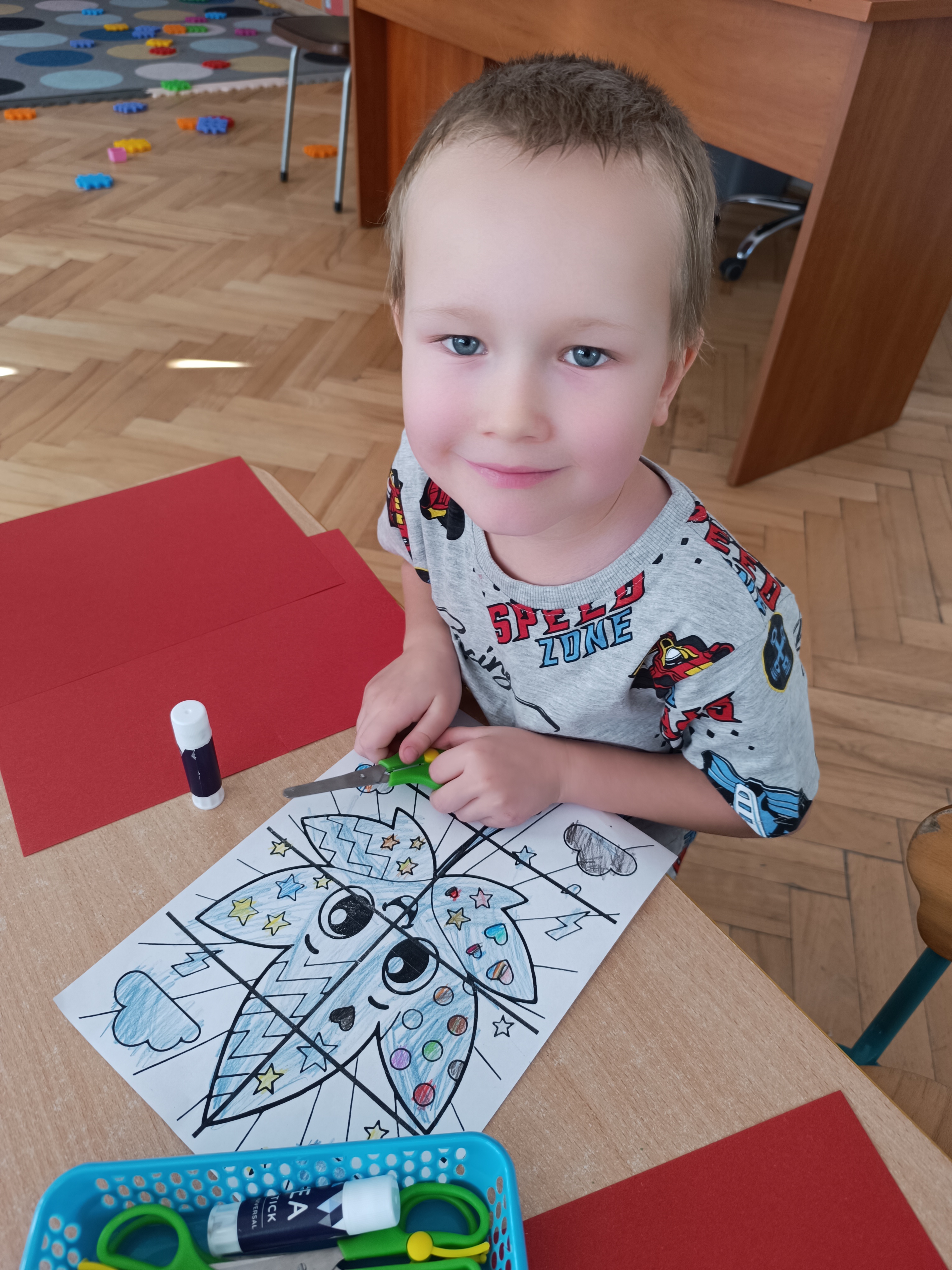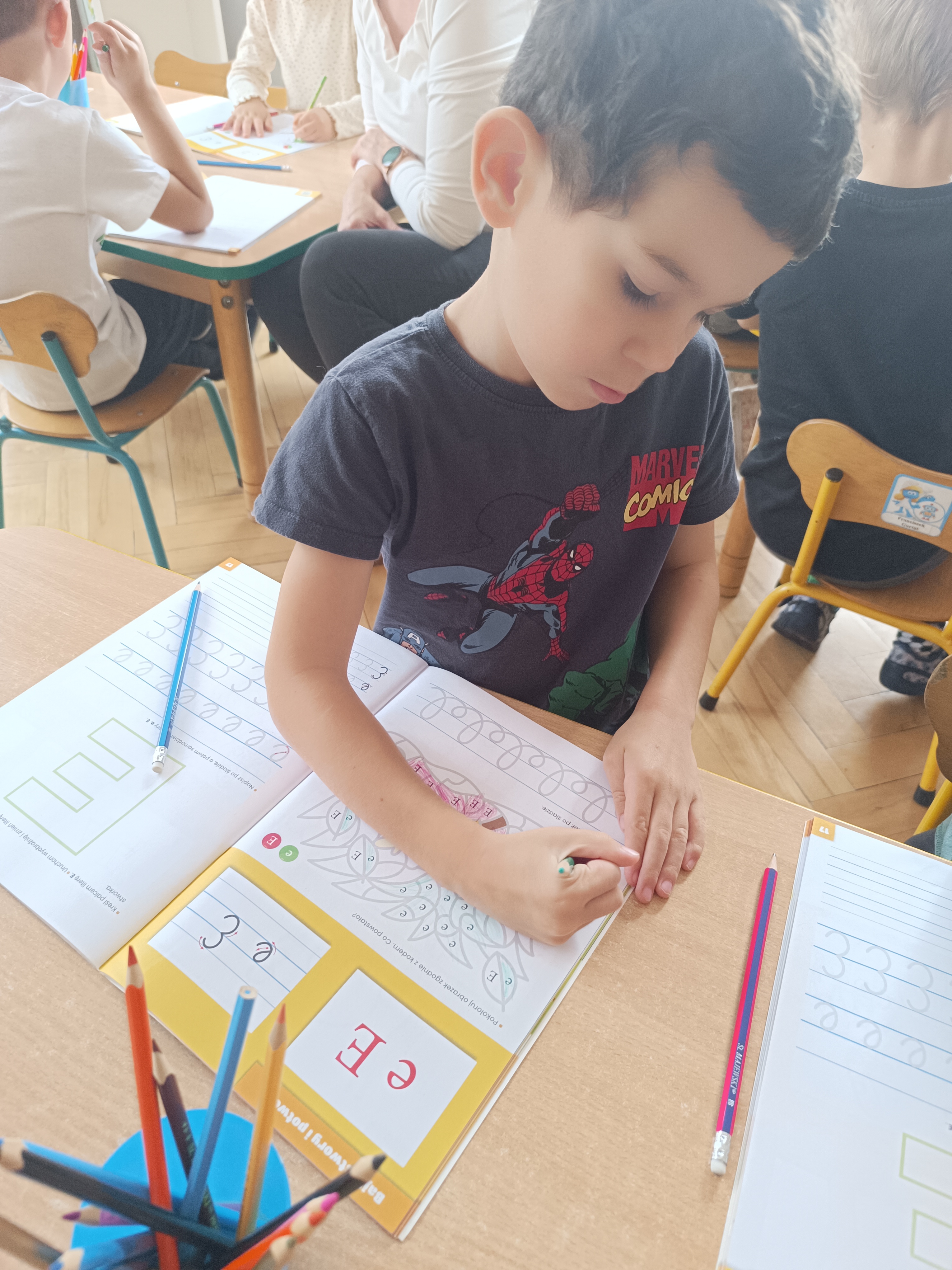 W tym tygodniu również poznaliśmy literkę drukowaną oraz pisaną - E, e - " E jak elf", dzieliliśmy na sylaby, uczestniczyliśmy w ćwiczeniach fonacyjnych i układaliśmy schemat słowa ELF z kartoników, wyodrębniając pierwszą głoskę.