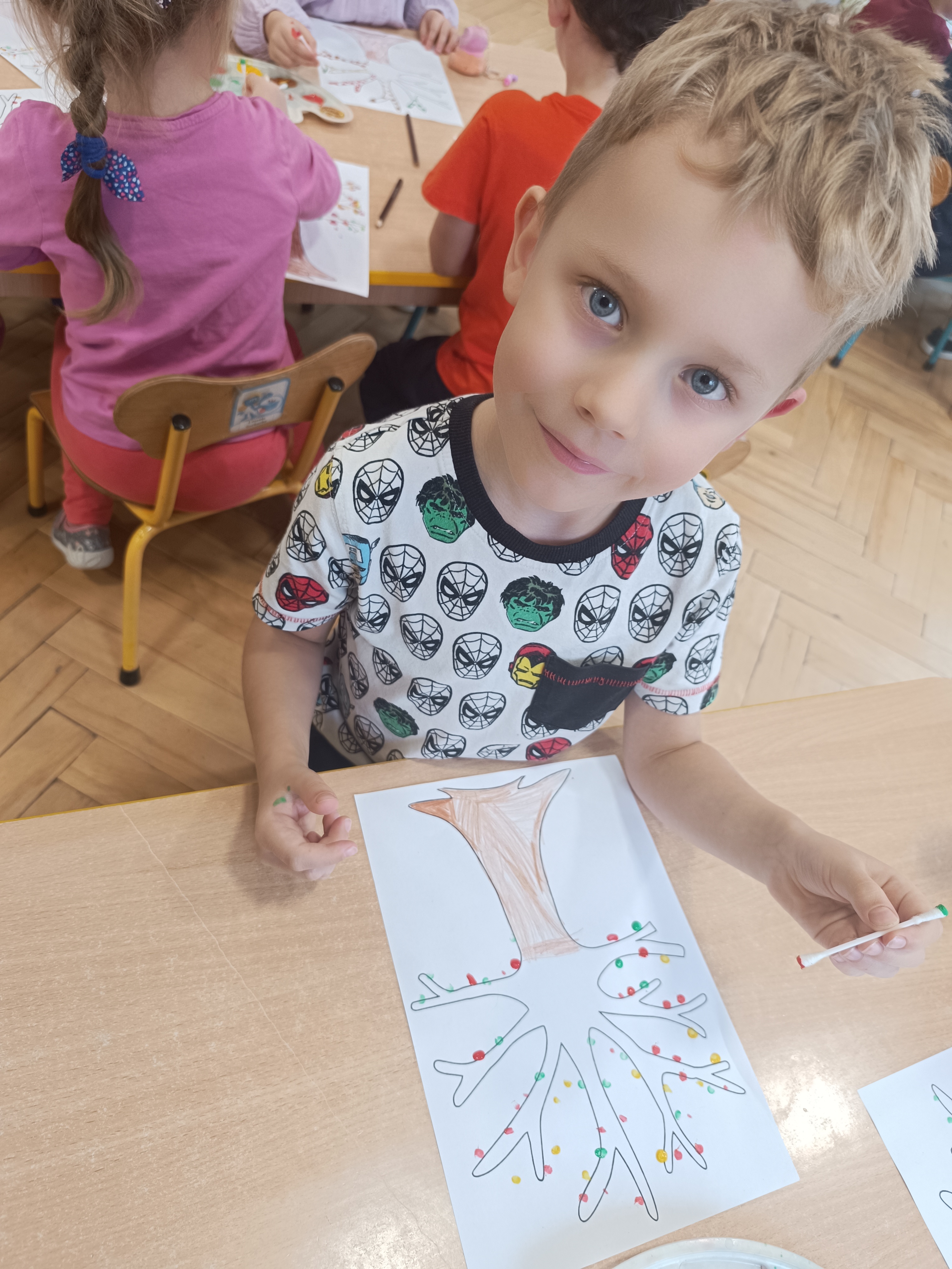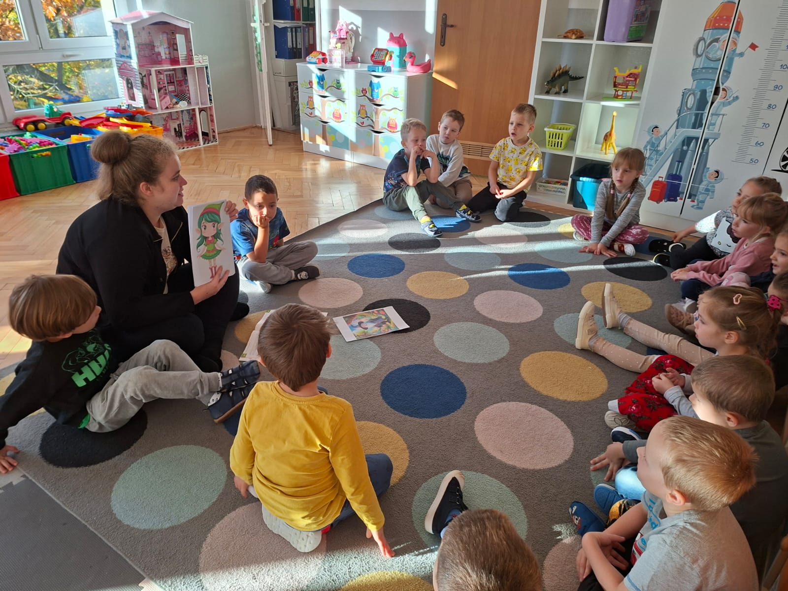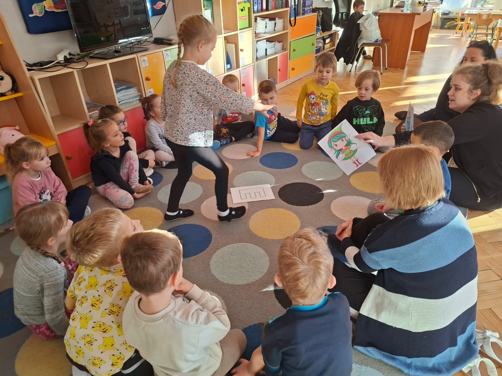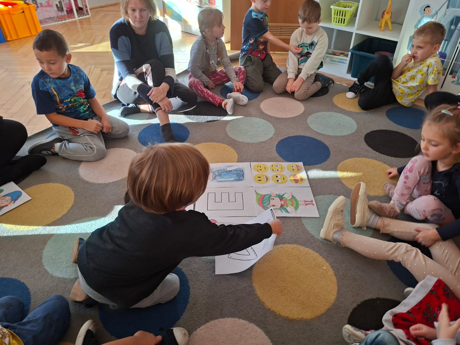 W tym tygodniu również poznaliśmy literkę drukowaną oraz pisaną - E, e - " E jak elf", dzieliliśmy na sylaby, uczestniczyliśmy w ćwiczeniach fonacyjnych i układaliśmy schemat słowa ELF z kartoników, wyodrębniając pierwszą głoskę.