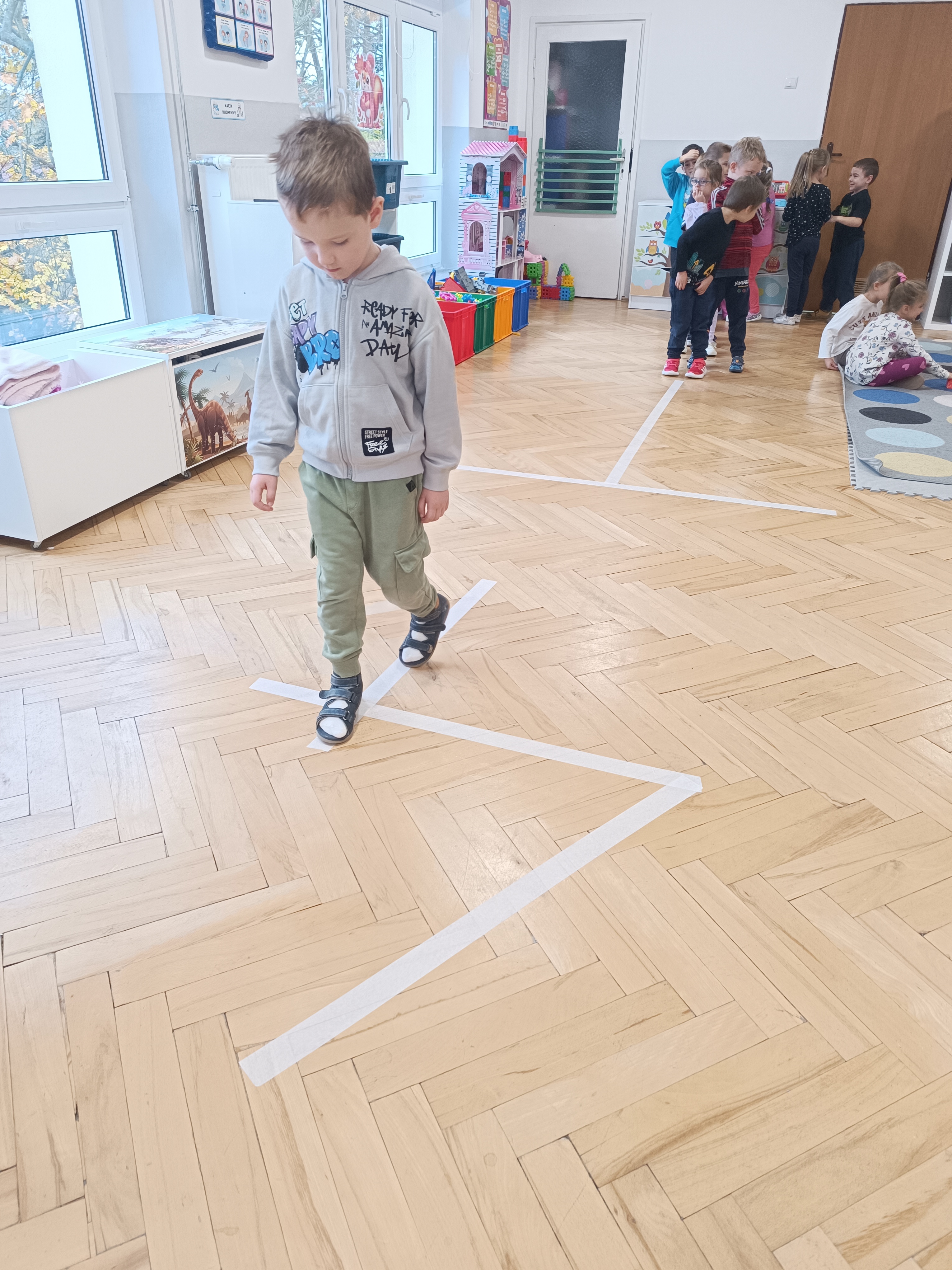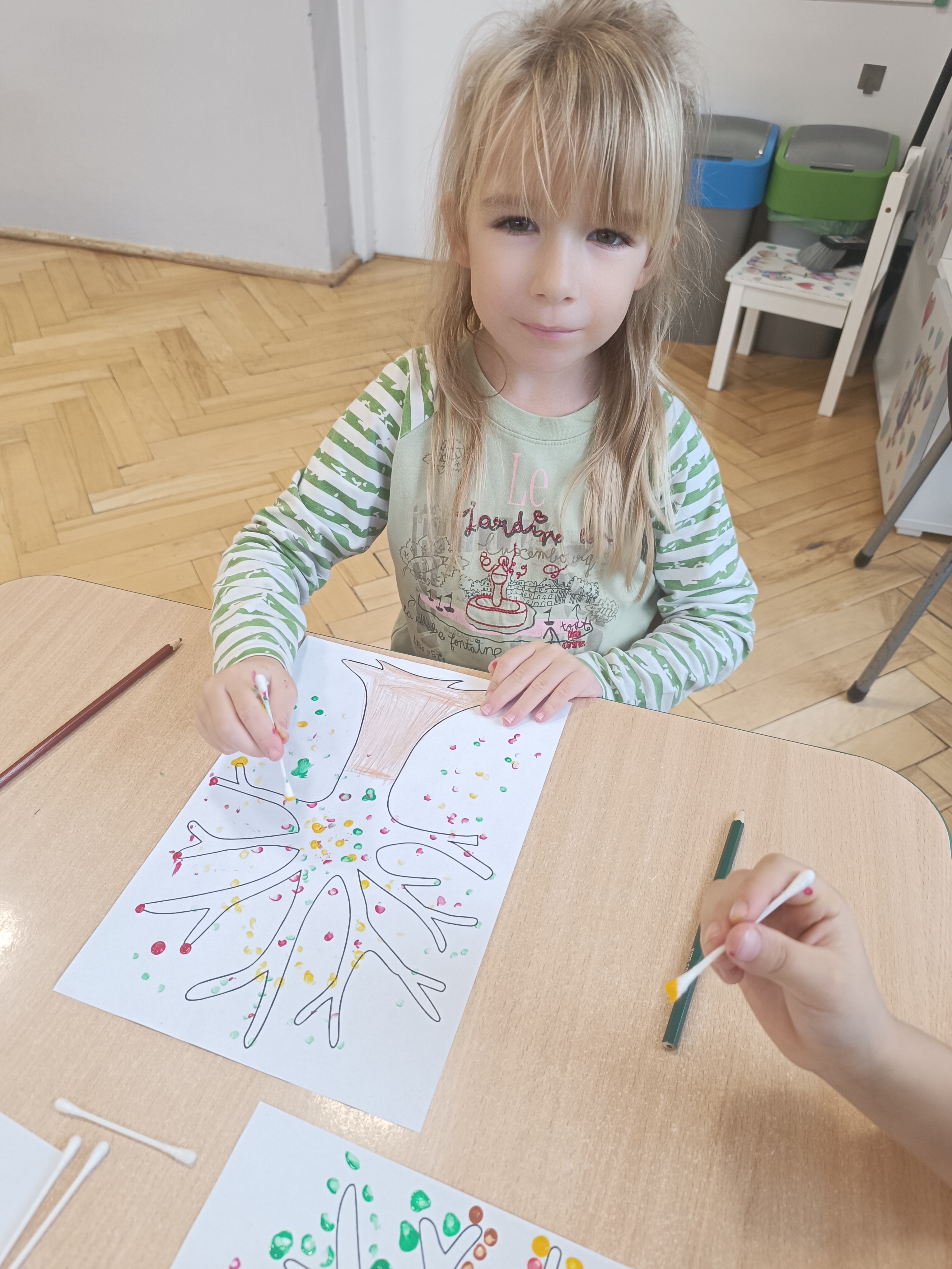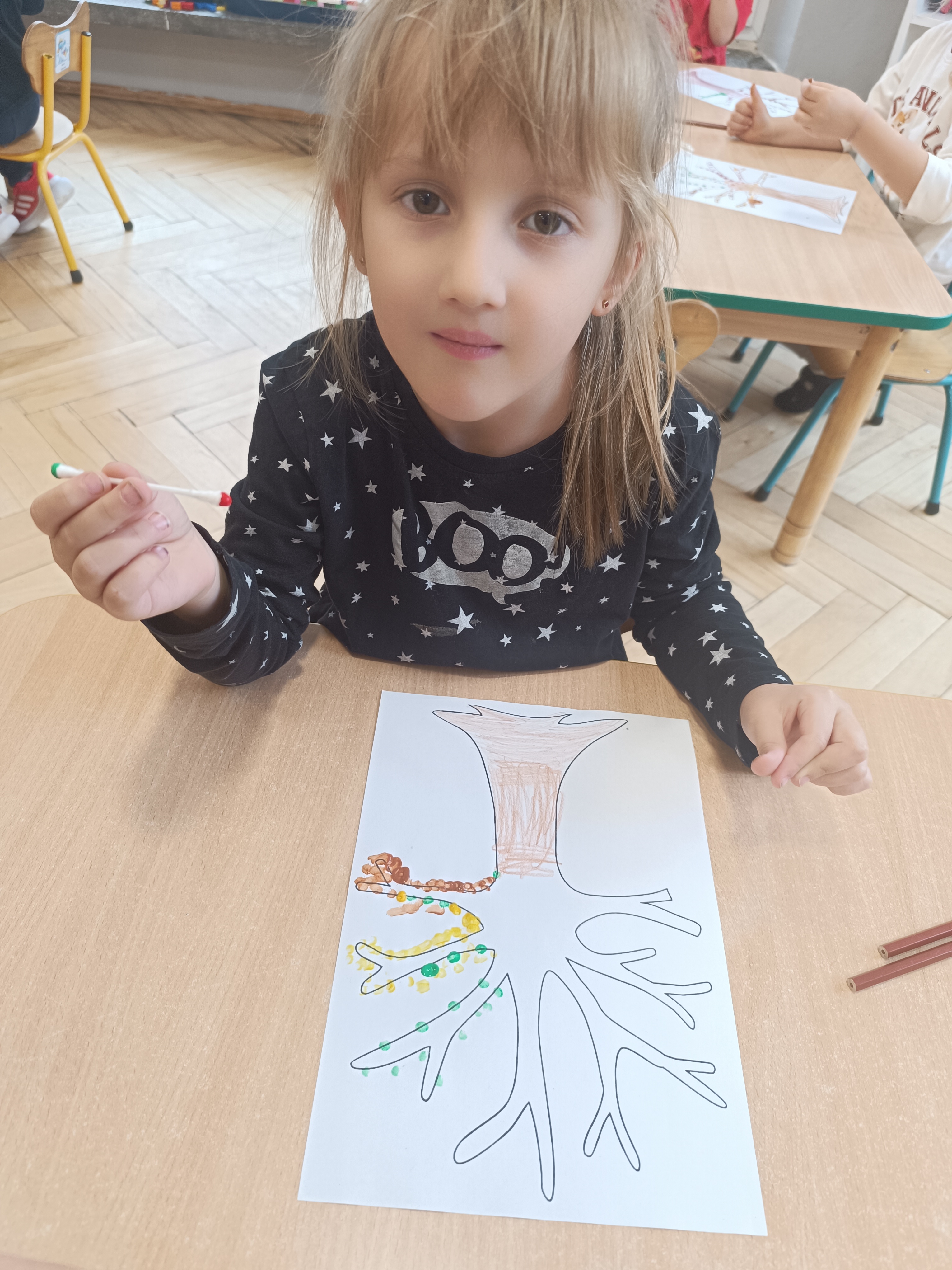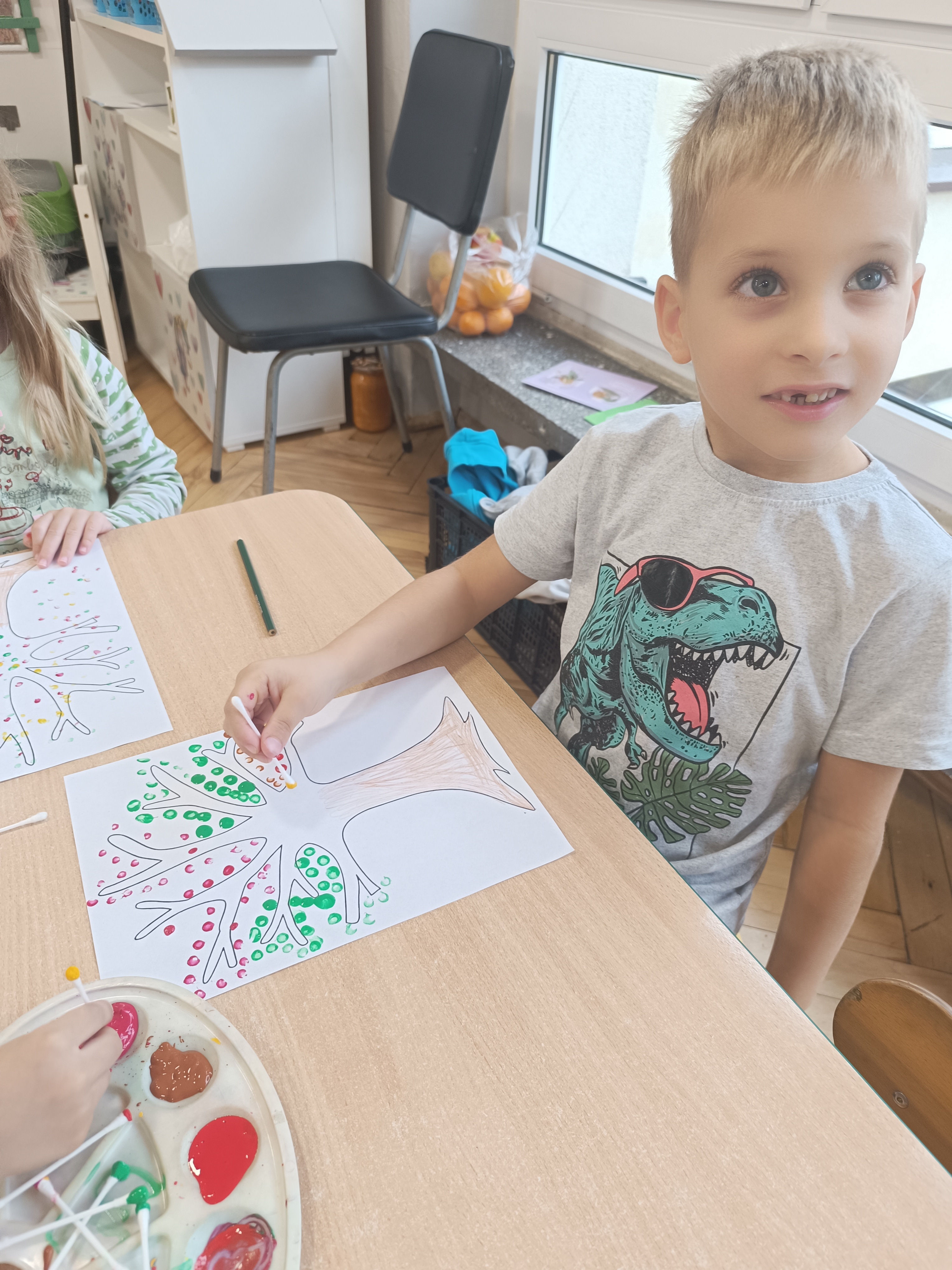 W tym tygodniu również poznaliśmy literkę drukowaną oraz pisaną - E, e - " E jak elf", dzieliliśmy na sylaby, uczestniczyliśmy w ćwiczeniach fonacyjnych i układaliśmy schemat słowa ELF z kartoników, wyodrębniając pierwszą głoskę.