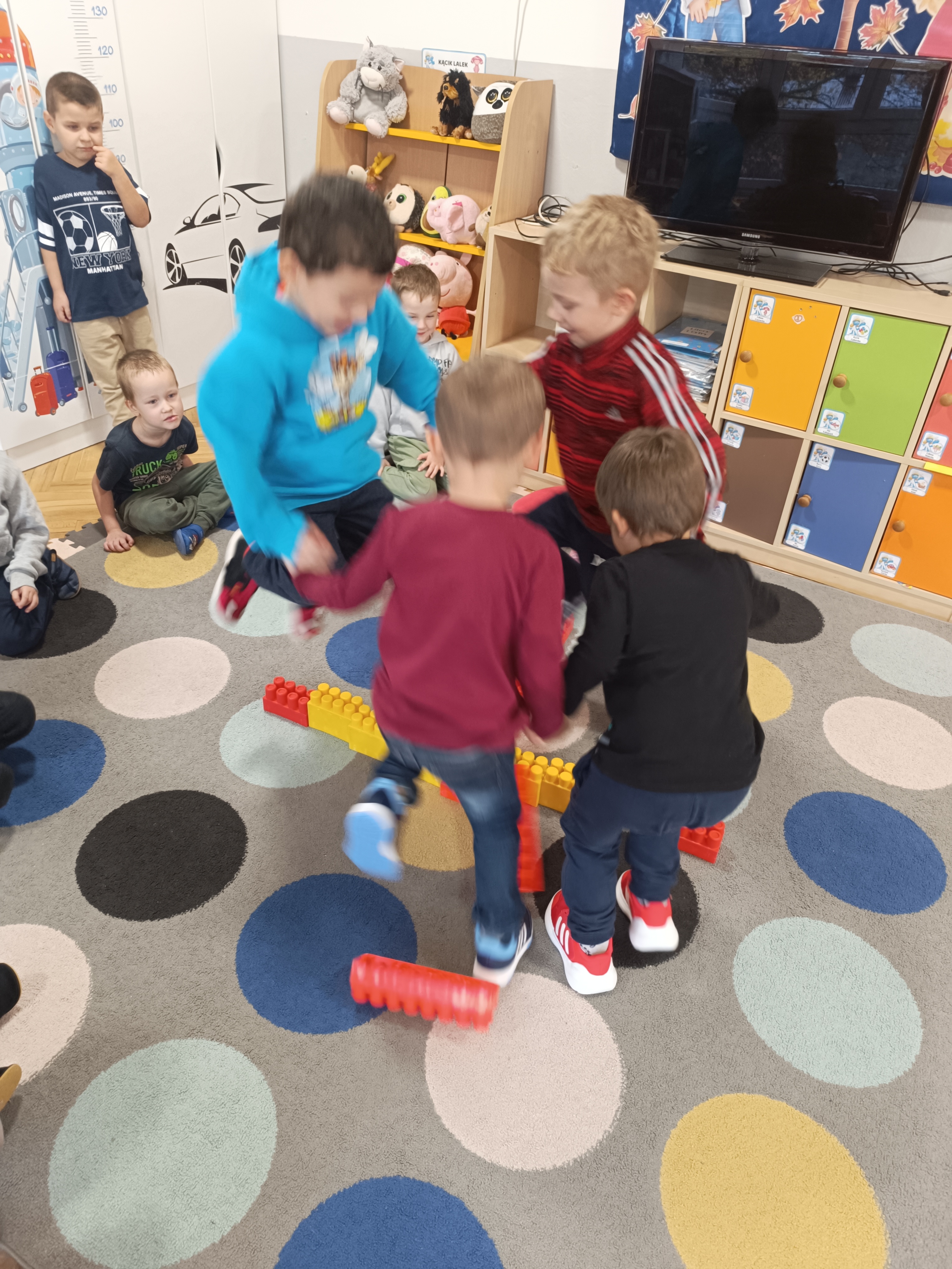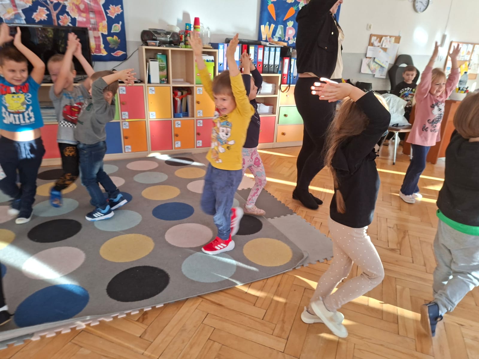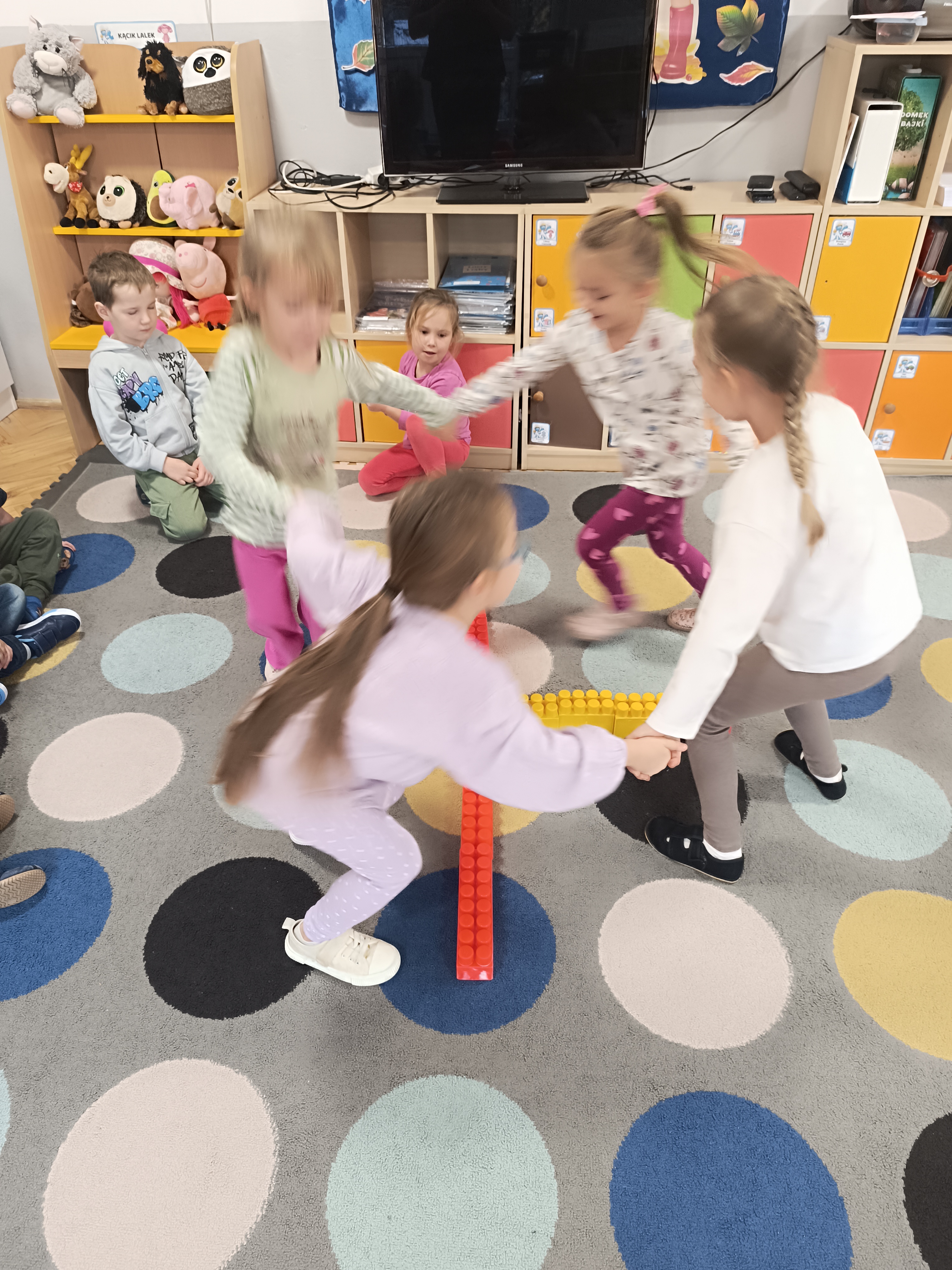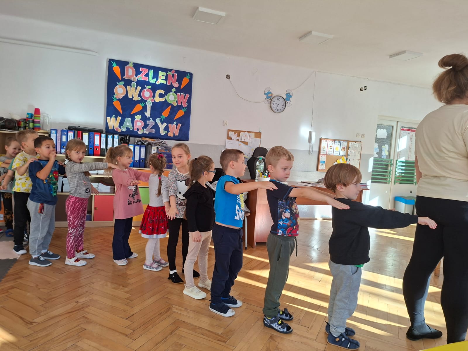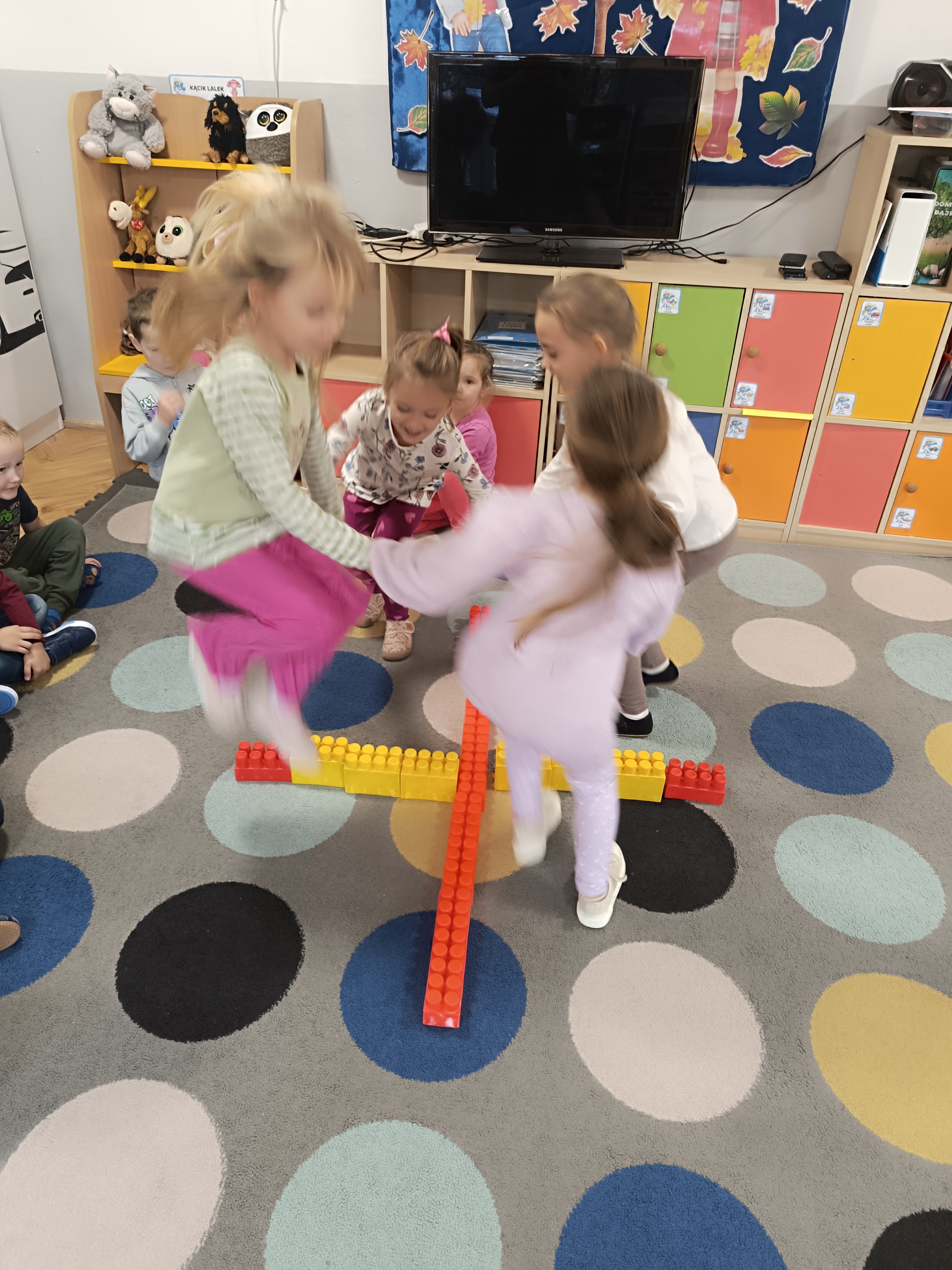 Smerfy brały udział w zabawie matematycznej " Ile nóg ma stworek?"; " Czwarty - bum"; " O ile wyższy?" oraz w zabawie ruchowej " E jak elf"; " W czwórce siła" ; " Stworki na pogodę i niepogodę".