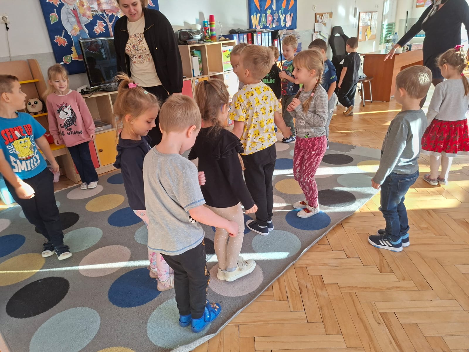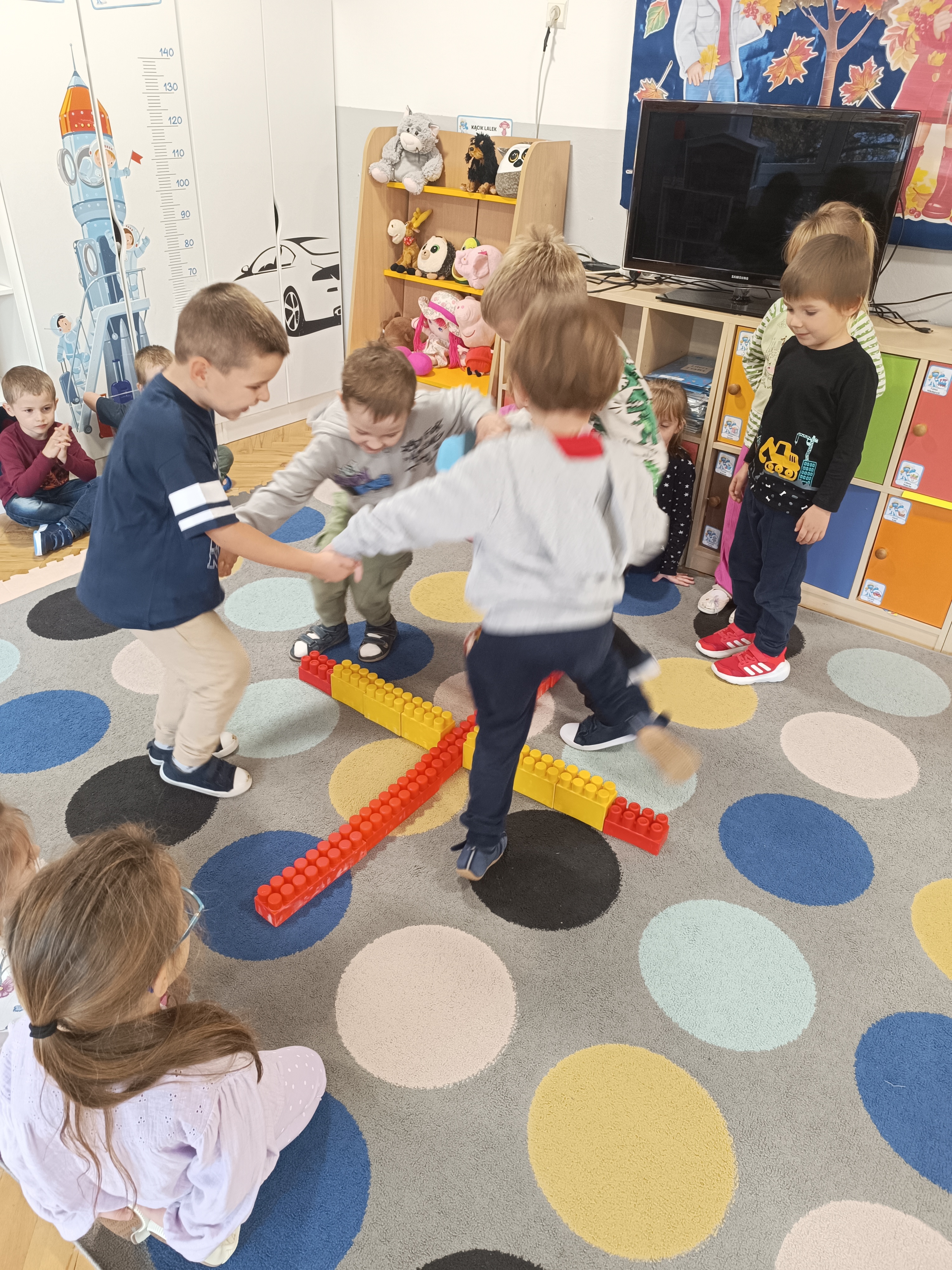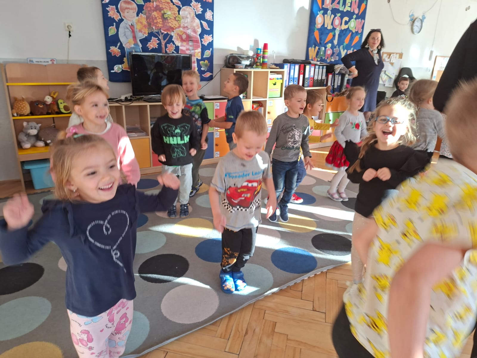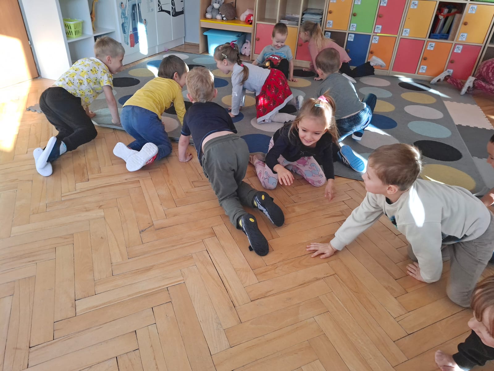 Smerfy brały udział w zabawie matematycznej " Ile nóg ma stworek?"; " Czwarty - bum"; " O ile wyższy?" oraz w zabawie ruchowej " E jak elf"; " W czwórce siła" ; " Stworki na pogodę i niepogodę".