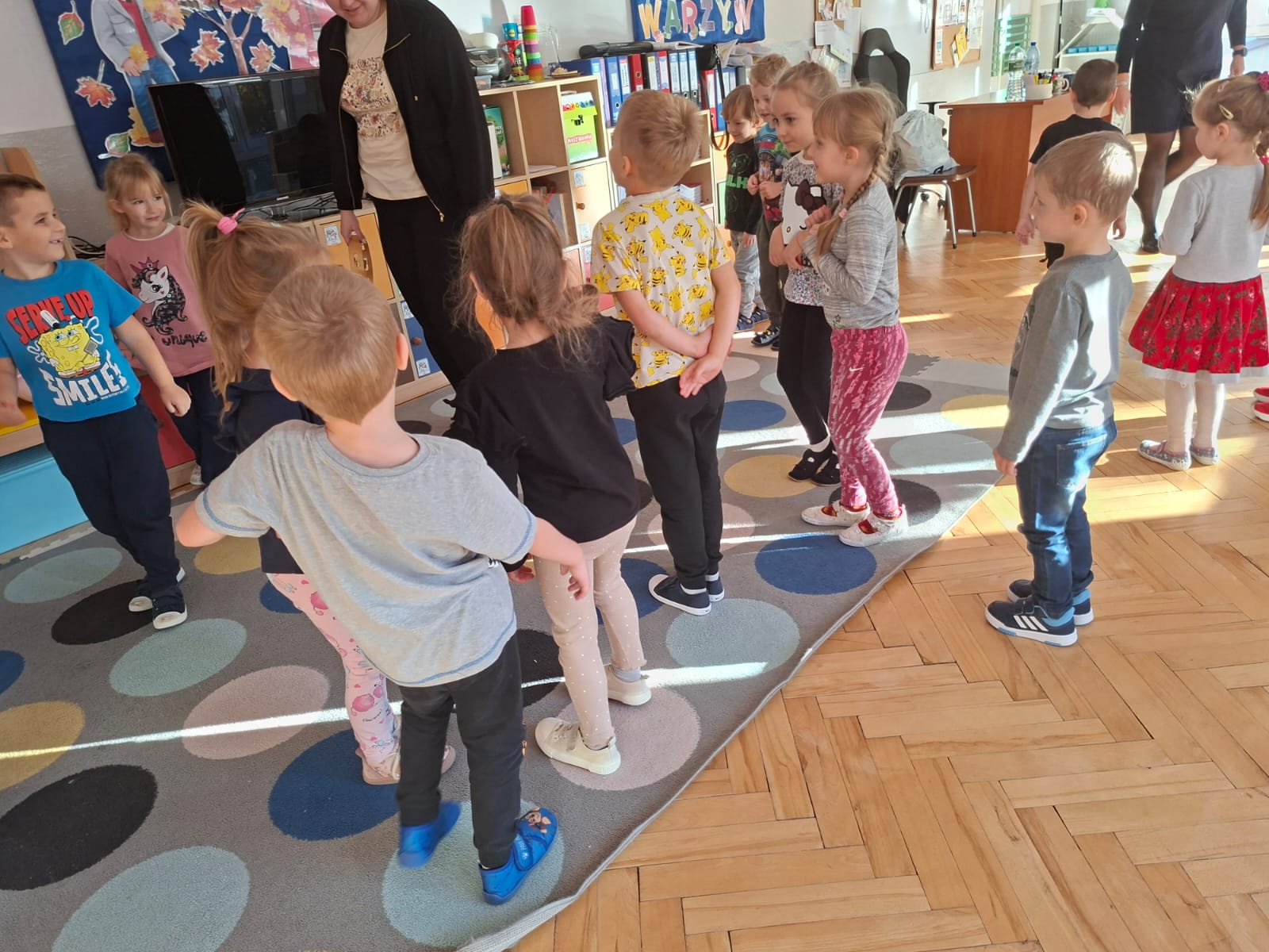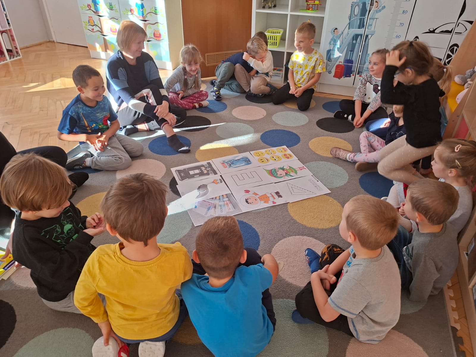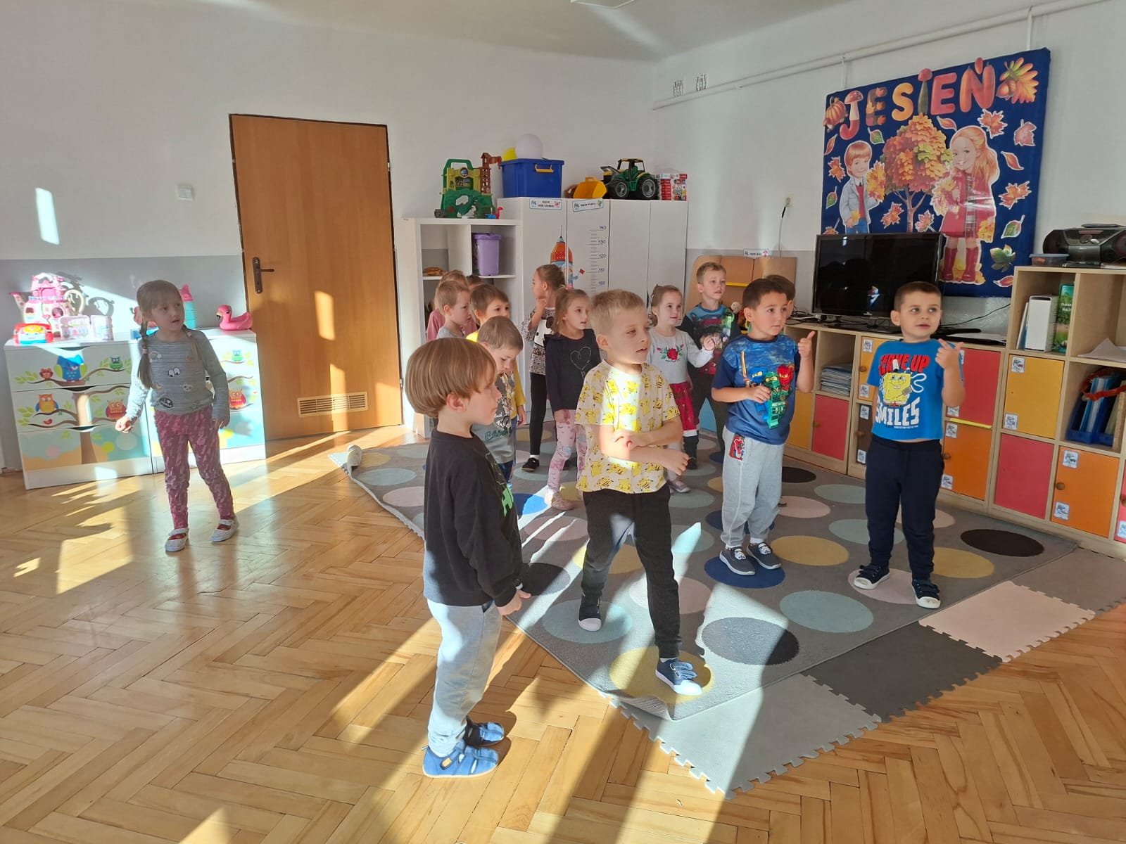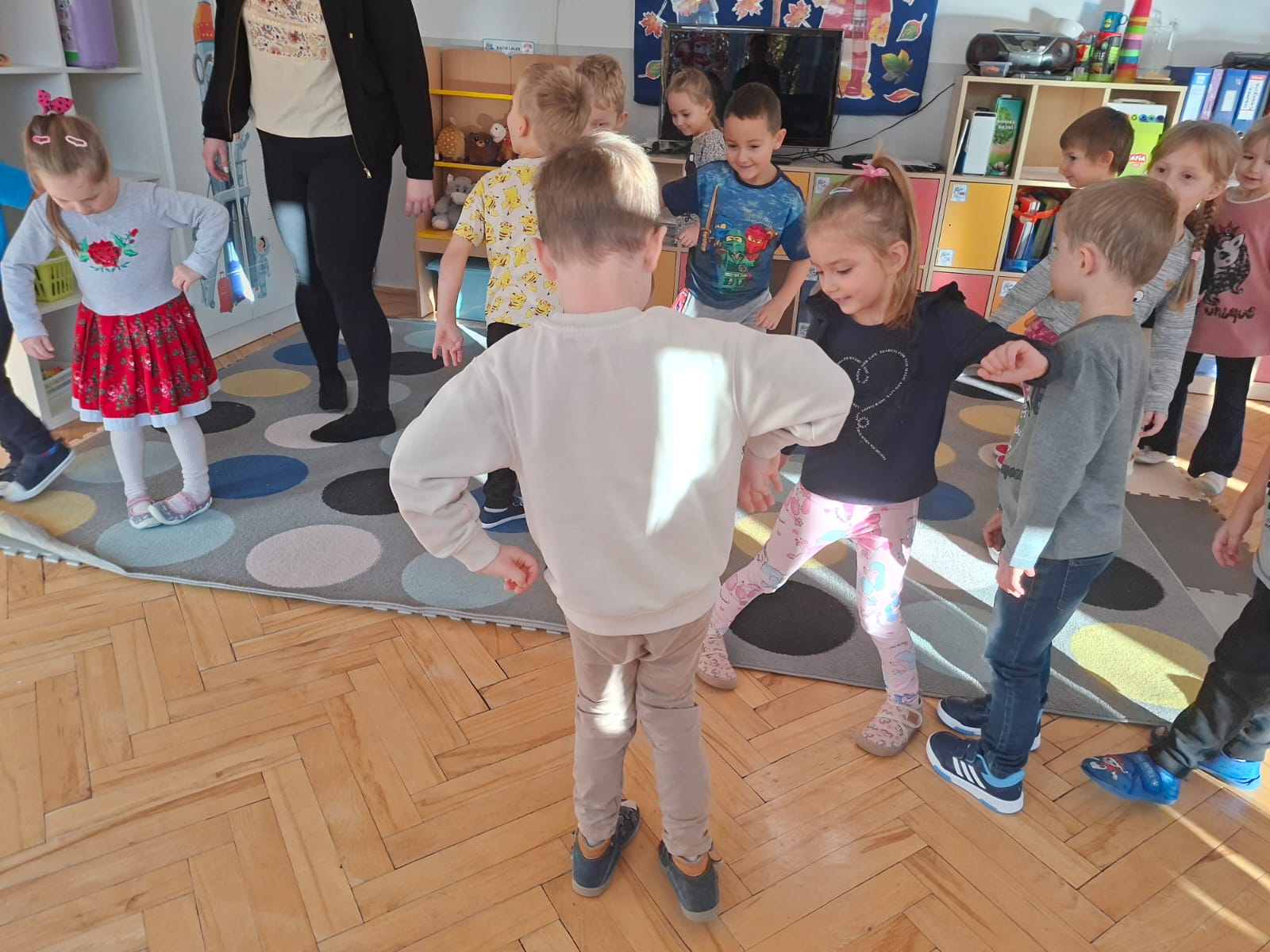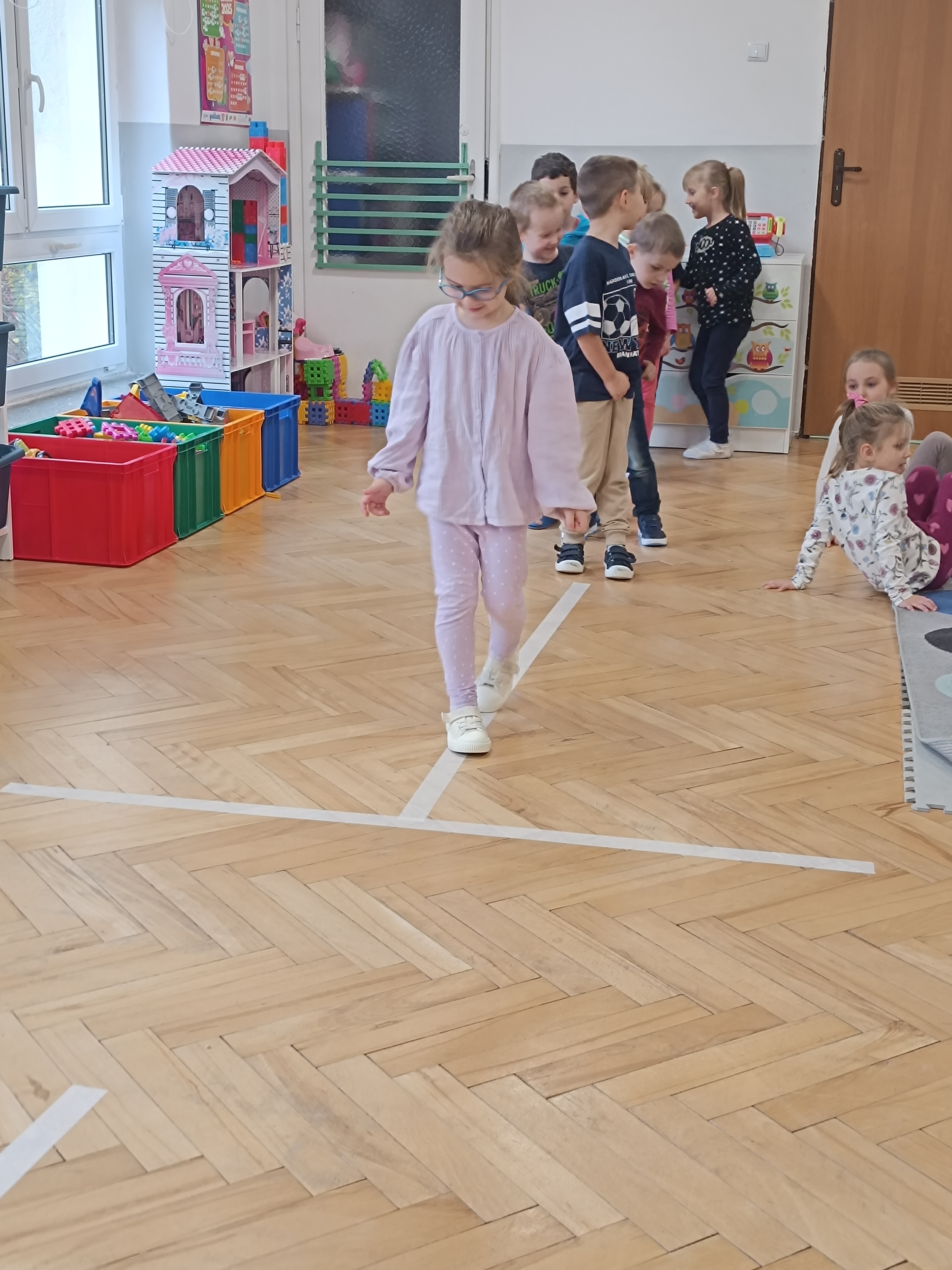 Smerfy brały udział w zabawie matematycznej " Ile nóg ma stworek?"; " Czwarty - bum"; " O ile wyższy?" oraz w zabawie ruchowej " E jak elf"; " W czwórce siła" ; " Stworki na pogodę i niepogodę".