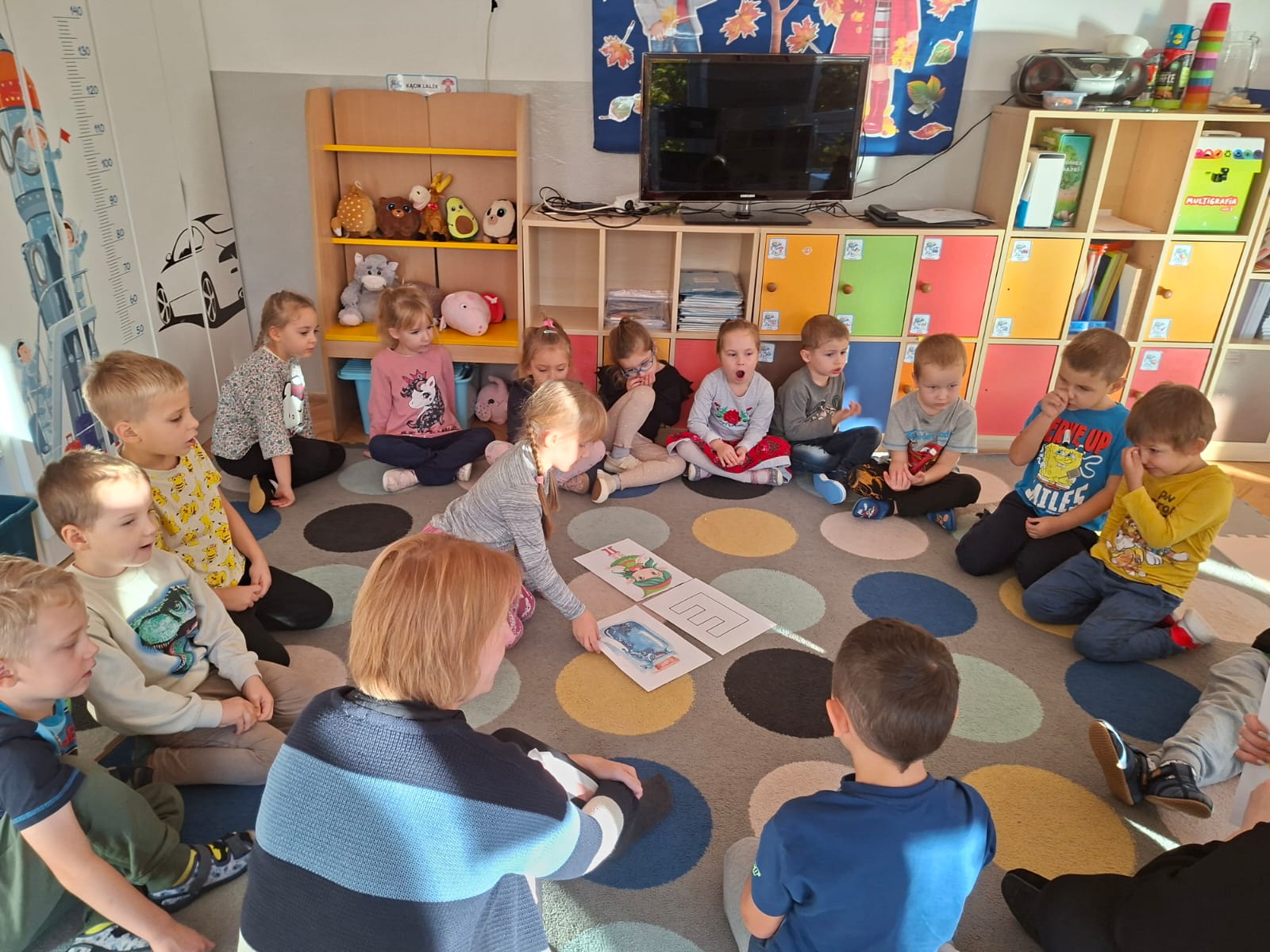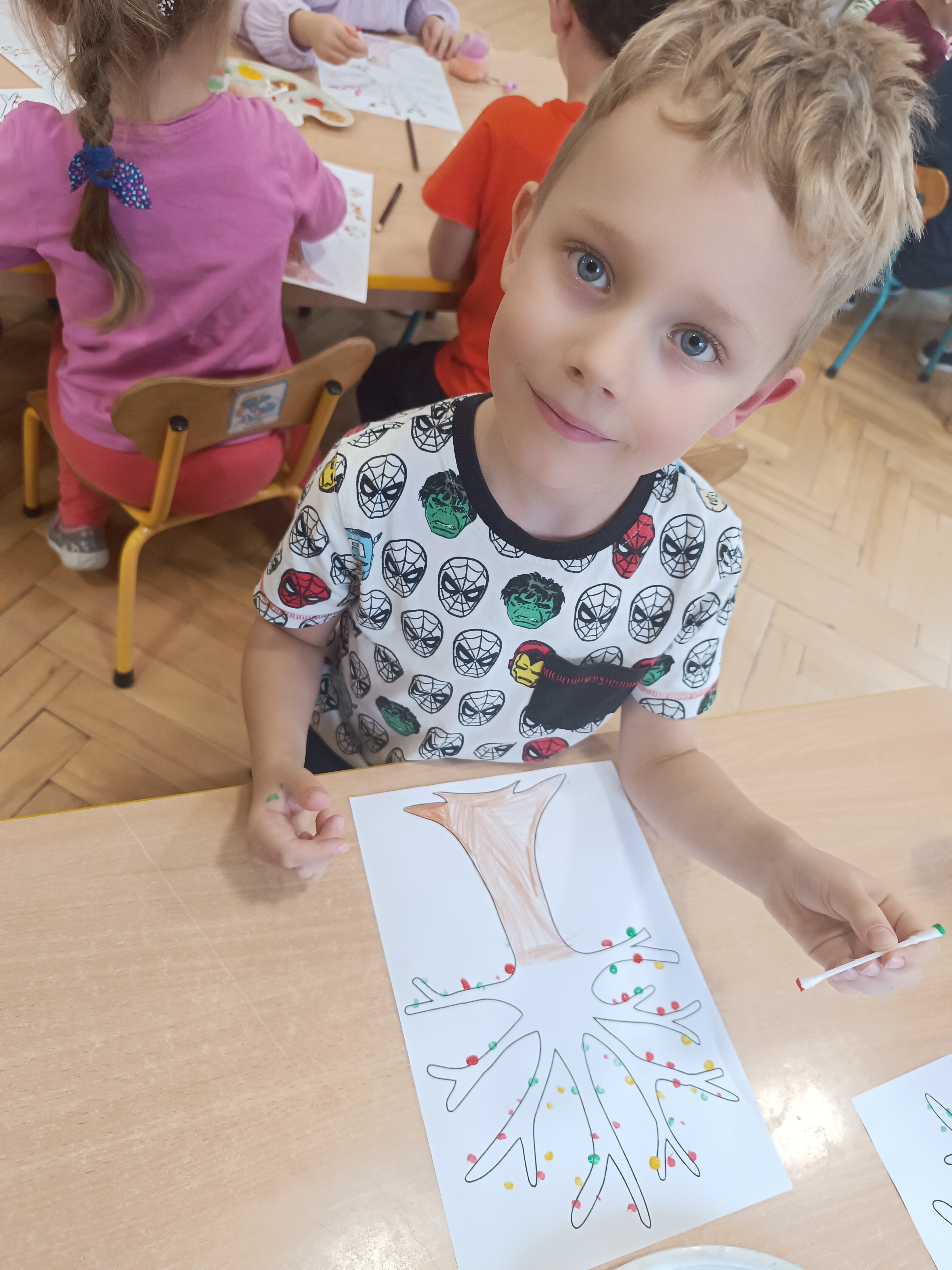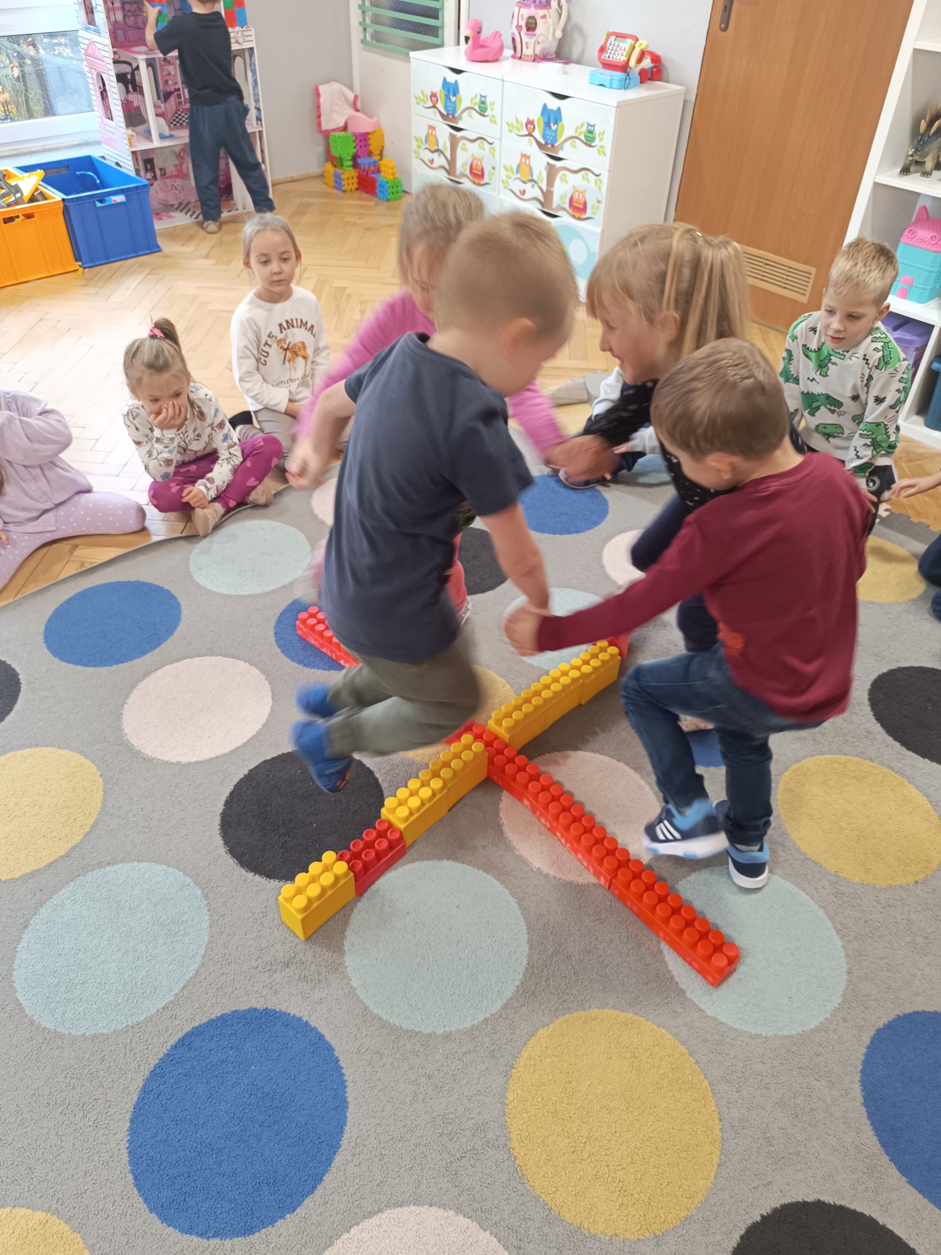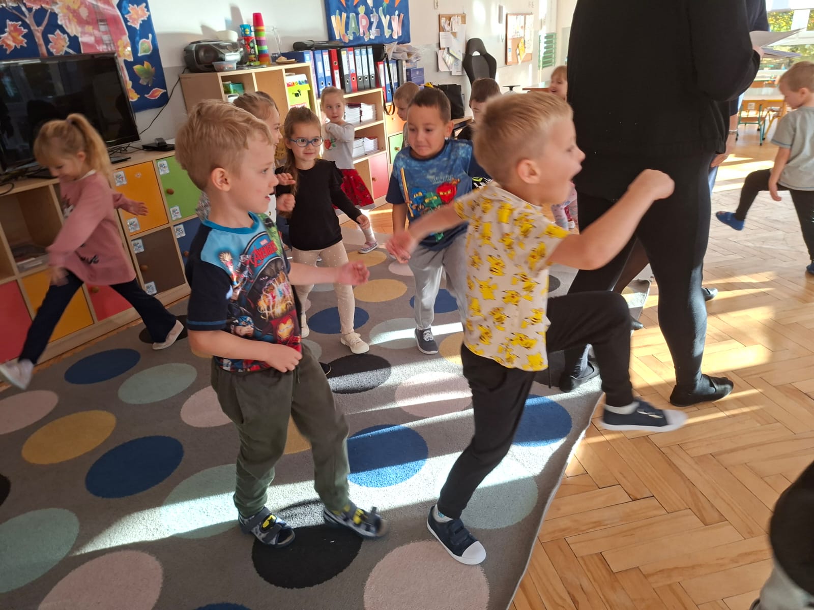 Smerfy brały udział w zabawie matematycznej " Ile nóg ma stworek?"; " Czwarty - bum"; " O ile wyższy?" oraz w zabawie ruchowej " E jak elf"; " W czwórce siła" ; " Stworki na pogodę i niepogodę".