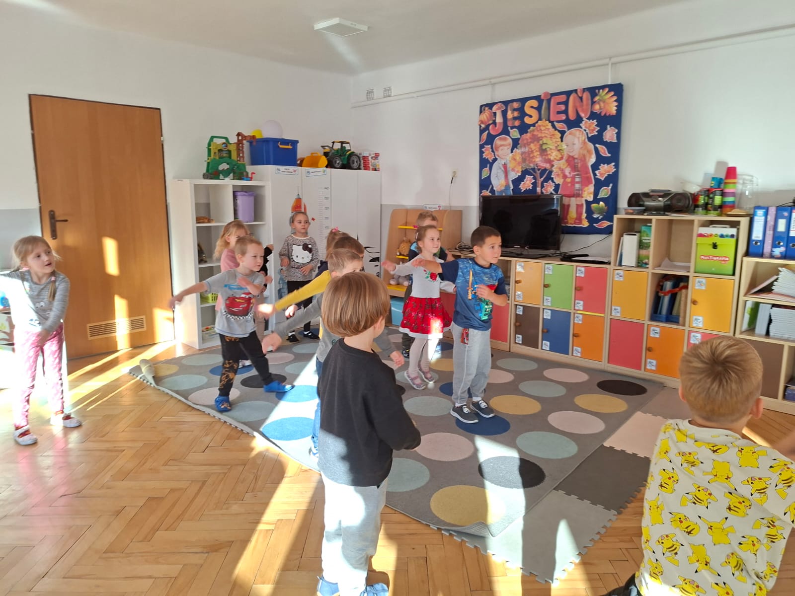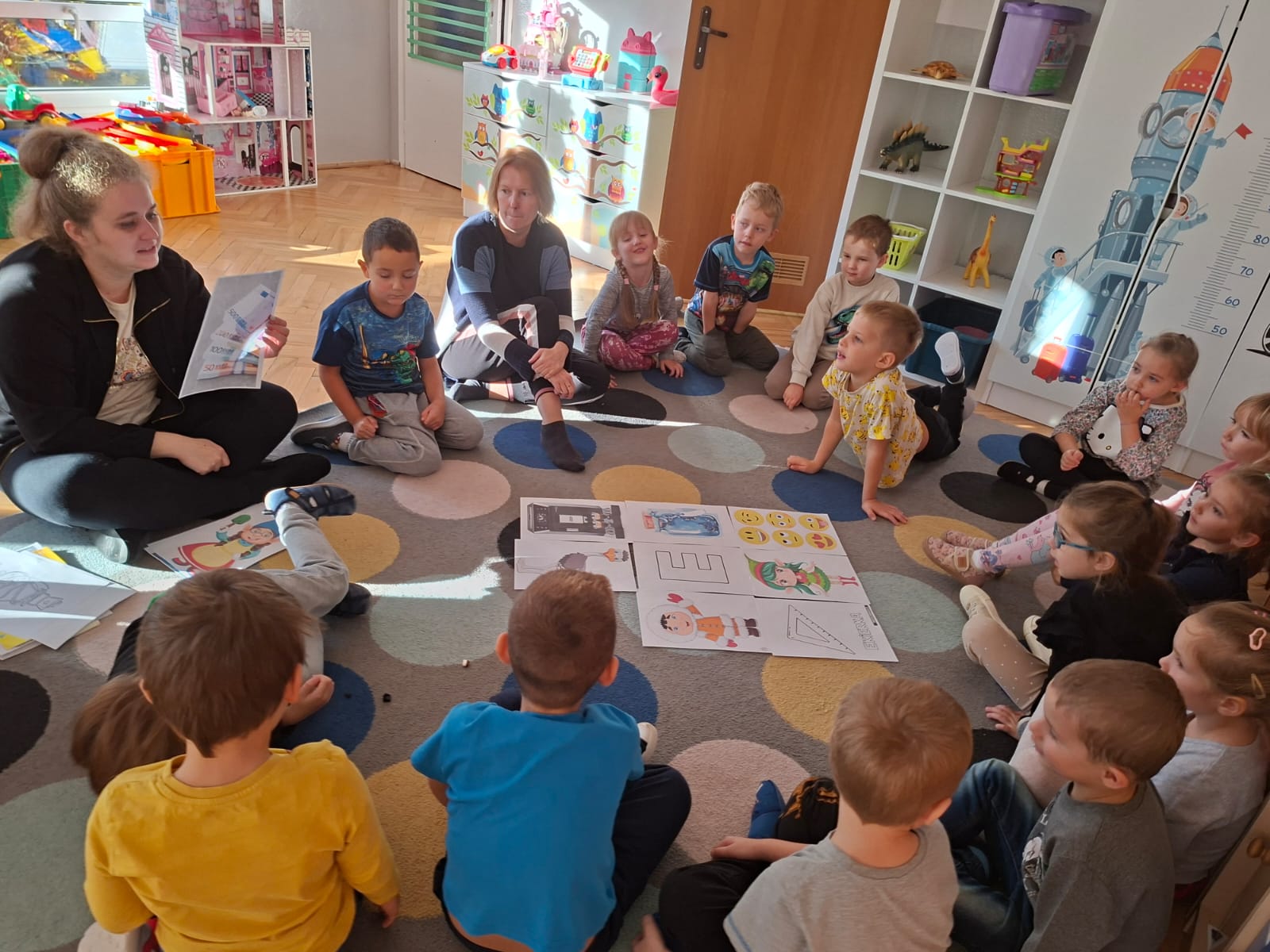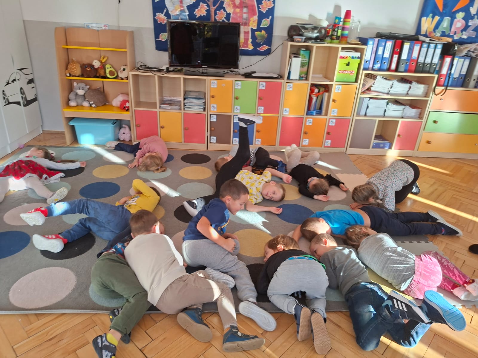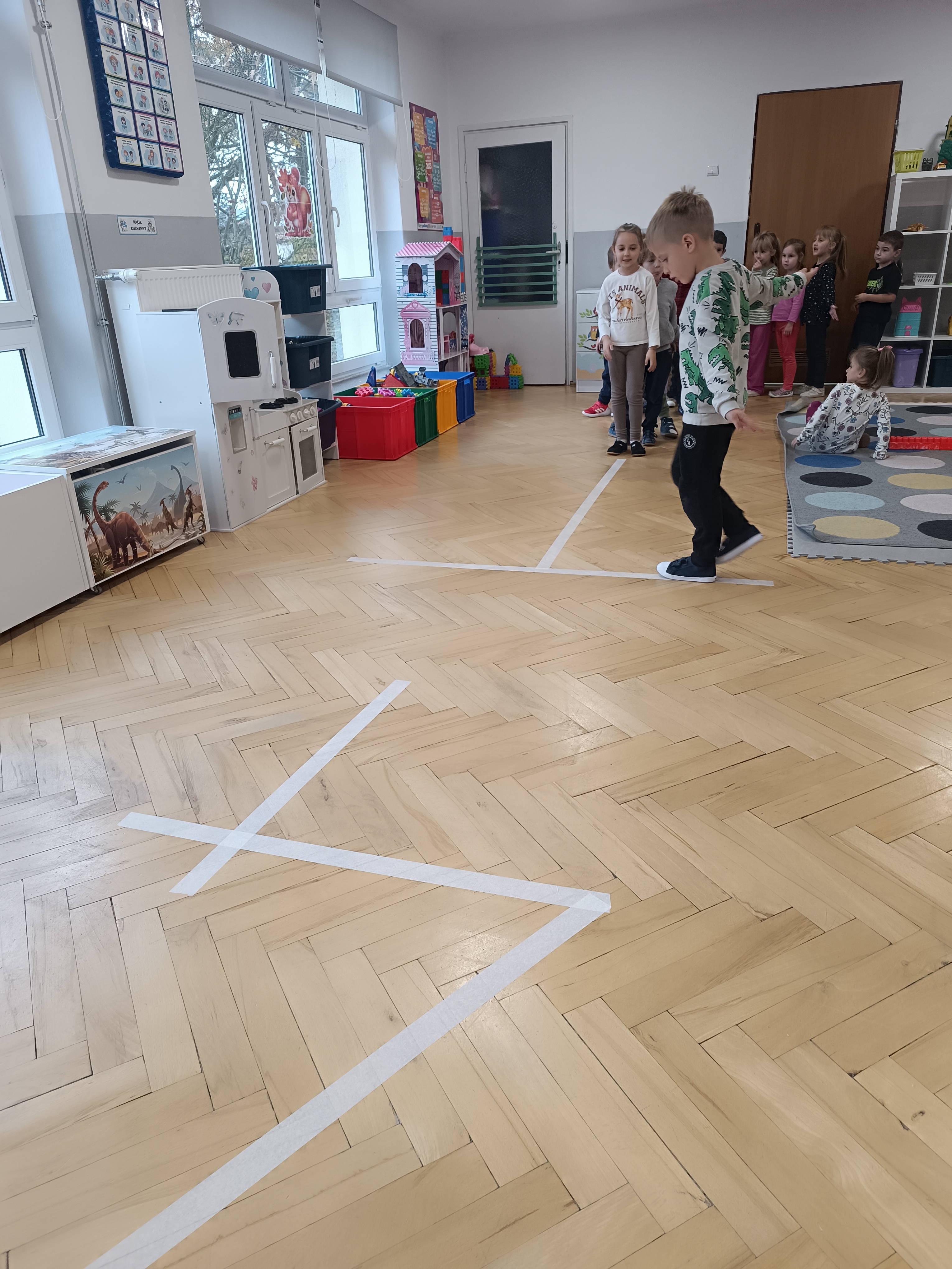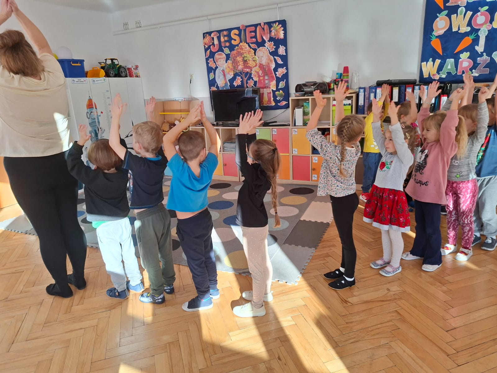 Smerfy brały udział w zabawie matematycznej " Ile nóg ma stworek?"; " Czwarty - bum"; " O ile wyższy?" oraz w zabawie ruchowej " E jak elf"; " W czwórce siła" ; " Stworki na pogodę i niepogodę".