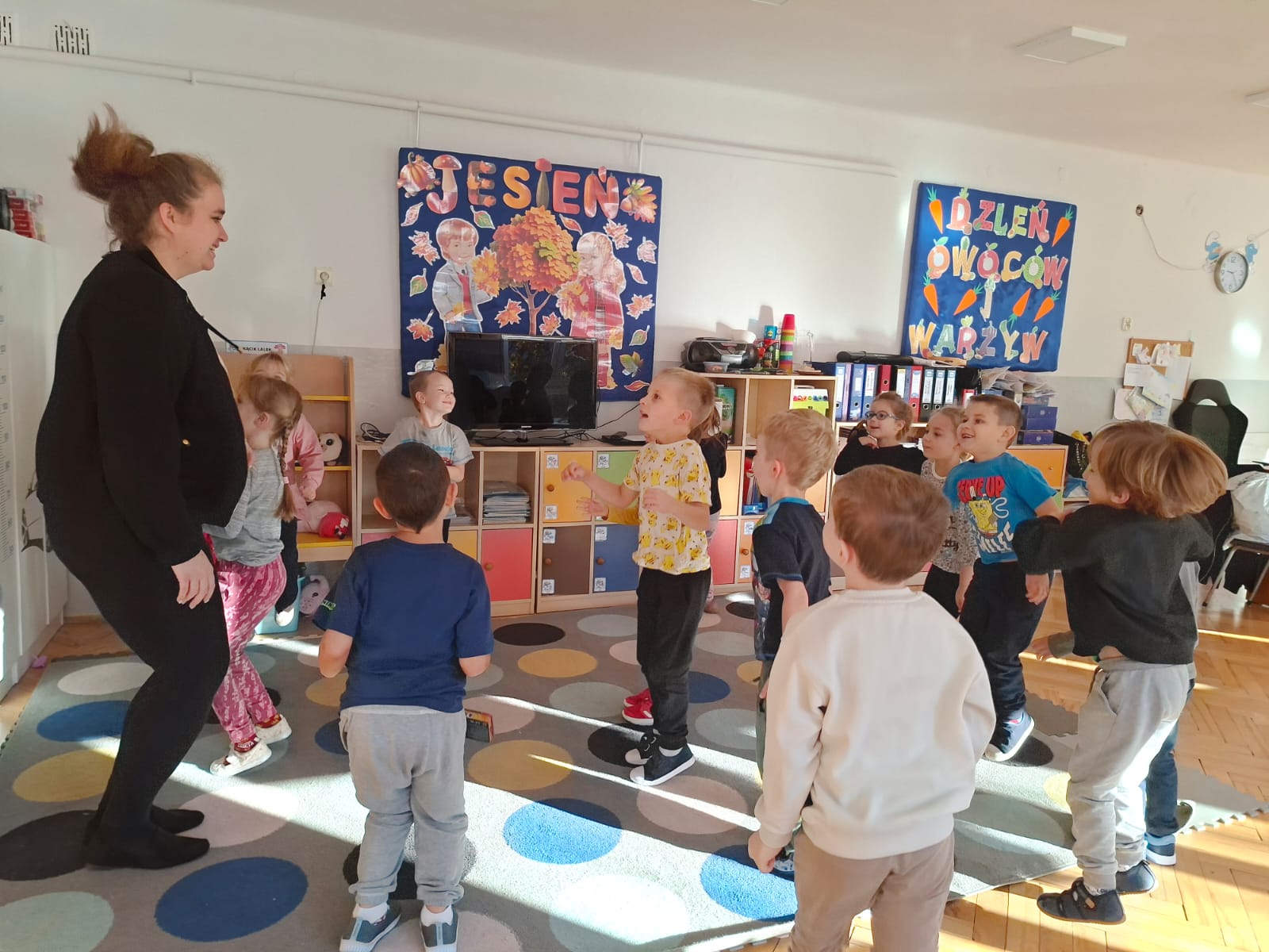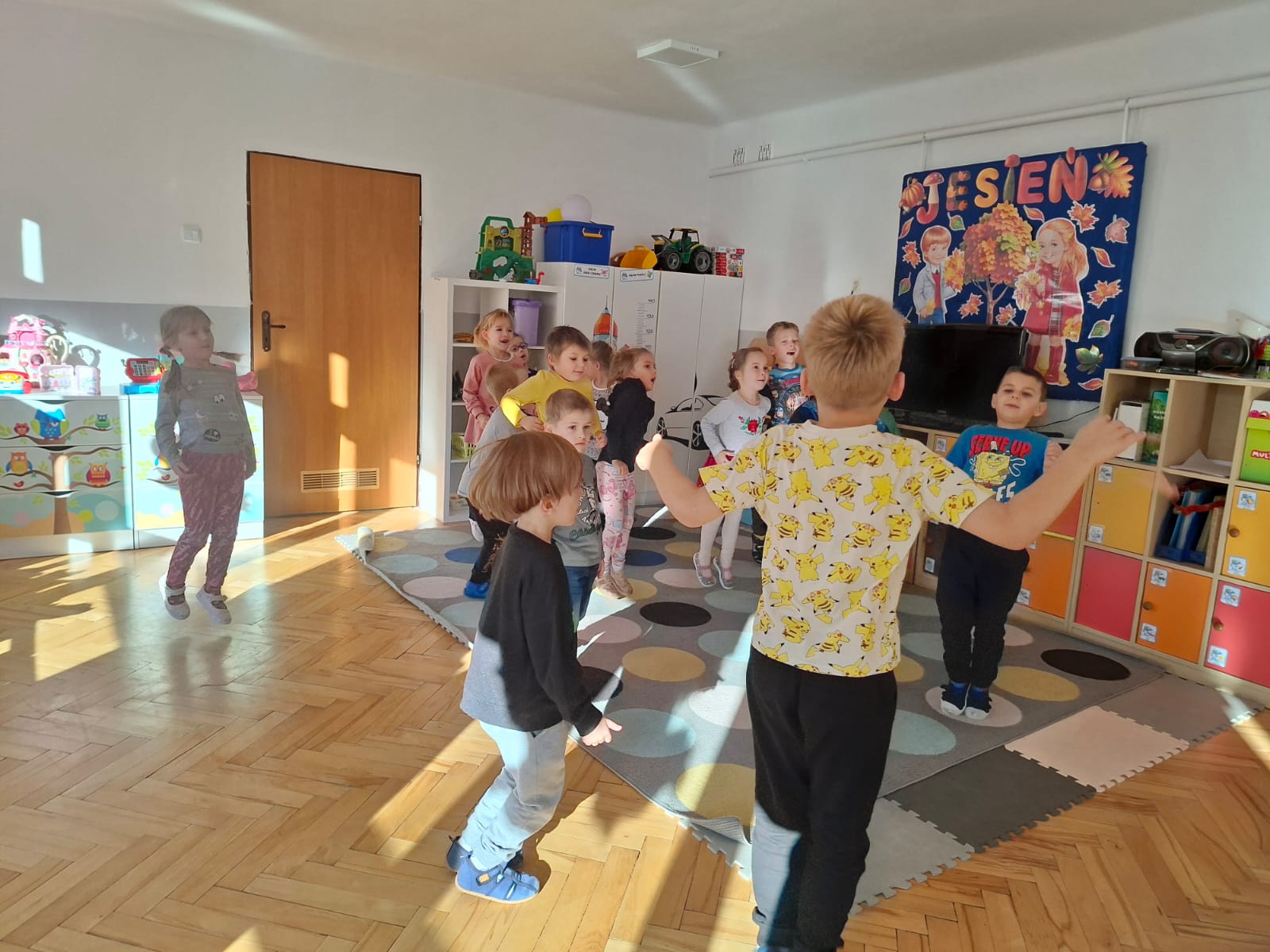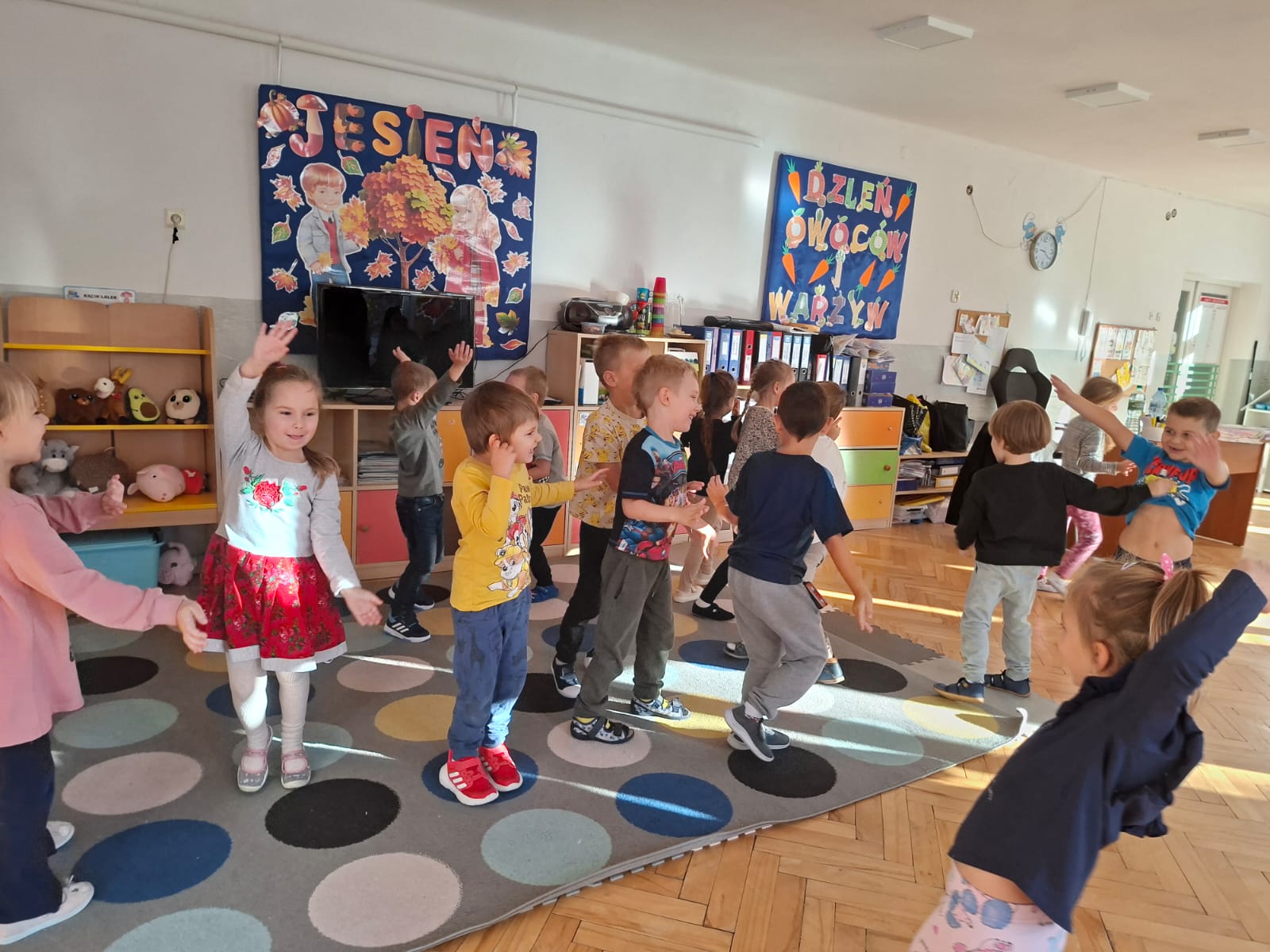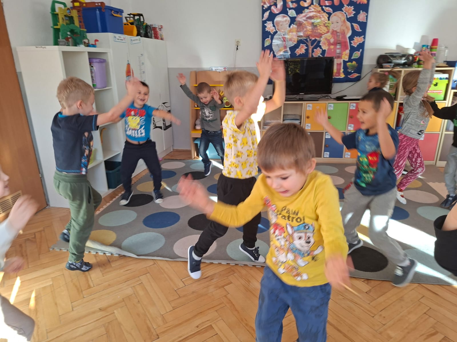 Smerfy brały udział w zabawie matematycznej " Ile nóg ma stworek?"; " Czwarty - bum"; " O ile wyższy?" oraz w zabawie ruchowej " E jak elf"; " W czwórce siła" ; " Stworki na pogodę i niepogodę".