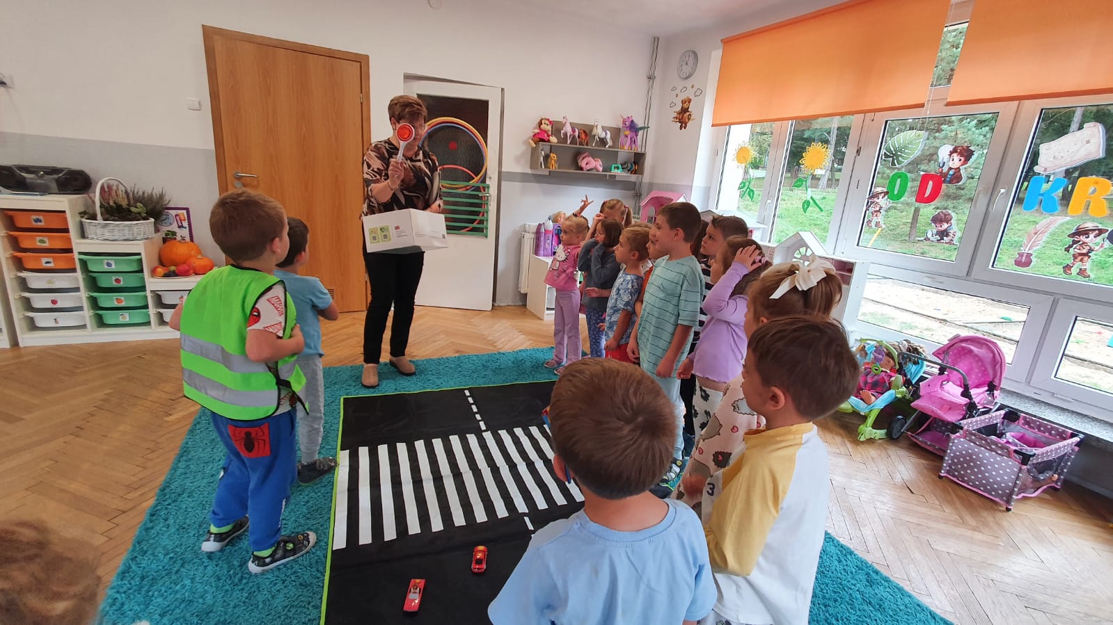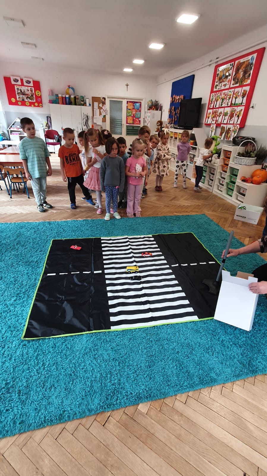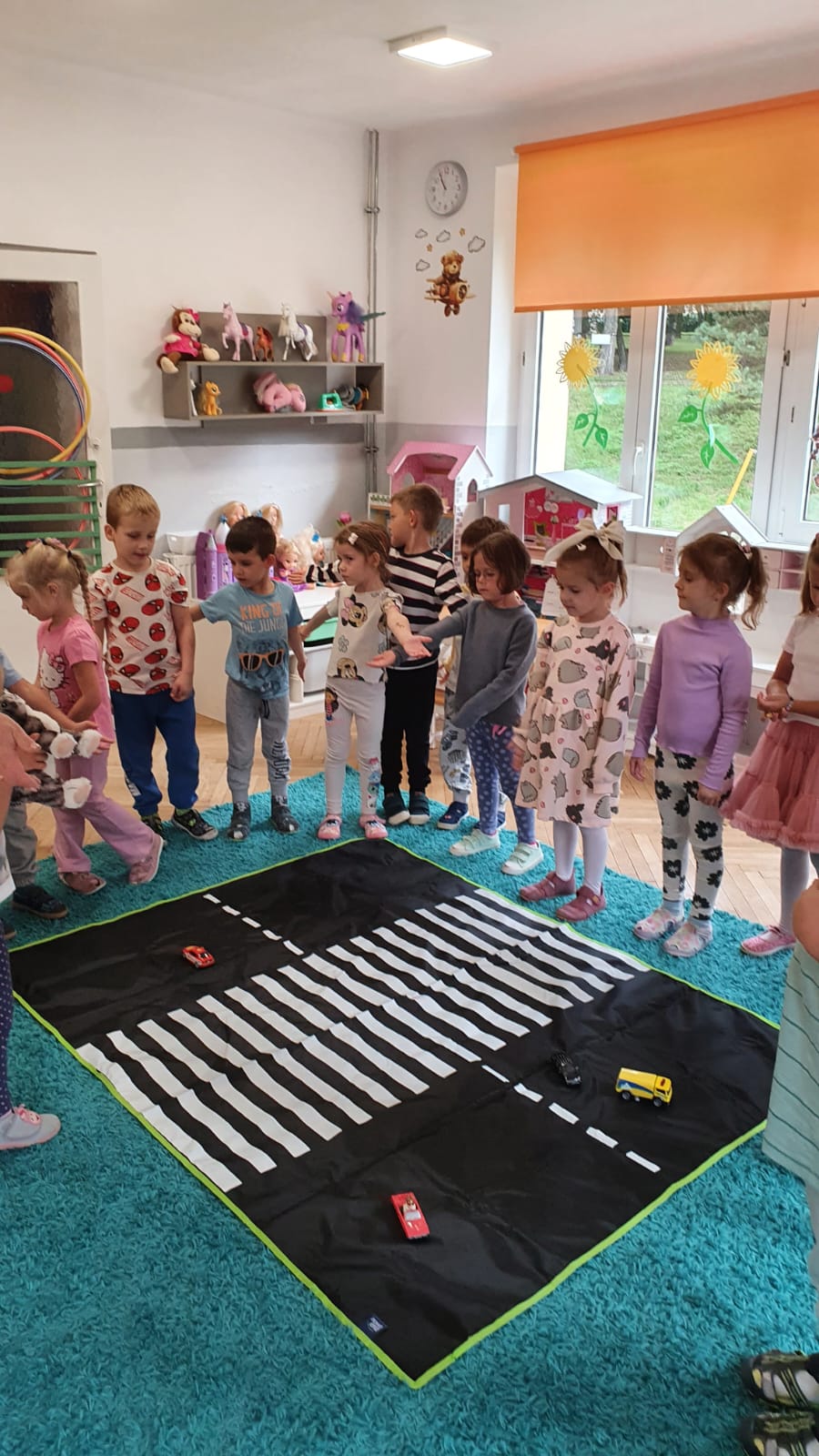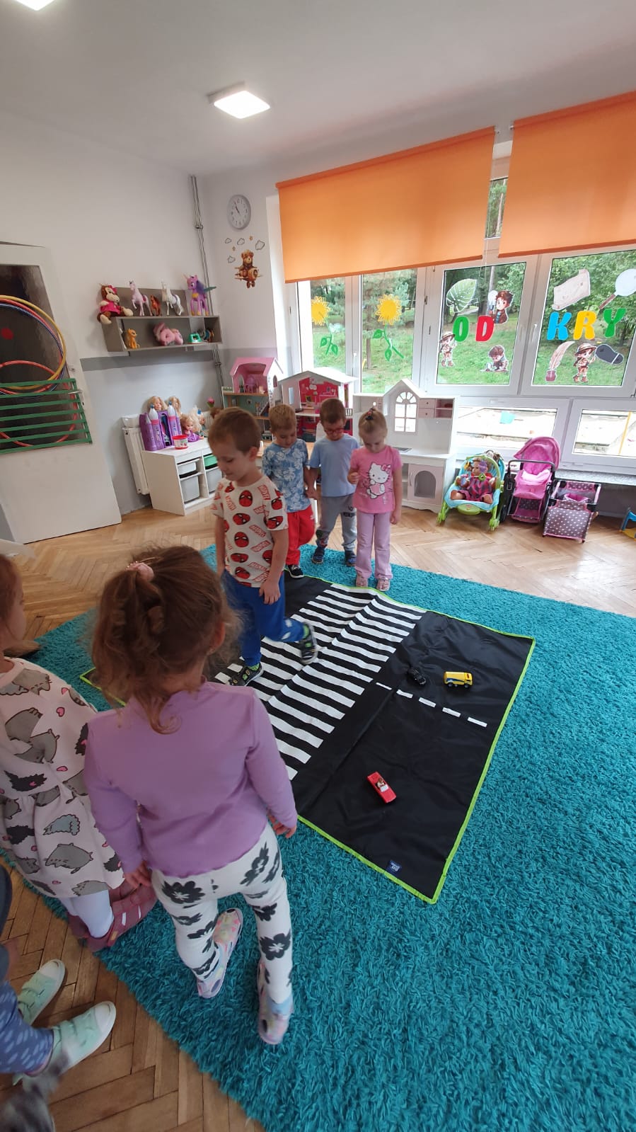 Bardzo chłodny dzień nie pozwolił nam na realizację zajęć w terenie więc stworzyliśmy w sali warunki w których mogliśmy utrwalić wiedzę i zdobyć nowe wiadomości na temat bezpieczeństwa podczas spaceru.Poprzez zabawę ,symulowanie ruchu drogowego dzieciaki uczyły sie przechodzic przez jezdnię, ropoznawać ważne dla nich znaki drogowe.Pamiętamy o kamizelkach odblaskowych,zastosowaniu różnirodnych odblasków podczas wieczornych spacerków.Zabawy z piosenką utrwaliły przedszkolakom numer alarmowy 112. Jak tylko pogoda pozwoli wybierzemy się na spacer by sprawdzić naszą wiedzę na prawdziwym przejściu dla pieszych.