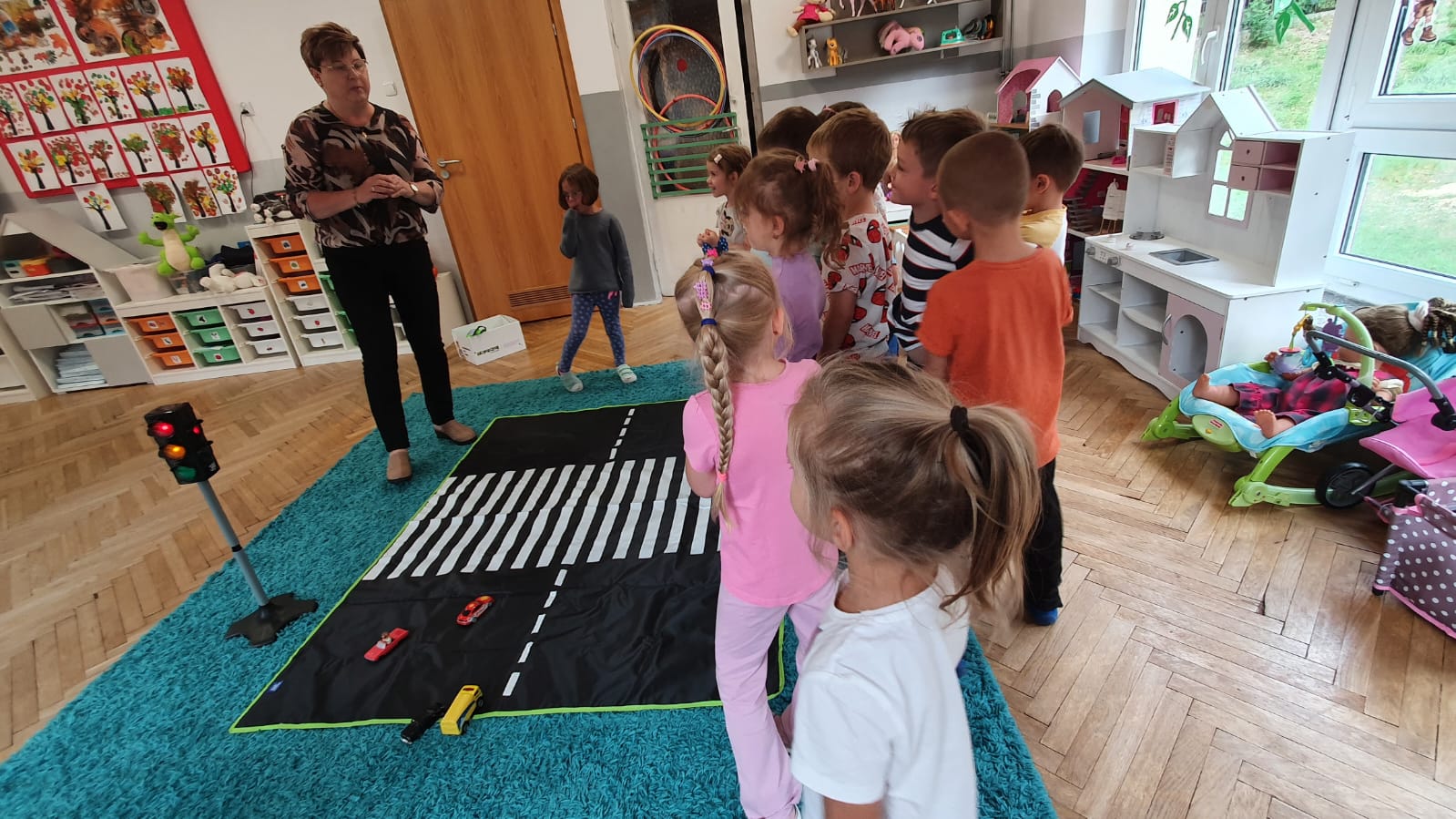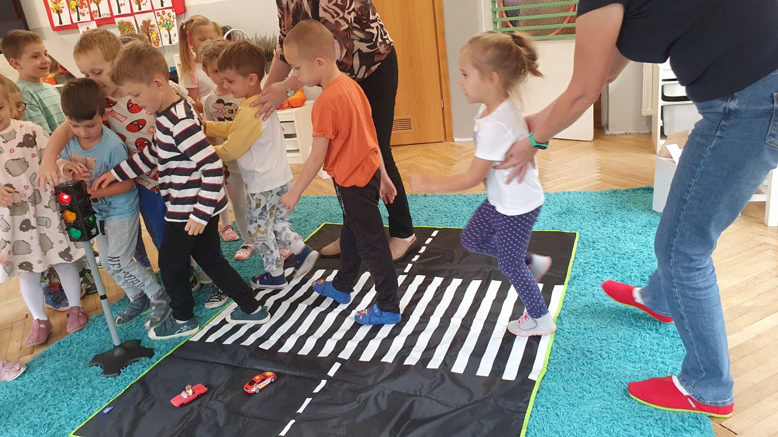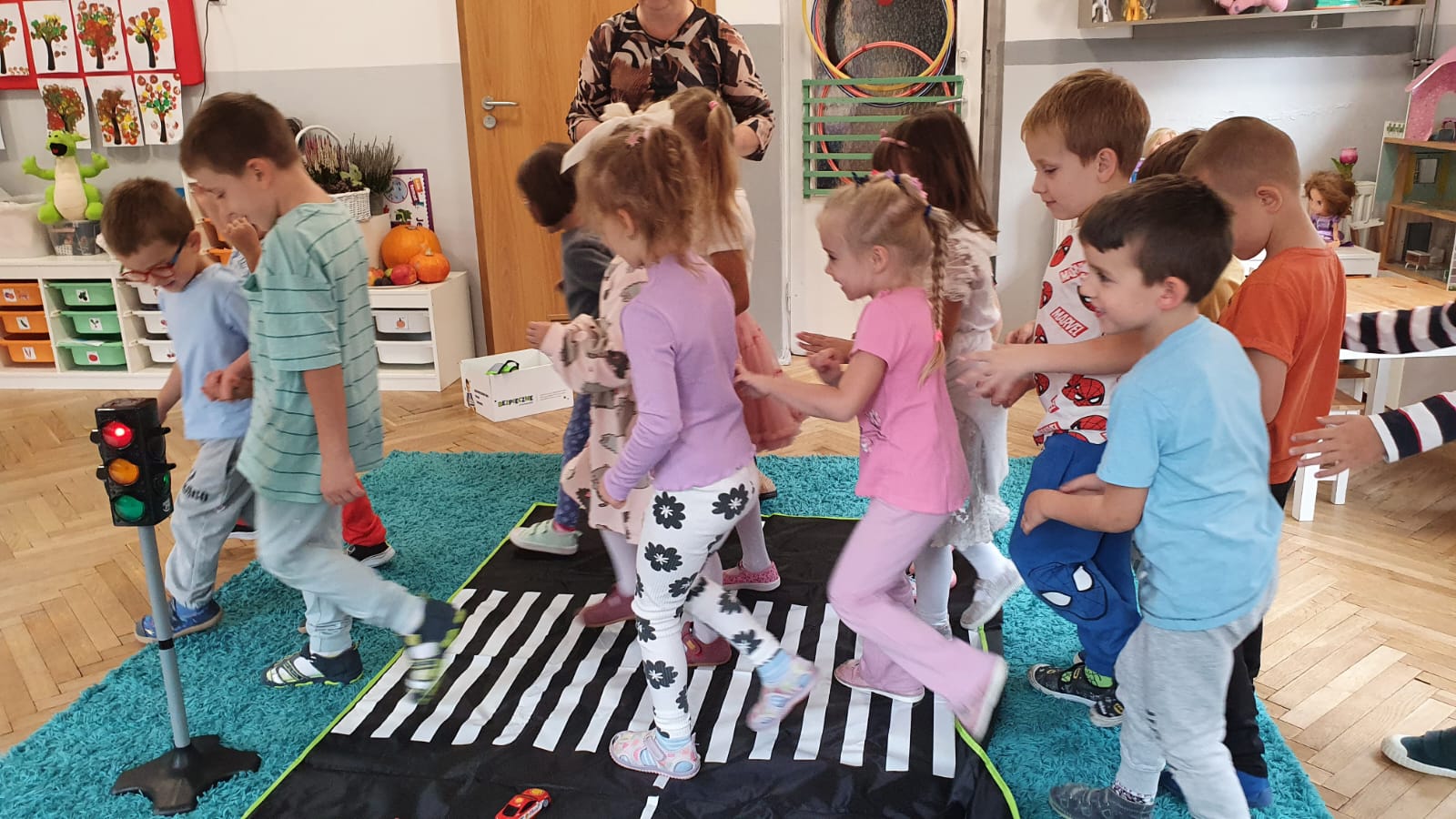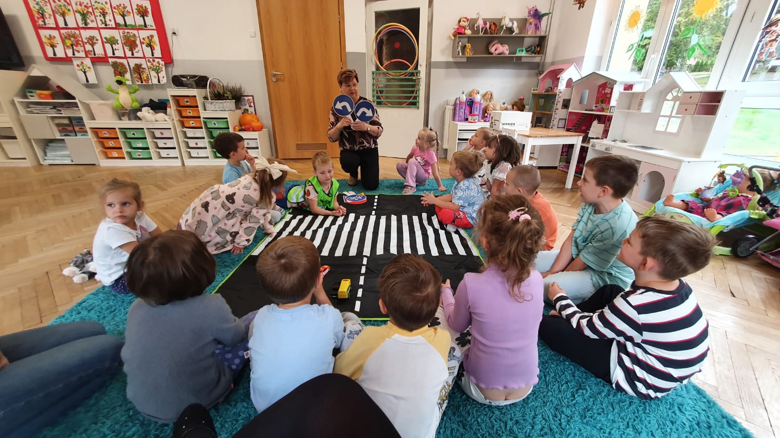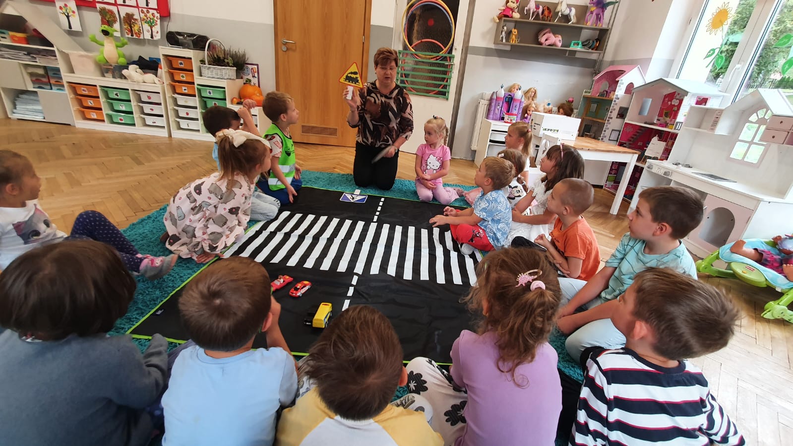 Bardzo chłodny dzień nie pozwolił nam na realizację zajęć w terenie więc stworzyliśmy w sali warunki w których mogliśmy utrwalić wiedzę i zdobyć nowe wiadomości na temat bezpieczeństwa podczas spaceru.Poprzez zabawę ,symulowanie ruchu drogowego dzieciaki uczyły sie przechodzic przez jezdnię, ropoznawać ważne dla nich znaki drogowe.Pamiętamy o kamizelkach odblaskowych,zastosowaniu różnirodnych odblasków podczas wieczornych spacerków.Zabawy z piosenką utrwaliły przedszkolakom numer alarmowy 112. Jak tylko pogoda pozwoli wybierzemy się na spacer by sprawdzić naszą wiedzę na prawdziwym przejściu dla pieszych.