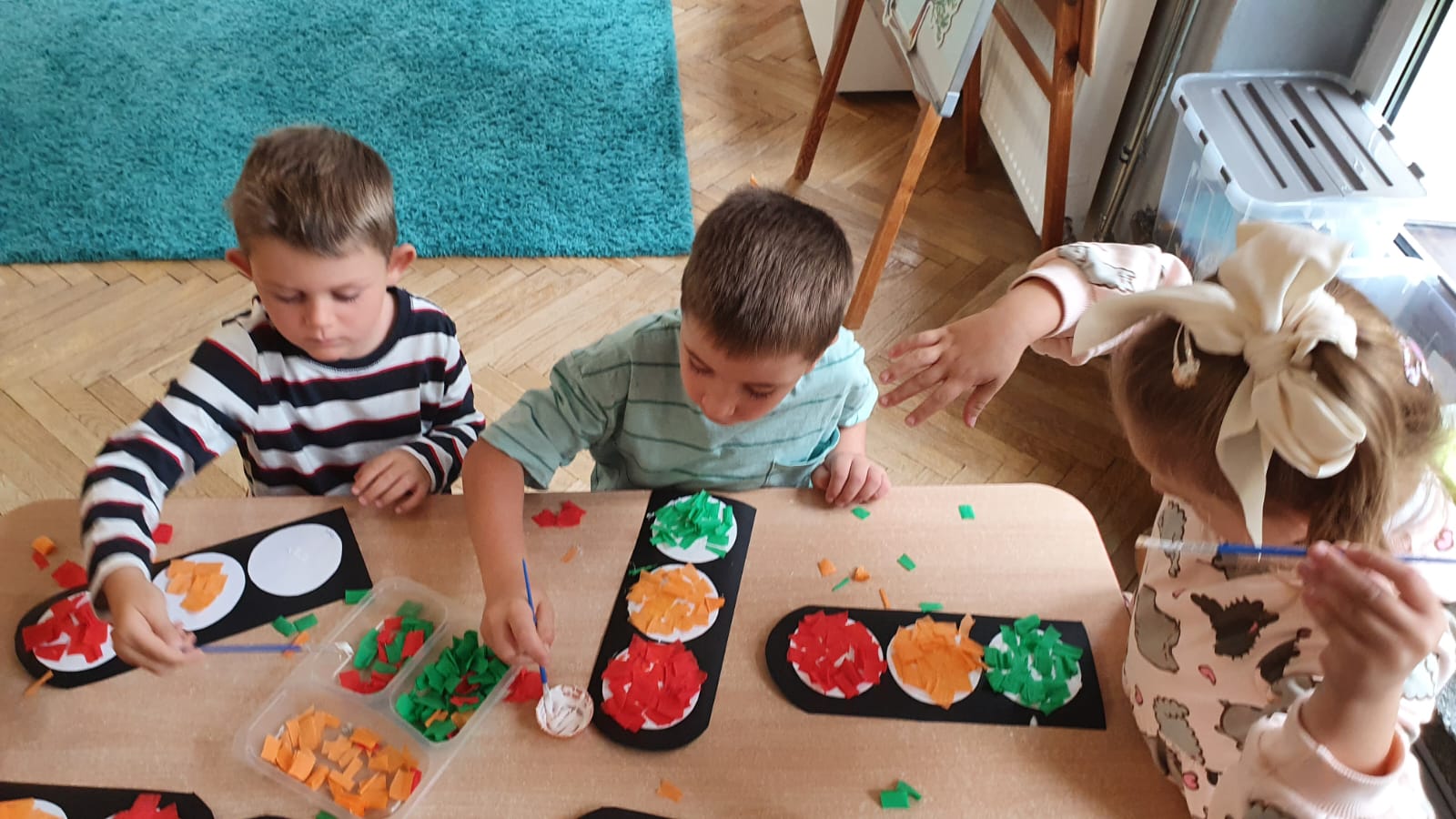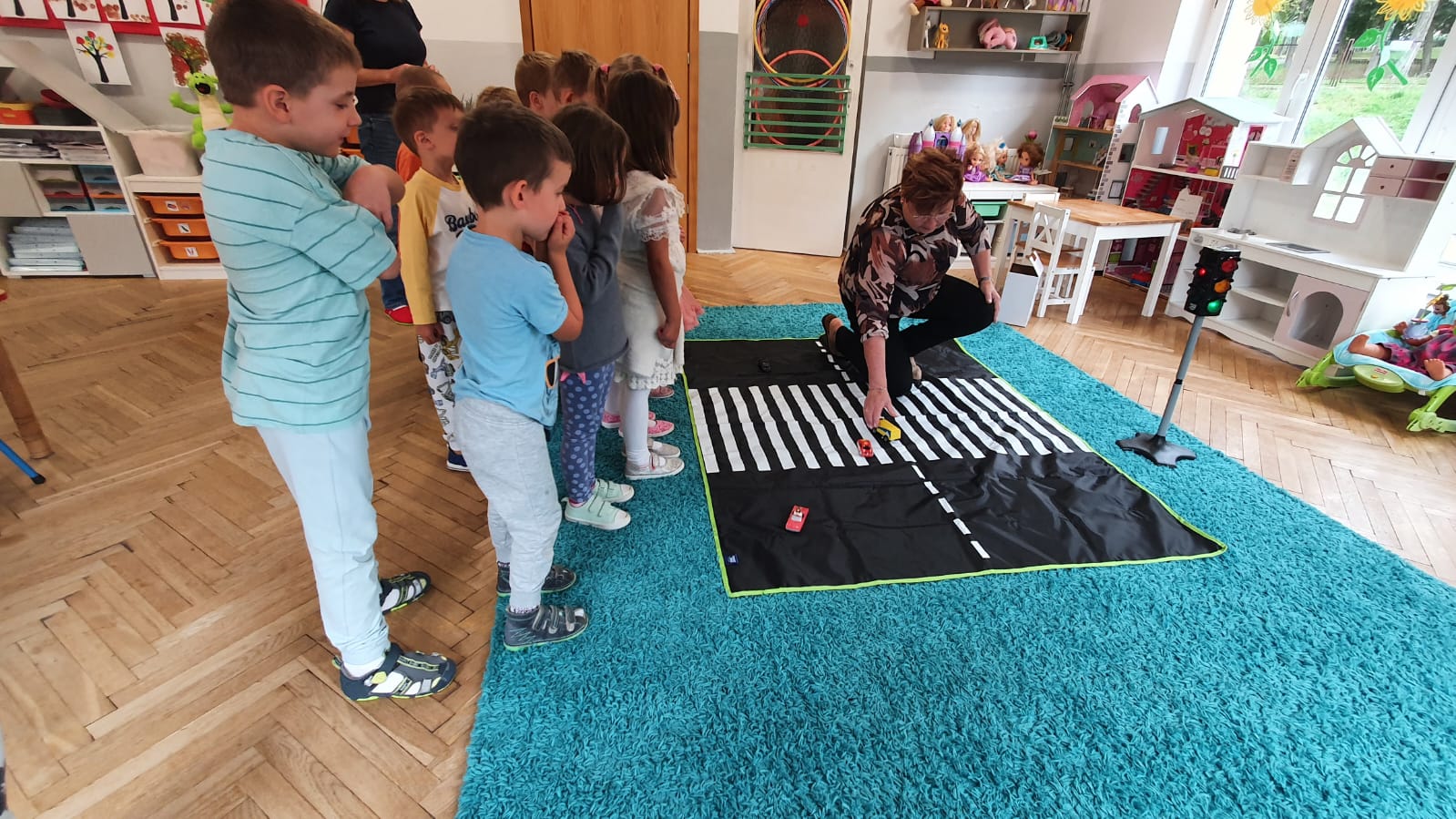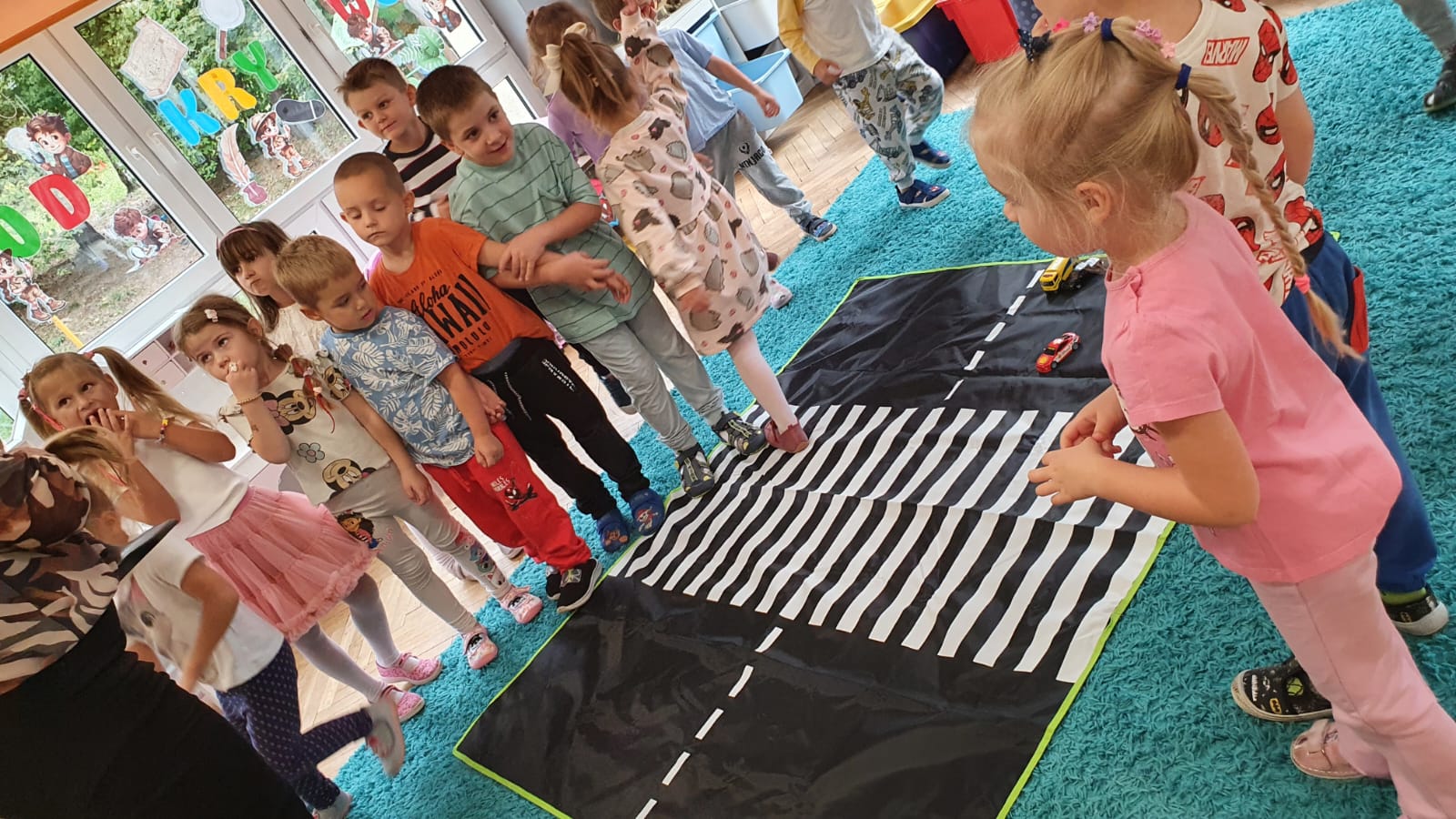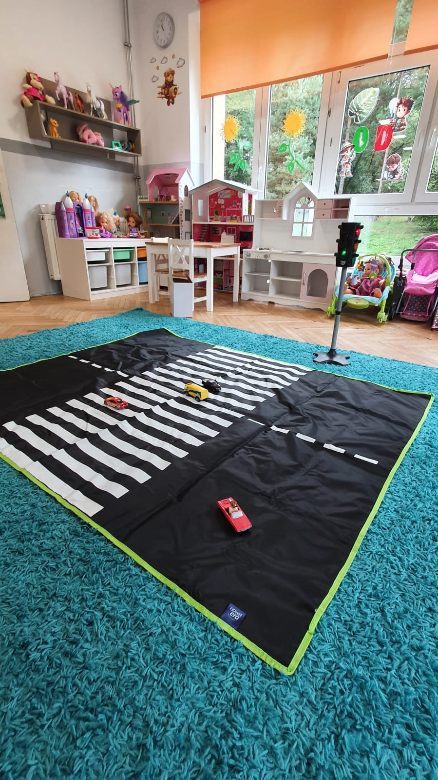 Bardzo chłodny dzień nie pozwolił nam na realizację zajęć w terenie więc stworzyliśmy w sali warunki w których mogliśmy utrwalić wiedzę i zdobyć nowe wiadomości na temat bezpieczeństwa podczas spaceru.Poprzez zabawę ,symulowanie ruchu drogowego dzieciaki uczyły sie przechodzic przez jezdnię, ropoznawać ważne dla nich znaki drogowe.Pamiętamy o kamizelkach odblaskowych,zastosowaniu różnirodnych odblasków podczas wieczornych spacerków.Zabawy z piosenką utrwaliły przedszkolakom numer alarmowy 112. Jak tylko pogoda pozwoli wybierzemy się na spacer by sprawdzić naszą wiedzę na prawdziwym przejściu dla pieszych.