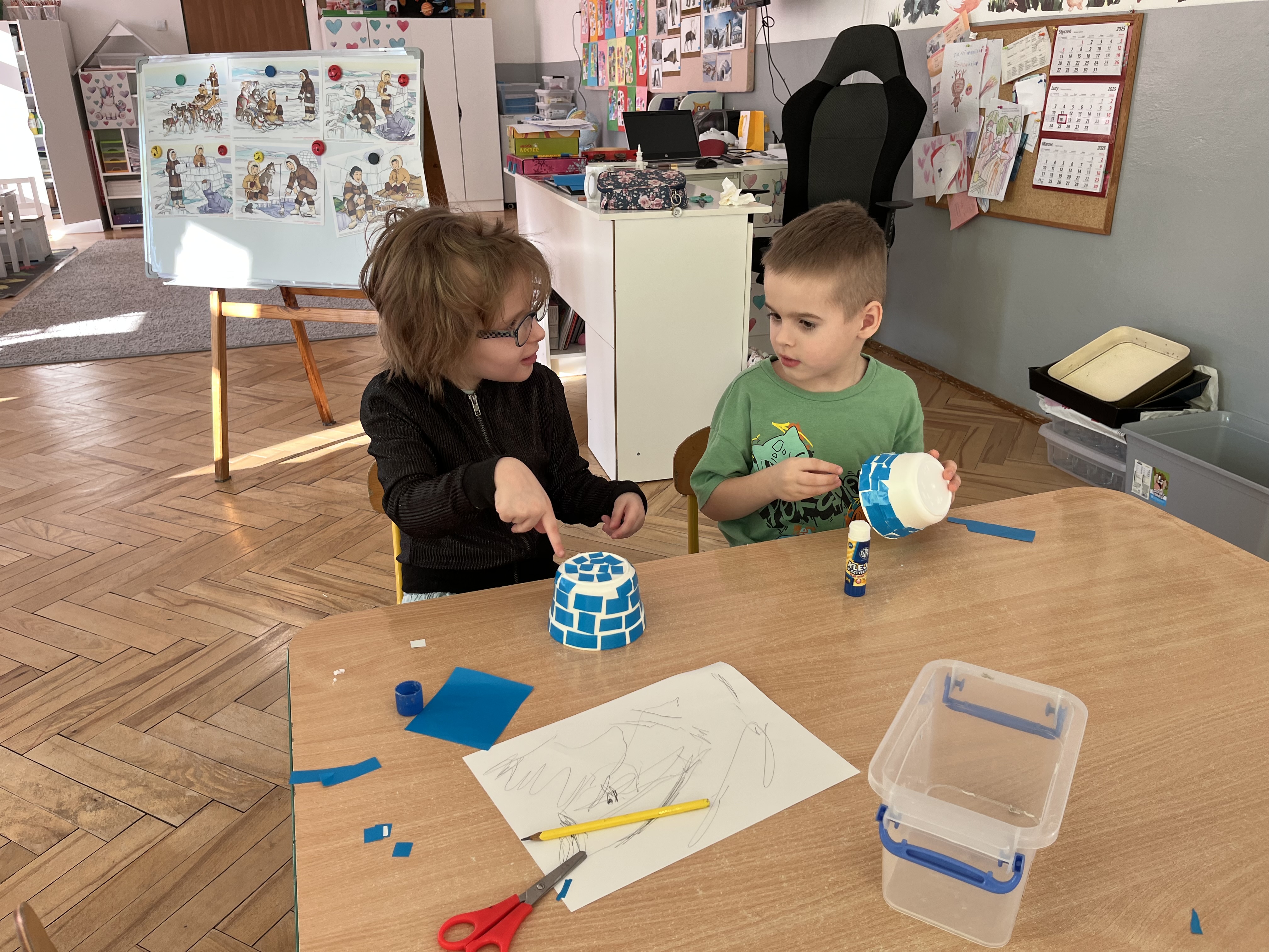 Dzieci poznały również zjawiska atmosferyczne występujące na biegunach – silne wiatry, burze śnieżne oraz długie dni i noce. Dzięki materiałom multimedialnym i zabawom ruchowym mogły lepiej zrozumieć, jak wygląda życie w takich warunkach. Zajęcia plastyczne pozwoliły dzieciom na stworzenie zimowych krajobrazów oraz ilustracji przedstawiających zwierzęta żyjące w ekstremalnych warunkach.