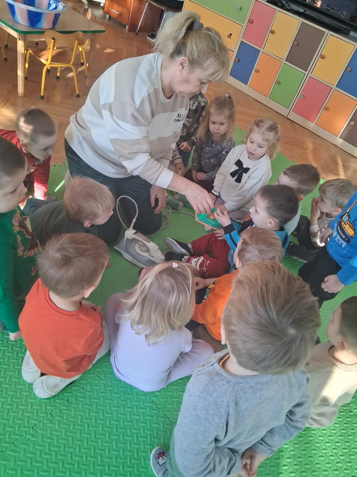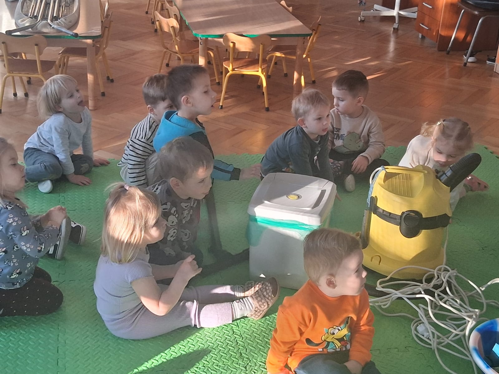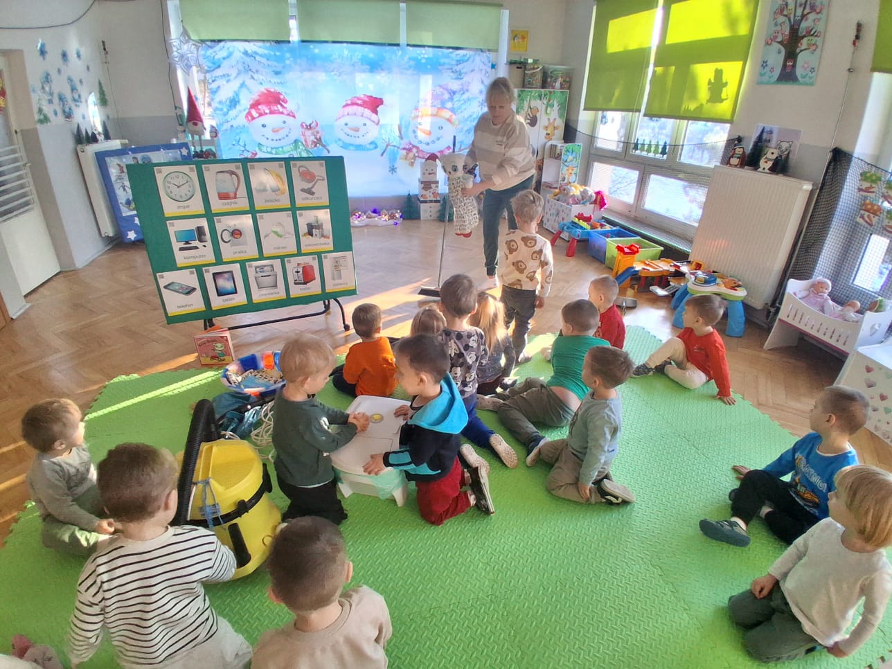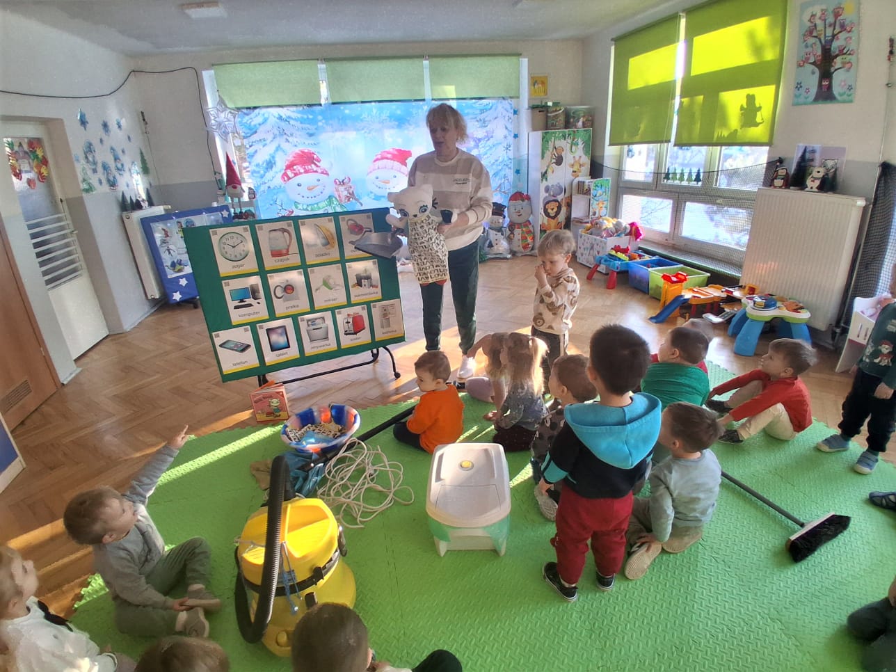 Zaczęliśmy od piosenki „Pstryk- pyk”, zabaw ruchowych „Zabawki na baterie” i „Domowe sprzęty elektryczne”, zagadek „Mam na myśli…”, ćwiczeń ortofonicznych „Urządzenia techniczne” oraz zabawy językowej „Różne sprzęty”.