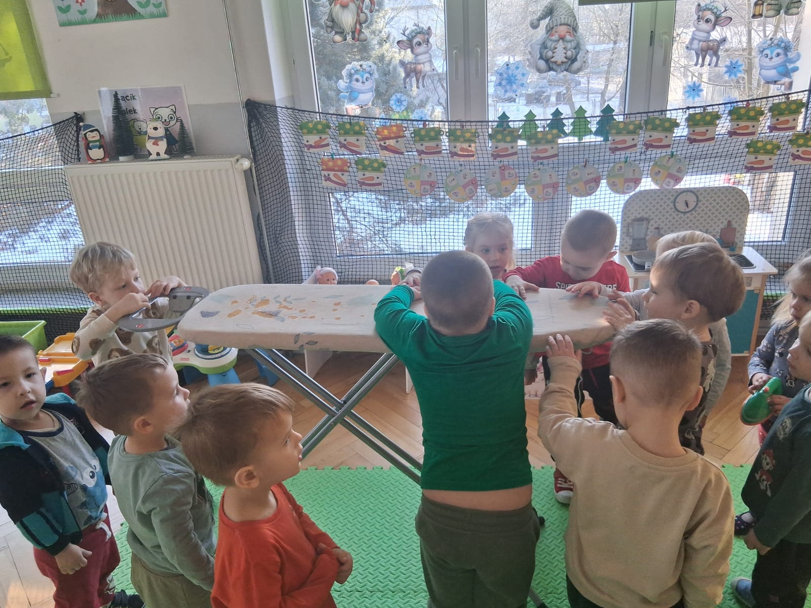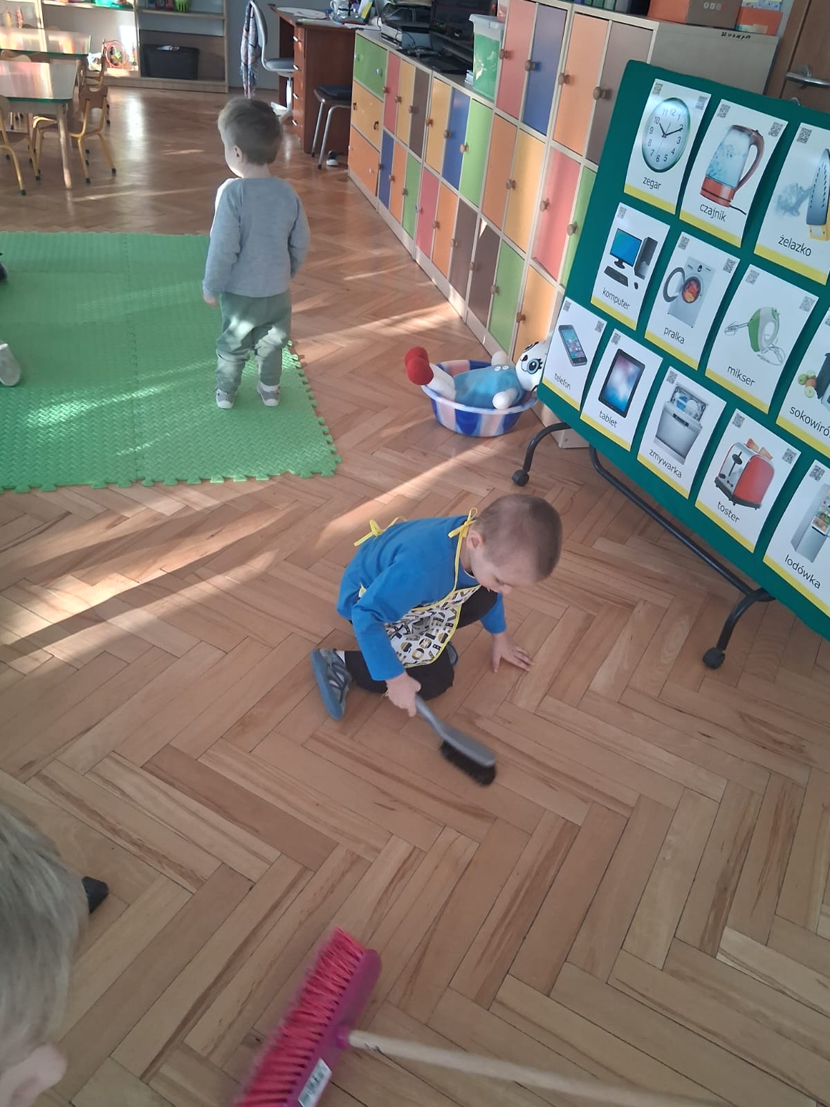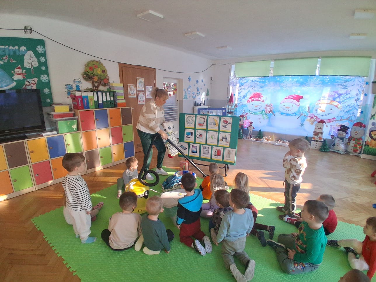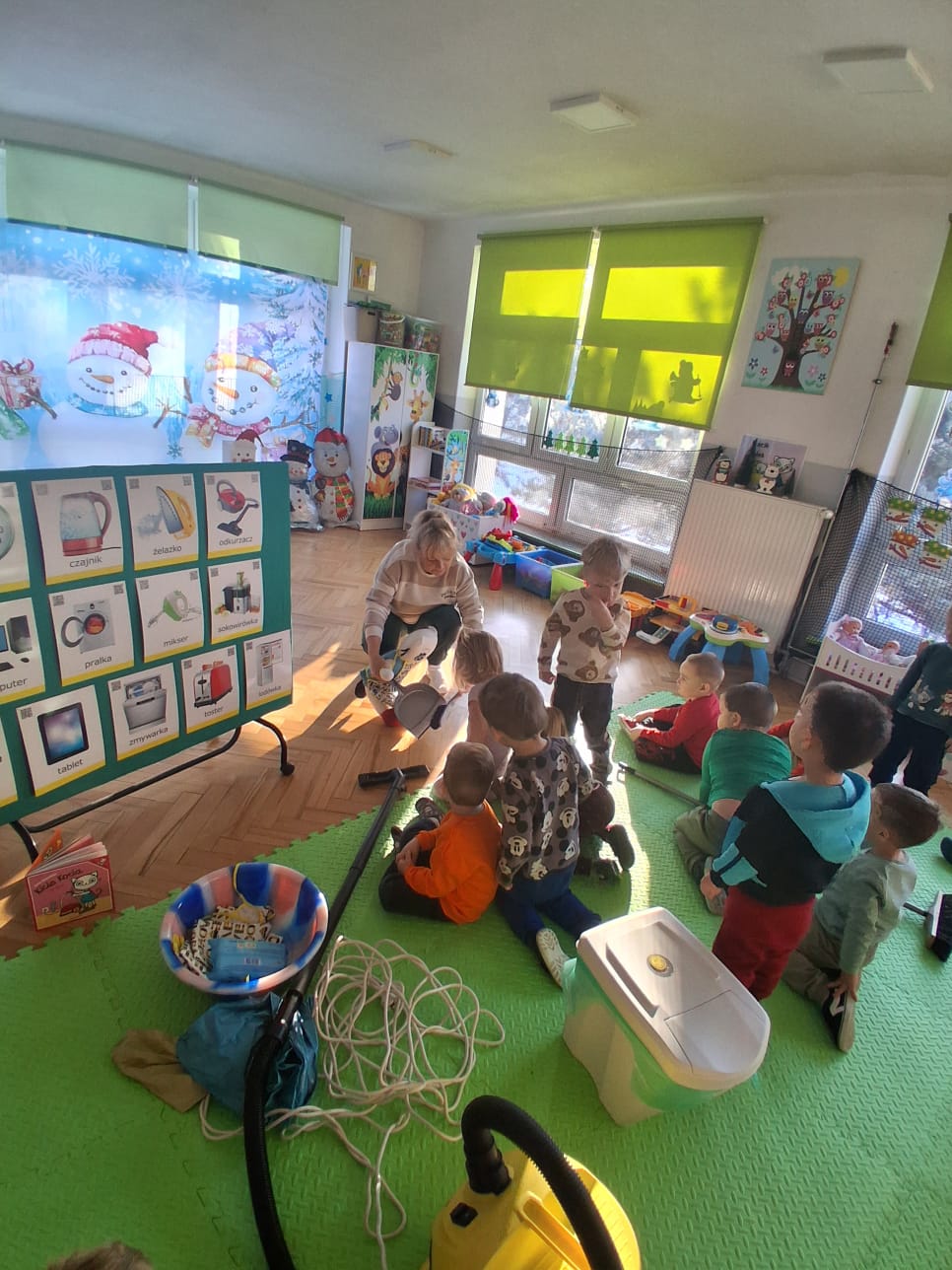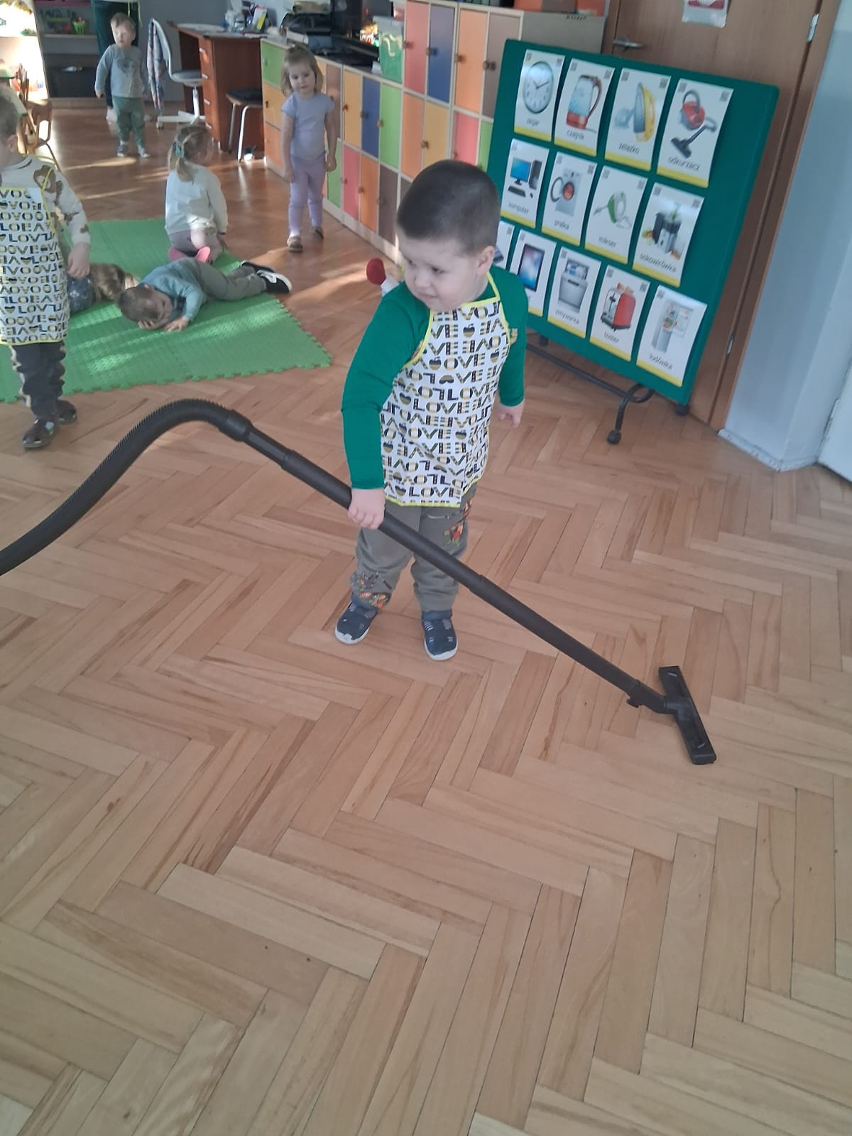 Zaczęliśmy od piosenki „Pstryk- pyk”, zabaw ruchowych „Zabawki na baterie” i „Domowe sprzęty elektryczne”, zagadek „Mam na myśli…”, ćwiczeń ortofonicznych „Urządzenia techniczne” oraz zabawy językowej „Różne sprzęty”.