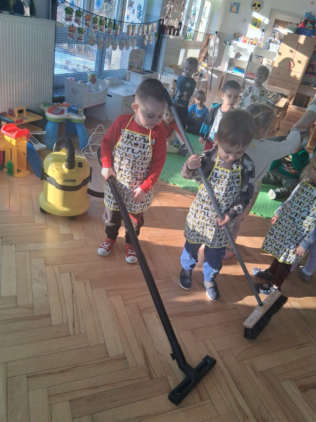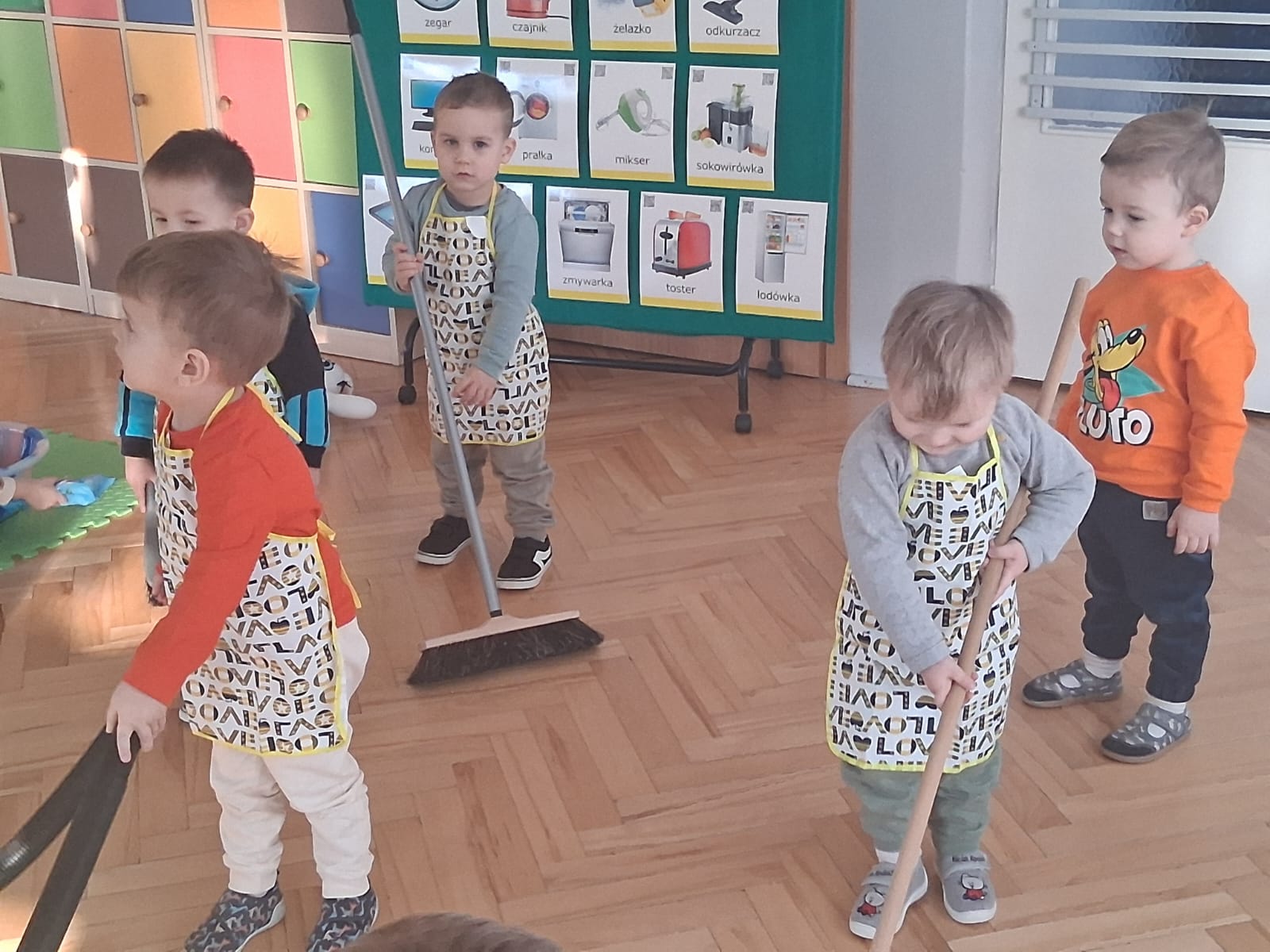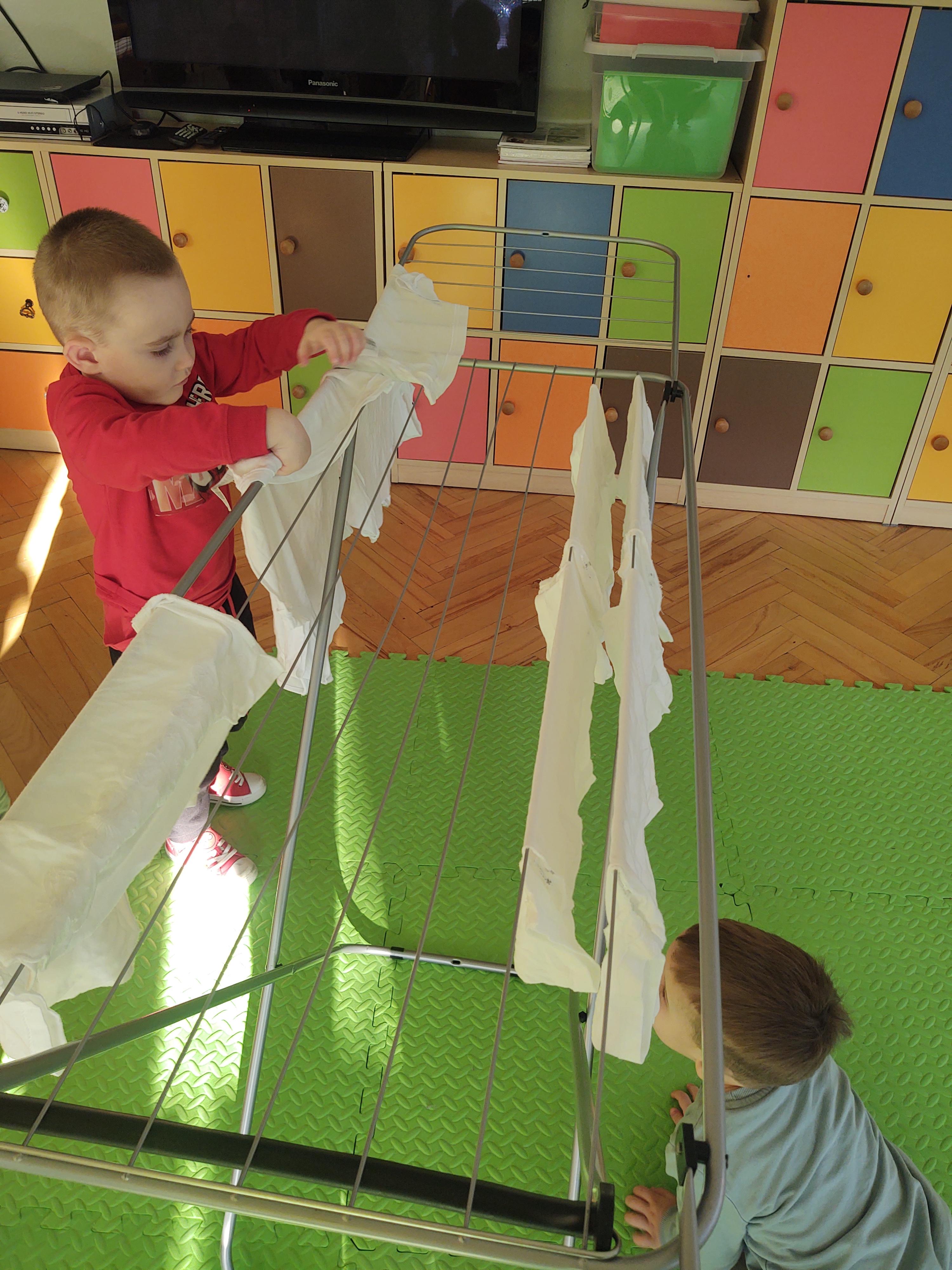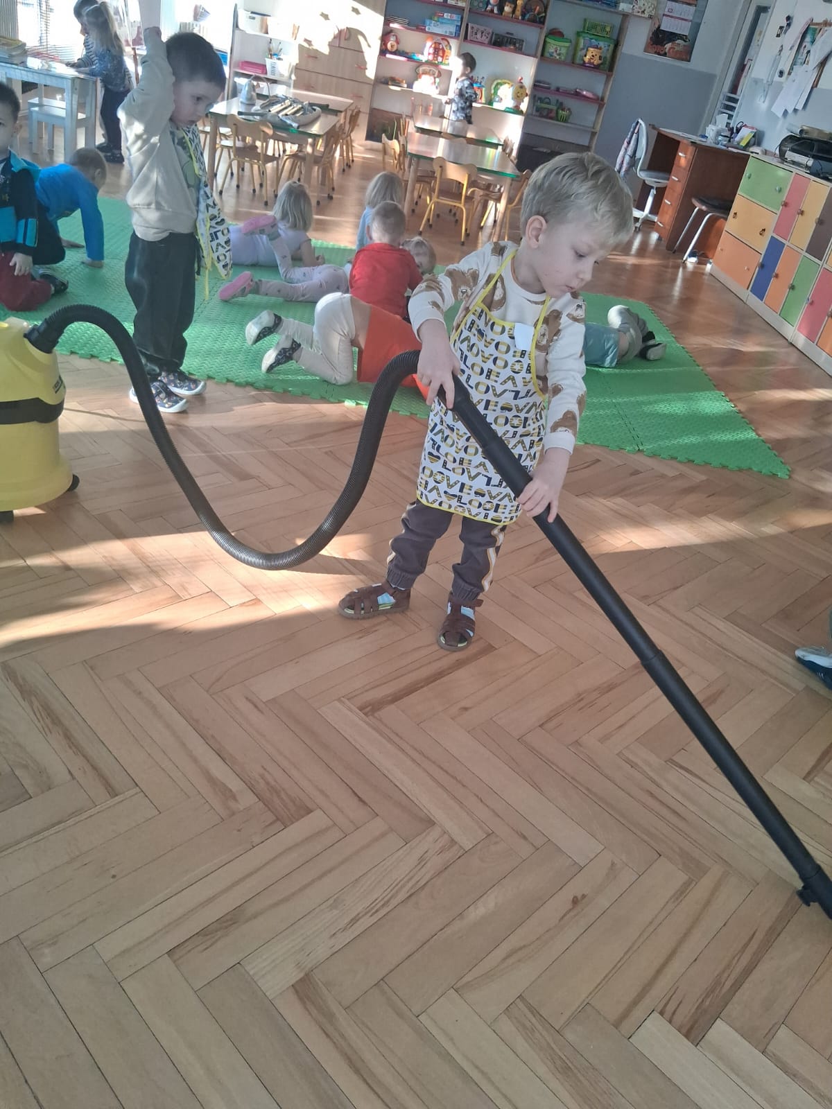 Później rozmawialiśmy na temat różnych robotów ułatwiających codzienne życie (zabawa językowa „Co one robią?”, zabawa ruchowa „Tropimy, poszukujemy”) oraz środków transportu (zabawa ruchowo-słuchowa „Pojazdy”, zabawa tematyczna „O jakim pojeździe mówię?”, praca plastyczno-konstrukcyjna „Mój wymarzony pojazd”).