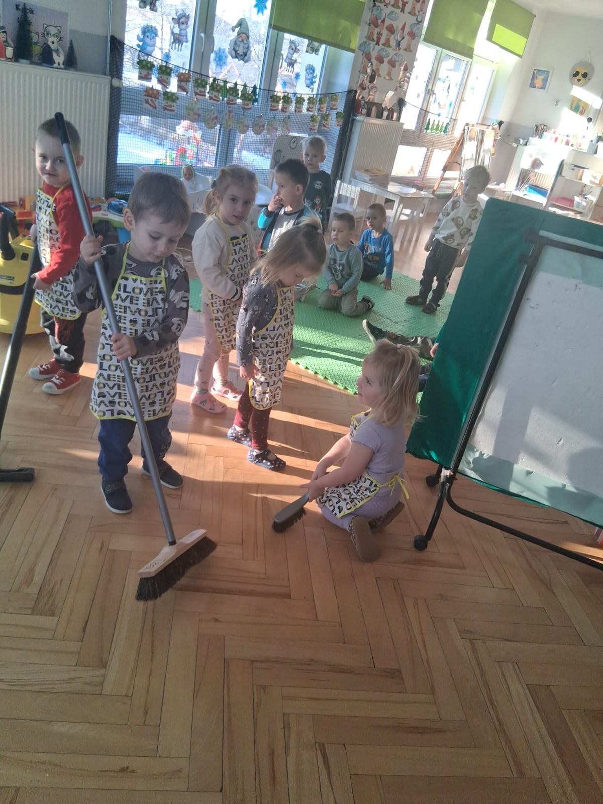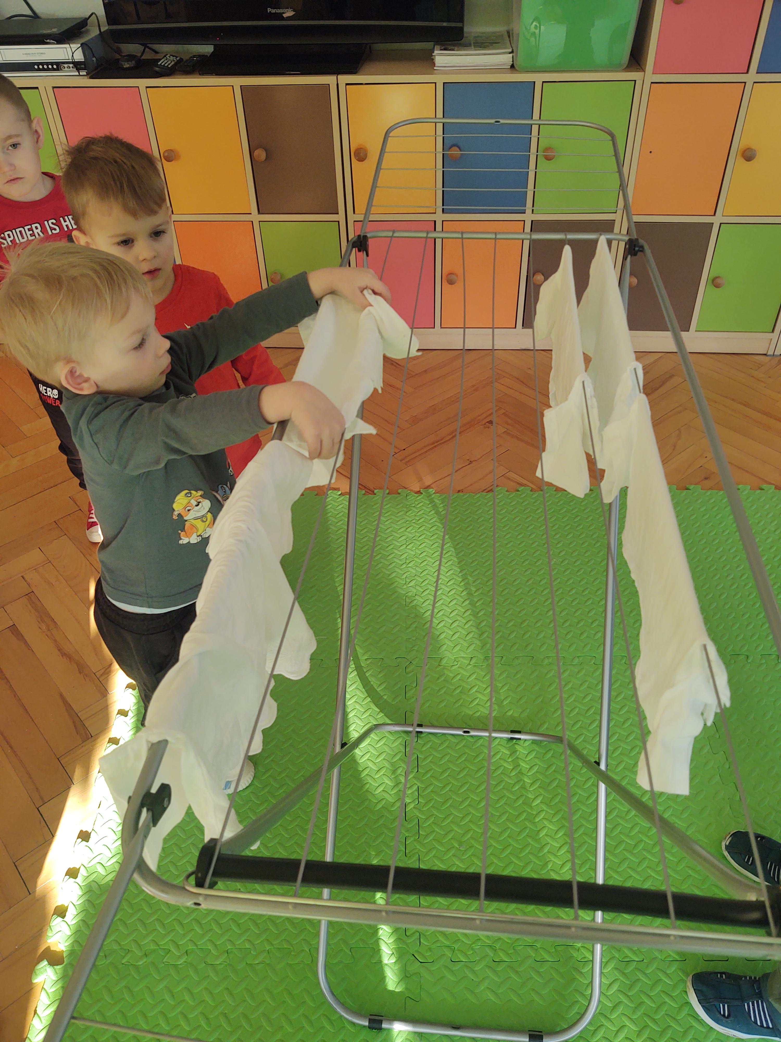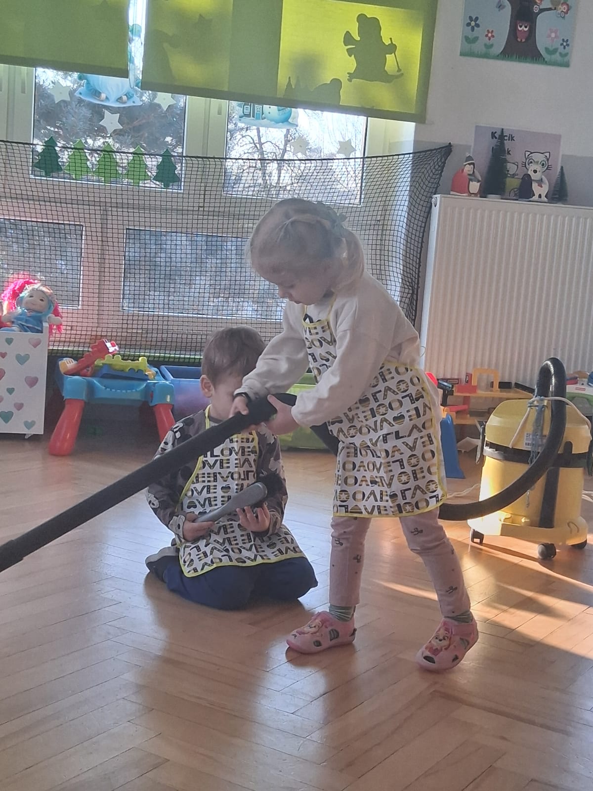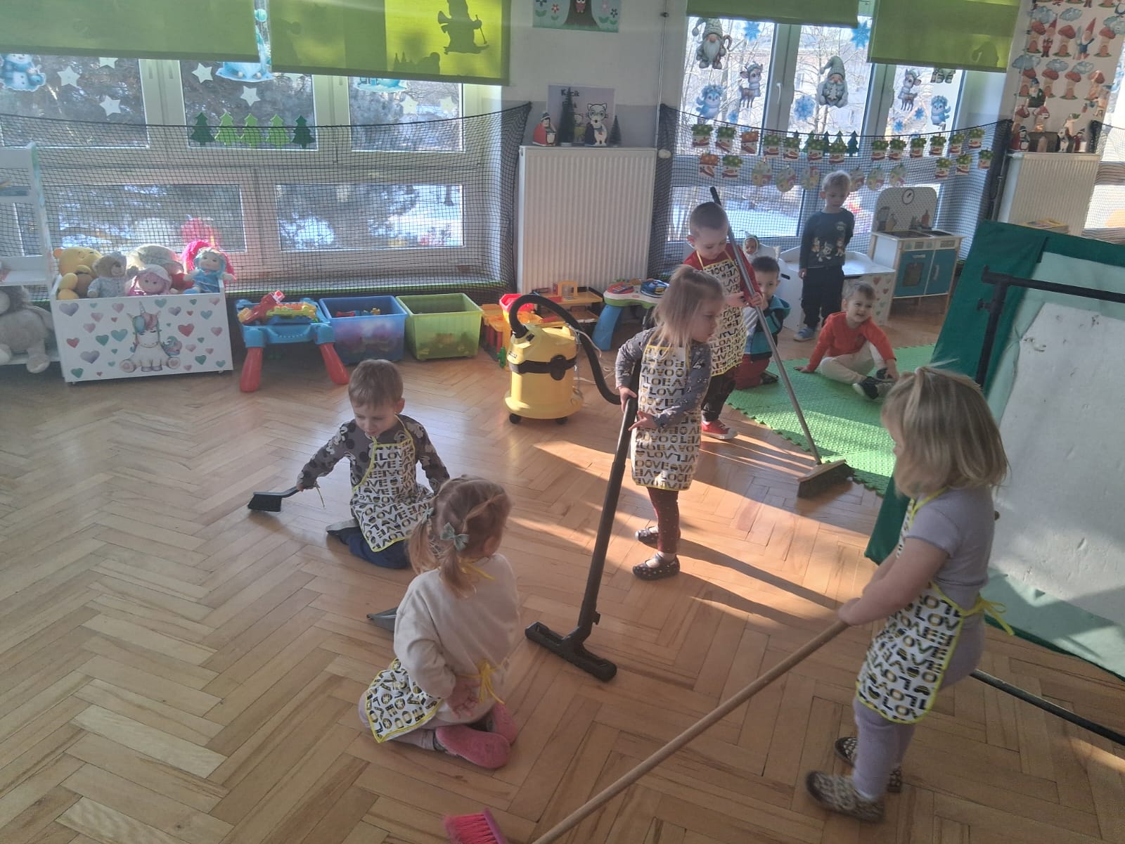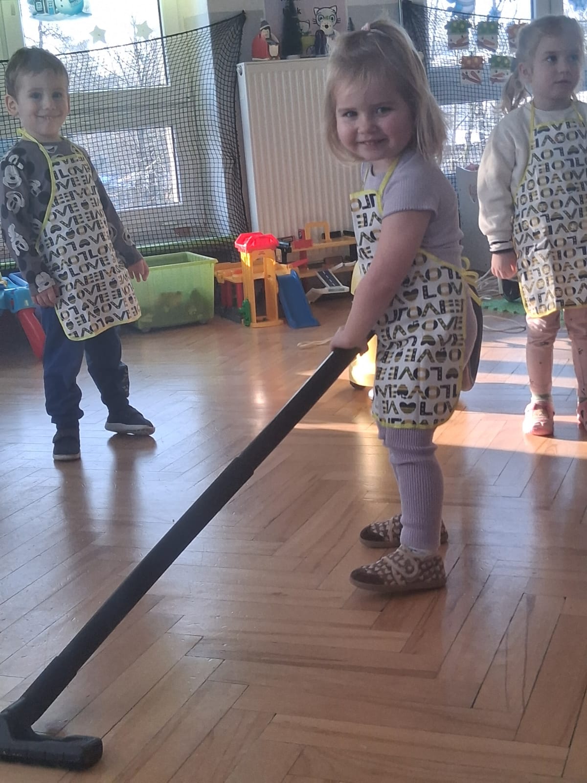 Później rozmawialiśmy na temat różnych robotów ułatwiających codzienne życie (zabawa językowa „Co one robią?”, zabawa ruchowa „Tropimy, poszukujemy”) oraz środków transportu (zabawa ruchowo-słuchowa „Pojazdy”, zabawa tematyczna „O jakim pojeździe mówię?”, praca plastyczno-konstrukcyjna „Mój wymarzony pojazd”).
