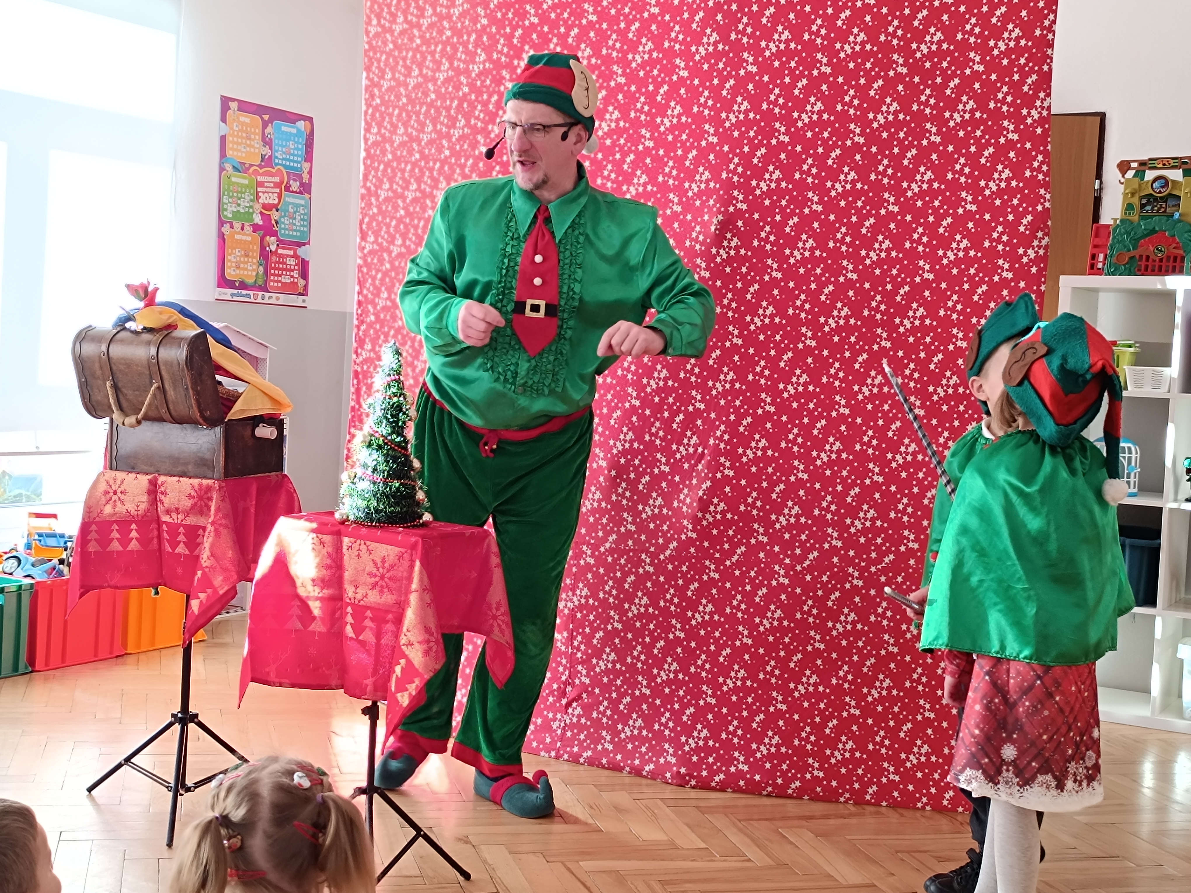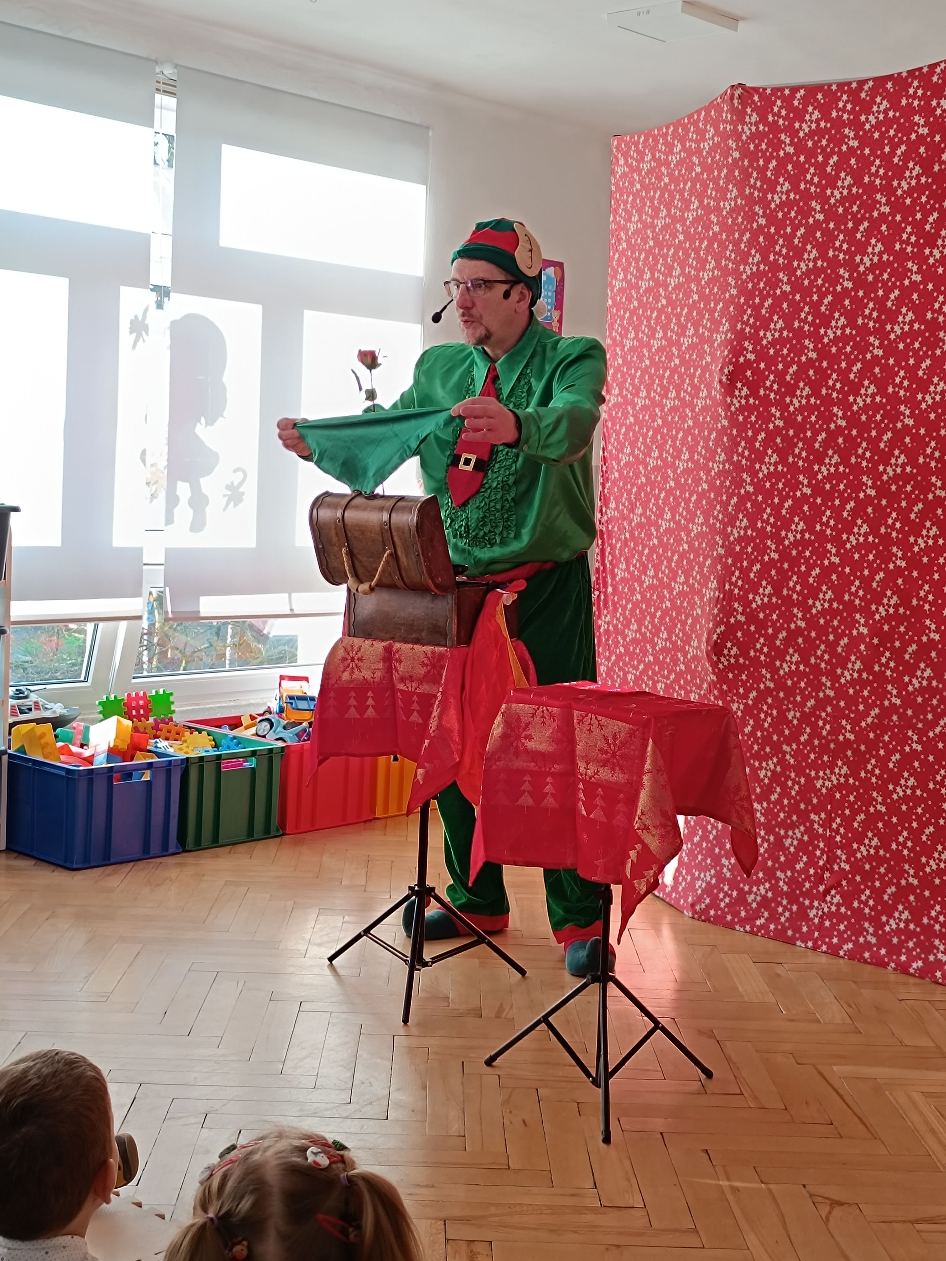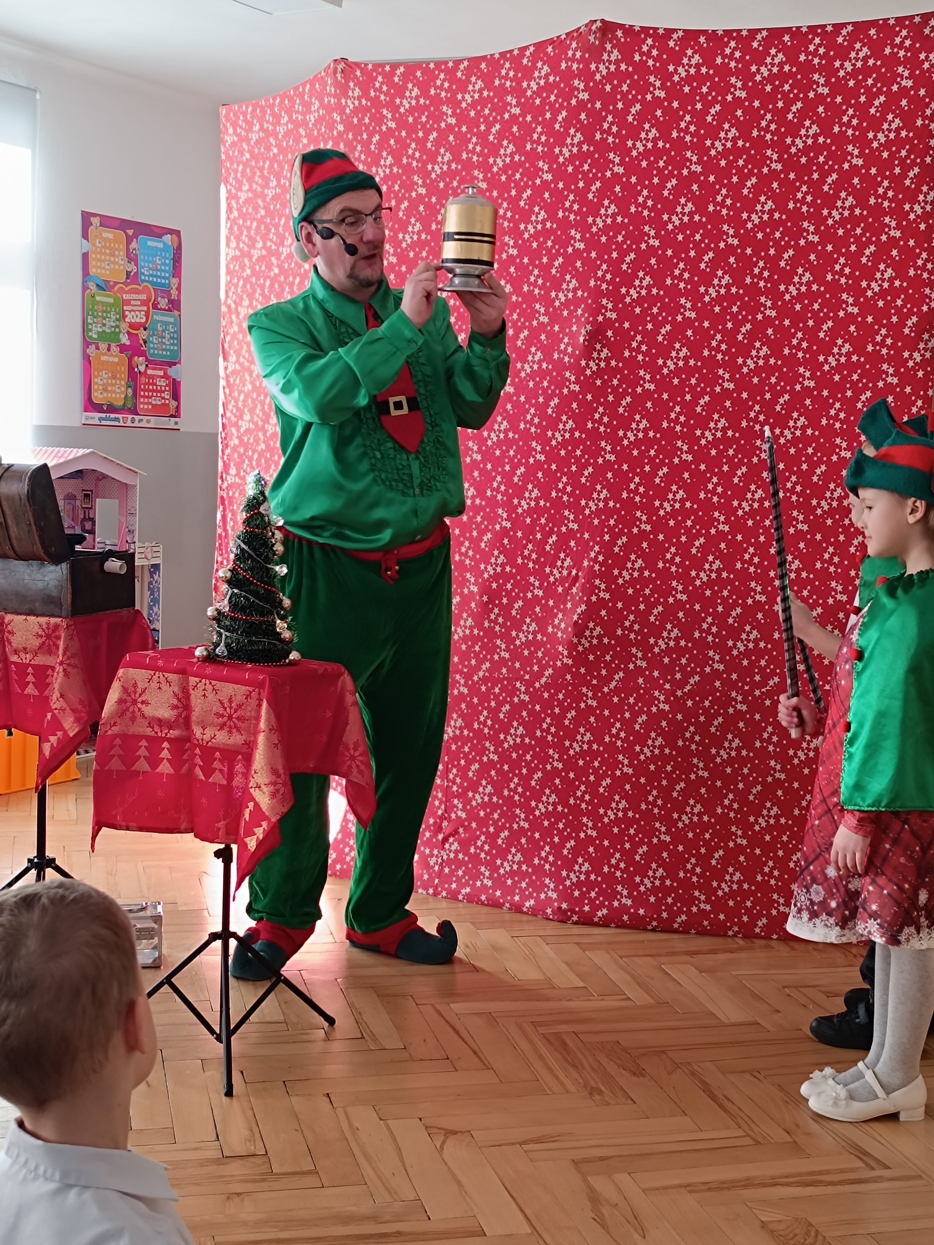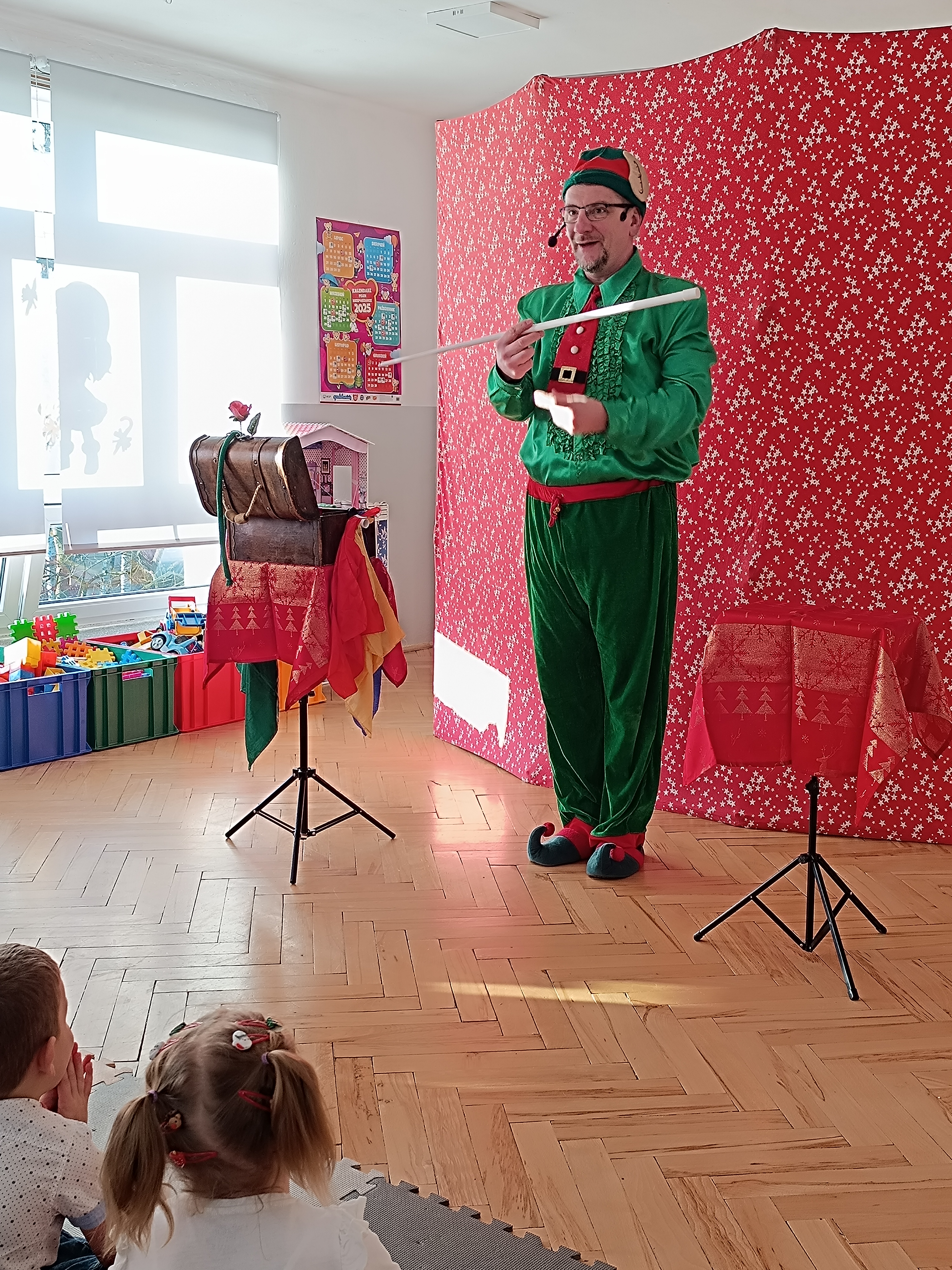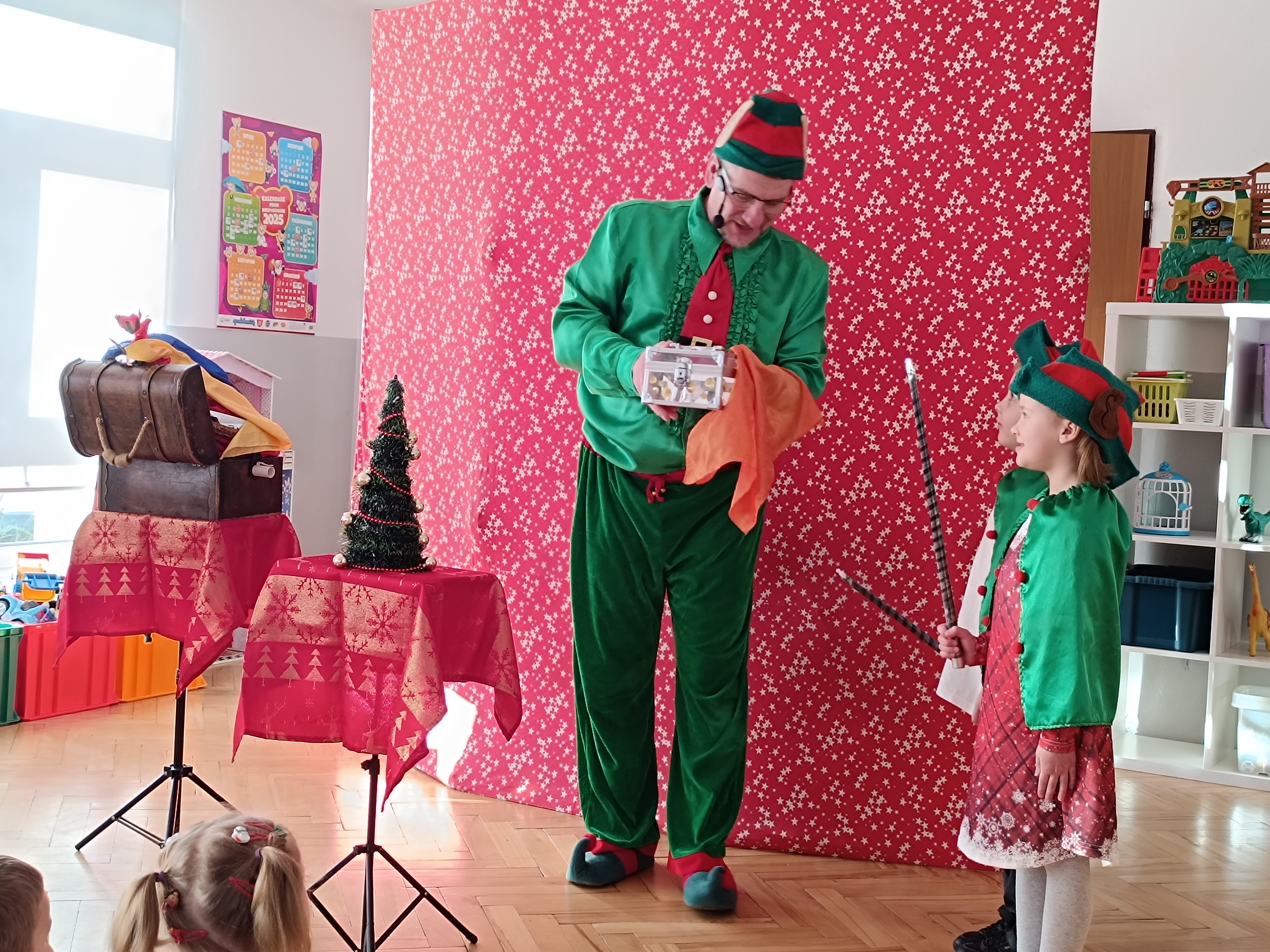 Na scenie działy się rzeczy niezwykłe, a wszystko dotyczyło tematu świąt! Sztuczki magiczne zapierały dech w piersiach i wywoływały zachwyt na twarzach naszych przedszkolaków. W magiczny sposób pojawiały się i znikały przedmioty, przemieszczała się róża, tajemnicze chustki zmieniały się w różdżki. Dzieci wypowiadały za czarodziejem magiczne zaklęcia, a wybrani asystenci osobiście brali udział w magicznych sztuczkach, czarując ozdoby na choinkę i prezenty pod nią.