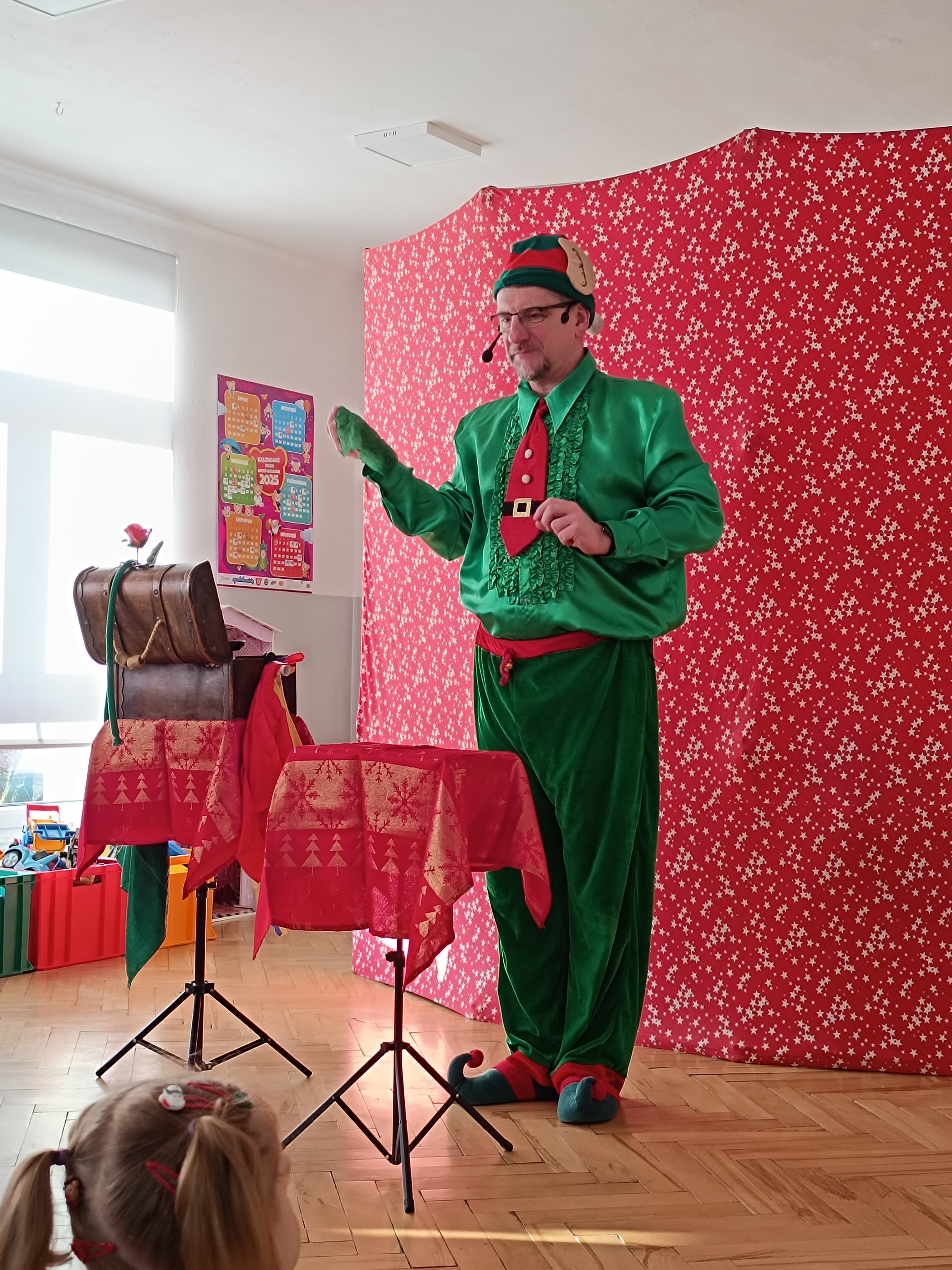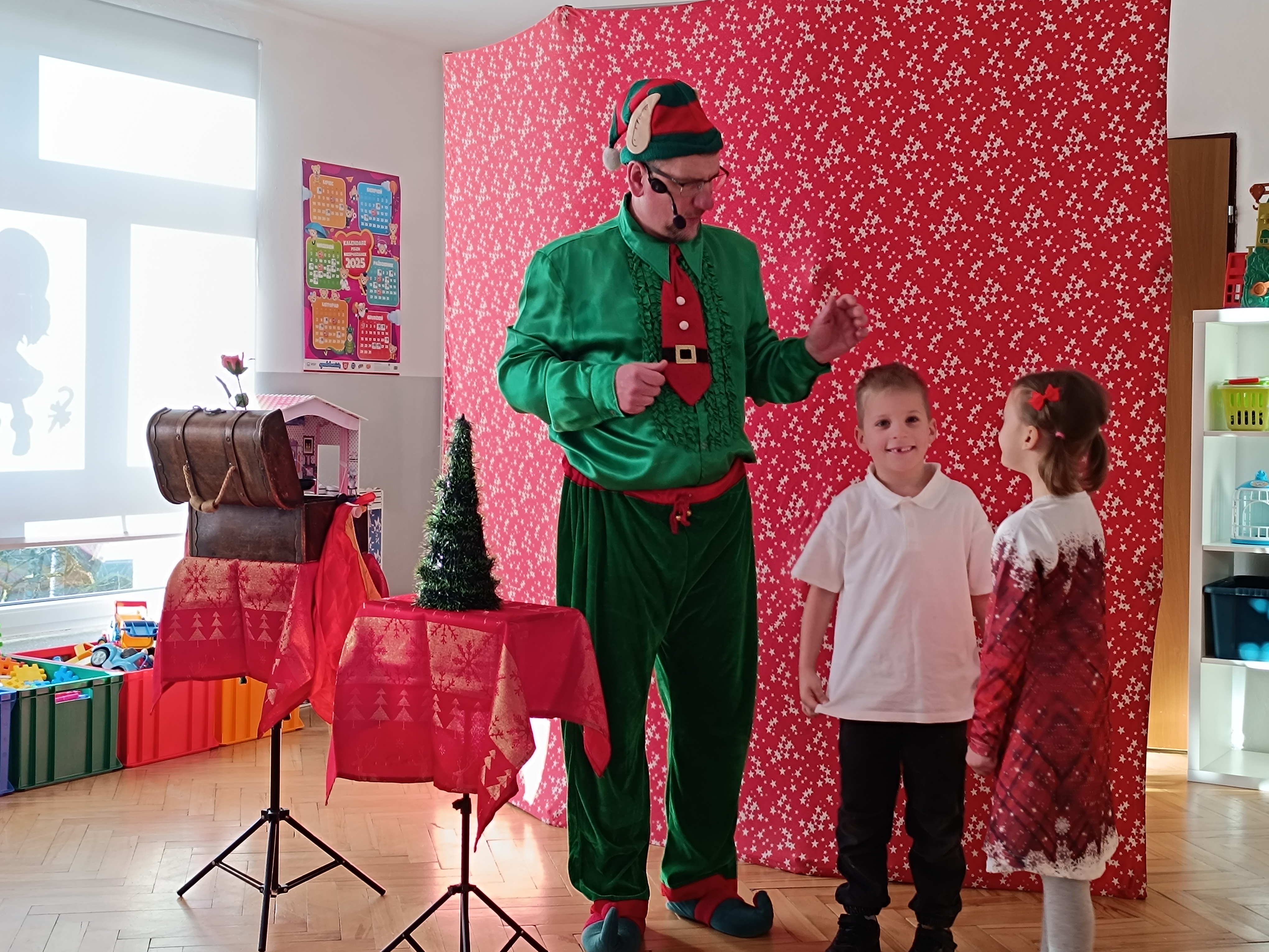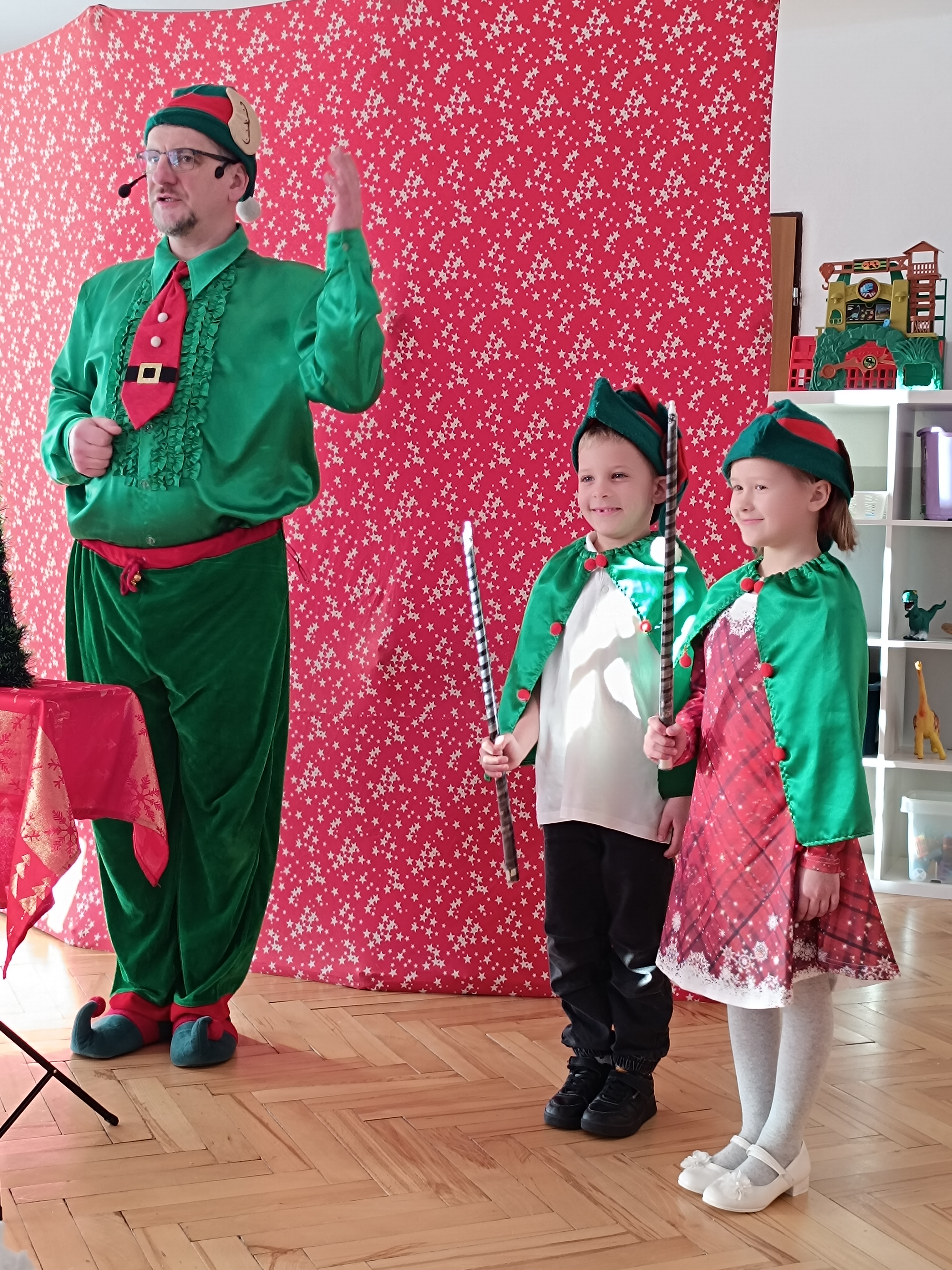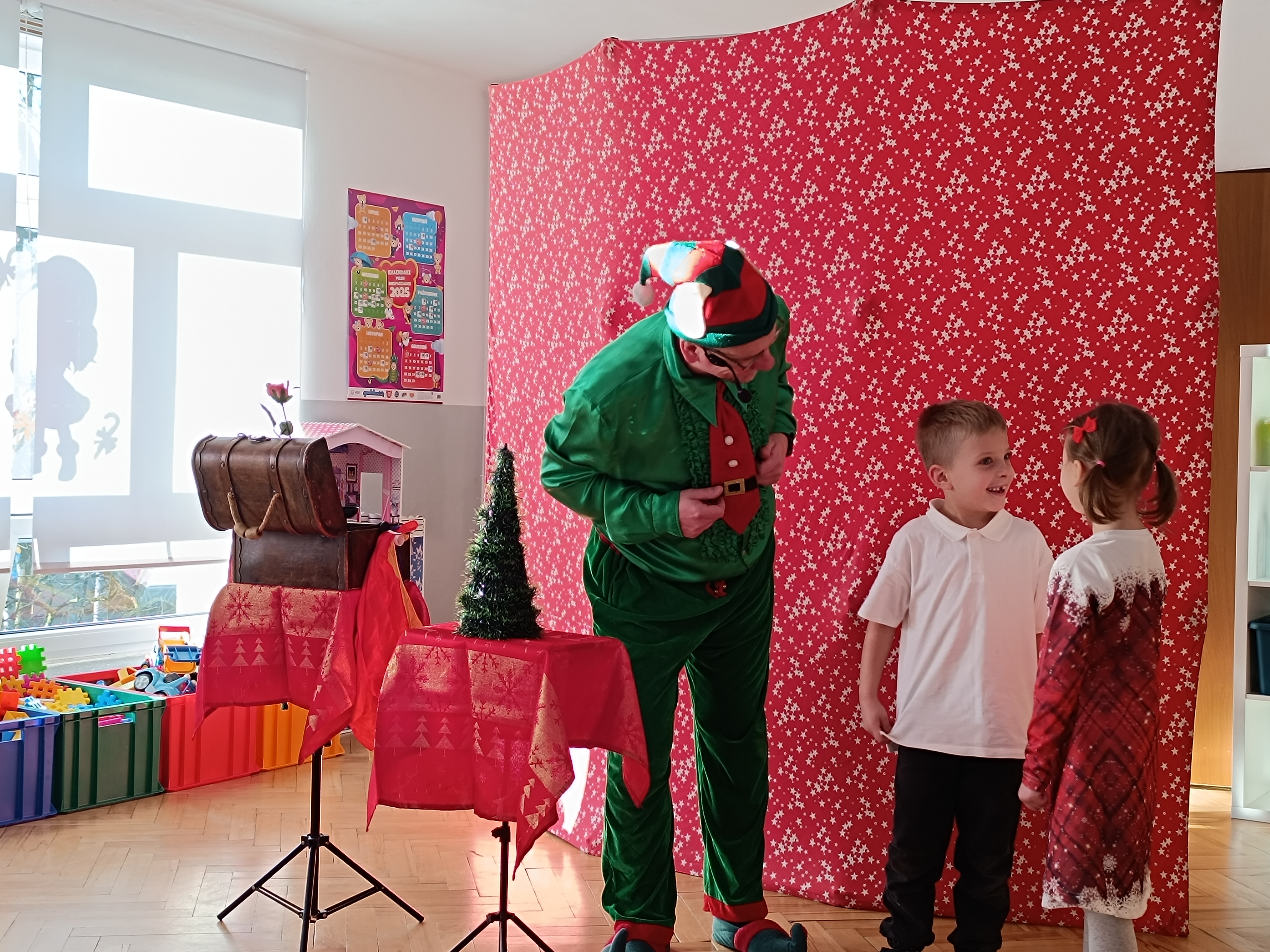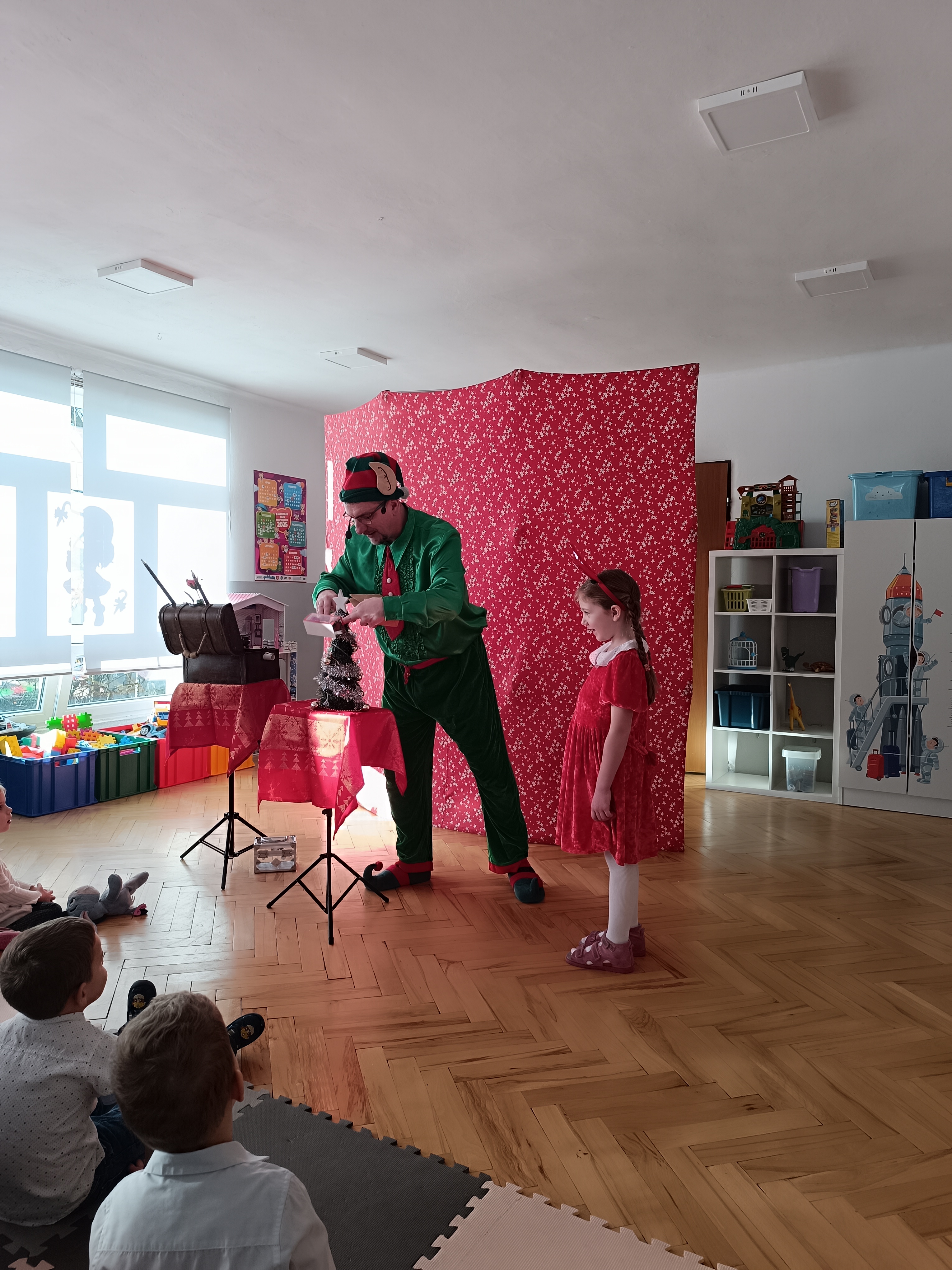 Na scenie działy się rzeczy niezwykłe, a wszystko dotyczyło tematu świąt! Sztuczki magiczne zapierały dech w piersiach i wywoływały zachwyt na twarzach naszych przedszkolaków. W magiczny sposób pojawiały się i znikały przedmioty, przemieszczała się róża, tajemnicze chustki zmieniały się w różdżki. Dzieci wypowiadały za czarodziejem magiczne zaklęcia, a wybrani asystenci osobiście brali udział w magicznych sztuczkach, czarując ozdoby na choinkę i prezenty pod nią.