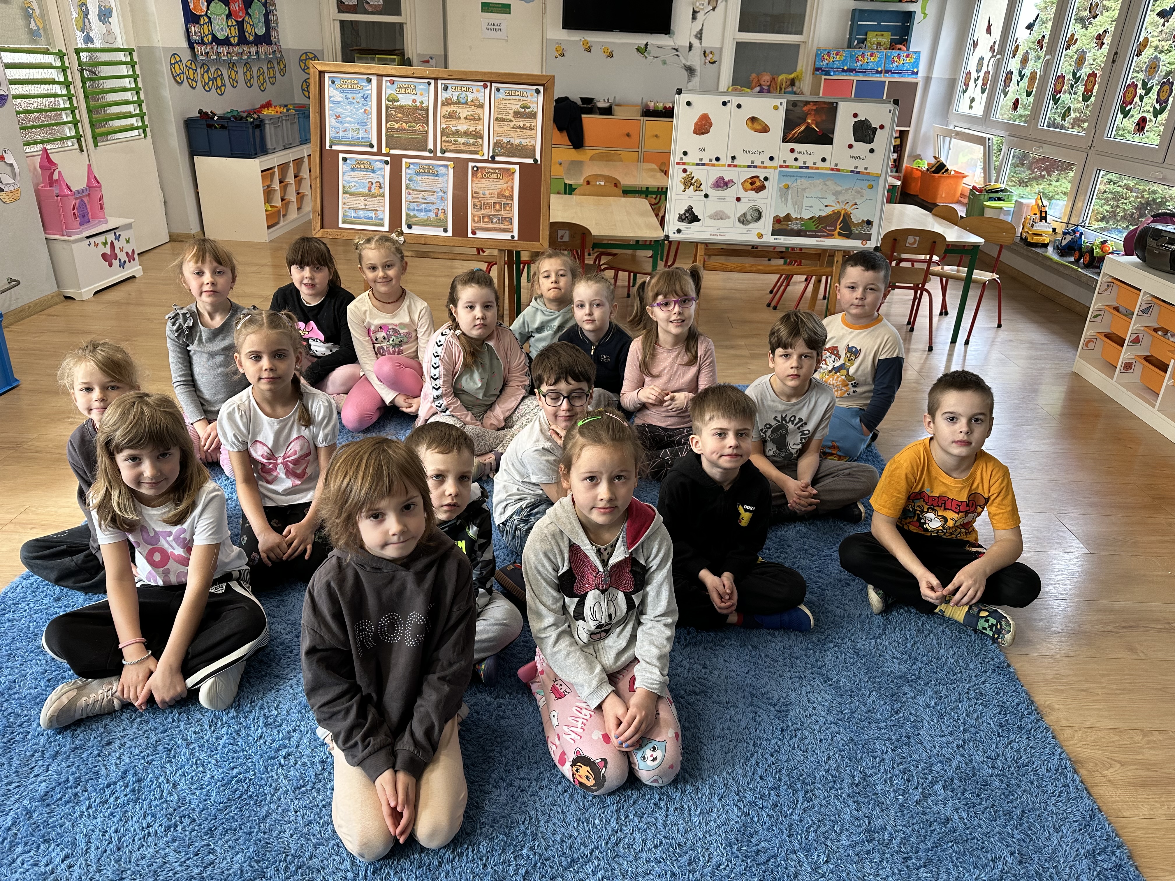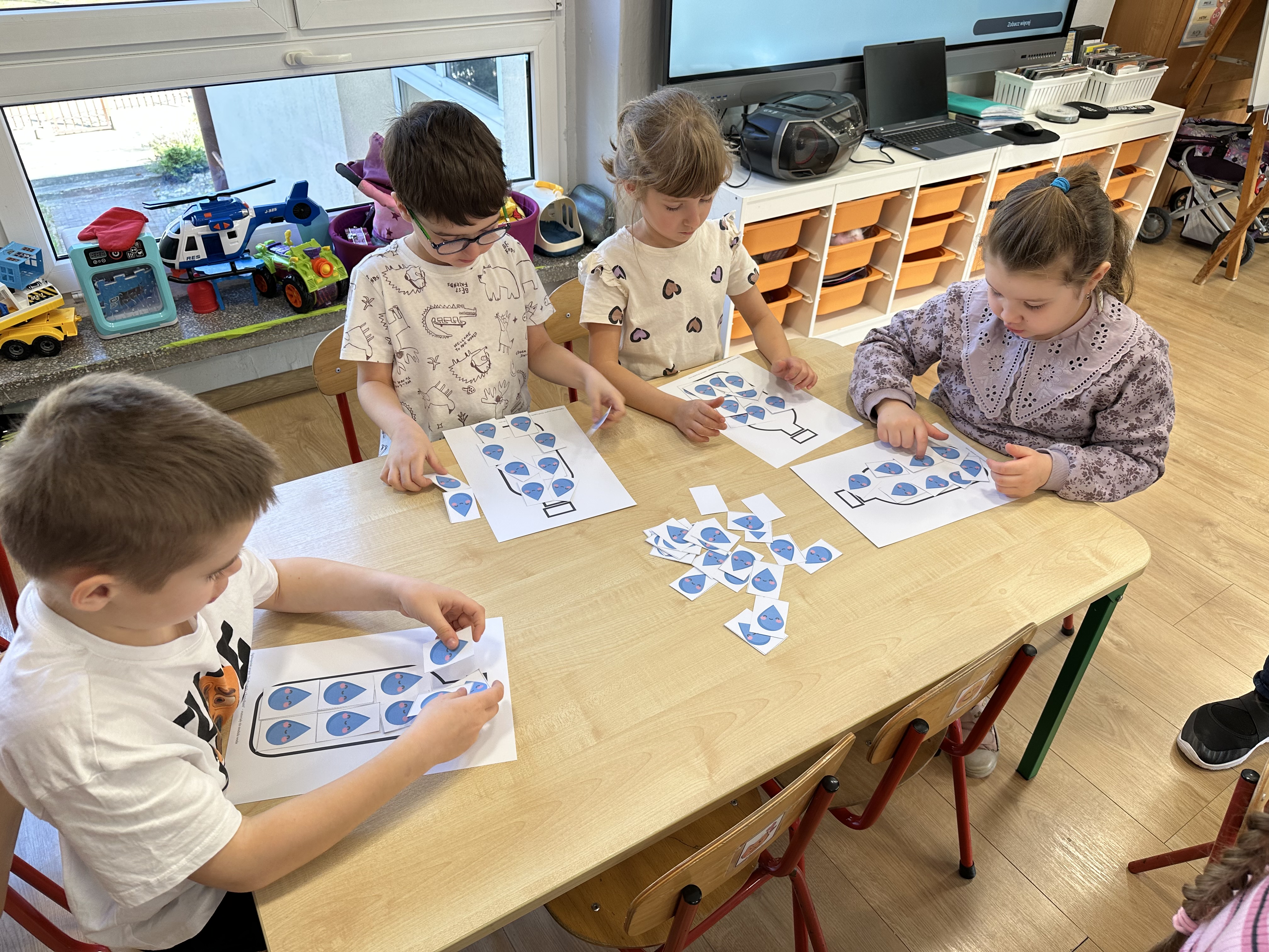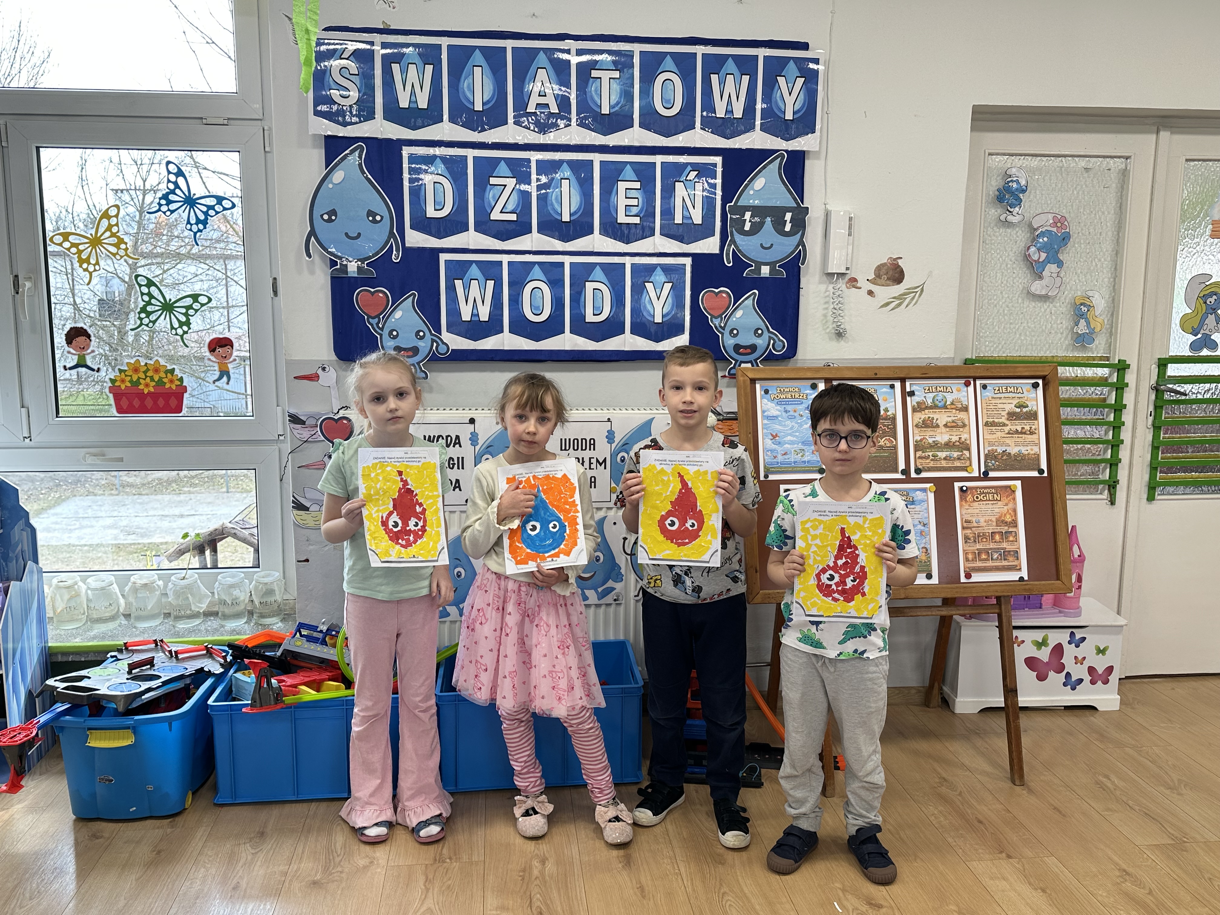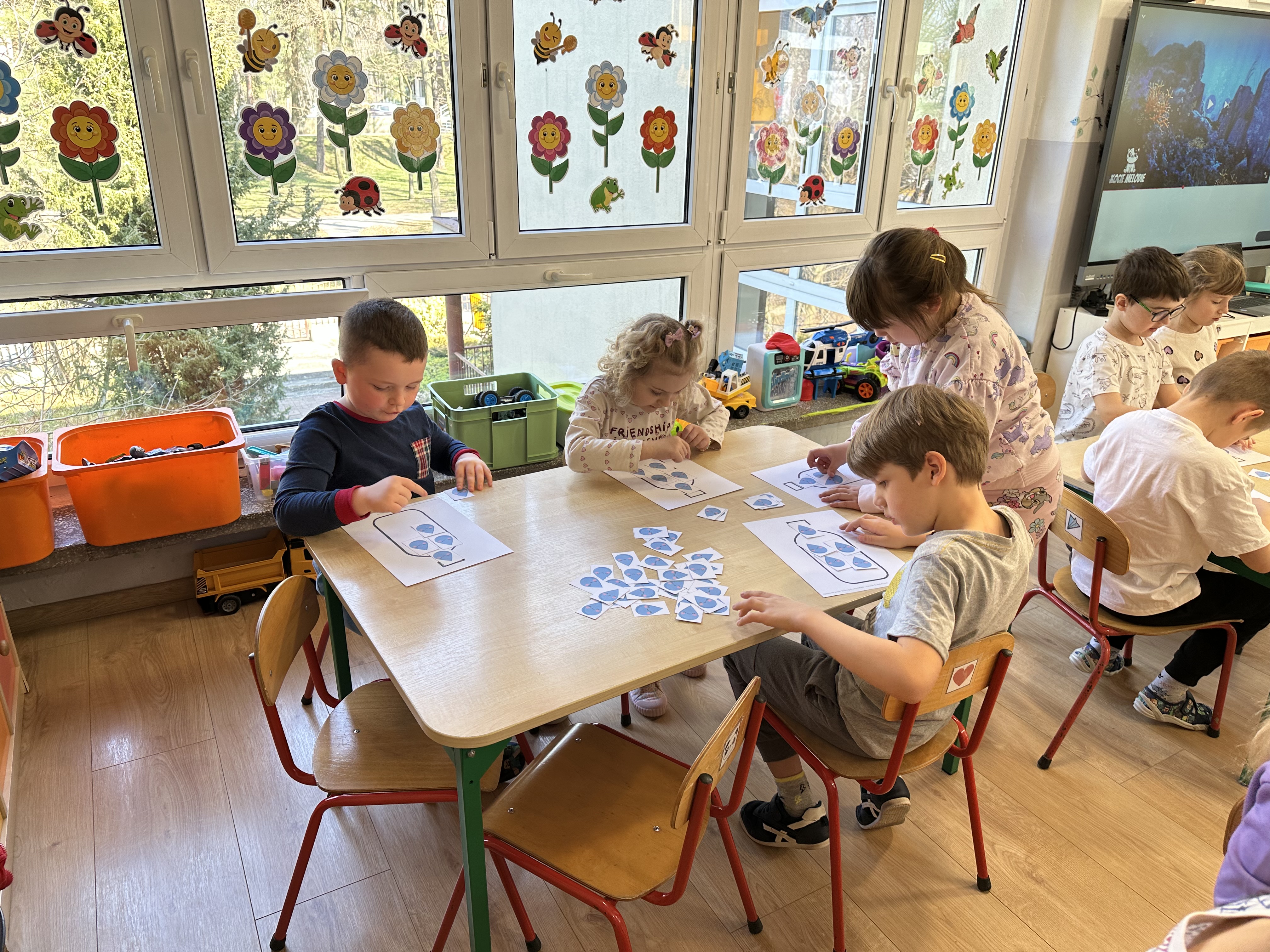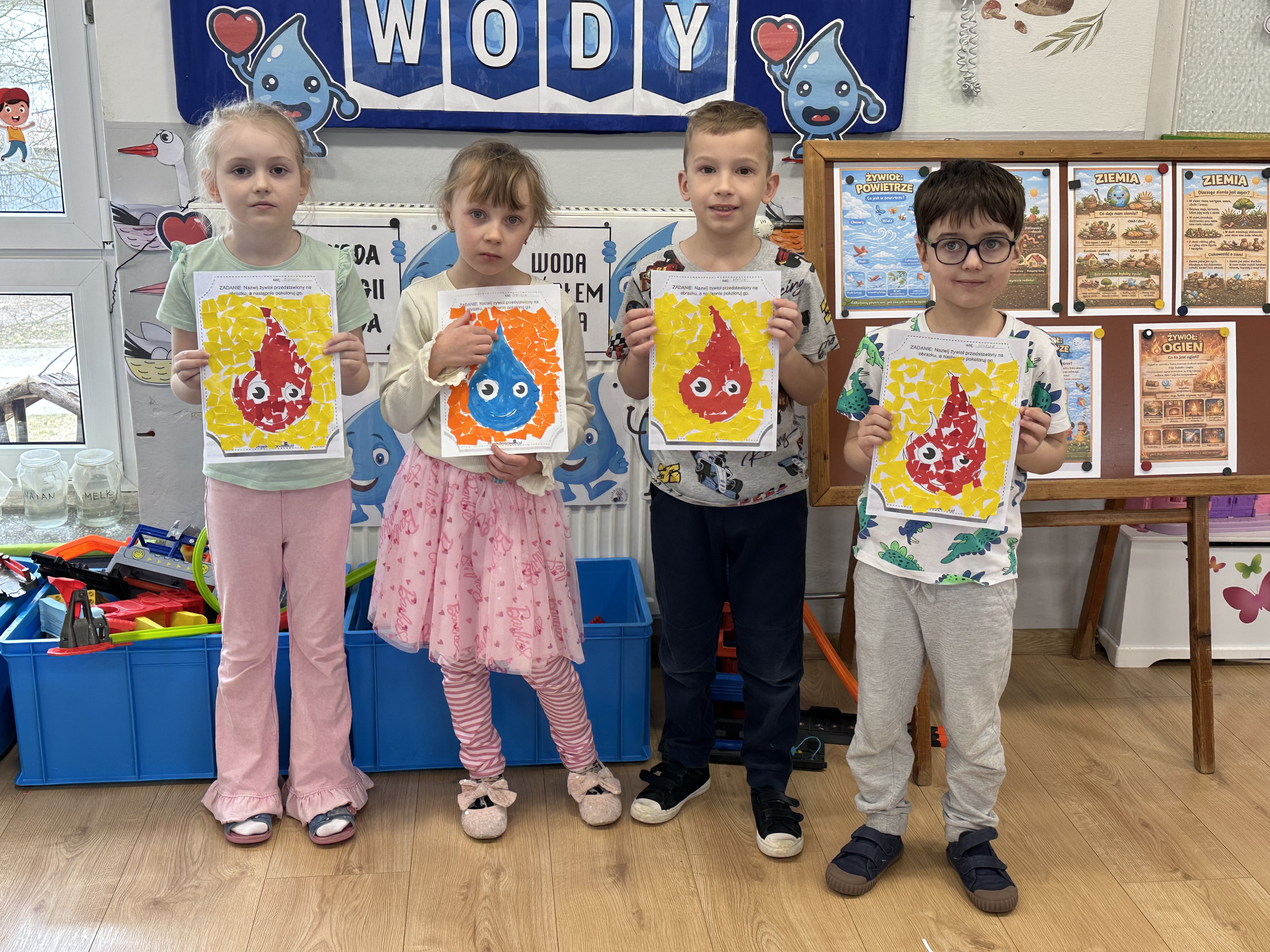 W poniedziałek przedszkolaki zapoznały się z opowiadaniem Marii Pawlisz pt. „Lubię deszcz, gdy jestem w domu”. Po wysłuchaniu tekstu dzieci zastanawiały się, jak należy zachować się podczas burzy i innych zjawisk przyrodniczych. Dodatkowo w trakcie zabawy „Wybuch złości jak wybuch wulkanu” rozwijały umiejętność rozmawiania o uczuciach i sytuacjach, które je wywołują. Zabawa „I am… and I do this…” była kontynuacją tej rozmowy. Dzieci podawały nazwy różnych stanów emocjonalnych z wykorzystaniem słów w języku angielskim i zastanawiały się, czy wszystkie uczucia są nam potrzebne. W trakcie indywidualnych zabaw przy stolikach określały, jak należy postępować, żeby uniknąć szkód związanych z żywiołami, wskazywały właściwe i niebezpieczne zachowania. Następnie brały udział w grach zespołowych z elementami rywalizacji. W dalszej części dnia sześciolatki zapoznały się z pozytywnymi i negatywnymi skutkami działania żywiołów, oglądały zdjęcia przedstawiające niszczycielskie działanie żywiołów i zjawisk pogodowych. Wtorek przedszkolaki zaczęły od rozmowy na temat piosenki „Cztery żywioły”, jej treści, tempie, nastroju i liczbie zwrotek. W drugiej części dnia poznały literę „w” małą i wielką, drukowaną i pisaną. Doskonaliły także słuch fonematyczny, podając przykłady słów rozpoczynających się głoską w, a także tropiły tę głoskę w środku wyrazów. Przedszkolaki dzieliły słowo „woda” na głoski, a następnie samodzielnie układały schemat głoskowy tego słowa z kartoników, przeliczały sylaby w tym wyrazie i dowiedziały się, kiedy głoska w traci dźwięczność. Zabawy przy stolikach stanowiły utrwalenie zdobytej w tym dniu wiedzy językowej. W środowy poranek podczas zabawy „Podajemy sobie skarb” dzieci rozwijały zmysł dotyku i świadomość sensoryczną. W trakcie indywidualnych zabaw przy stolikach utrwalały wiedzę na temat skarbów ziemi i ich wykorzystywania, przeliczały do 10 oraz ćwiczyły pamięć. W czwartek przybliżono dzieciom informacje na temat żywiołu ognia i znaków przeciwpożarowych. Podczas wspólnej rozmowy dzieci zastanawiały się nad negatywnymi skutkami ognia i poznawały, jak należy się zachować w przypadku pożaru oraz w jaki sposób opuszczać zadymione pomieszczenie. Pod koniec dnia w trakcie zabawy „Jak długi jest wąż strażacki?” dzieci doskonaliły umiejętności w zakresie mierzenia oraz posługiwania się linijką. W piątek słuchały wiersza pt. ,,Kłótnia wiatrów” Agnieszki Nożyńskiej‑Demianiuk i rozmawiały na temat jego treści. Wyjaśniały, co to znaczy ,,grać pierwsze skrzypce” i poszerzały swoją wiedzę dotycząca wiatru. Brały udział w zabawach rozwijających umiejętność kodowania i odróżniania prawej strony od lewej. Ćwiczyły pamięć słuchową podczas utrwalania słów piosenki o żywiołach oraz koncentrację uwagi i spostrzegawczość w trakcie integracyjnej zabawy „Który żywioł zmienił miejsce?”. W następnej części dnia dzieci wspólnie obserwowały eksperyment, który wyjaśnił im właściwości powietrza.