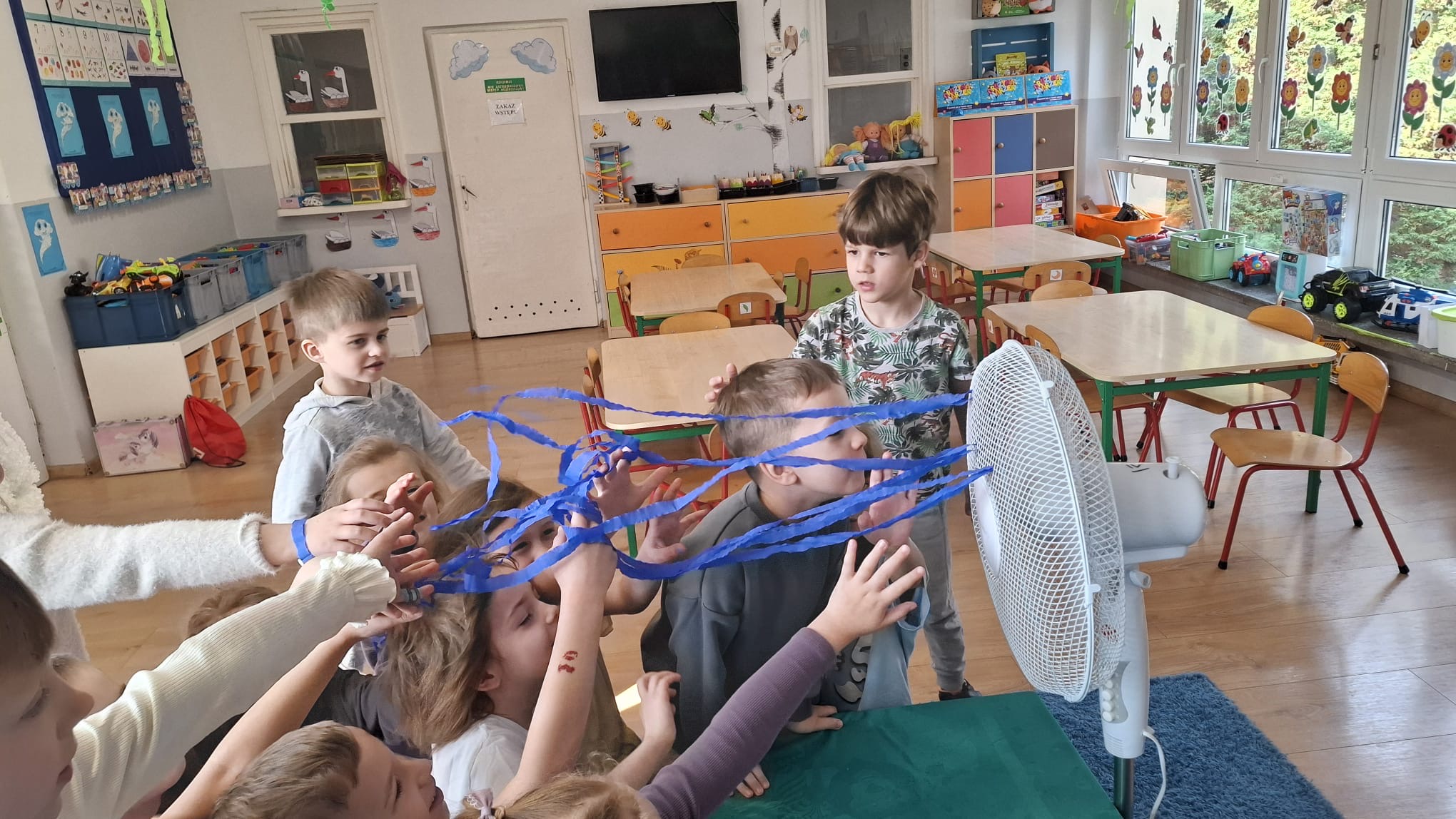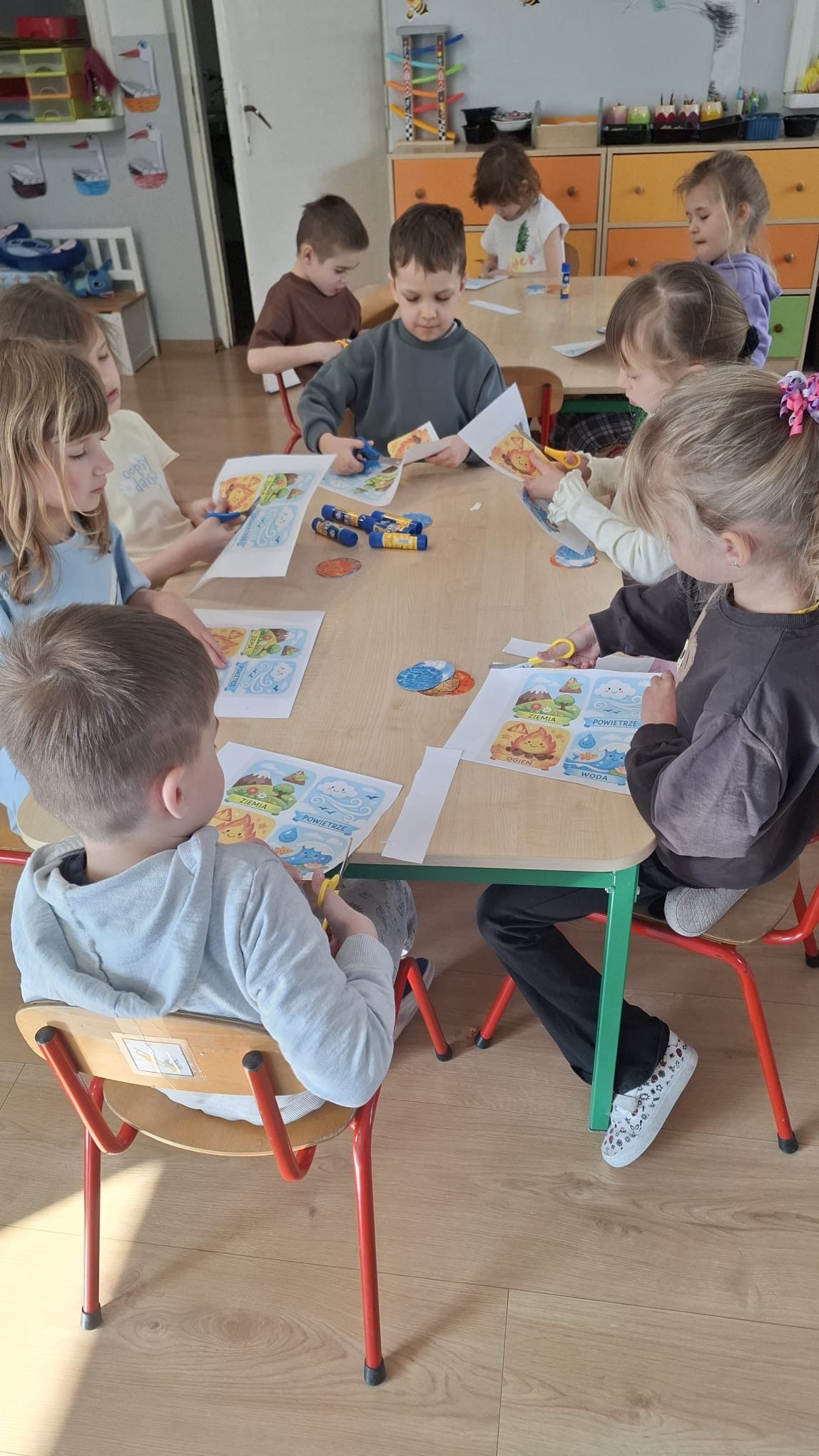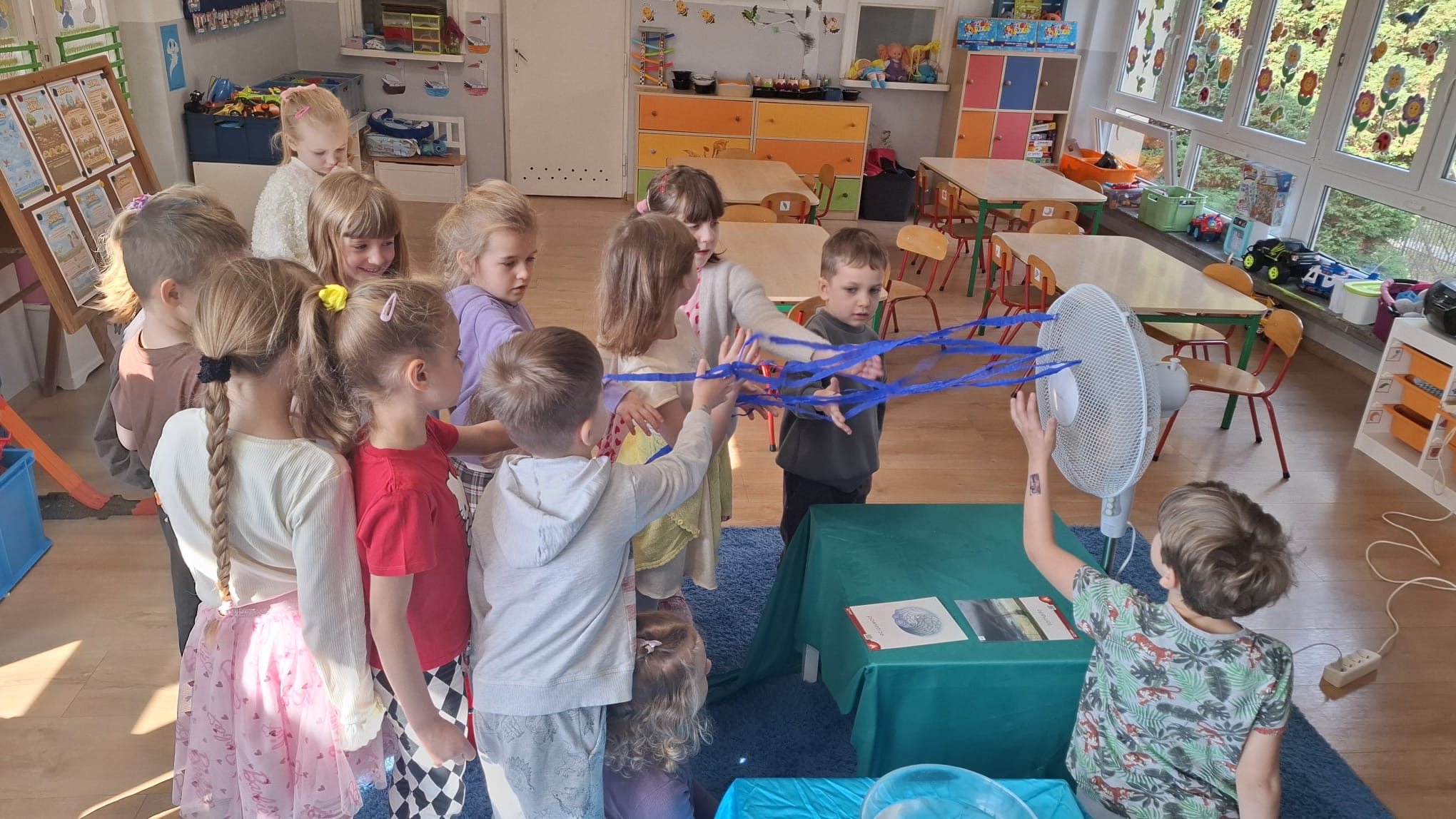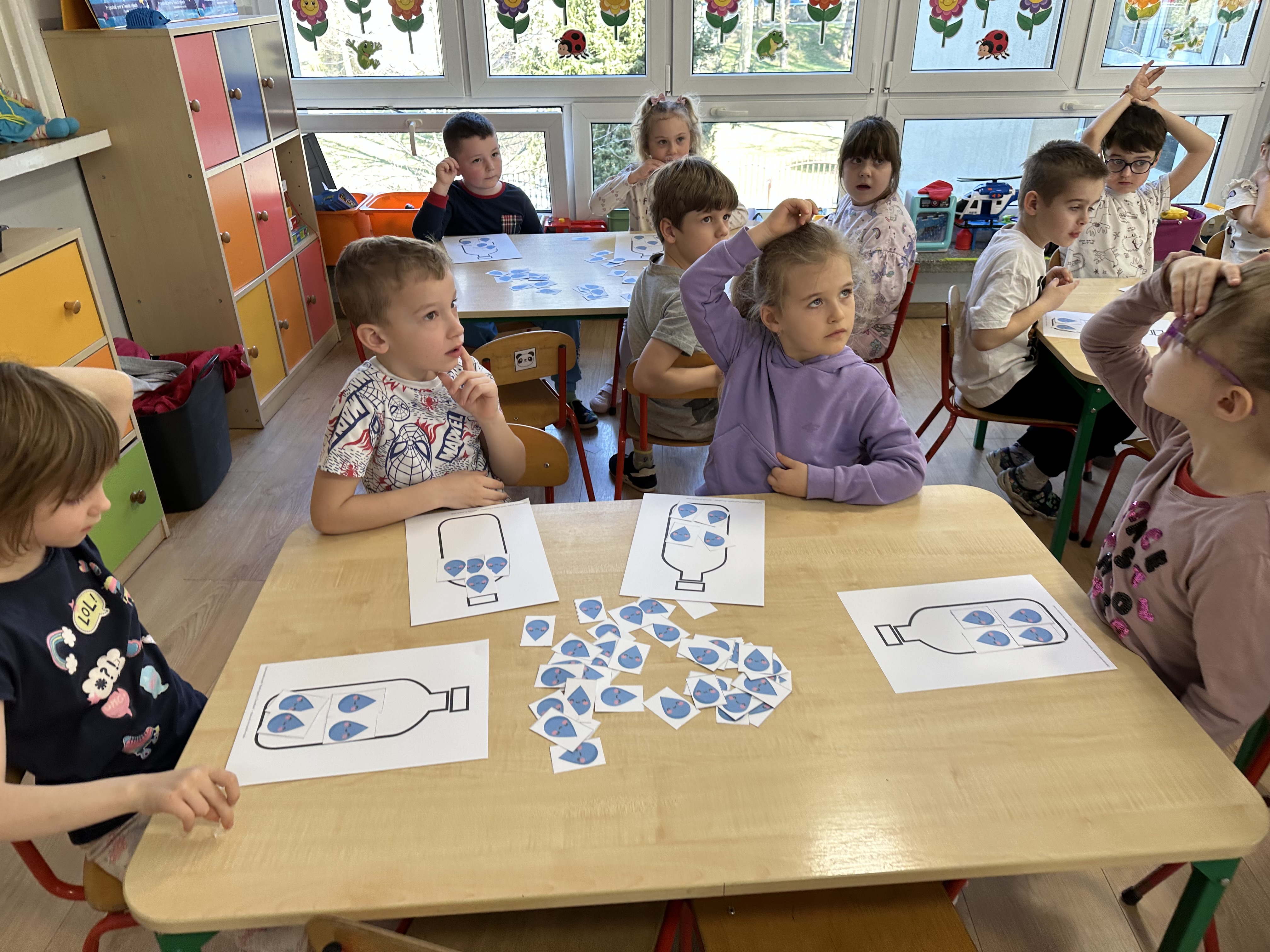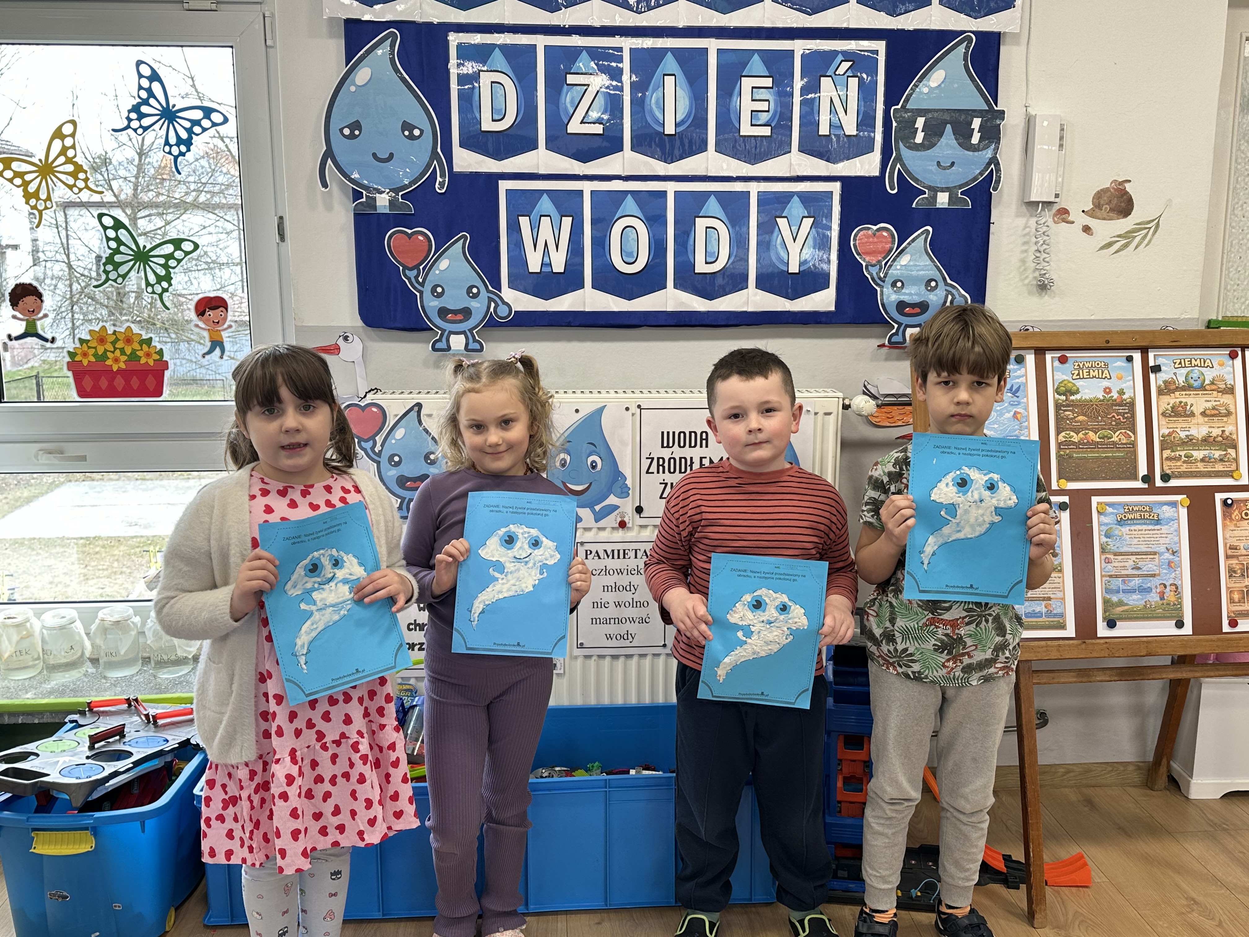 W poniedziałek przedszkolaki zapoznały się z opowiadaniem Marii Pawlisz pt. „Lubię deszcz, gdy jestem w domu”. Po wysłuchaniu tekstu dzieci zastanawiały się, jak należy zachować się podczas burzy i innych zjawisk przyrodniczych. Dodatkowo w trakcie zabawy „Wybuch złości jak wybuch wulkanu” rozwijały umiejętność rozmawiania o uczuciach i sytuacjach, które je wywołują. Zabawa „I am… and I do this…” była kontynuacją tej rozmowy. Dzieci podawały nazwy różnych stanów emocjonalnych z wykorzystaniem słów w języku angielskim i zastanawiały się, czy wszystkie uczucia są nam potrzebne. W trakcie indywidualnych zabaw przy stolikach określały, jak należy postępować, żeby uniknąć szkód związanych z żywiołami, wskazywały właściwe i niebezpieczne zachowania. Następnie brały udział w grach zespołowych z elementami rywalizacji. W dalszej części dnia sześciolatki zapoznały się z pozytywnymi i negatywnymi skutkami działania żywiołów, oglądały zdjęcia przedstawiające niszczycielskie działanie żywiołów i zjawisk pogodowych. Wtorek przedszkolaki zaczęły od rozmowy na temat piosenki „Cztery żywioły”, jej treści, tempie, nastroju i liczbie zwrotek. W drugiej części dnia poznały literę „w” małą i wielką, drukowaną i pisaną. Doskonaliły także słuch fonematyczny, podając przykłady słów rozpoczynających się głoską w, a także tropiły tę głoskę w środku wyrazów. Przedszkolaki dzieliły słowo „woda” na głoski, a następnie samodzielnie układały schemat głoskowy tego słowa z kartoników, przeliczały sylaby w tym wyrazie i dowiedziały się, kiedy głoska w traci dźwięczność. Zabawy przy stolikach stanowiły utrwalenie zdobytej w tym dniu wiedzy językowej. W środowy poranek podczas zabawy „Podajemy sobie skarb” dzieci rozwijały zmysł dotyku i świadomość sensoryczną. W trakcie indywidualnych zabaw przy stolikach utrwalały wiedzę na temat skarbów ziemi i ich wykorzystywania, przeliczały do 10 oraz ćwiczyły pamięć. W czwartek przybliżono dzieciom informacje na temat żywiołu ognia i znaków przeciwpożarowych. Podczas wspólnej rozmowy dzieci zastanawiały się nad negatywnymi skutkami ognia i poznawały, jak należy się zachować w przypadku pożaru oraz w jaki sposób opuszczać zadymione pomieszczenie. Pod koniec dnia w trakcie zabawy „Jak długi jest wąż strażacki?” dzieci doskonaliły umiejętności w zakresie mierzenia oraz posługiwania się linijką. W piątek słuchały wiersza pt. ,,Kłótnia wiatrów” Agnieszki Nożyńskiej‑Demianiuk i rozmawiały na temat jego treści. Wyjaśniały, co to znaczy ,,grać pierwsze skrzypce” i poszerzały swoją wiedzę dotycząca wiatru. Brały udział w zabawach rozwijających umiejętność kodowania i odróżniania prawej strony od lewej. Ćwiczyły pamięć słuchową podczas utrwalania słów piosenki o żywiołach oraz koncentrację uwagi i spostrzegawczość w trakcie integracyjnej zabawy „Który żywioł zmienił miejsce?”. W następnej części dnia dzieci wspólnie obserwowały eksperyment, który wyjaśnił im właściwości powietrza.