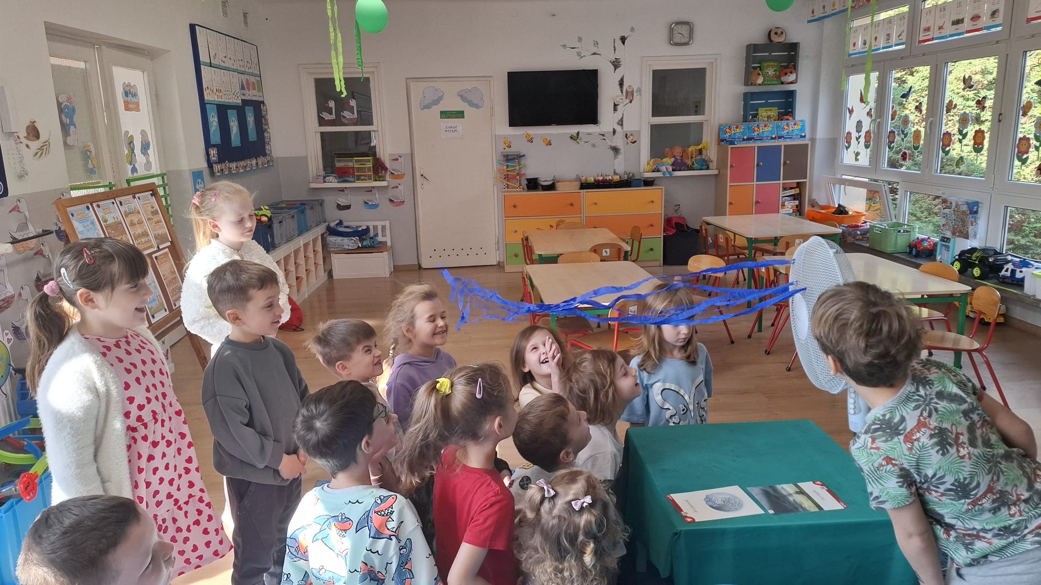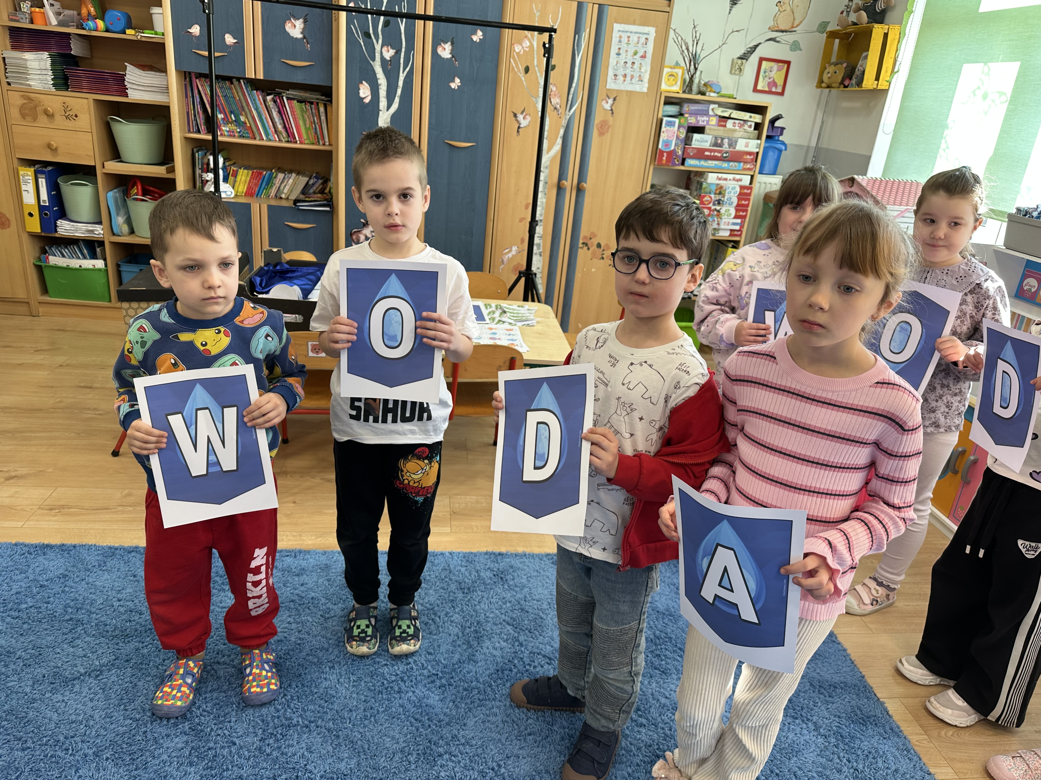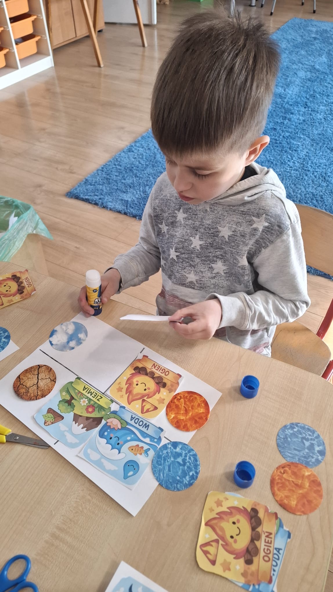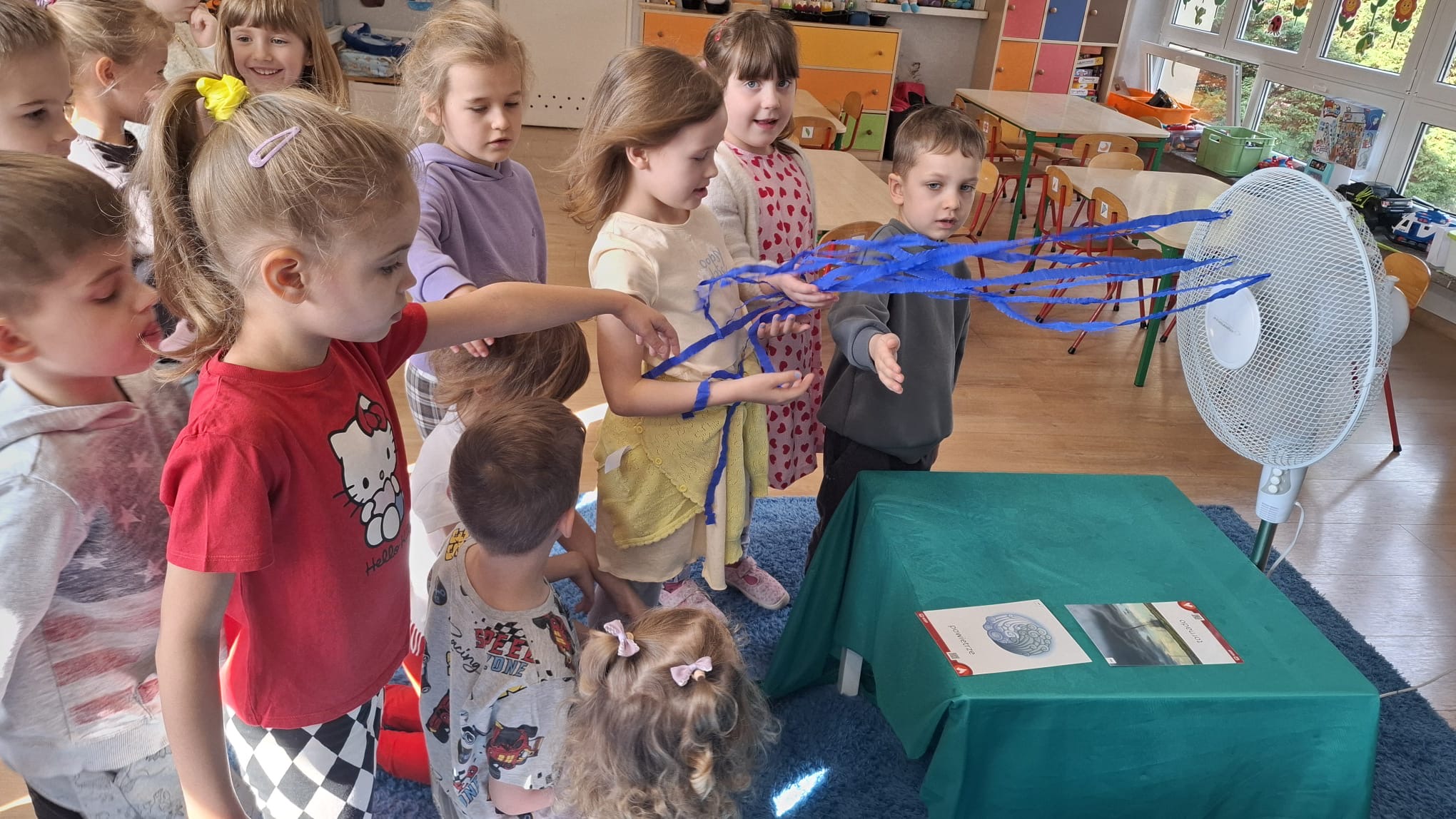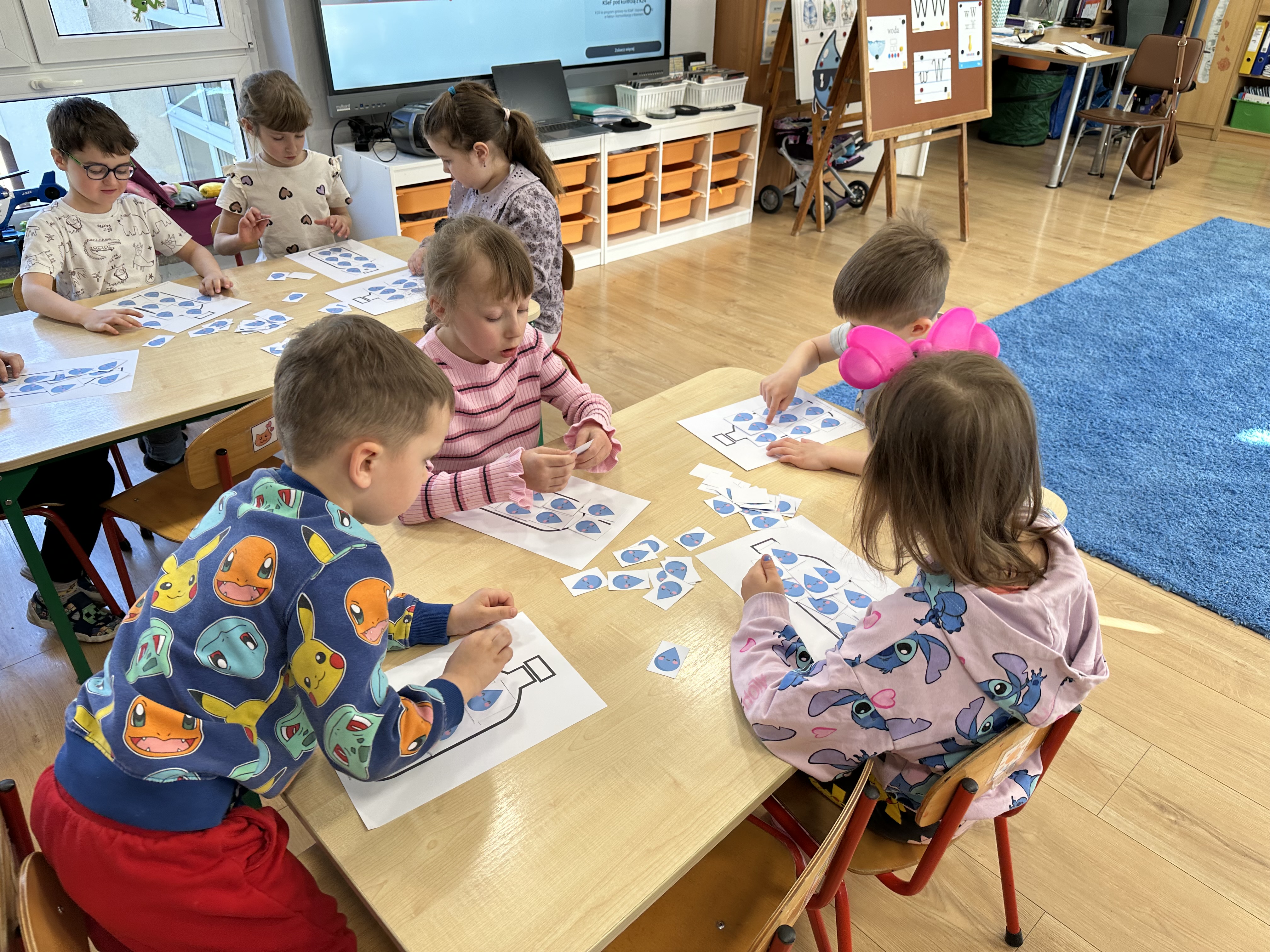 W poniedziałek przedszkolaki zapoznały się z opowiadaniem Marii Pawlisz pt. „Lubię deszcz, gdy jestem w domu”. Po wysłuchaniu tekstu dzieci zastanawiały się, jak należy zachować się podczas burzy i innych zjawisk przyrodniczych. Dodatkowo w trakcie zabawy „Wybuch złości jak wybuch wulkanu” rozwijały umiejętność rozmawiania o uczuciach i sytuacjach, które je wywołują. Zabawa „I am… and I do this…” była kontynuacją tej rozmowy. Dzieci podawały nazwy różnych stanów emocjonalnych z wykorzystaniem słów w języku angielskim i zastanawiały się, czy wszystkie uczucia są nam potrzebne. W trakcie indywidualnych zabaw przy stolikach określały, jak należy postępować, żeby uniknąć szkód związanych z żywiołami, wskazywały właściwe i niebezpieczne zachowania. Następnie brały udział w grach zespołowych z elementami rywalizacji. W dalszej części dnia sześciolatki zapoznały się z pozytywnymi i negatywnymi skutkami działania żywiołów, oglądały zdjęcia przedstawiające niszczycielskie działanie żywiołów i zjawisk pogodowych. Wtorek przedszkolaki zaczęły od rozmowy na temat piosenki „Cztery żywioły”, jej treści, tempie, nastroju i liczbie zwrotek. W drugiej części dnia poznały literę „w” małą i wielką, drukowaną i pisaną. Doskonaliły także słuch fonematyczny, podając przykłady słów rozpoczynających się głoską w, a także tropiły tę głoskę w środku wyrazów. Przedszkolaki dzieliły słowo „woda” na głoski, a następnie samodzielnie układały schemat głoskowy tego słowa z kartoników, przeliczały sylaby w tym wyrazie i dowiedziały się, kiedy głoska w traci dźwięczność. Zabawy przy stolikach stanowiły utrwalenie zdobytej w tym dniu wiedzy językowej. W środowy poranek podczas zabawy „Podajemy sobie skarb” dzieci rozwijały zmysł dotyku i świadomość sensoryczną. W trakcie indywidualnych zabaw przy stolikach utrwalały wiedzę na temat skarbów ziemi i ich wykorzystywania, przeliczały do 10 oraz ćwiczyły pamięć. W czwartek przybliżono dzieciom informacje na temat żywiołu ognia i znaków przeciwpożarowych. Podczas wspólnej rozmowy dzieci zastanawiały się nad negatywnymi skutkami ognia i poznawały, jak należy się zachować w przypadku pożaru oraz w jaki sposób opuszczać zadymione pomieszczenie. Pod koniec dnia w trakcie zabawy „Jak długi jest wąż strażacki?” dzieci doskonaliły umiejętności w zakresie mierzenia oraz posługiwania się linijką. W piątek słuchały wiersza pt. ,,Kłótnia wiatrów” Agnieszki Nożyńskiej‑Demianiuk i rozmawiały na temat jego treści. Wyjaśniały, co to znaczy ,,grać pierwsze skrzypce” i poszerzały swoją wiedzę dotycząca wiatru. Brały udział w zabawach rozwijających umiejętność kodowania i odróżniania prawej strony od lewej. Ćwiczyły pamięć słuchową podczas utrwalania słów piosenki o żywiołach oraz koncentrację uwagi i spostrzegawczość w trakcie integracyjnej zabawy „Który żywioł zmienił miejsce?”. W następnej części dnia dzieci wspólnie obserwowały eksperyment, który wyjaśnił im właściwości powietrza.
