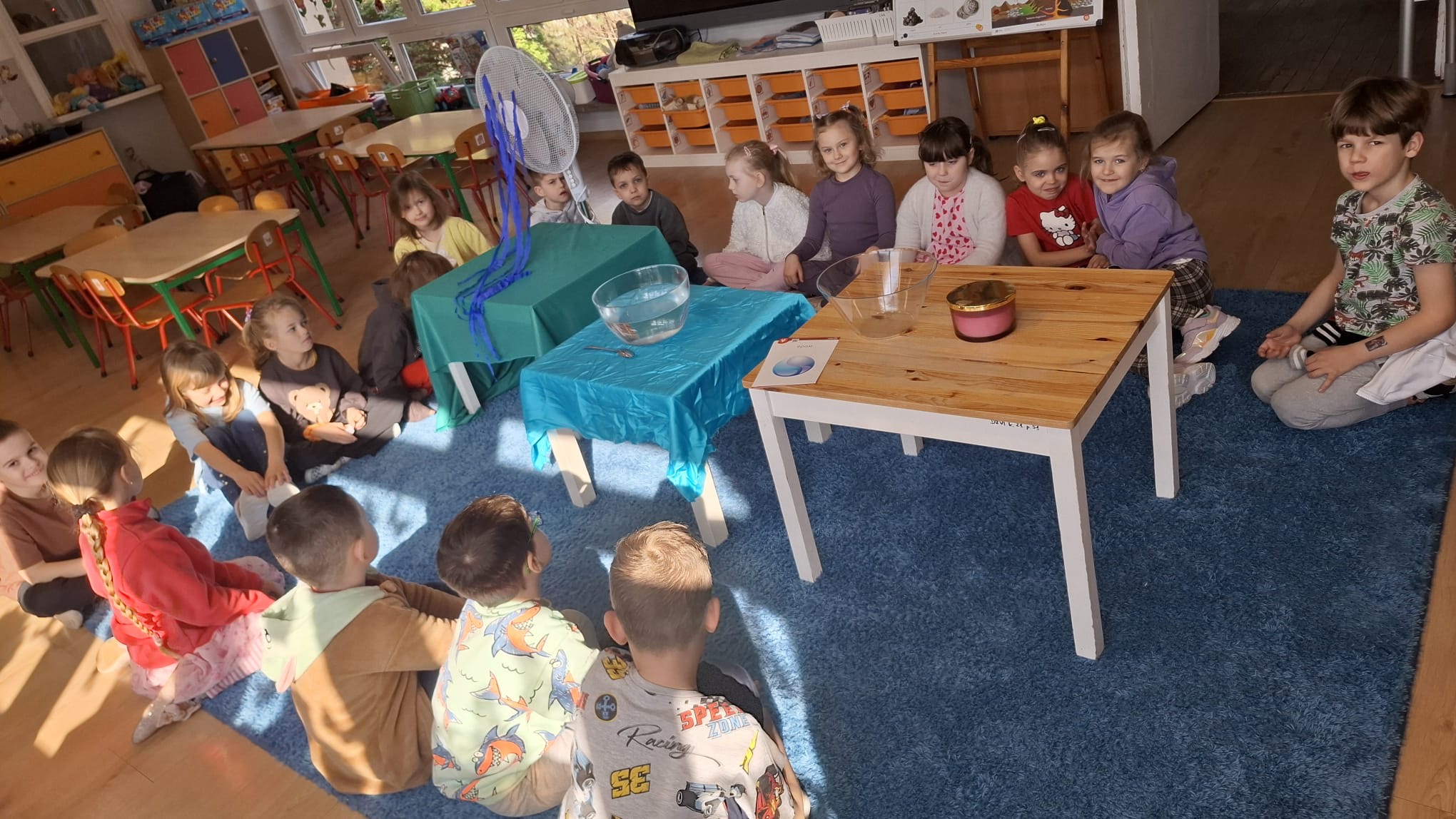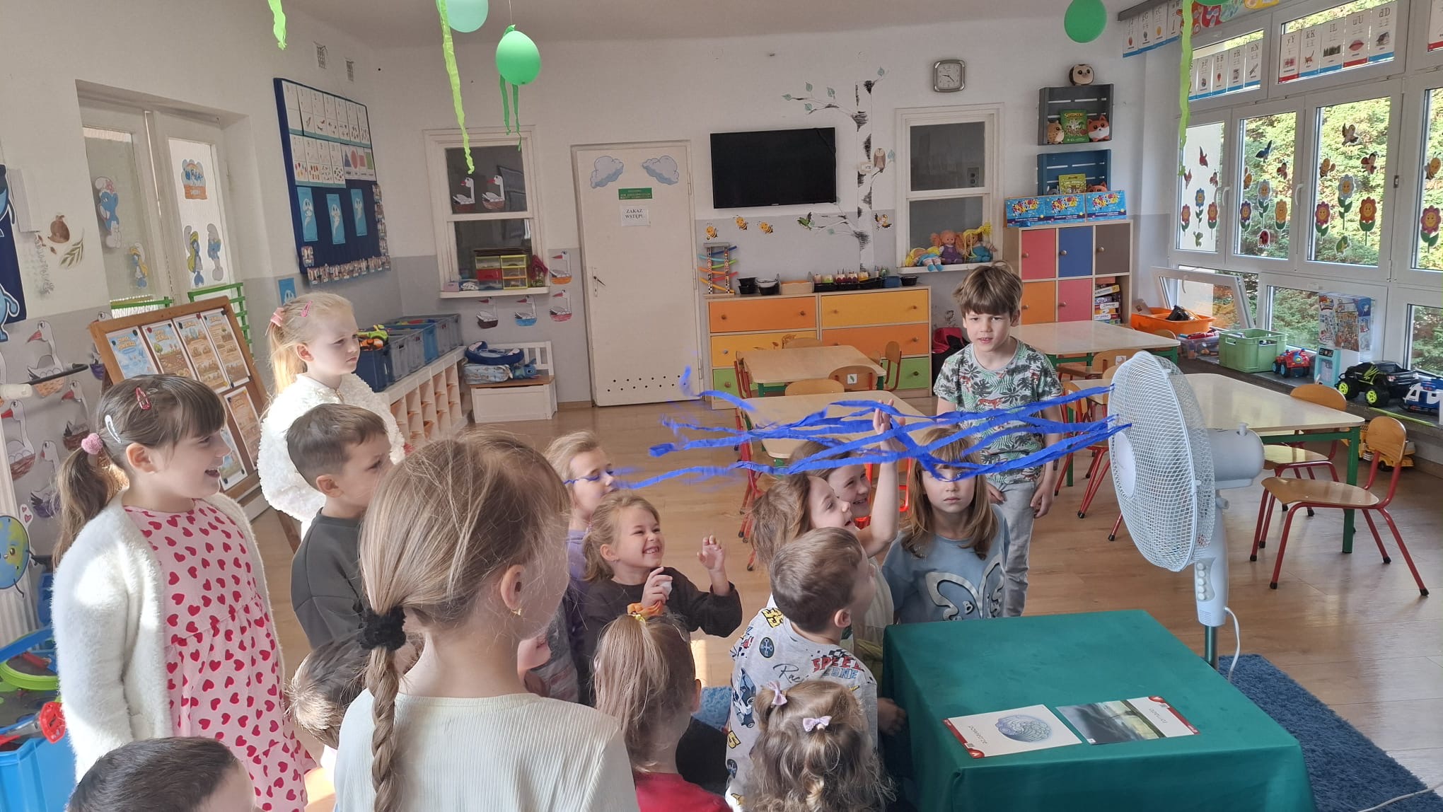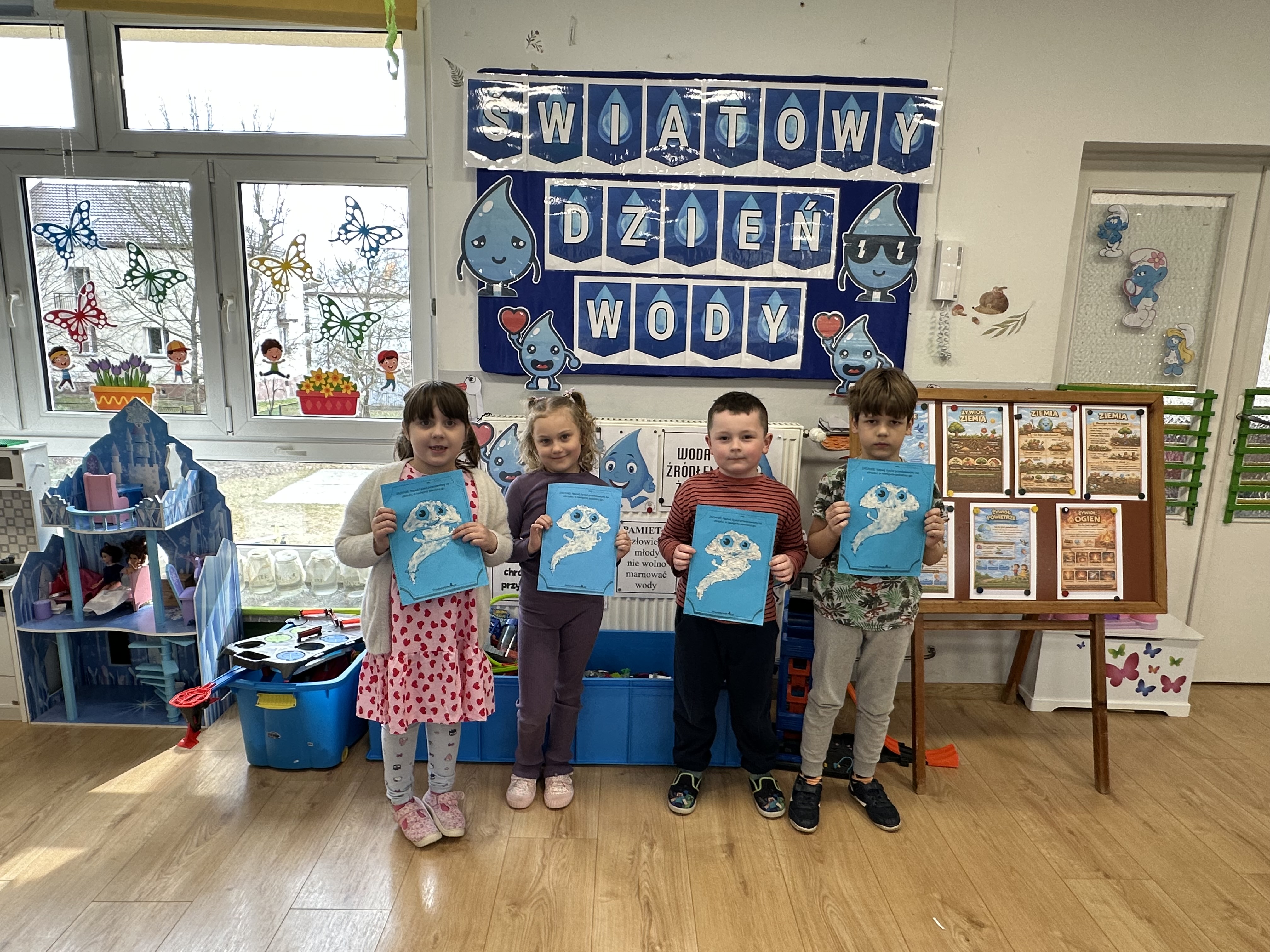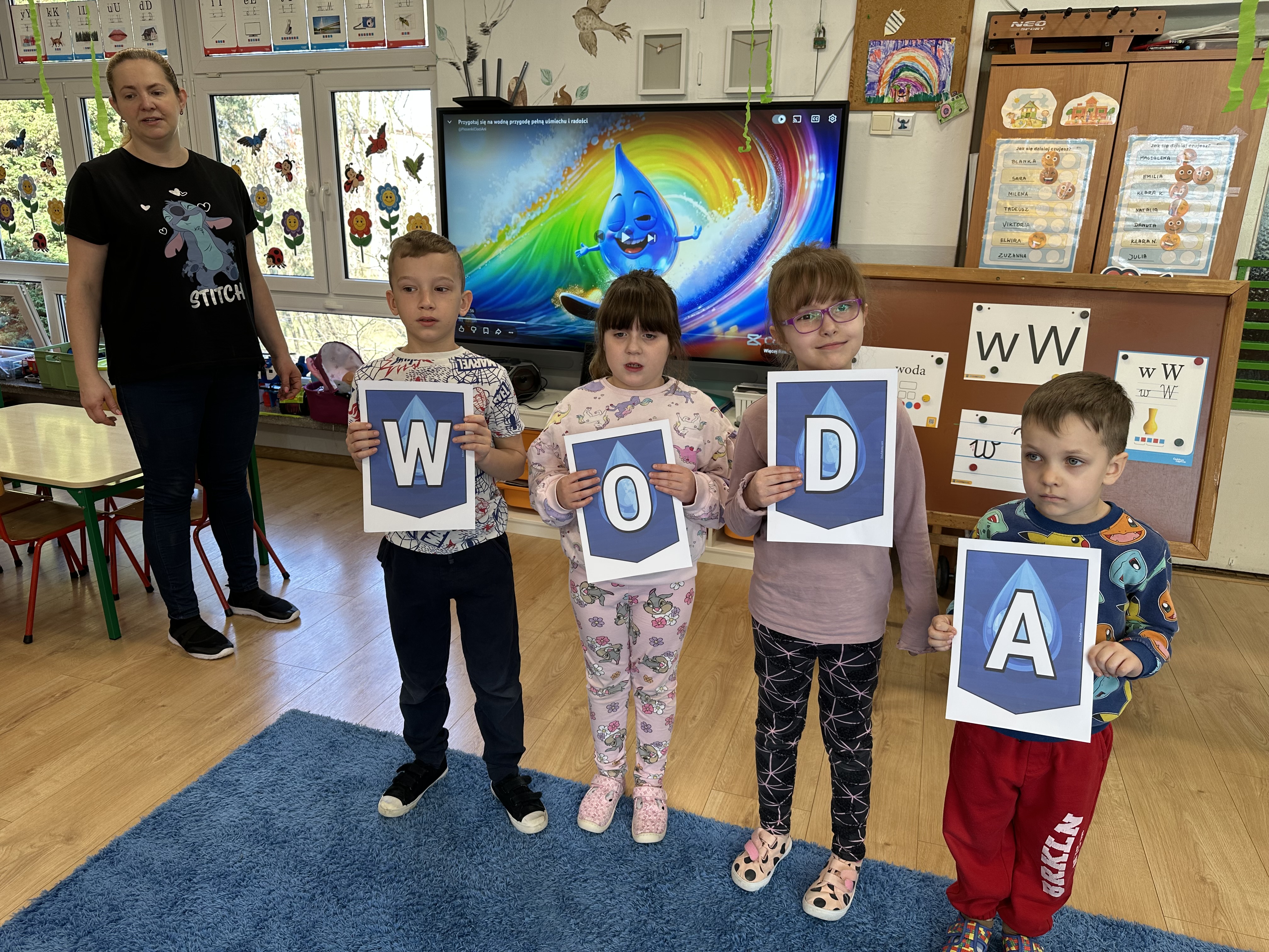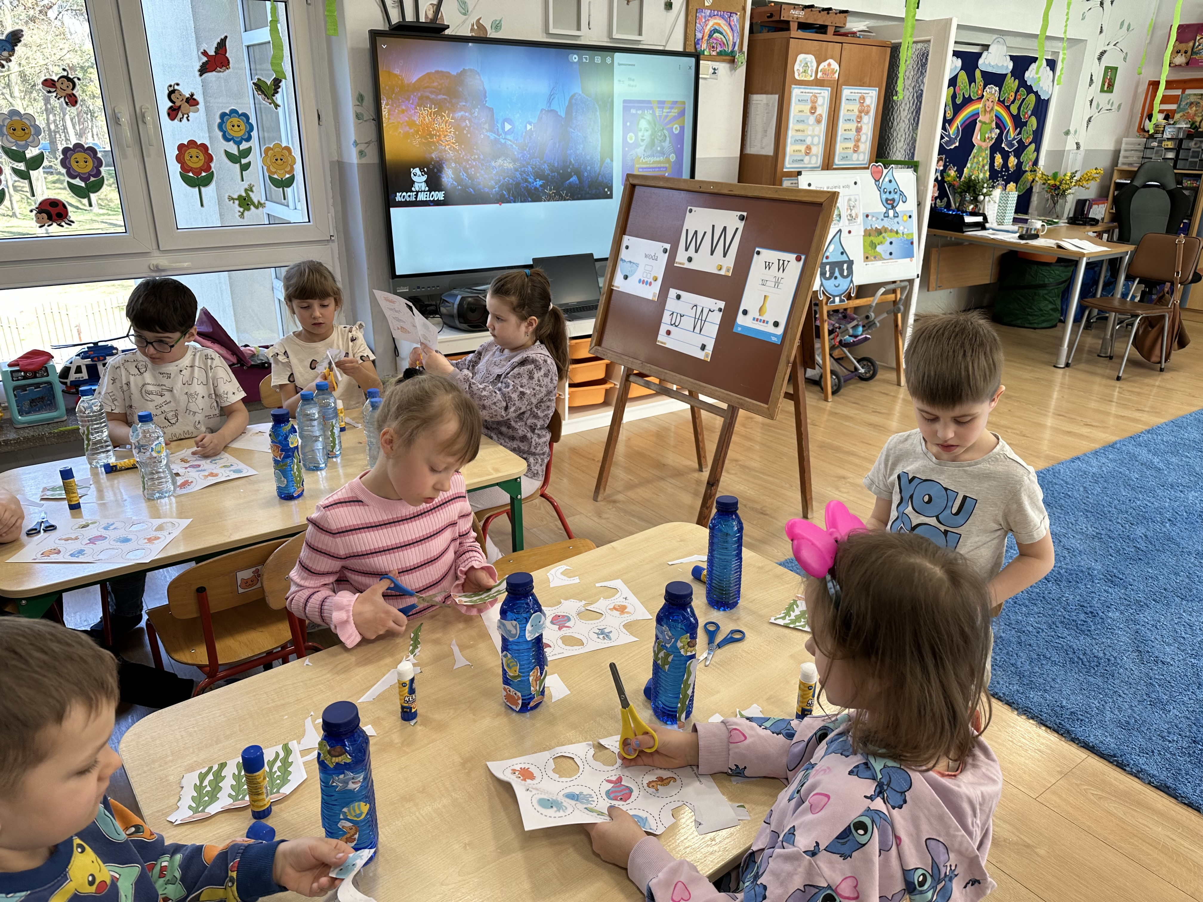 W poniedziałek przedszkolaki zapoznały się z opowiadaniem Marii Pawlisz pt. „Lubię deszcz, gdy jestem w domu”. Po wysłuchaniu tekstu dzieci zastanawiały się, jak należy zachować się podczas burzy i innych zjawisk przyrodniczych. Dodatkowo w trakcie zabawy „Wybuch złości jak wybuch wulkanu” rozwijały umiejętność rozmawiania o uczuciach i sytuacjach, które je wywołują. Zabawa „I am… and I do this…” była kontynuacją tej rozmowy. Dzieci podawały nazwy różnych stanów emocjonalnych z wykorzystaniem słów w języku angielskim i zastanawiały się, czy wszystkie uczucia są nam potrzebne. W trakcie indywidualnych zabaw przy stolikach określały, jak należy postępować, żeby uniknąć szkód związanych z żywiołami, wskazywały właściwe i niebezpieczne zachowania. Następnie brały udział w grach zespołowych z elementami rywalizacji. W dalszej części dnia sześciolatki zapoznały się z pozytywnymi i negatywnymi skutkami działania żywiołów, oglądały zdjęcia przedstawiające niszczycielskie działanie żywiołów i zjawisk pogodowych. Wtorek przedszkolaki zaczęły od rozmowy na temat piosenki „Cztery żywioły”, jej treści, tempie, nastroju i liczbie zwrotek. W drugiej części dnia poznały literę „w” małą i wielką, drukowaną i pisaną. Doskonaliły także słuch fonematyczny, podając przykłady słów rozpoczynających się głoską w, a także tropiły tę głoskę w środku wyrazów. Przedszkolaki dzieliły słowo „woda” na głoski, a następnie samodzielnie układały schemat głoskowy tego słowa z kartoników, przeliczały sylaby w tym wyrazie i dowiedziały się, kiedy głoska w traci dźwięczność. Zabawy przy stolikach stanowiły utrwalenie zdobytej w tym dniu wiedzy językowej. W środowy poranek podczas zabawy „Podajemy sobie skarb” dzieci rozwijały zmysł dotyku i świadomość sensoryczną. W trakcie indywidualnych zabaw przy stolikach utrwalały wiedzę na temat skarbów ziemi i ich wykorzystywania, przeliczały do 10 oraz ćwiczyły pamięć. W czwartek przybliżono dzieciom informacje na temat żywiołu ognia i znaków przeciwpożarowych. Podczas wspólnej rozmowy dzieci zastanawiały się nad negatywnymi skutkami ognia i poznawały, jak należy się zachować w przypadku pożaru oraz w jaki sposób opuszczać zadymione pomieszczenie. Pod koniec dnia w trakcie zabawy „Jak długi jest wąż strażacki?” dzieci doskonaliły umiejętności w zakresie mierzenia oraz posługiwania się linijką. W piątek słuchały wiersza pt. ,,Kłótnia wiatrów” Agnieszki Nożyńskiej‑Demianiuk i rozmawiały na temat jego treści. Wyjaśniały, co to znaczy ,,grać pierwsze skrzypce” i poszerzały swoją wiedzę dotycząca wiatru. Brały udział w zabawach rozwijających umiejętność kodowania i odróżniania prawej strony od lewej. Ćwiczyły pamięć słuchową podczas utrwalania słów piosenki o żywiołach oraz koncentrację uwagi i spostrzegawczość w trakcie integracyjnej zabawy „Który żywioł zmienił miejsce?”. W następnej części dnia dzieci wspólnie obserwowały eksperyment, który wyjaśnił im właściwości powietrza.