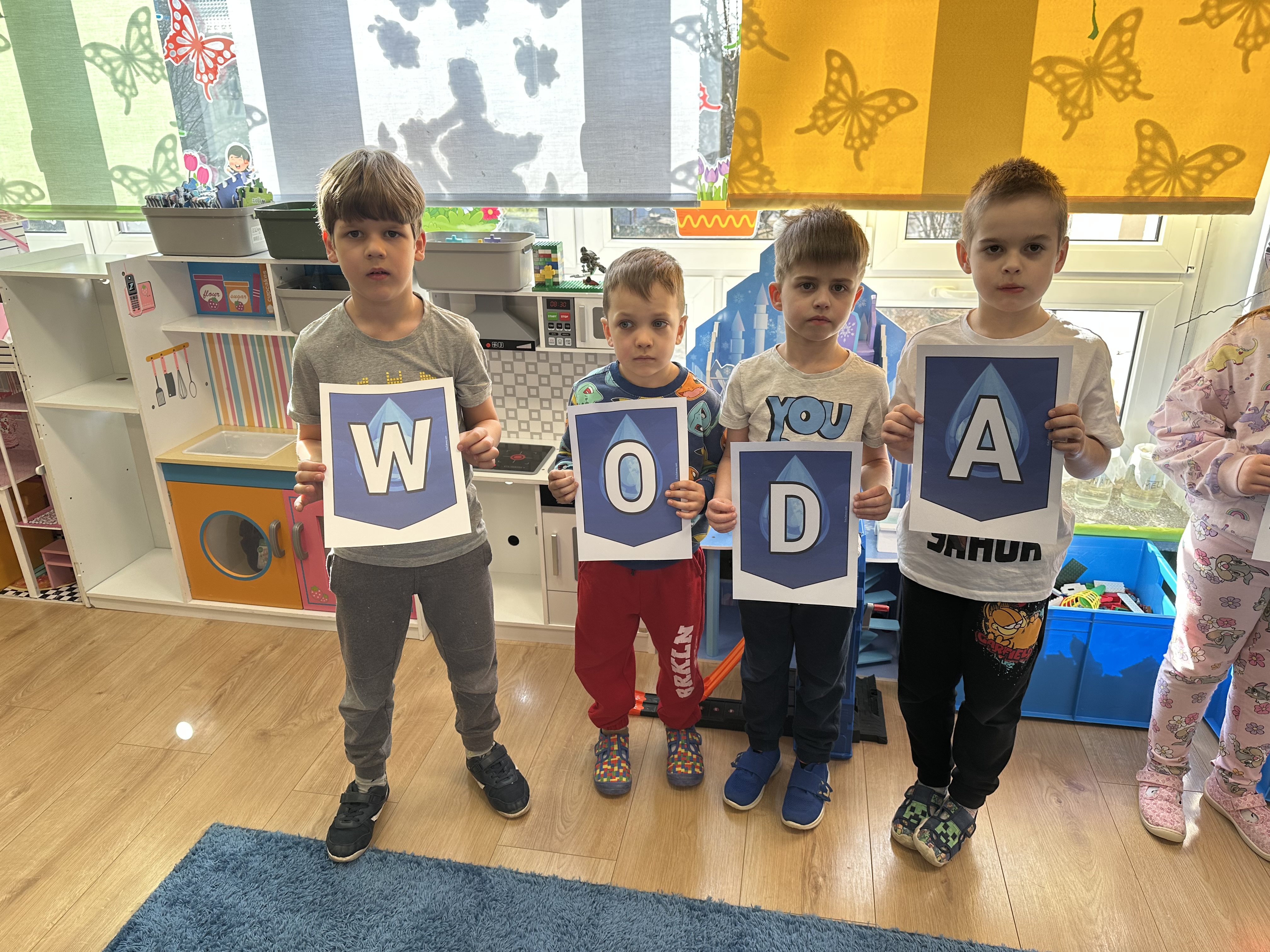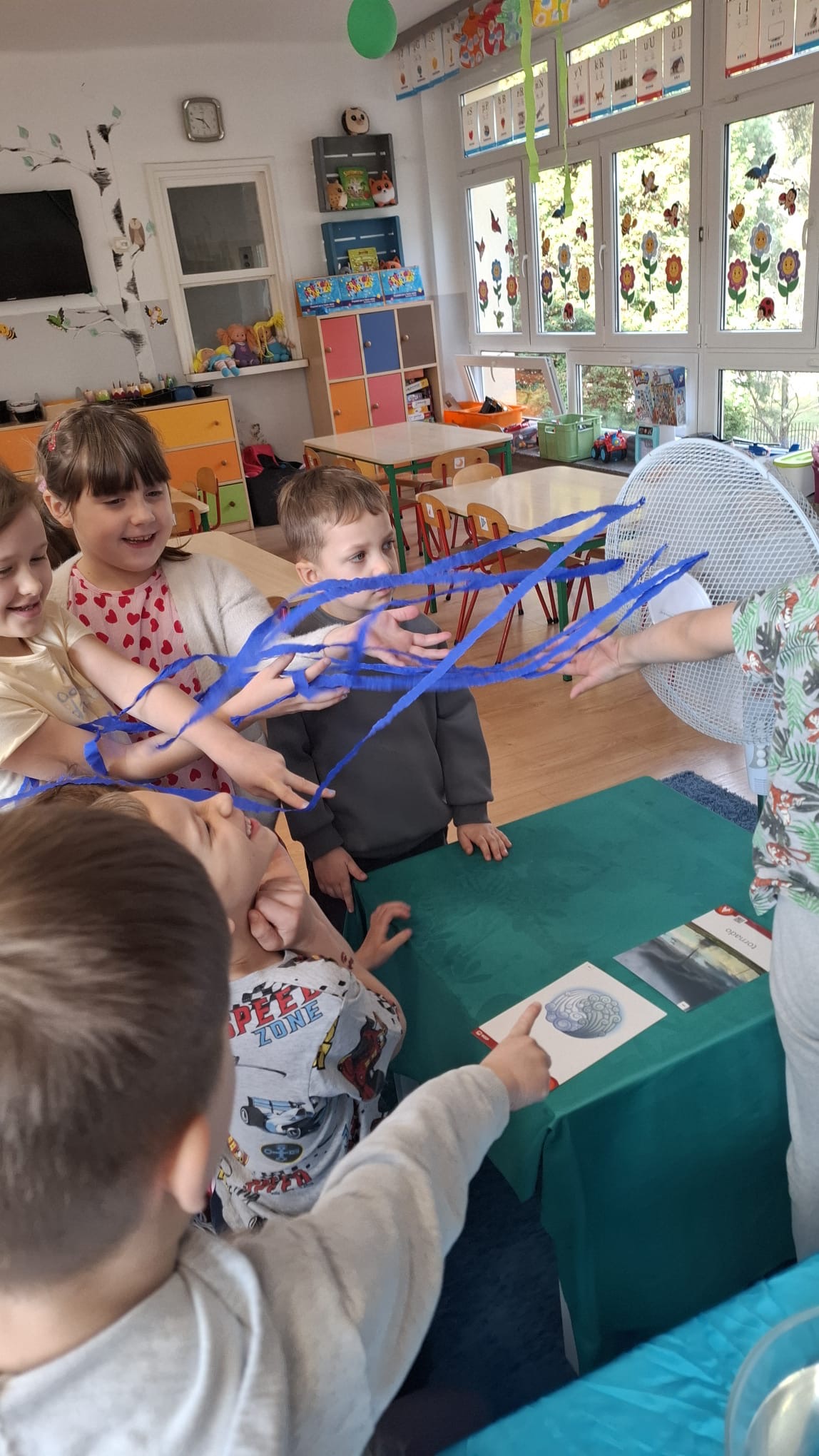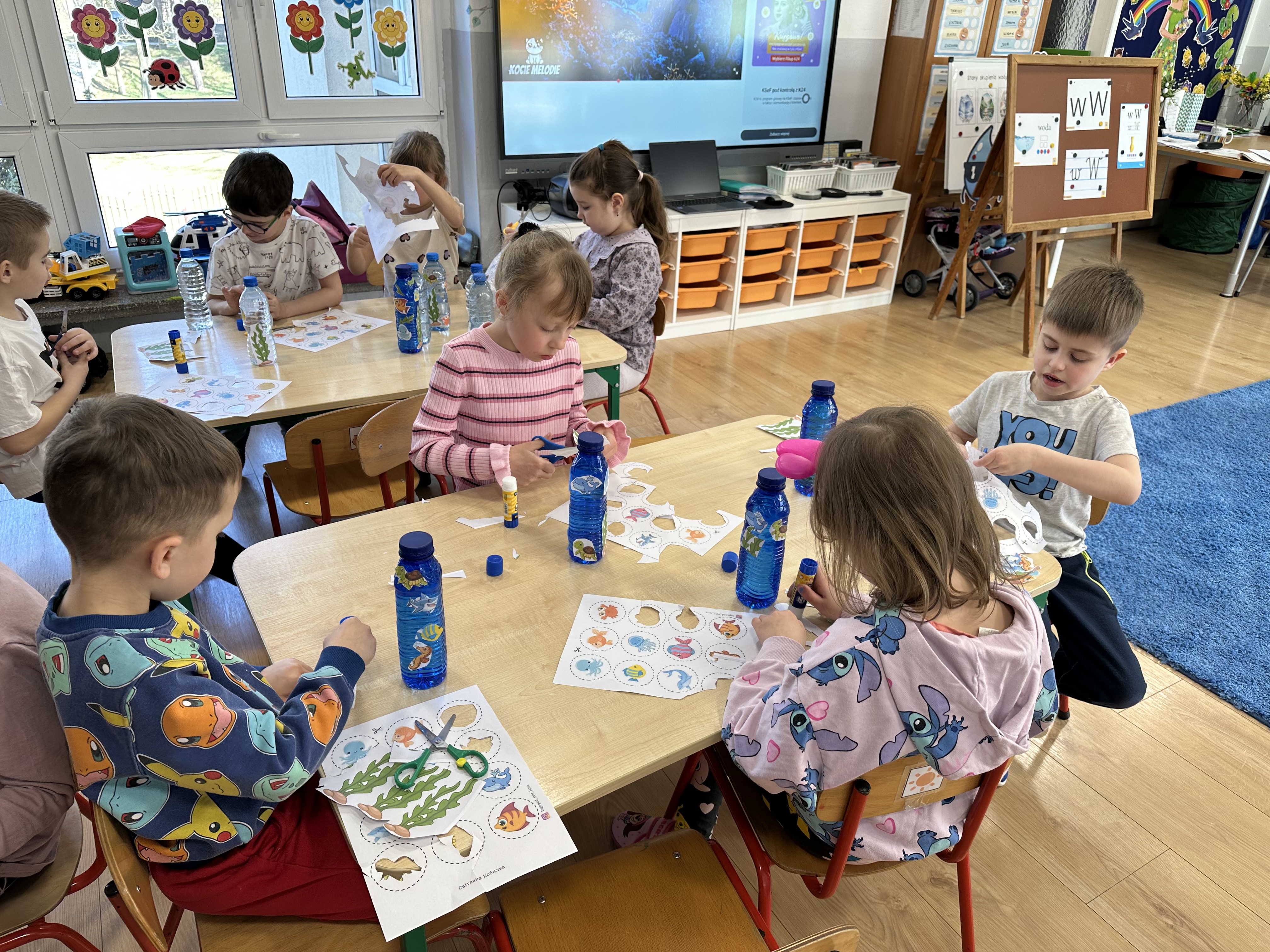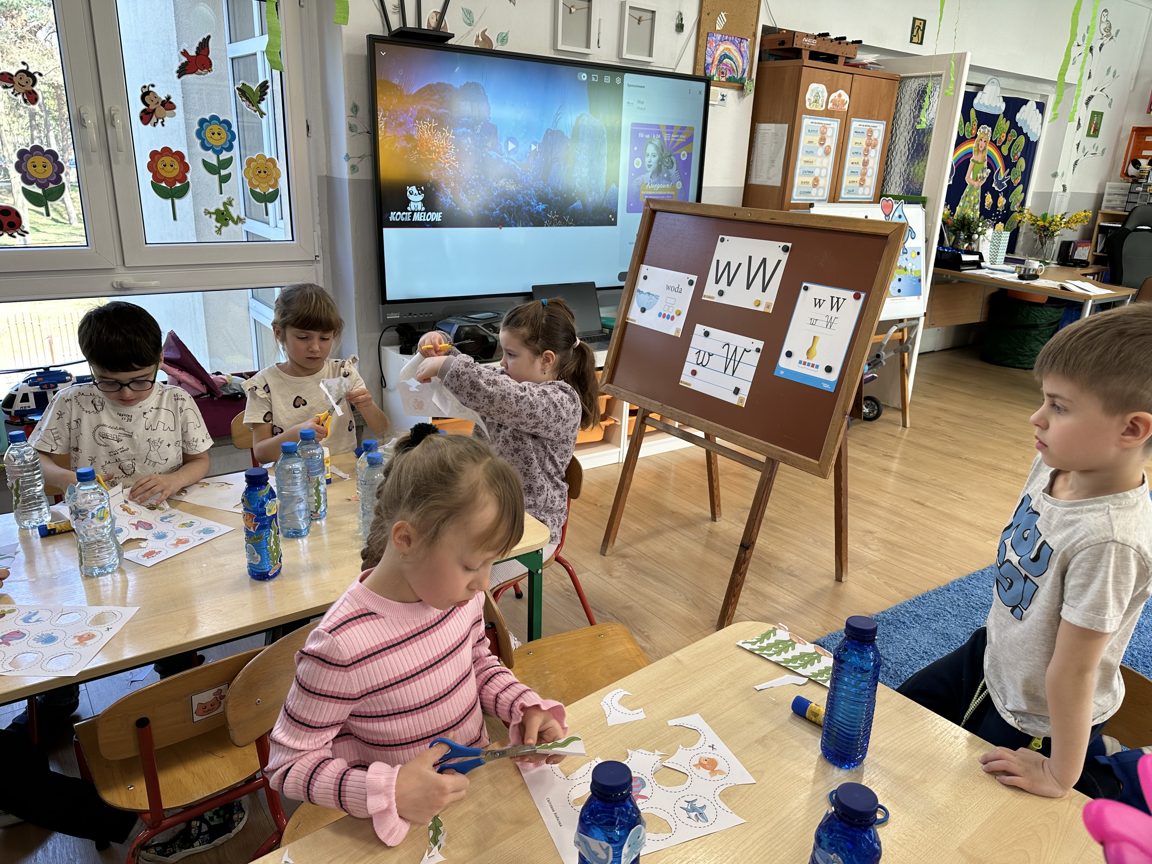 W poniedziałek przedszkolaki zapoznały się z opowiadaniem Marii Pawlisz pt. „Lubię deszcz, gdy jestem w domu”. Po wysłuchaniu tekstu dzieci zastanawiały się, jak należy zachować się podczas burzy i innych zjawisk przyrodniczych. Dodatkowo w trakcie zabawy „Wybuch złości jak wybuch wulkanu” rozwijały umiejętność rozmawiania o uczuciach i sytuacjach, które je wywołują. Zabawa „I am… and I do this…” była kontynuacją tej rozmowy. Dzieci podawały nazwy różnych stanów emocjonalnych z wykorzystaniem słów w języku angielskim i zastanawiały się, czy wszystkie uczucia są nam potrzebne. W trakcie indywidualnych zabaw przy stolikach określały, jak należy postępować, żeby uniknąć szkód związanych z żywiołami, wskazywały właściwe i niebezpieczne zachowania. Następnie brały udział w grach zespołowych z elementami rywalizacji. W dalszej części dnia sześciolatki zapoznały się z pozytywnymi i negatywnymi skutkami działania żywiołów, oglądały zdjęcia przedstawiające niszczycielskie działanie żywiołów i zjawisk pogodowych. Wtorek przedszkolaki zaczęły od rozmowy na temat piosenki „Cztery żywioły”, jej treści, tempie, nastroju i liczbie zwrotek. W drugiej części dnia poznały literę „w” małą i wielką, drukowaną i pisaną. Doskonaliły także słuch fonematyczny, podając przykłady słów rozpoczynających się głoską w, a także tropiły tę głoskę w środku wyrazów. Przedszkolaki dzieliły słowo „woda” na głoski, a następnie samodzielnie układały schemat głoskowy tego słowa z kartoników, przeliczały sylaby w tym wyrazie i dowiedziały się, kiedy głoska w traci dźwięczność. Zabawy przy stolikach stanowiły utrwalenie zdobytej w tym dniu wiedzy językowej. W środowy poranek podczas zabawy „Podajemy sobie skarb” dzieci rozwijały zmysł dotyku i świadomość sensoryczną. W trakcie indywidualnych zabaw przy stolikach utrwalały wiedzę na temat skarbów ziemi i ich wykorzystywania, przeliczały do 10 oraz ćwiczyły pamięć. W czwartek przybliżono dzieciom informacje na temat żywiołu ognia i znaków przeciwpożarowych. Podczas wspólnej rozmowy dzieci zastanawiały się nad negatywnymi skutkami ognia i poznawały, jak należy się zachować w przypadku pożaru oraz w jaki sposób opuszczać zadymione pomieszczenie. Pod koniec dnia w trakcie zabawy „Jak długi jest wąż strażacki?” dzieci doskonaliły umiejętności w zakresie mierzenia oraz posługiwania się linijką. W piątek słuchały wiersza pt. ,,Kłótnia wiatrów” Agnieszki Nożyńskiej‑Demianiuk i rozmawiały na temat jego treści. Wyjaśniały, co to znaczy ,,grać pierwsze skrzypce” i poszerzały swoją wiedzę dotycząca wiatru. Brały udział w zabawach rozwijających umiejętność kodowania i odróżniania prawej strony od lewej. Ćwiczyły pamięć słuchową podczas utrwalania słów piosenki o żywiołach oraz koncentrację uwagi i spostrzegawczość w trakcie integracyjnej zabawy „Który żywioł zmienił miejsce?”. W następnej części dnia dzieci wspólnie obserwowały eksperyment, który wyjaśnił im właściwości powietrza.