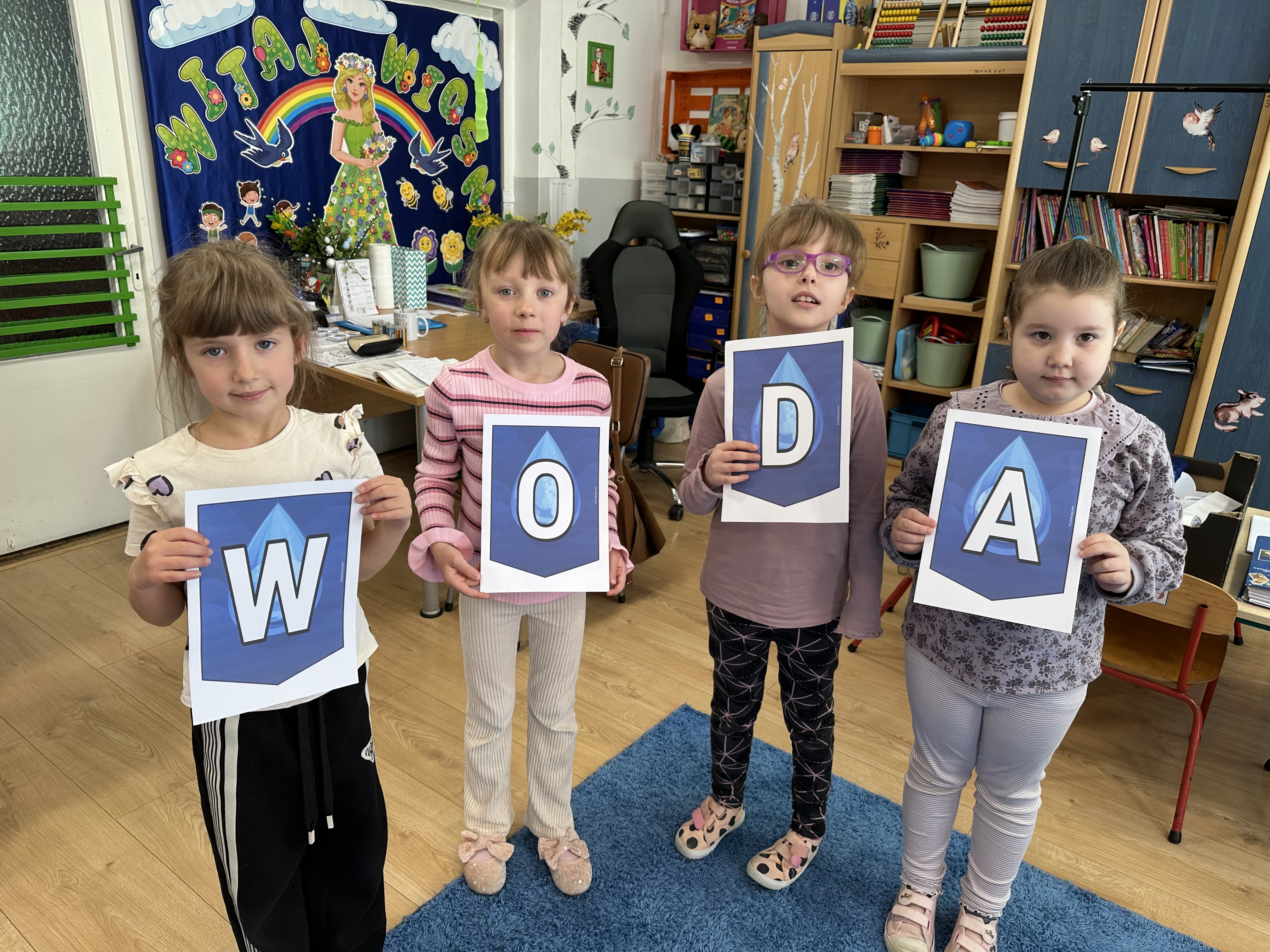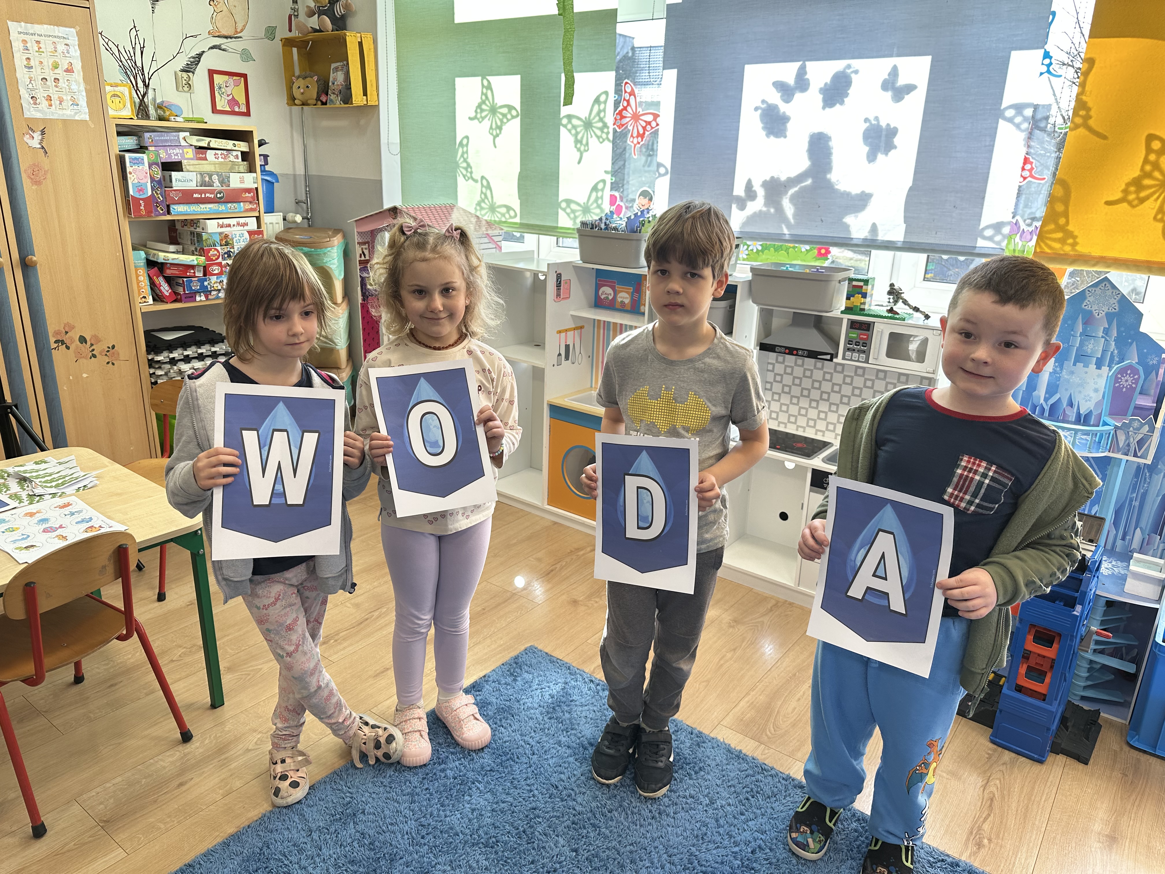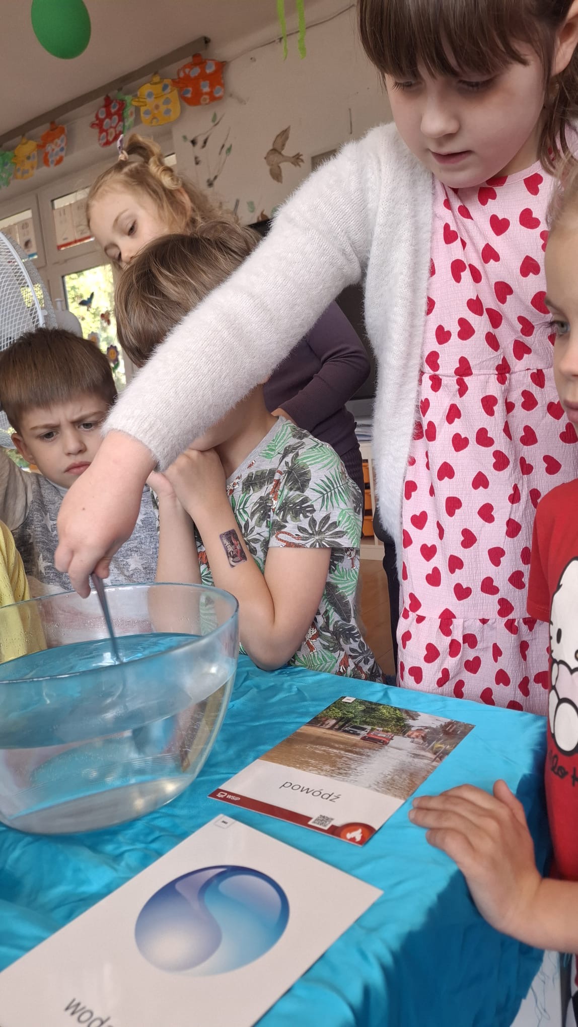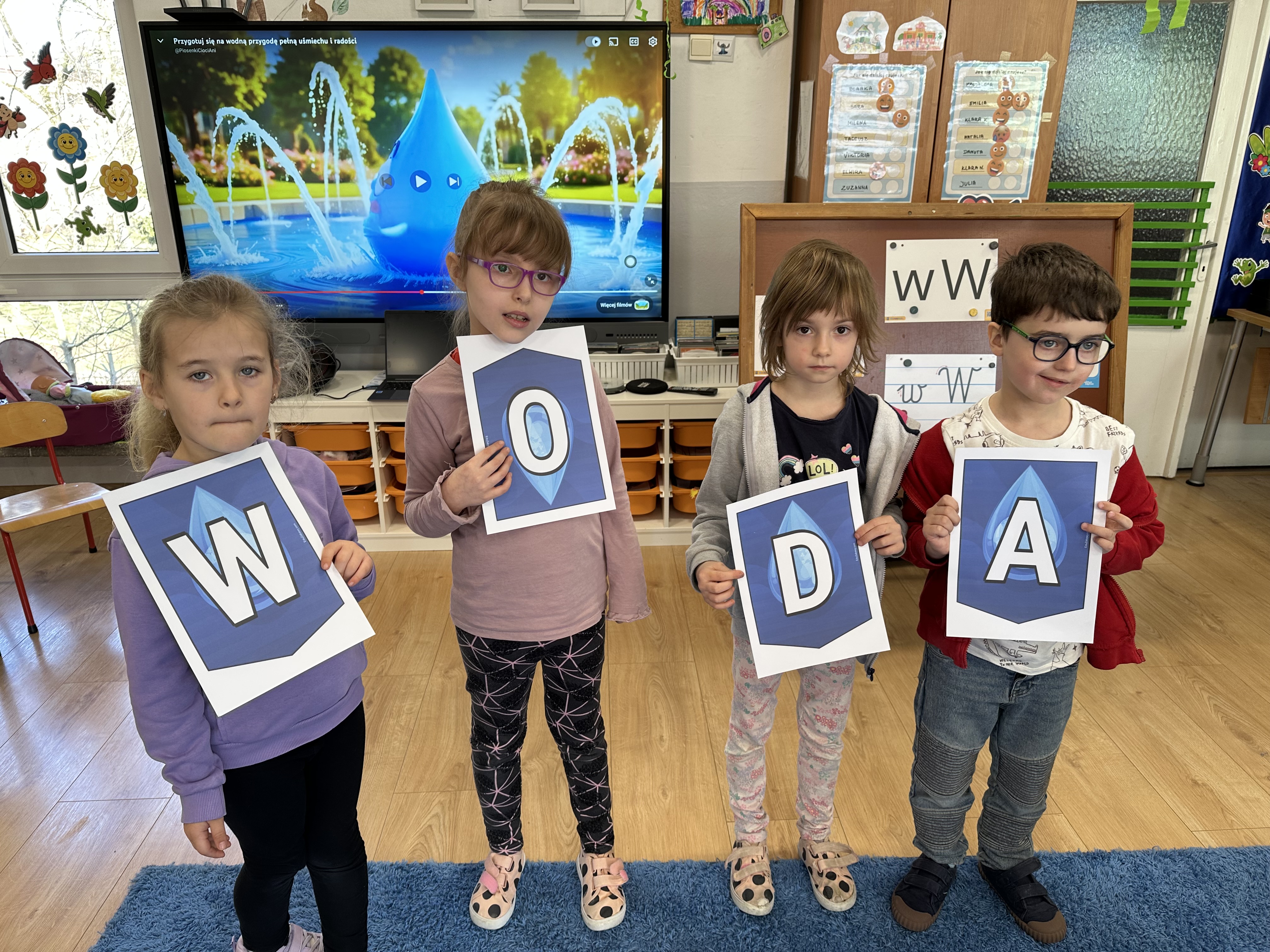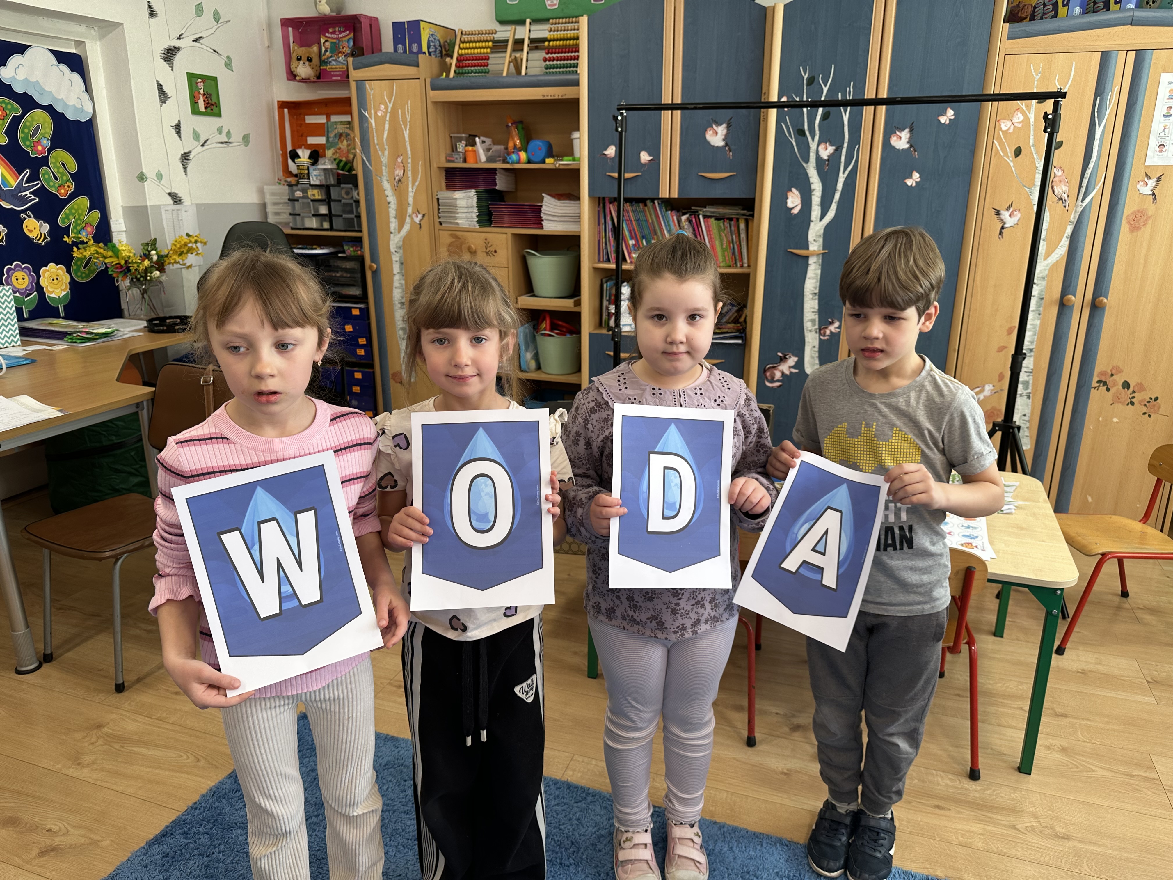 W poniedziałek przedszkolaki zapoznały się z opowiadaniem Marii Pawlisz pt. „Lubię deszcz, gdy jestem w domu”. Po wysłuchaniu tekstu dzieci zastanawiały się, jak należy zachować się podczas burzy i innych zjawisk przyrodniczych. Dodatkowo w trakcie zabawy „Wybuch złości jak wybuch wulkanu” rozwijały umiejętność rozmawiania o uczuciach i sytuacjach, które je wywołują. Zabawa „I am… and I do this…” była kontynuacją tej rozmowy. Dzieci podawały nazwy różnych stanów emocjonalnych z wykorzystaniem słów w języku angielskim i zastanawiały się, czy wszystkie uczucia są nam potrzebne. W trakcie indywidualnych zabaw przy stolikach określały, jak należy postępować, żeby uniknąć szkód związanych z żywiołami, wskazywały właściwe i niebezpieczne zachowania. Następnie brały udział w grach zespołowych z elementami rywalizacji. W dalszej części dnia sześciolatki zapoznały się z pozytywnymi i negatywnymi skutkami działania żywiołów, oglądały zdjęcia przedstawiające niszczycielskie działanie żywiołów i zjawisk pogodowych. Wtorek przedszkolaki zaczęły od rozmowy na temat piosenki „Cztery żywioły”, jej treści, tempie, nastroju i liczbie zwrotek. W drugiej części dnia poznały literę „w” małą i wielką, drukowaną i pisaną. Doskonaliły także słuch fonematyczny, podając przykłady słów rozpoczynających się głoską w, a także tropiły tę głoskę w środku wyrazów. Przedszkolaki dzieliły słowo „woda” na głoski, a następnie samodzielnie układały schemat głoskowy tego słowa z kartoników, przeliczały sylaby w tym wyrazie i dowiedziały się, kiedy głoska w traci dźwięczność. Zabawy przy stolikach stanowiły utrwalenie zdobytej w tym dniu wiedzy językowej. W środowy poranek podczas zabawy „Podajemy sobie skarb” dzieci rozwijały zmysł dotyku i świadomość sensoryczną. W trakcie indywidualnych zabaw przy stolikach utrwalały wiedzę na temat skarbów ziemi i ich wykorzystywania, przeliczały do 10 oraz ćwiczyły pamięć. W czwartek przybliżono dzieciom informacje na temat żywiołu ognia i znaków przeciwpożarowych. Podczas wspólnej rozmowy dzieci zastanawiały się nad negatywnymi skutkami ognia i poznawały, jak należy się zachować w przypadku pożaru oraz w jaki sposób opuszczać zadymione pomieszczenie. Pod koniec dnia w trakcie zabawy „Jak długi jest wąż strażacki?” dzieci doskonaliły umiejętności w zakresie mierzenia oraz posługiwania się linijką. W piątek słuchały wiersza pt. ,,Kłótnia wiatrów” Agnieszki Nożyńskiej‑Demianiuk i rozmawiały na temat jego treści. Wyjaśniały, co to znaczy ,,grać pierwsze skrzypce” i poszerzały swoją wiedzę dotycząca wiatru. Brały udział w zabawach rozwijających umiejętność kodowania i odróżniania prawej strony od lewej. Ćwiczyły pamięć słuchową podczas utrwalania słów piosenki o żywiołach oraz koncentrację uwagi i spostrzegawczość w trakcie integracyjnej zabawy „Który żywioł zmienił miejsce?”. W następnej części dnia dzieci wspólnie obserwowały eksperyment, który wyjaśnił im właściwości powietrza.