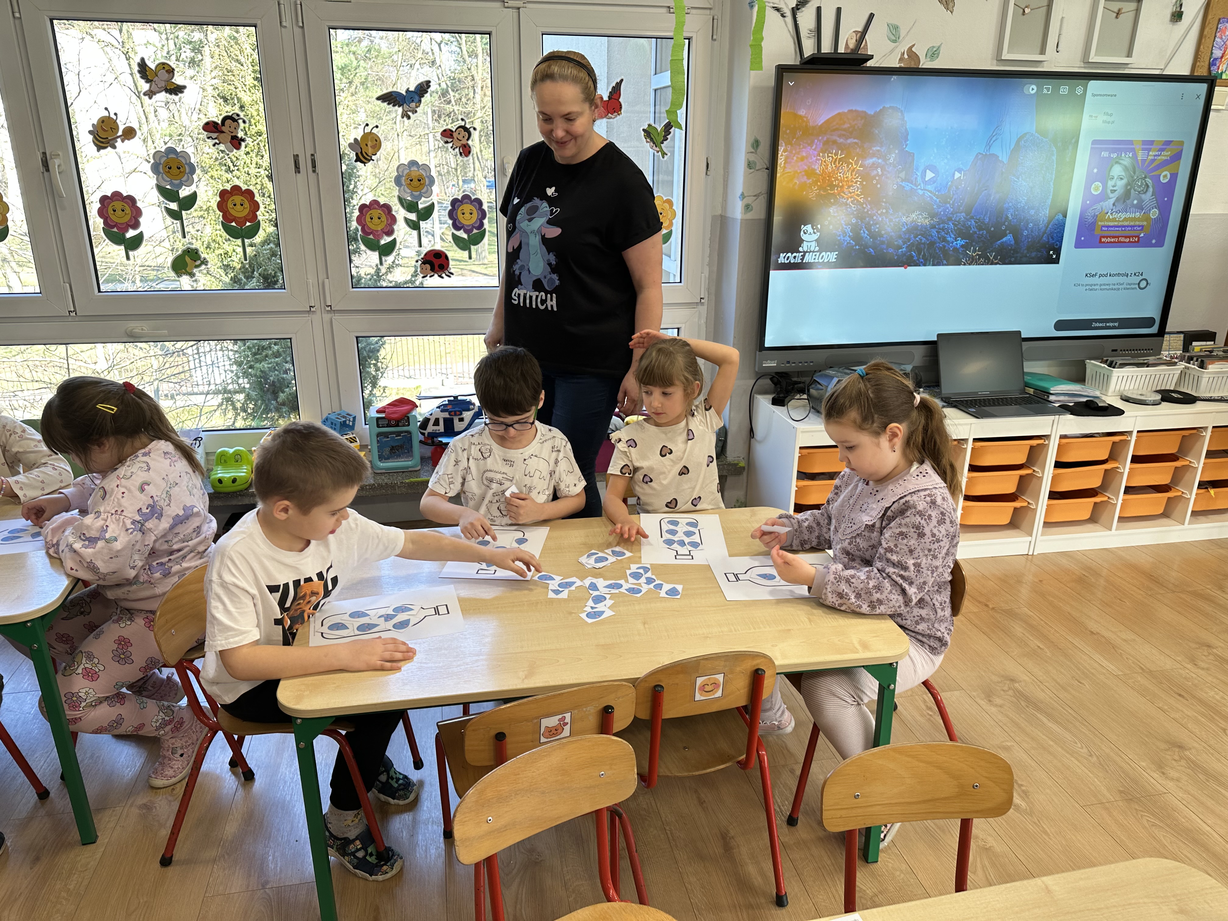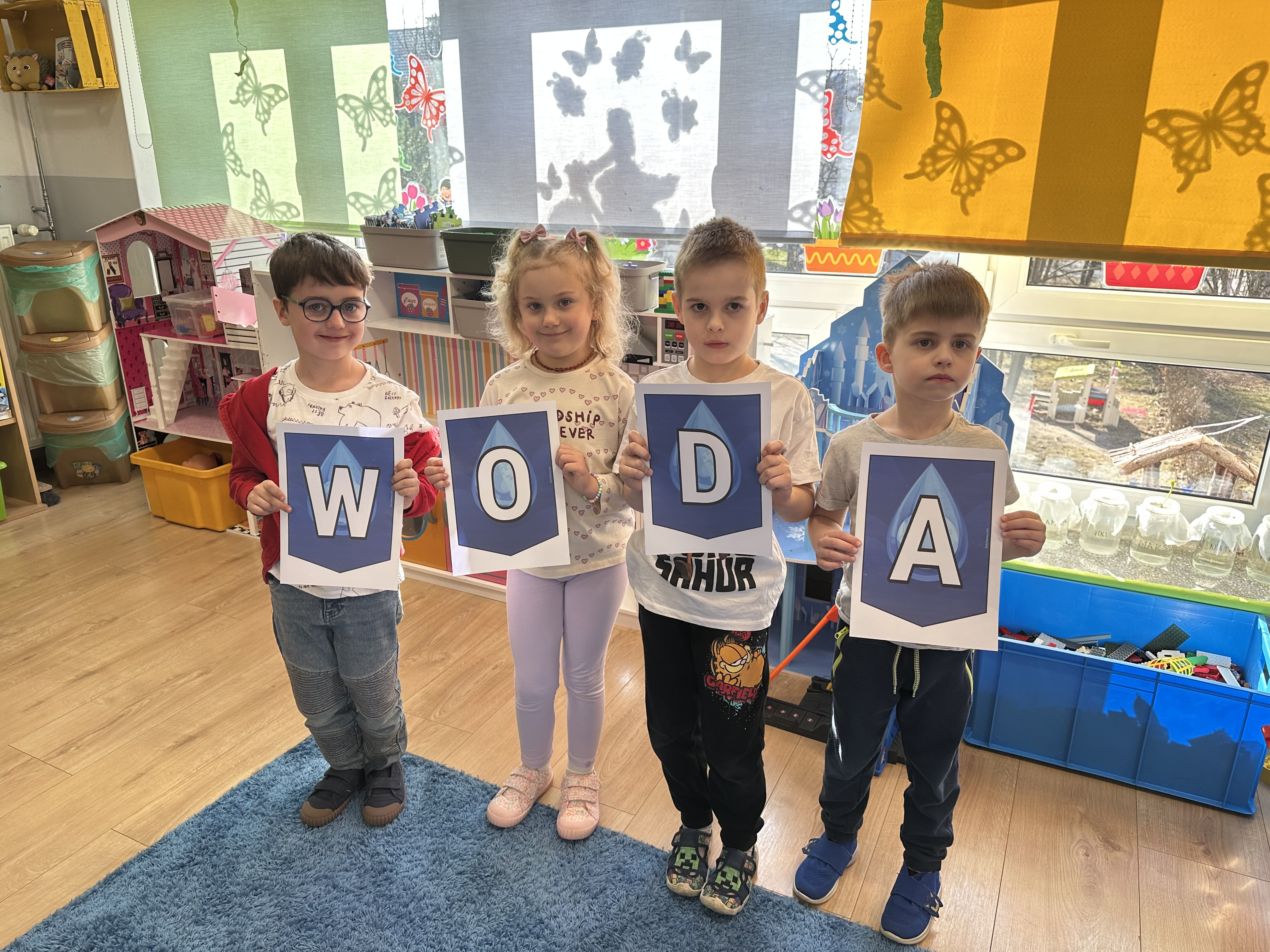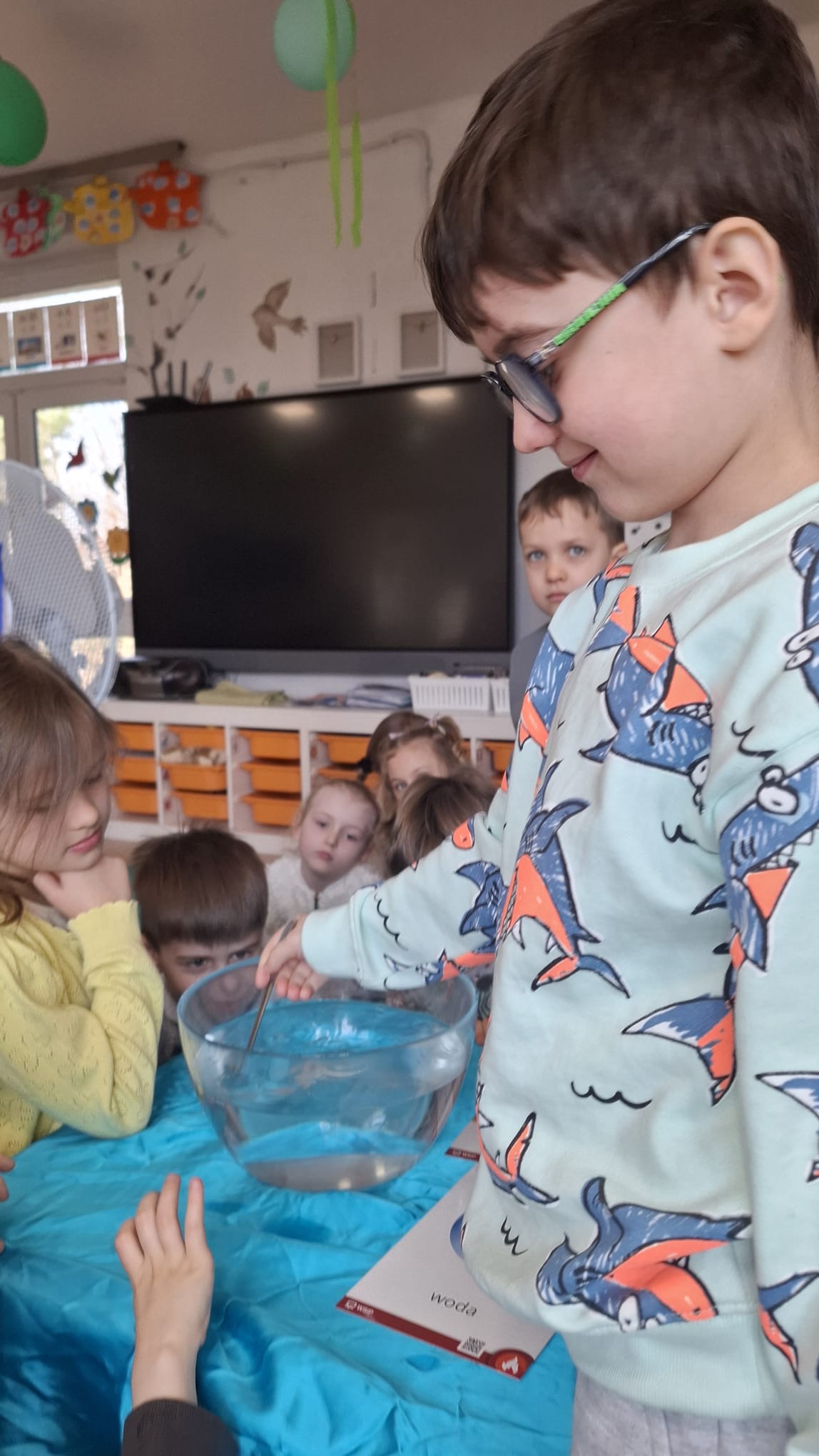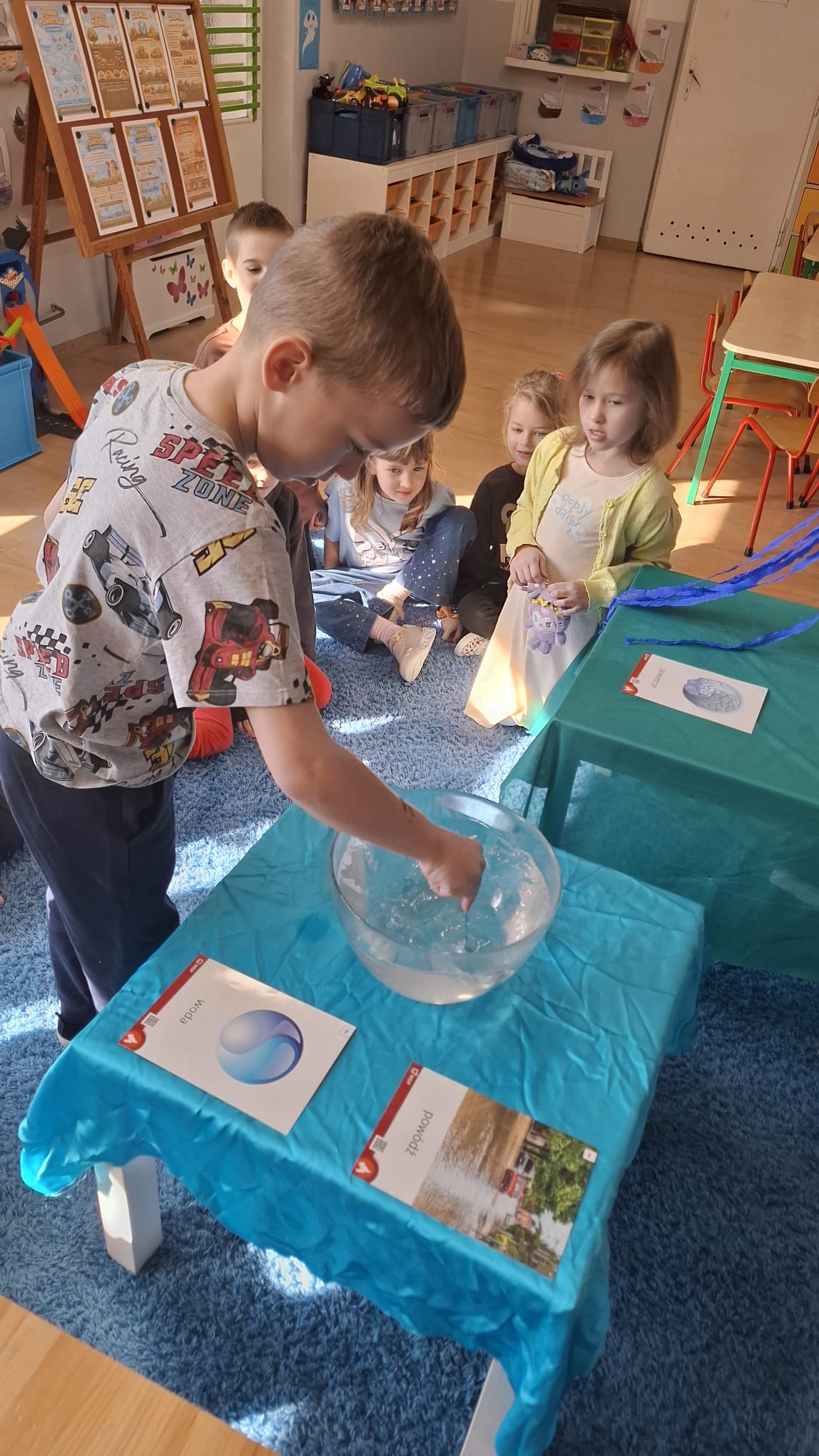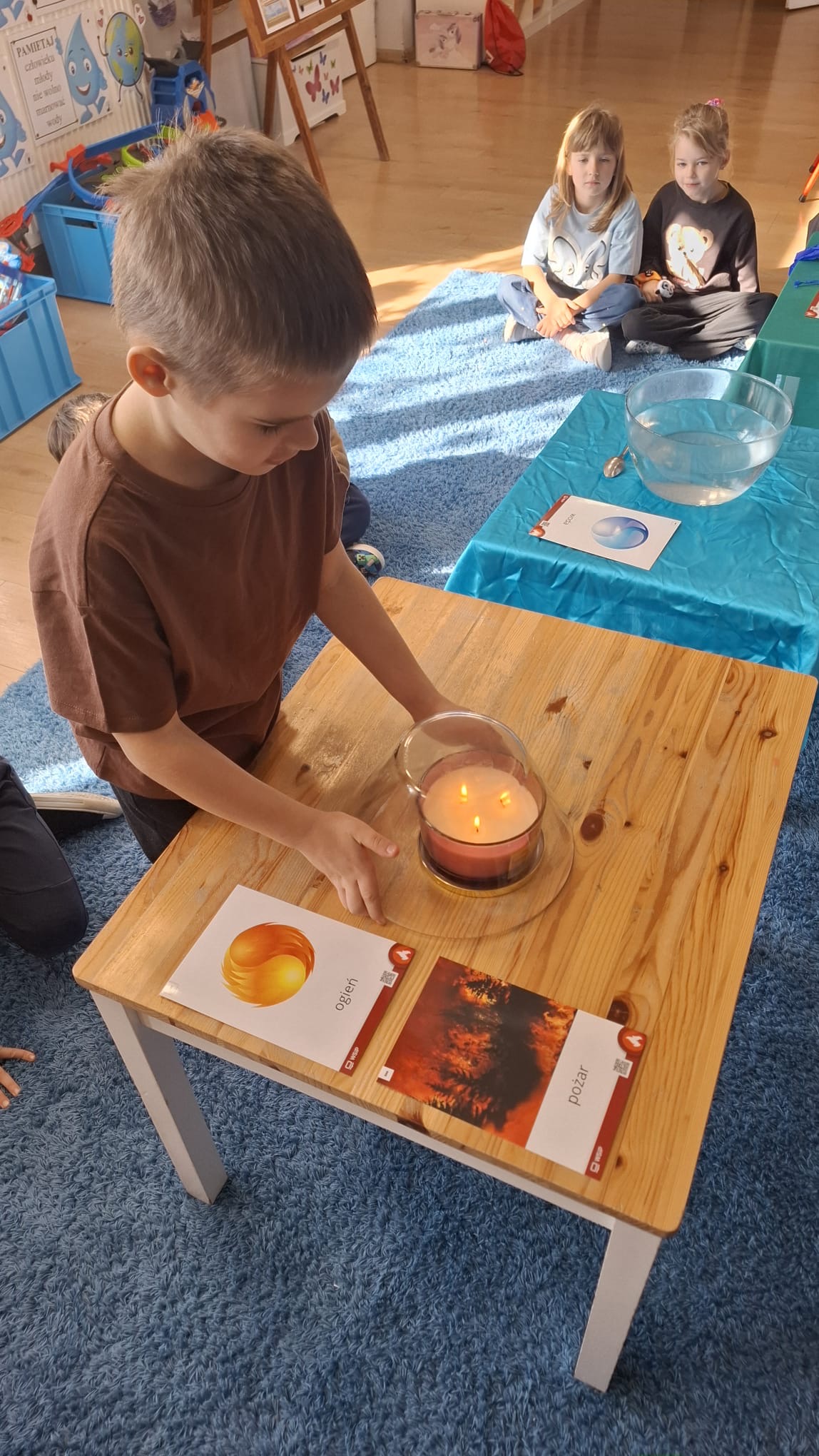 W poniedziałek przedszkolaki zapoznały się z opowiadaniem Marii Pawlisz pt. „Lubię deszcz, gdy jestem w domu”. Po wysłuchaniu tekstu dzieci zastanawiały się, jak należy zachować się podczas burzy i innych zjawisk przyrodniczych. Dodatkowo w trakcie zabawy „Wybuch złości jak wybuch wulkanu” rozwijały umiejętność rozmawiania o uczuciach i sytuacjach, które je wywołują. Zabawa „I am… and I do this…” była kontynuacją tej rozmowy. Dzieci podawały nazwy różnych stanów emocjonalnych z wykorzystaniem słów w języku angielskim i zastanawiały się, czy wszystkie uczucia są nam potrzebne. W trakcie indywidualnych zabaw przy stolikach określały, jak należy postępować, żeby uniknąć szkód związanych z żywiołami, wskazywały właściwe i niebezpieczne zachowania. Następnie brały udział w grach zespołowych z elementami rywalizacji. W dalszej części dnia sześciolatki zapoznały się z pozytywnymi i negatywnymi skutkami działania żywiołów, oglądały zdjęcia przedstawiające niszczycielskie działanie żywiołów i zjawisk pogodowych. Wtorek przedszkolaki zaczęły od rozmowy na temat piosenki „Cztery żywioły”, jej treści, tempie, nastroju i liczbie zwrotek. W drugiej części dnia poznały literę „w” małą i wielką, drukowaną i pisaną. Doskonaliły także słuch fonematyczny, podając przykłady słów rozpoczynających się głoską w, a także tropiły tę głoskę w środku wyrazów. Przedszkolaki dzieliły słowo „woda” na głoski, a następnie samodzielnie układały schemat głoskowy tego słowa z kartoników, przeliczały sylaby w tym wyrazie i dowiedziały się, kiedy głoska w traci dźwięczność. Zabawy przy stolikach stanowiły utrwalenie zdobytej w tym dniu wiedzy językowej. W środowy poranek podczas zabawy „Podajemy sobie skarb” dzieci rozwijały zmysł dotyku i świadomość sensoryczną. W trakcie indywidualnych zabaw przy stolikach utrwalały wiedzę na temat skarbów ziemi i ich wykorzystywania, przeliczały do 10 oraz ćwiczyły pamięć. W czwartek przybliżono dzieciom informacje na temat żywiołu ognia i znaków przeciwpożarowych. Podczas wspólnej rozmowy dzieci zastanawiały się nad negatywnymi skutkami ognia i poznawały, jak należy się zachować w przypadku pożaru oraz w jaki sposób opuszczać zadymione pomieszczenie. Pod koniec dnia w trakcie zabawy „Jak długi jest wąż strażacki?” dzieci doskonaliły umiejętności w zakresie mierzenia oraz posługiwania się linijką. W piątek słuchały wiersza pt. ,,Kłótnia wiatrów” Agnieszki Nożyńskiej‑Demianiuk i rozmawiały na temat jego treści. Wyjaśniały, co to znaczy ,,grać pierwsze skrzypce” i poszerzały swoją wiedzę dotycząca wiatru. Brały udział w zabawach rozwijających umiejętność kodowania i odróżniania prawej strony od lewej. Ćwiczyły pamięć słuchową podczas utrwalania słów piosenki o żywiołach oraz koncentrację uwagi i spostrzegawczość w trakcie integracyjnej zabawy „Który żywioł zmienił miejsce?”. W następnej części dnia dzieci wspólnie obserwowały eksperyment, który wyjaśnił im właściwości powietrza.