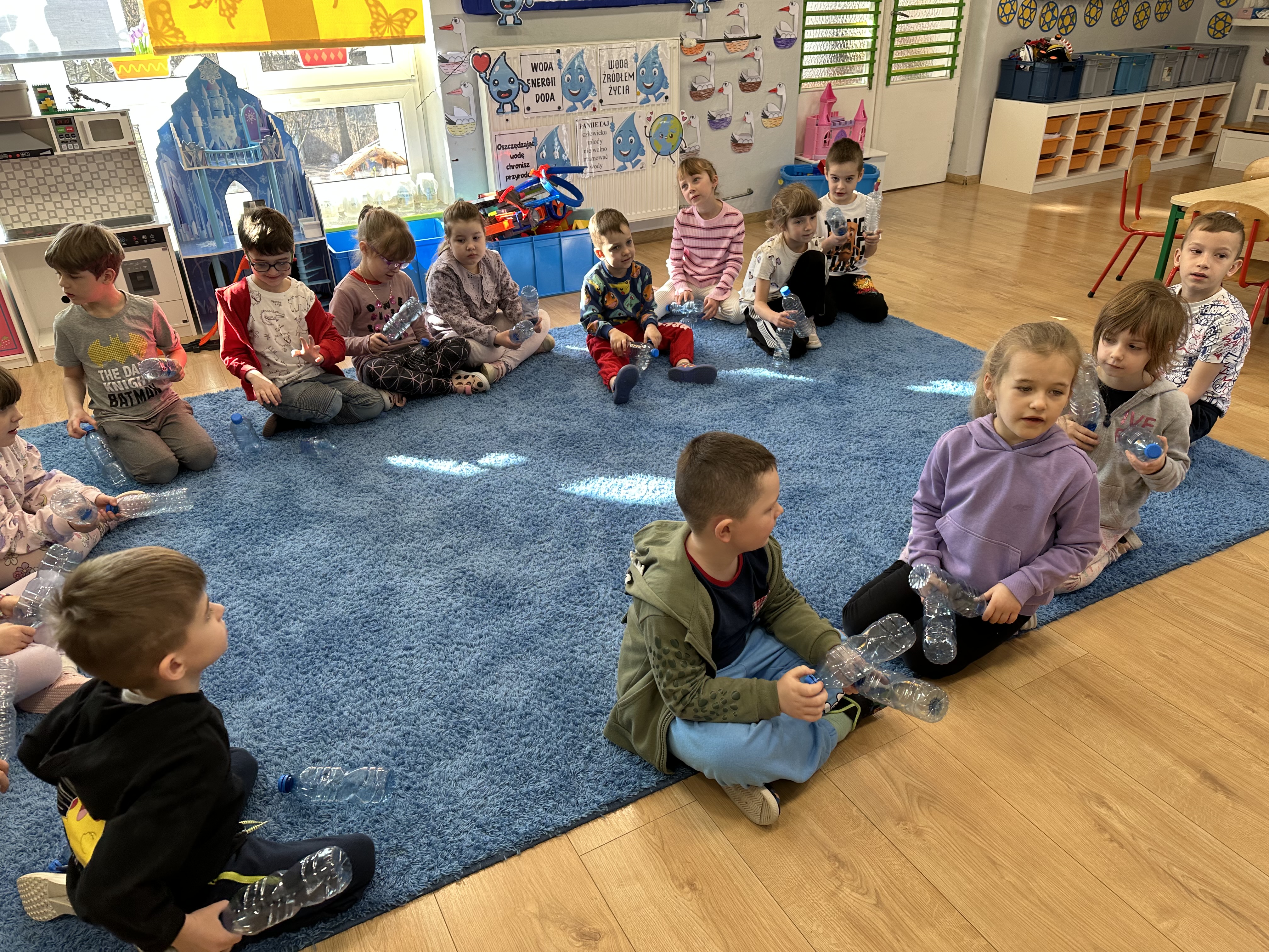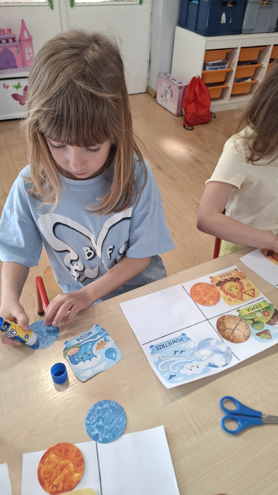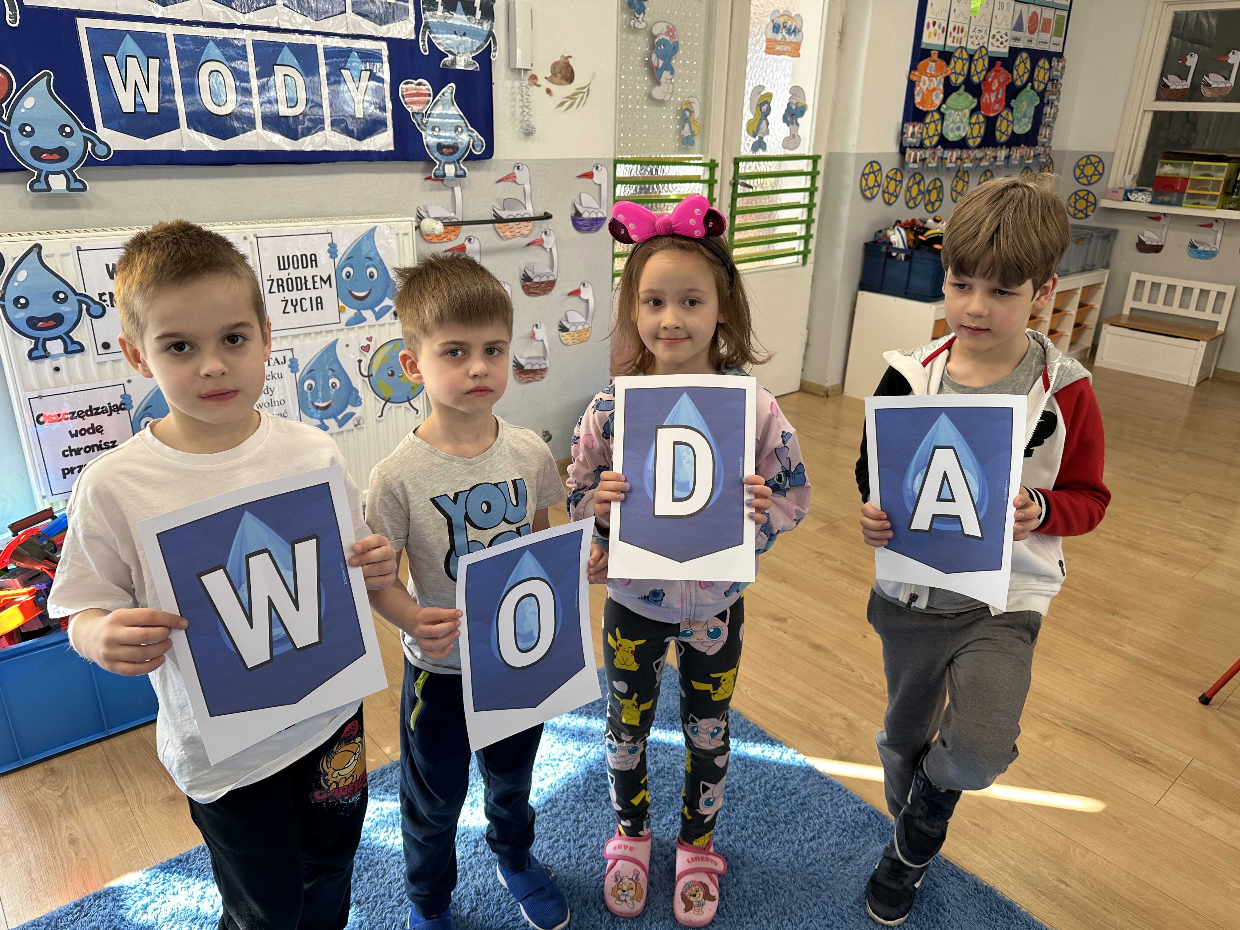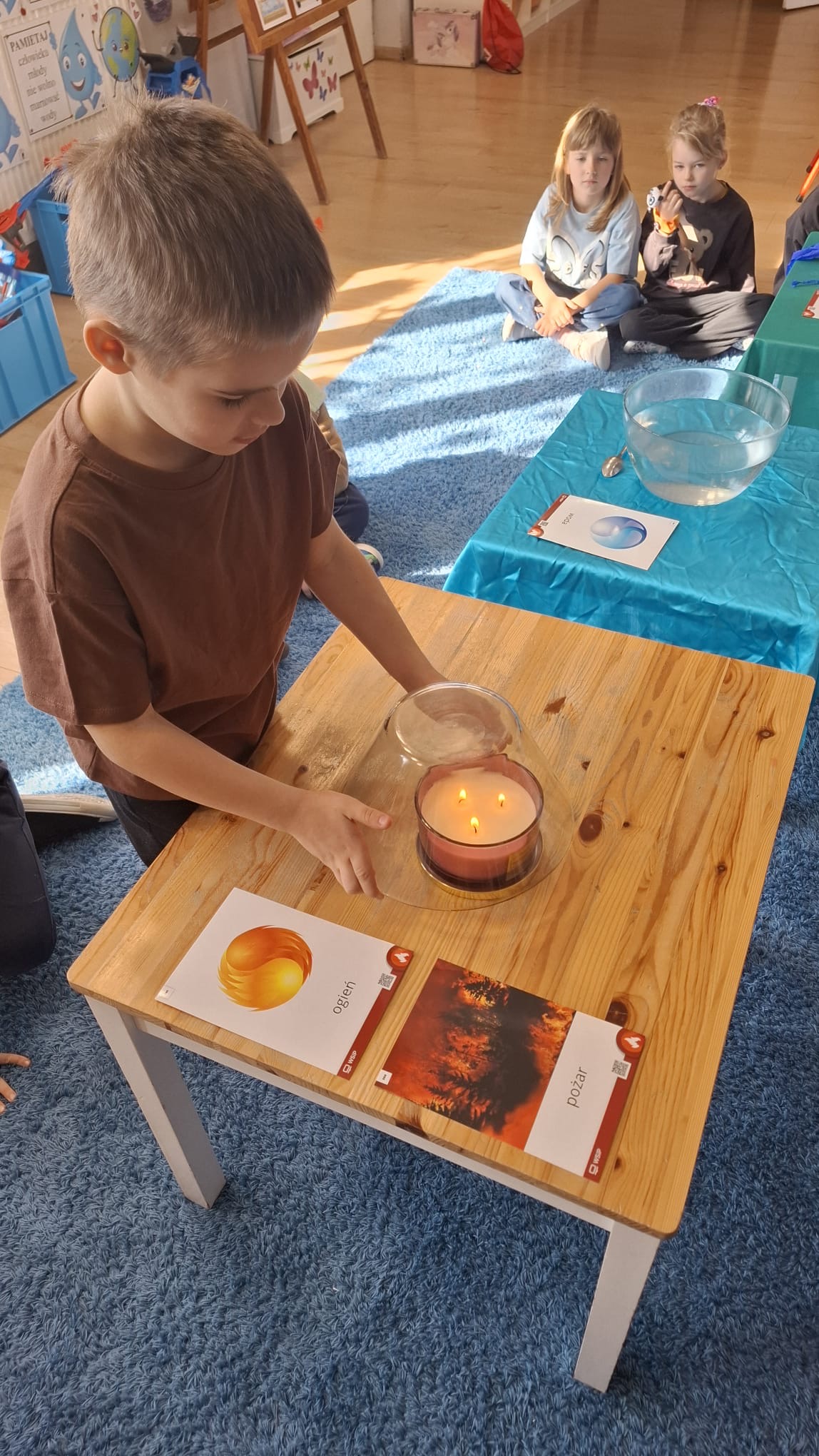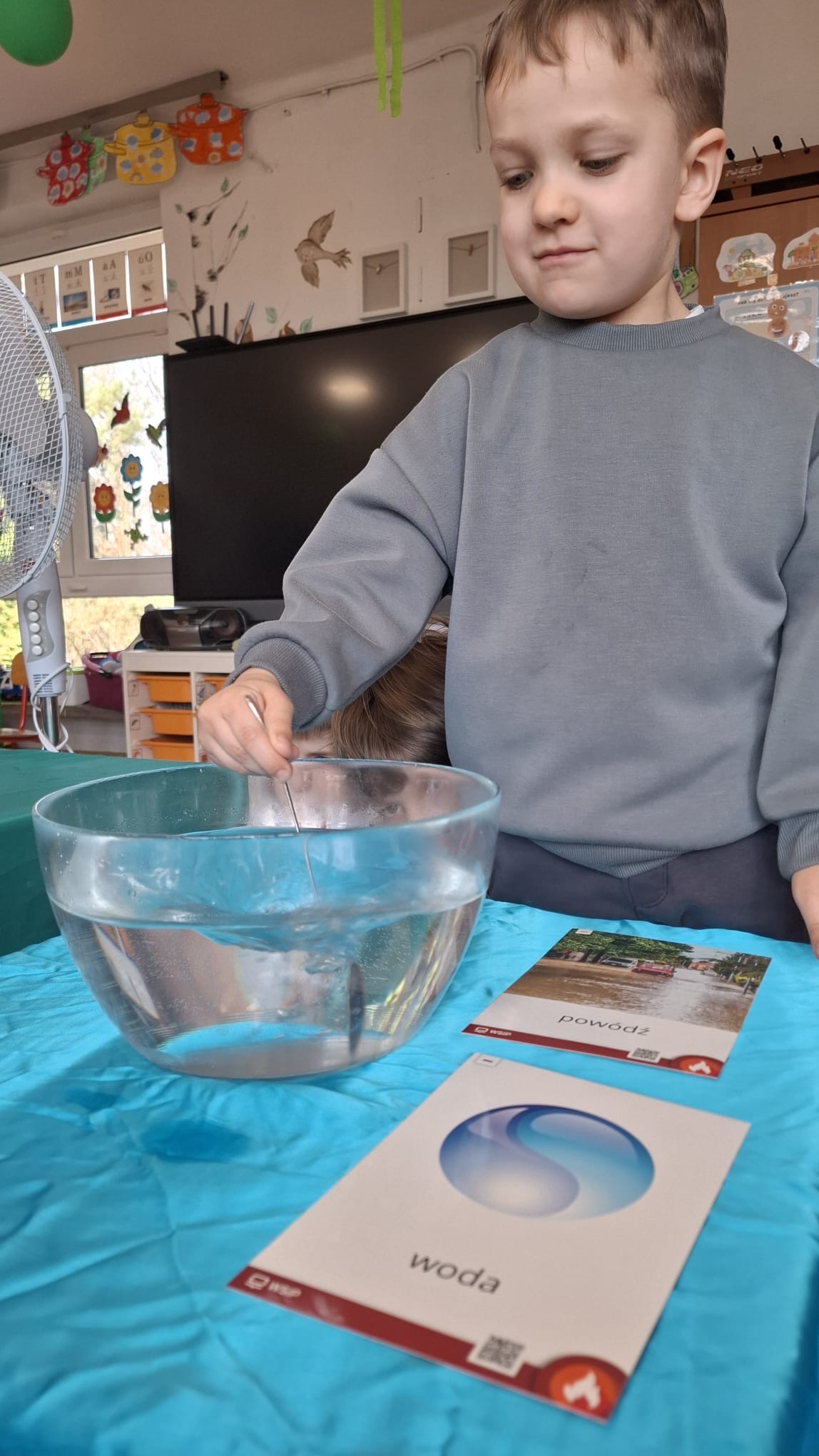 W poniedziałek przedszkolaki zapoznały się z opowiadaniem Marii Pawlisz pt. „Lubię deszcz, gdy jestem w domu”. Po wysłuchaniu tekstu dzieci zastanawiały się, jak należy zachować się podczas burzy i innych zjawisk przyrodniczych. Dodatkowo w trakcie zabawy „Wybuch złości jak wybuch wulkanu” rozwijały umiejętność rozmawiania o uczuciach i sytuacjach, które je wywołują. Zabawa „I am… and I do this…” była kontynuacją tej rozmowy. Dzieci podawały nazwy różnych stanów emocjonalnych z wykorzystaniem słów w języku angielskim i zastanawiały się, czy wszystkie uczucia są nam potrzebne. W trakcie indywidualnych zabaw przy stolikach określały, jak należy postępować, żeby uniknąć szkód związanych z żywiołami, wskazywały właściwe i niebezpieczne zachowania. Następnie brały udział w grach zespołowych z elementami rywalizacji. W dalszej części dnia sześciolatki zapoznały się z pozytywnymi i negatywnymi skutkami działania żywiołów, oglądały zdjęcia przedstawiające niszczycielskie działanie żywiołów i zjawisk pogodowych. Wtorek przedszkolaki zaczęły od rozmowy na temat piosenki „Cztery żywioły”, jej treści, tempie, nastroju i liczbie zwrotek. W drugiej części dnia poznały literę „w” małą i wielką, drukowaną i pisaną. Doskonaliły także słuch fonematyczny, podając przykłady słów rozpoczynających się głoską w, a także tropiły tę głoskę w środku wyrazów. Przedszkolaki dzieliły słowo „woda” na głoski, a następnie samodzielnie układały schemat głoskowy tego słowa z kartoników, przeliczały sylaby w tym wyrazie i dowiedziały się, kiedy głoska w traci dźwięczność. Zabawy przy stolikach stanowiły utrwalenie zdobytej w tym dniu wiedzy językowej. W środowy poranek podczas zabawy „Podajemy sobie skarb” dzieci rozwijały zmysł dotyku i świadomość sensoryczną. W trakcie indywidualnych zabaw przy stolikach utrwalały wiedzę na temat skarbów ziemi i ich wykorzystywania, przeliczały do 10 oraz ćwiczyły pamięć. W czwartek przybliżono dzieciom informacje na temat żywiołu ognia i znaków przeciwpożarowych. Podczas wspólnej rozmowy dzieci zastanawiały się nad negatywnymi skutkami ognia i poznawały, jak należy się zachować w przypadku pożaru oraz w jaki sposób opuszczać zadymione pomieszczenie. Pod koniec dnia w trakcie zabawy „Jak długi jest wąż strażacki?” dzieci doskonaliły umiejętności w zakresie mierzenia oraz posługiwania się linijką. W piątek słuchały wiersza pt. ,,Kłótnia wiatrów” Agnieszki Nożyńskiej‑Demianiuk i rozmawiały na temat jego treści. Wyjaśniały, co to znaczy ,,grać pierwsze skrzypce” i poszerzały swoją wiedzę dotycząca wiatru. Brały udział w zabawach rozwijających umiejętność kodowania i odróżniania prawej strony od lewej. Ćwiczyły pamięć słuchową podczas utrwalania słów piosenki o żywiołach oraz koncentrację uwagi i spostrzegawczość w trakcie integracyjnej zabawy „Który żywioł zmienił miejsce?”. W następnej części dnia dzieci wspólnie obserwowały eksperyment, który wyjaśnił im właściwości powietrza.