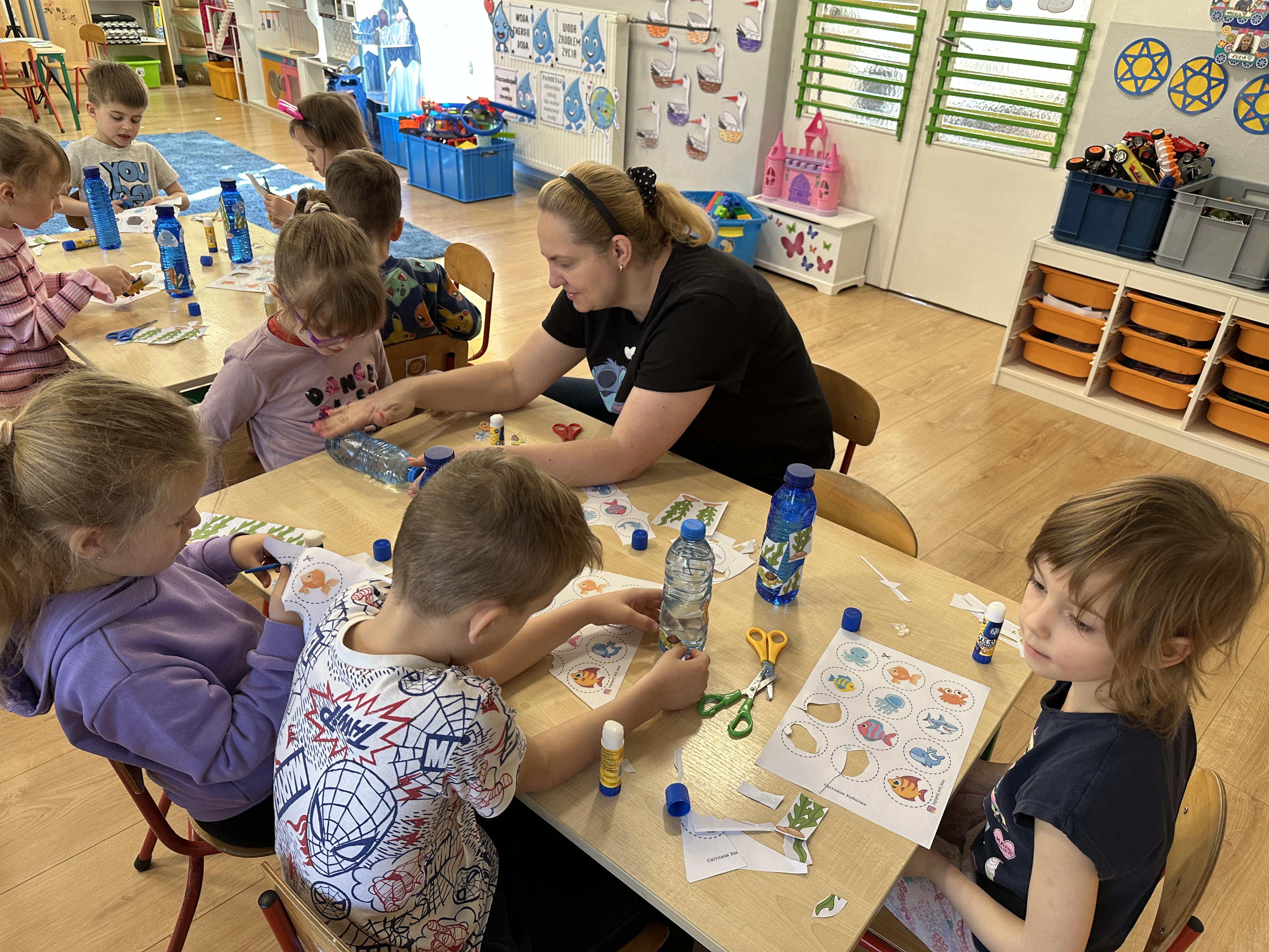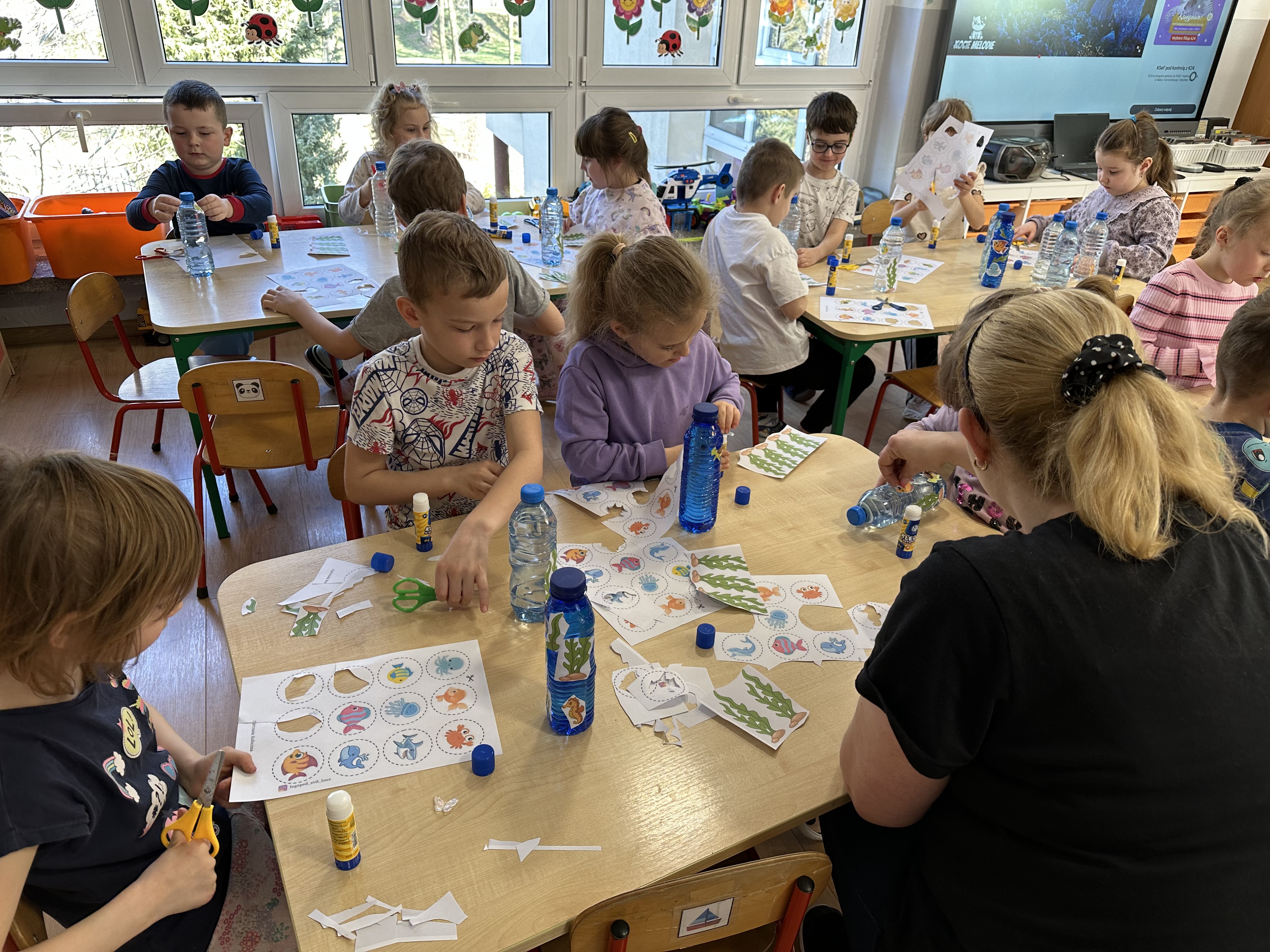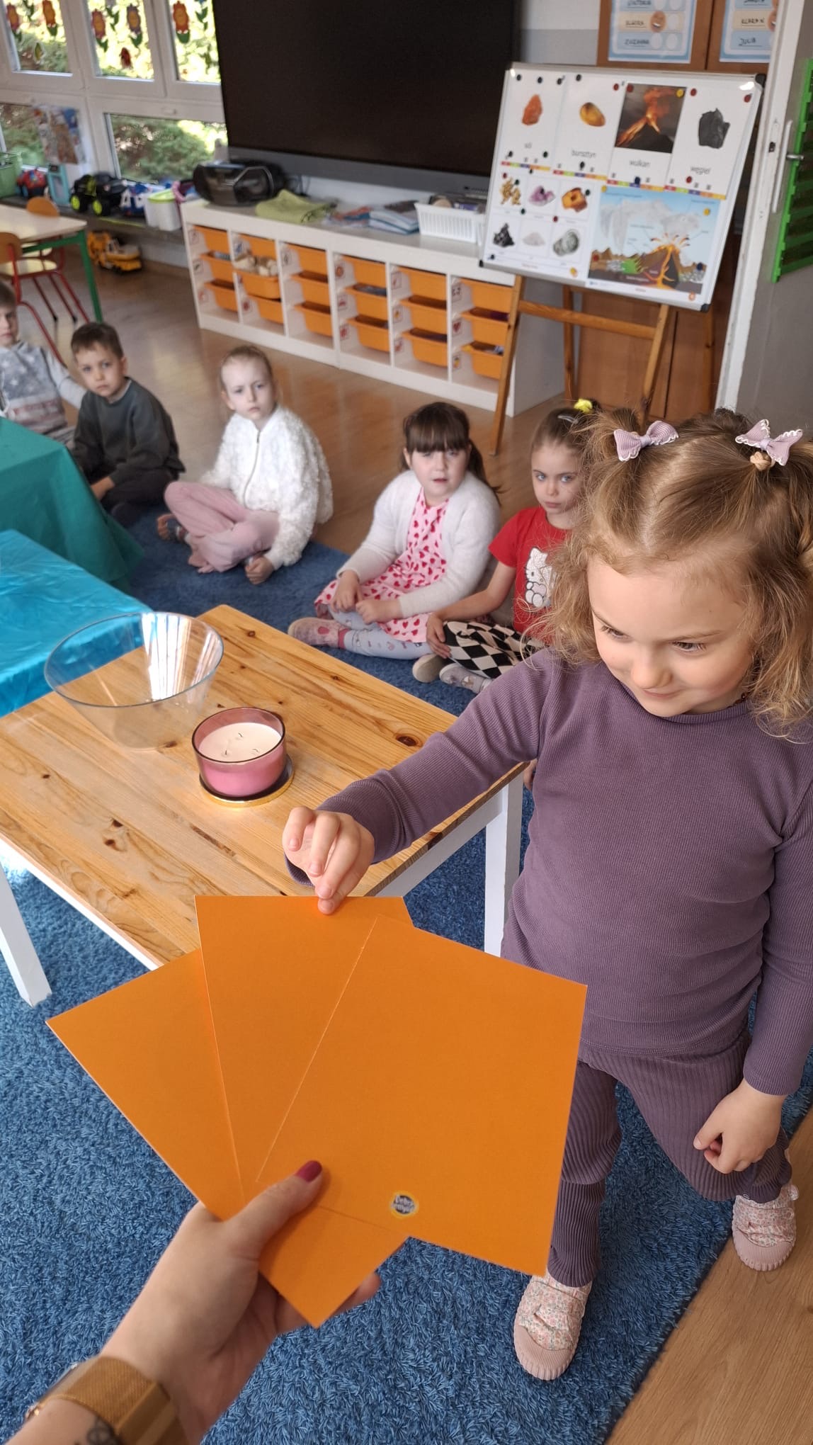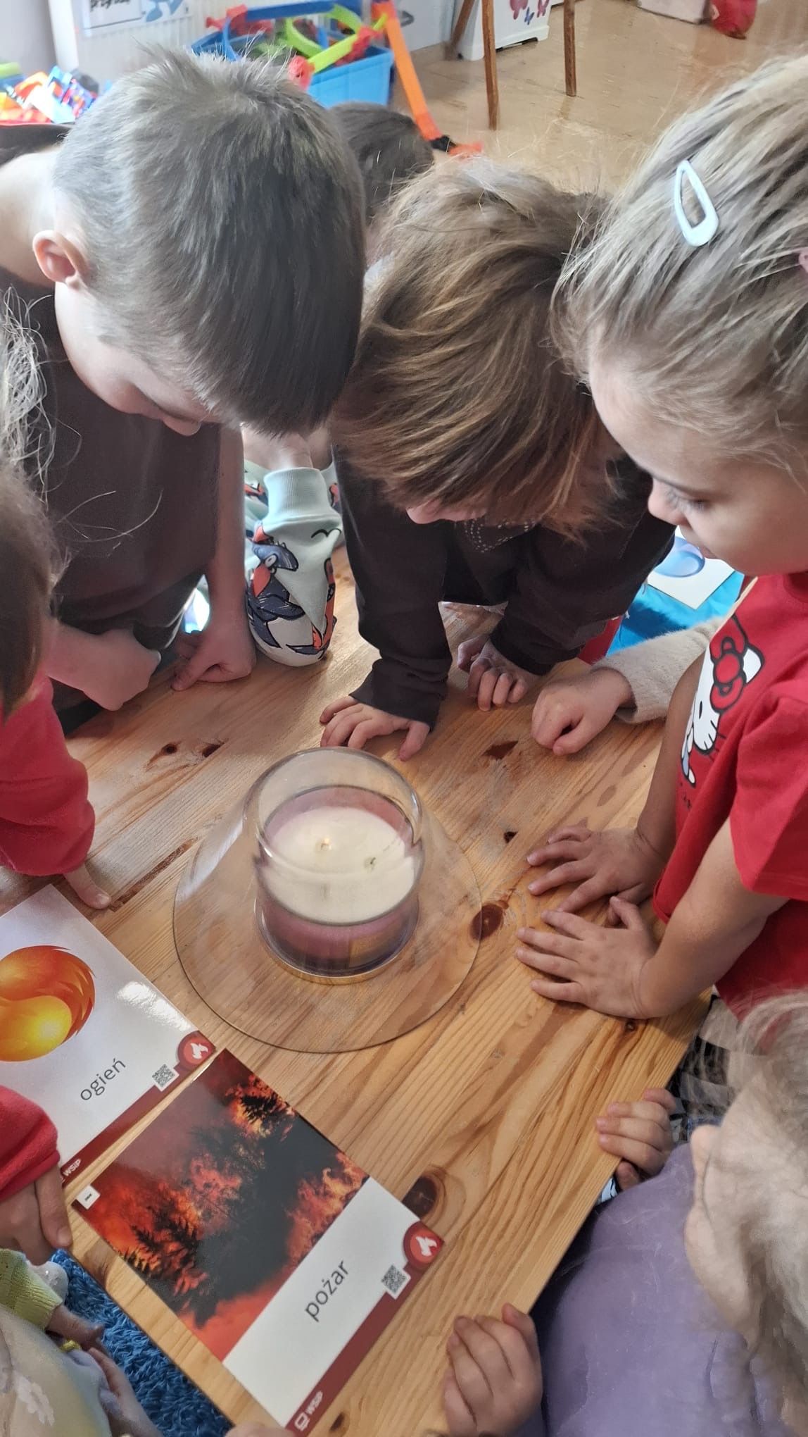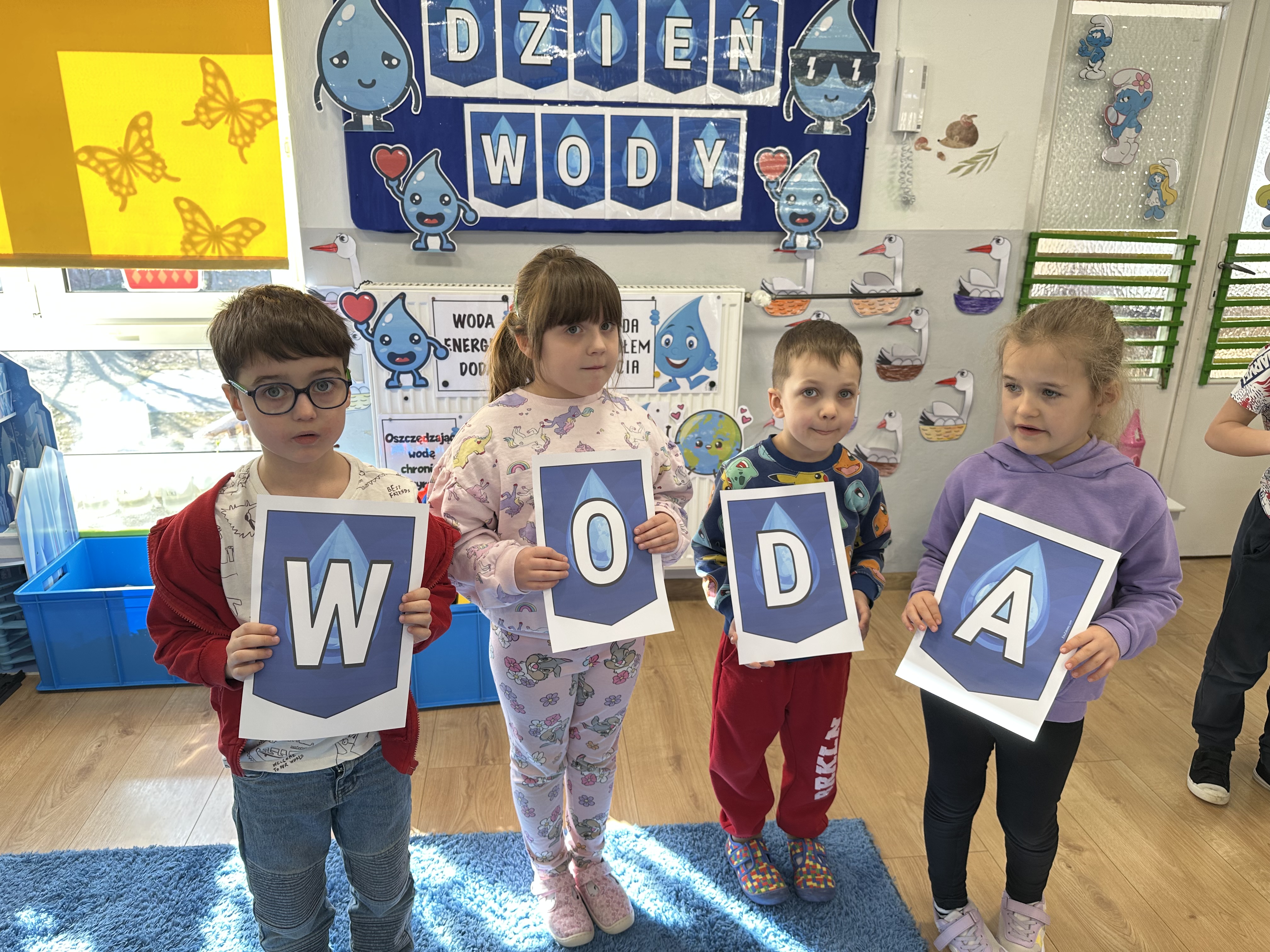 W poniedziałek przedszkolaki zapoznały się z opowiadaniem Marii Pawlisz pt. „Lubię deszcz, gdy jestem w domu”. Po wysłuchaniu tekstu dzieci zastanawiały się, jak należy zachować się podczas burzy i innych zjawisk przyrodniczych. Dodatkowo w trakcie zabawy „Wybuch złości jak wybuch wulkanu” rozwijały umiejętność rozmawiania o uczuciach i sytuacjach, które je wywołują. Zabawa „I am… and I do this…” była kontynuacją tej rozmowy. Dzieci podawały nazwy różnych stanów emocjonalnych z wykorzystaniem słów w języku angielskim i zastanawiały się, czy wszystkie uczucia są nam potrzebne. W trakcie indywidualnych zabaw przy stolikach określały, jak należy postępować, żeby uniknąć szkód związanych z żywiołami, wskazywały właściwe i niebezpieczne zachowania. Następnie brały udział w grach zespołowych z elementami rywalizacji. W dalszej części dnia sześciolatki zapoznały się z pozytywnymi i negatywnymi skutkami działania żywiołów, oglądały zdjęcia przedstawiające niszczycielskie działanie żywiołów i zjawisk pogodowych. Wtorek przedszkolaki zaczęły od rozmowy na temat piosenki „Cztery żywioły”, jej treści, tempie, nastroju i liczbie zwrotek. W drugiej części dnia poznały literę „w” małą i wielką, drukowaną i pisaną. Doskonaliły także słuch fonematyczny, podając przykłady słów rozpoczynających się głoską w, a także tropiły tę głoskę w środku wyrazów. Przedszkolaki dzieliły słowo „woda” na głoski, a następnie samodzielnie układały schemat głoskowy tego słowa z kartoników, przeliczały sylaby w tym wyrazie i dowiedziały się, kiedy głoska w traci dźwięczność. Zabawy przy stolikach stanowiły utrwalenie zdobytej w tym dniu wiedzy językowej. W środowy poranek podczas zabawy „Podajemy sobie skarb” dzieci rozwijały zmysł dotyku i świadomość sensoryczną. W trakcie indywidualnych zabaw przy stolikach utrwalały wiedzę na temat skarbów ziemi i ich wykorzystywania, przeliczały do 10 oraz ćwiczyły pamięć. W czwartek przybliżono dzieciom informacje na temat żywiołu ognia i znaków przeciwpożarowych. Podczas wspólnej rozmowy dzieci zastanawiały się nad negatywnymi skutkami ognia i poznawały, jak należy się zachować w przypadku pożaru oraz w jaki sposób opuszczać zadymione pomieszczenie. Pod koniec dnia w trakcie zabawy „Jak długi jest wąż strażacki?” dzieci doskonaliły umiejętności w zakresie mierzenia oraz posługiwania się linijką. W piątek słuchały wiersza pt. ,,Kłótnia wiatrów” Agnieszki Nożyńskiej‑Demianiuk i rozmawiały na temat jego treści. Wyjaśniały, co to znaczy ,,grać pierwsze skrzypce” i poszerzały swoją wiedzę dotycząca wiatru. Brały udział w zabawach rozwijających umiejętność kodowania i odróżniania prawej strony od lewej. Ćwiczyły pamięć słuchową podczas utrwalania słów piosenki o żywiołach oraz koncentrację uwagi i spostrzegawczość w trakcie integracyjnej zabawy „Który żywioł zmienił miejsce?”. W następnej części dnia dzieci wspólnie obserwowały eksperyment, który wyjaśnił im właściwości powietrza.