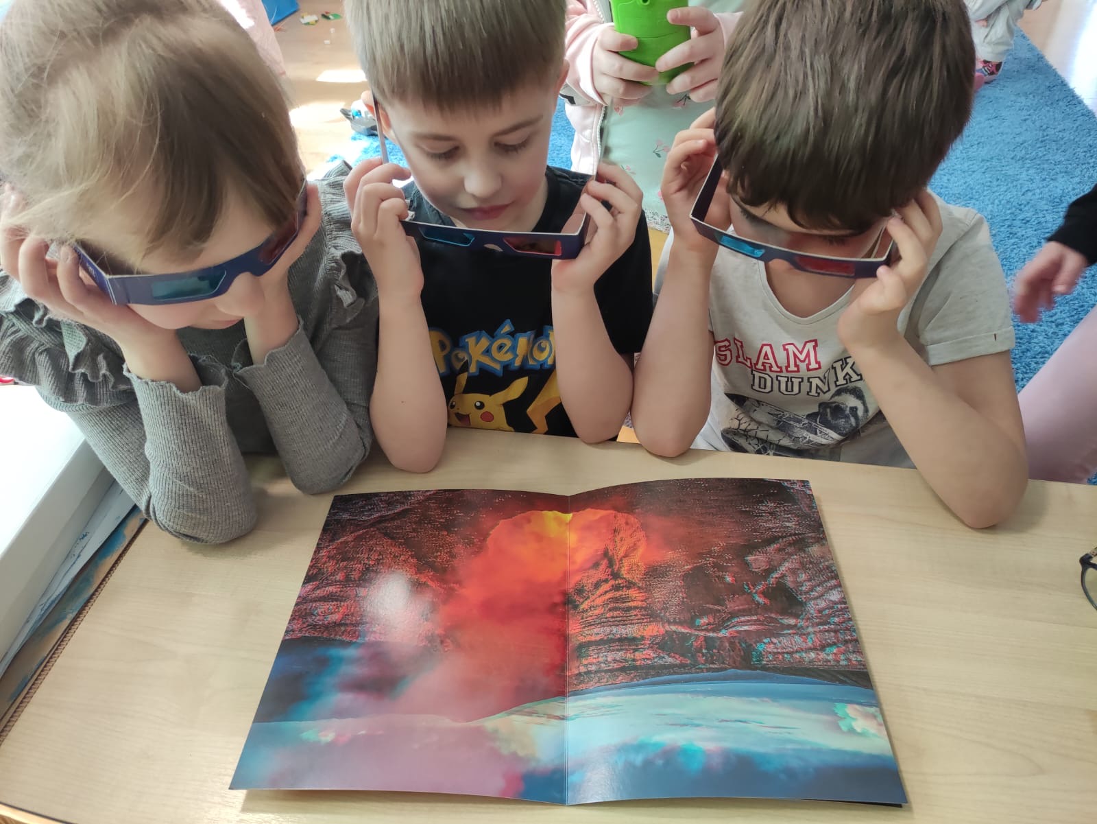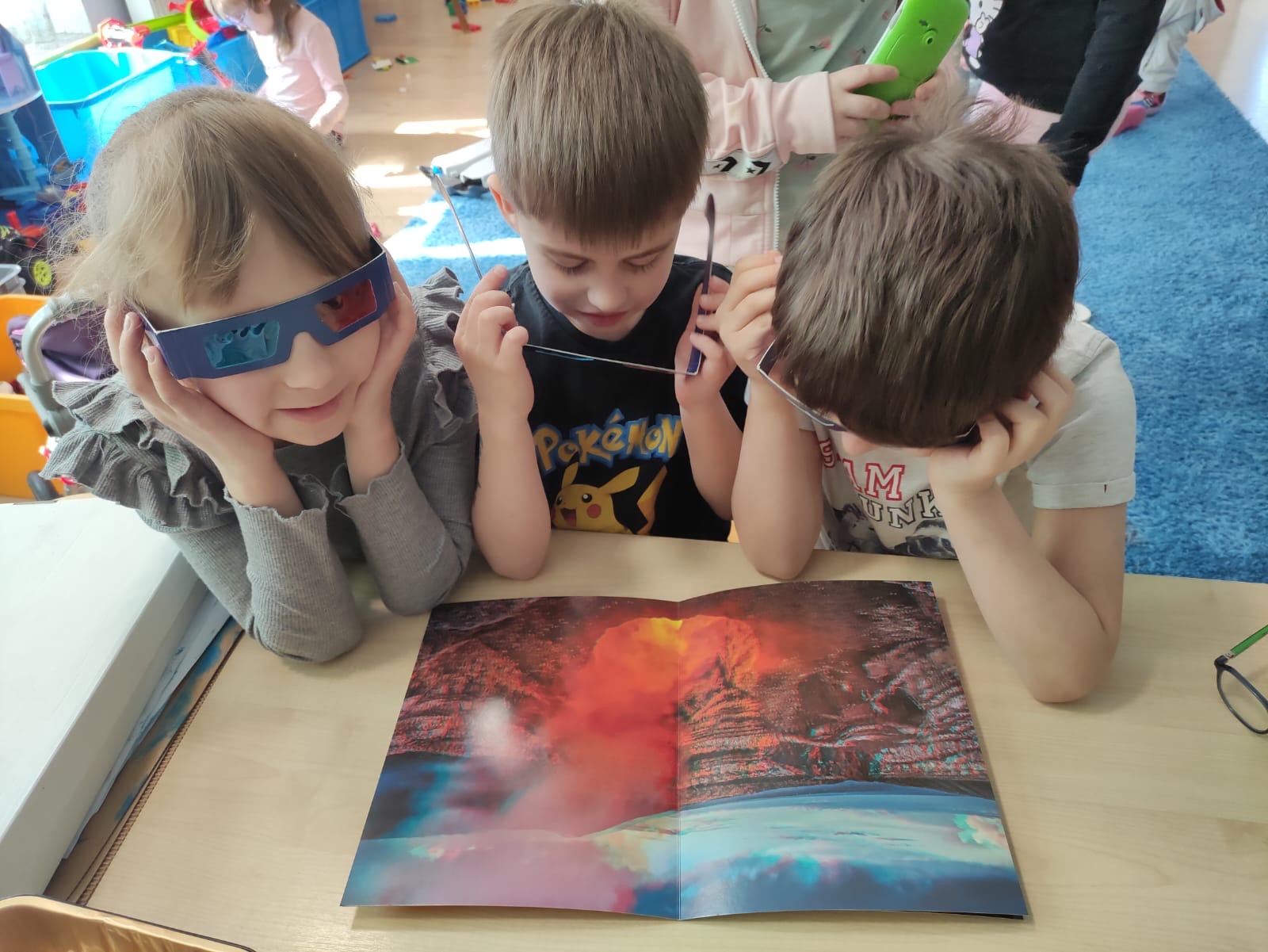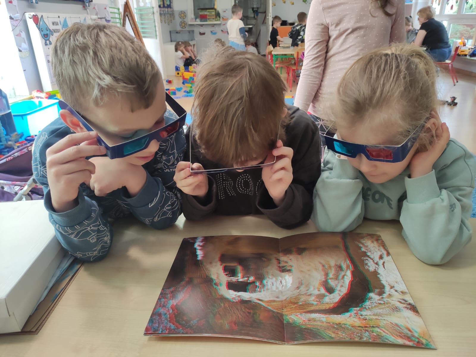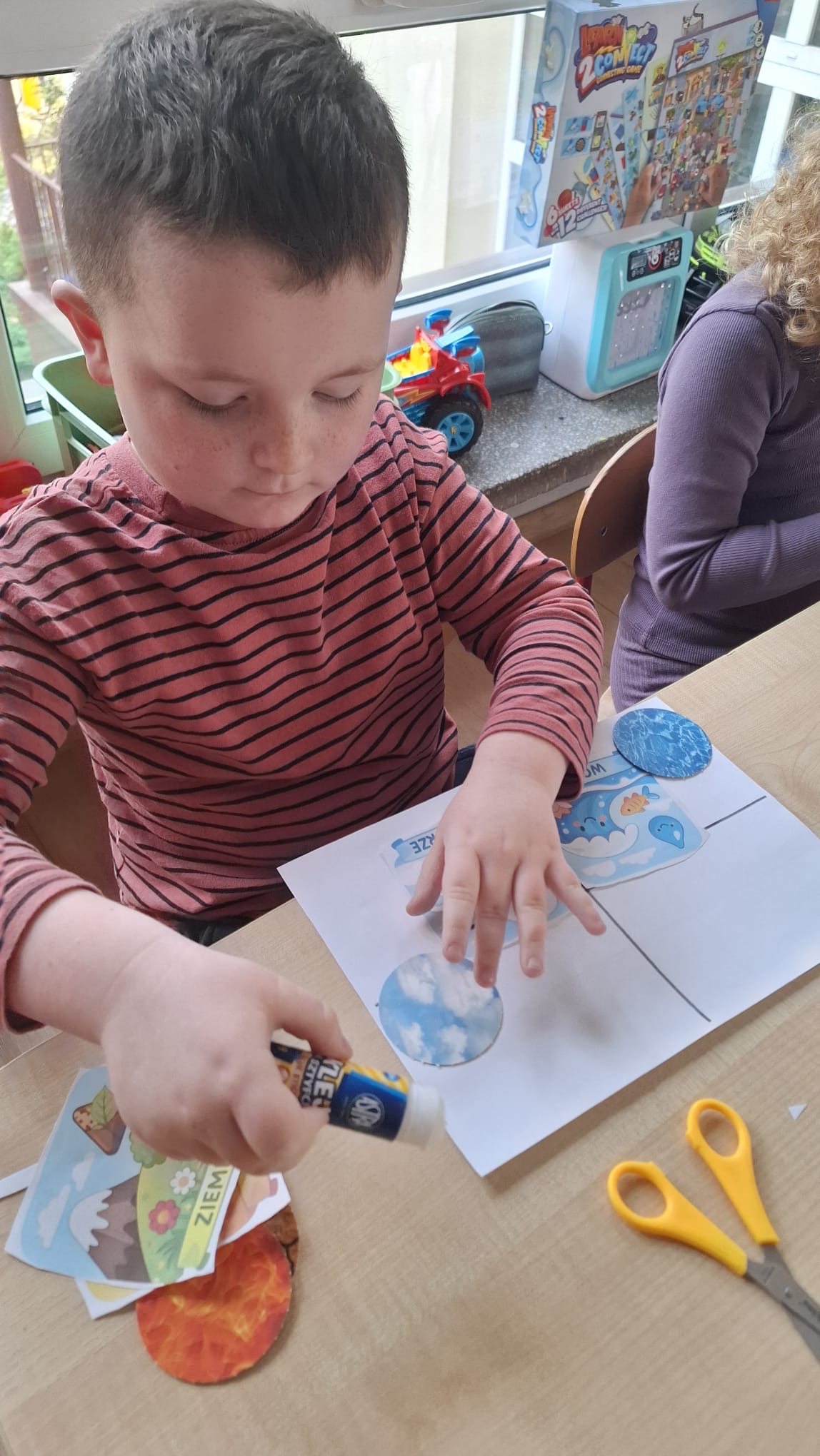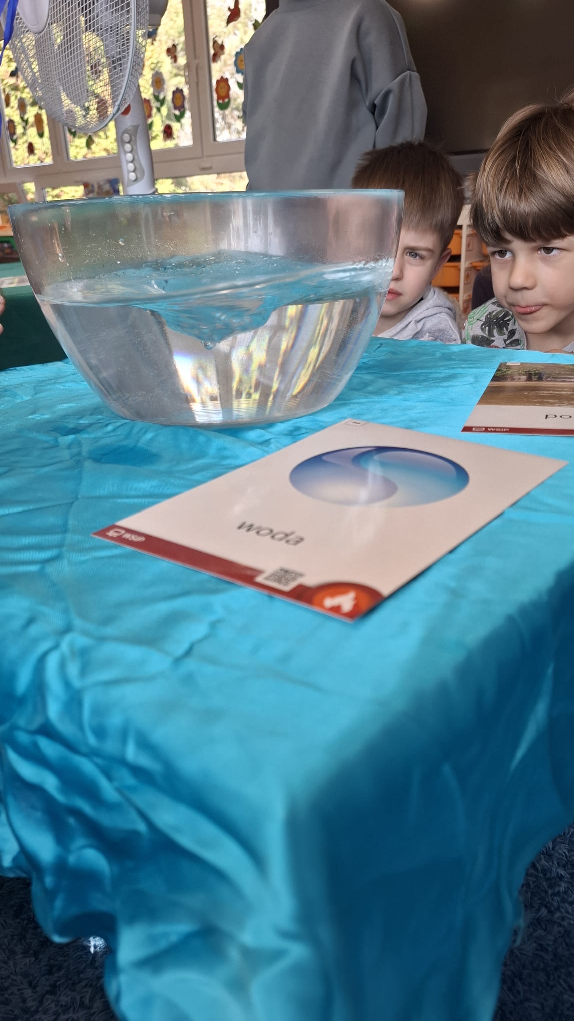 W poniedziałek przedszkolaki zapoznały się z opowiadaniem Marii Pawlisz pt. „Lubię deszcz, gdy jestem w domu”. Po wysłuchaniu tekstu dzieci zastanawiały się, jak należy zachować się podczas burzy i innych zjawisk przyrodniczych. Dodatkowo w trakcie zabawy „Wybuch złości jak wybuch wulkanu” rozwijały umiejętność rozmawiania o uczuciach i sytuacjach, które je wywołują. Zabawa „I am… and I do this…” była kontynuacją tej rozmowy. Dzieci podawały nazwy różnych stanów emocjonalnych z wykorzystaniem słów w języku angielskim i zastanawiały się, czy wszystkie uczucia są nam potrzebne. W trakcie indywidualnych zabaw przy stolikach określały, jak należy postępować, żeby uniknąć szkód związanych z żywiołami, wskazywały właściwe i niebezpieczne zachowania. Następnie brały udział w grach zespołowych z elementami rywalizacji. W dalszej części dnia sześciolatki zapoznały się z pozytywnymi i negatywnymi skutkami działania żywiołów, oglądały zdjęcia przedstawiające niszczycielskie działanie żywiołów i zjawisk pogodowych. Wtorek przedszkolaki zaczęły od rozmowy na temat piosenki „Cztery żywioły”, jej treści, tempie, nastroju i liczbie zwrotek. W drugiej części dnia poznały literę „w” małą i wielką, drukowaną i pisaną. Doskonaliły także słuch fonematyczny, podając przykłady słów rozpoczynających się głoską w, a także tropiły tę głoskę w środku wyrazów. Przedszkolaki dzieliły słowo „woda” na głoski, a następnie samodzielnie układały schemat głoskowy tego słowa z kartoników, przeliczały sylaby w tym wyrazie i dowiedziały się, kiedy głoska w traci dźwięczność. Zabawy przy stolikach stanowiły utrwalenie zdobytej w tym dniu wiedzy językowej. W środowy poranek podczas zabawy „Podajemy sobie skarb” dzieci rozwijały zmysł dotyku i świadomość sensoryczną. W trakcie indywidualnych zabaw przy stolikach utrwalały wiedzę na temat skarbów ziemi i ich wykorzystywania, przeliczały do 10 oraz ćwiczyły pamięć. W czwartek przybliżono dzieciom informacje na temat żywiołu ognia i znaków przeciwpożarowych. Podczas wspólnej rozmowy dzieci zastanawiały się nad negatywnymi skutkami ognia i poznawały, jak należy się zachować w przypadku pożaru oraz w jaki sposób opuszczać zadymione pomieszczenie. Pod koniec dnia w trakcie zabawy „Jak długi jest wąż strażacki?” dzieci doskonaliły umiejętności w zakresie mierzenia oraz posługiwania się linijką. W piątek słuchały wiersza pt. ,,Kłótnia wiatrów” Agnieszki Nożyńskiej‑Demianiuk i rozmawiały na temat jego treści. Wyjaśniały, co to znaczy ,,grać pierwsze skrzypce” i poszerzały swoją wiedzę dotycząca wiatru. Brały udział w zabawach rozwijających umiejętność kodowania i odróżniania prawej strony od lewej. Ćwiczyły pamięć słuchową podczas utrwalania słów piosenki o żywiołach oraz koncentrację uwagi i spostrzegawczość w trakcie integracyjnej zabawy „Który żywioł zmienił miejsce?”. W następnej części dnia dzieci wspólnie obserwowały eksperyment, który wyjaśnił im właściwości powietrza.